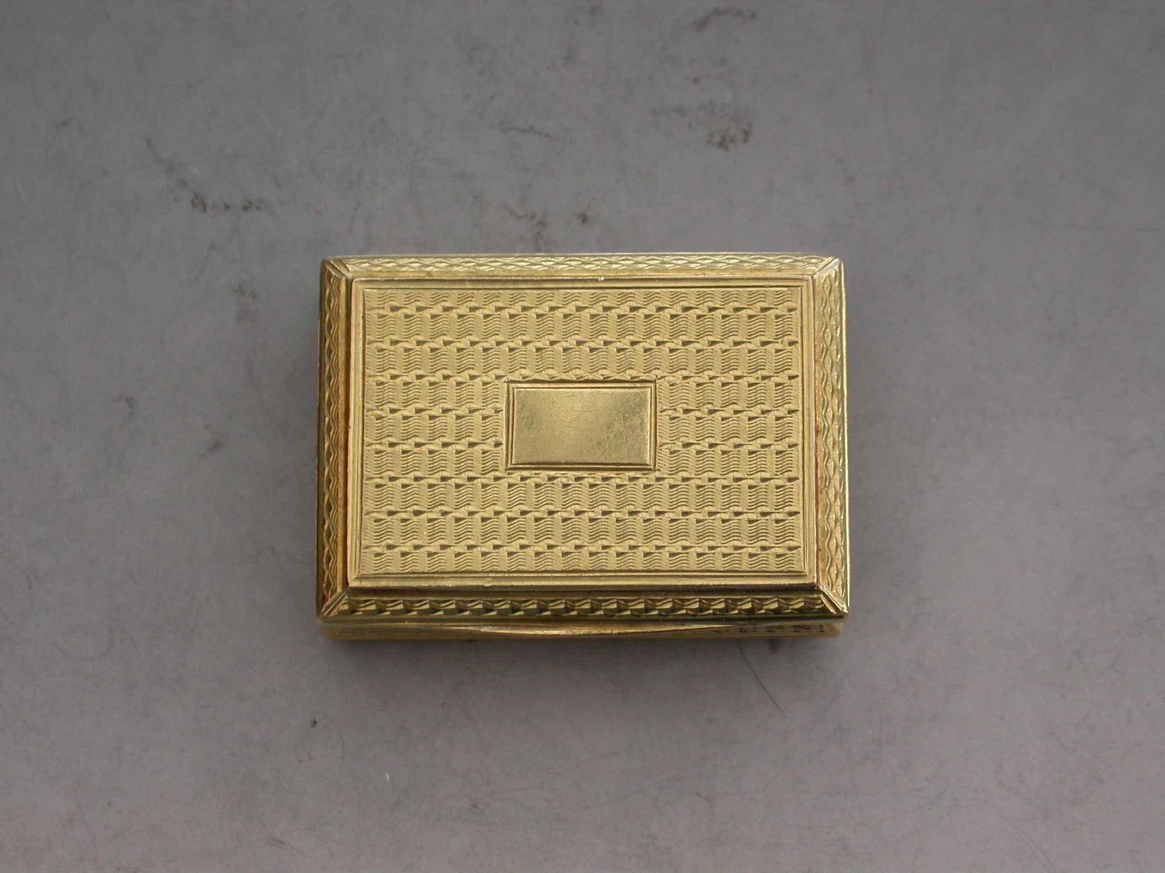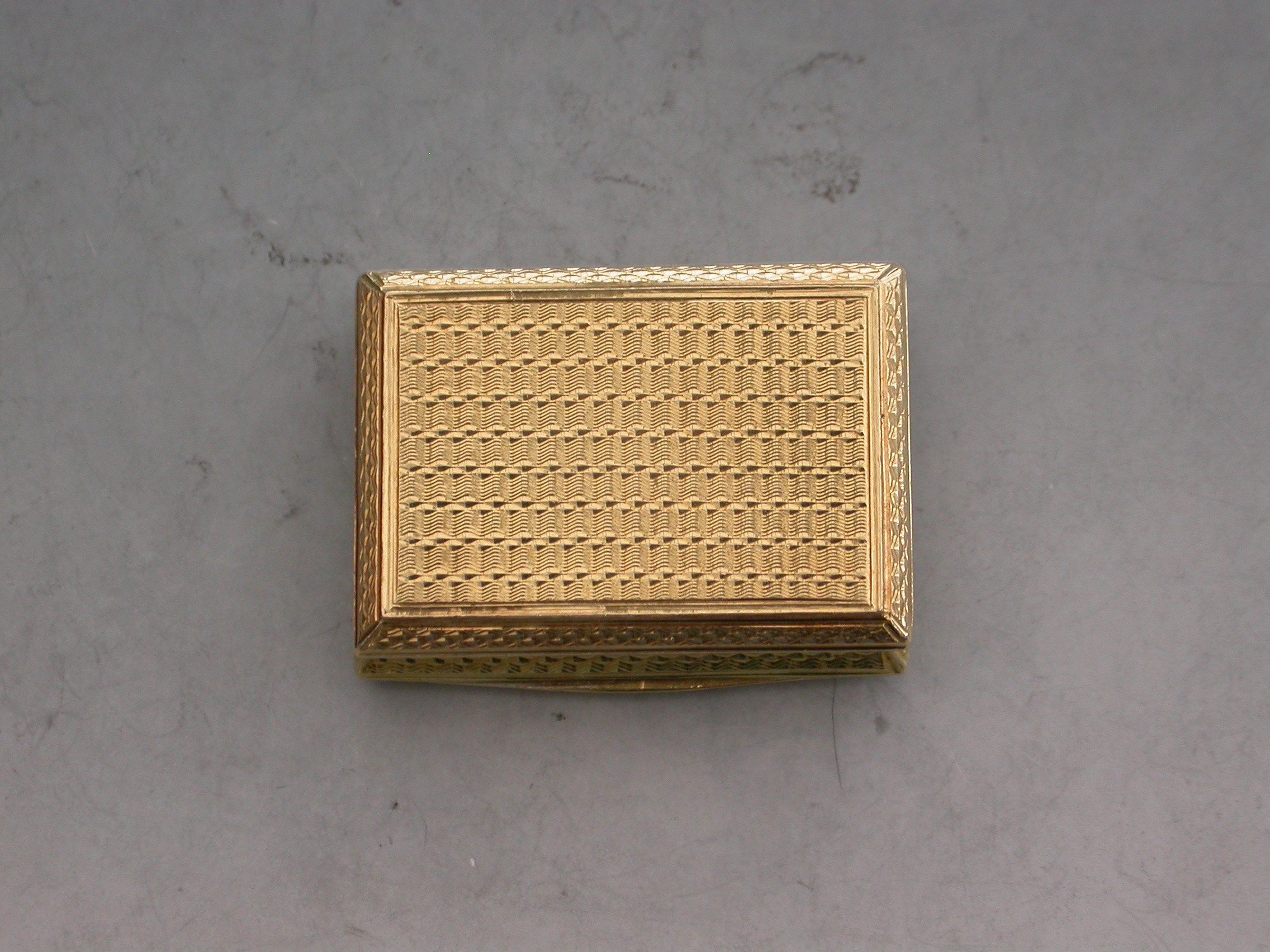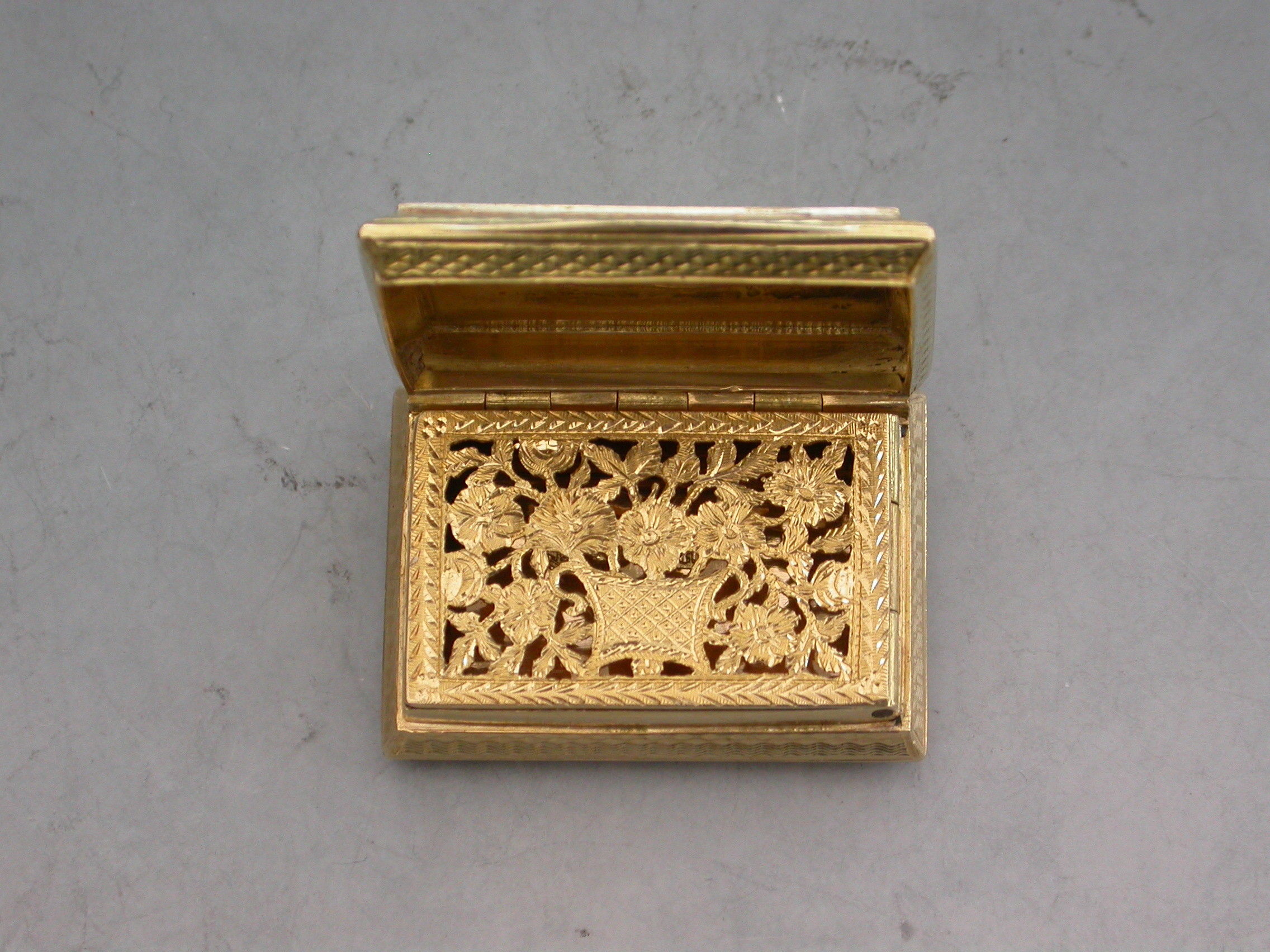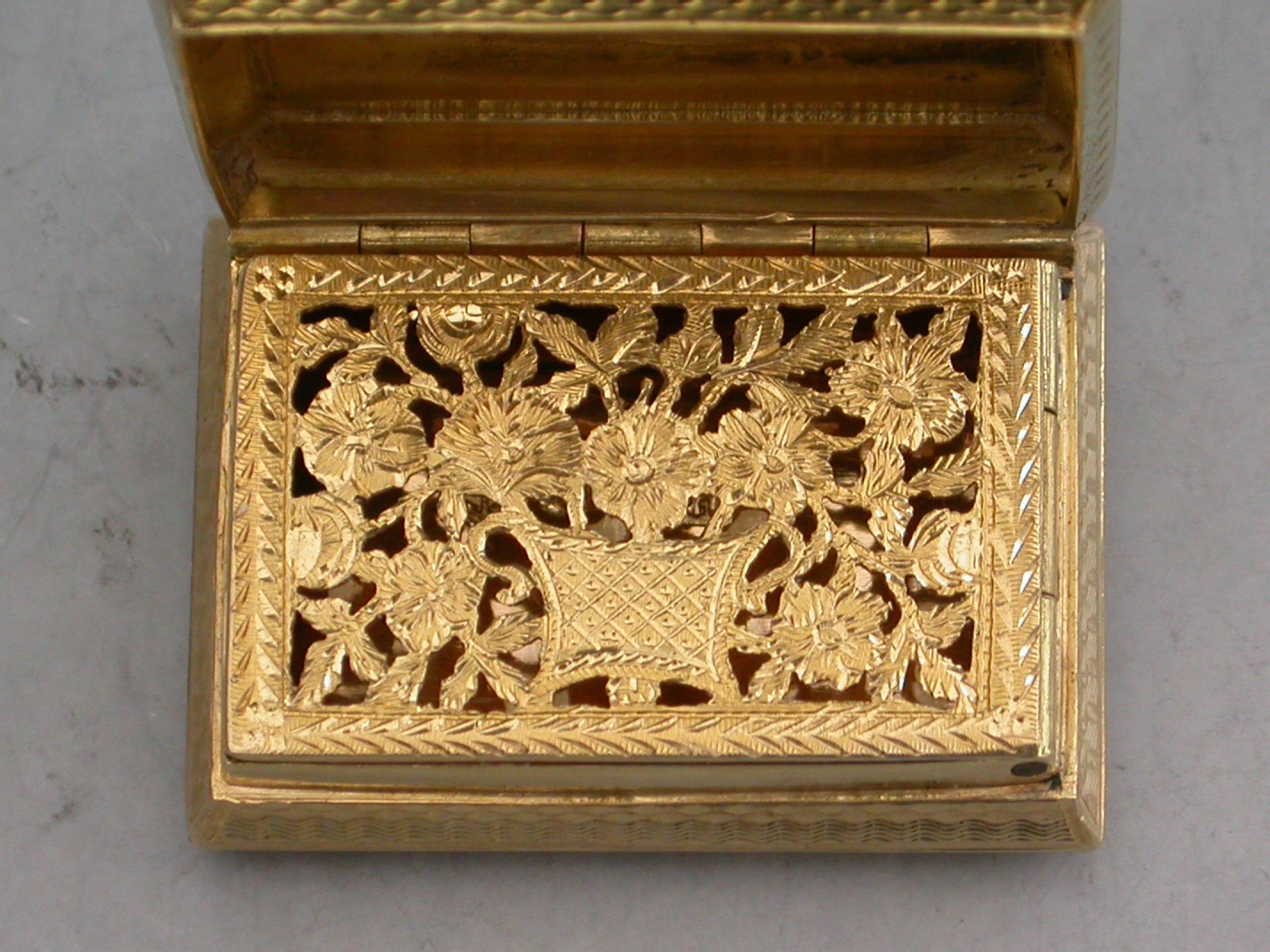 A fine quality William IV 18 carat gold Vinaigrette of compressed rectangular form with engine turned decoration top and bottom, a vacant cartouche to the lid, the interior with pierced grille depicting a basket of flowers.