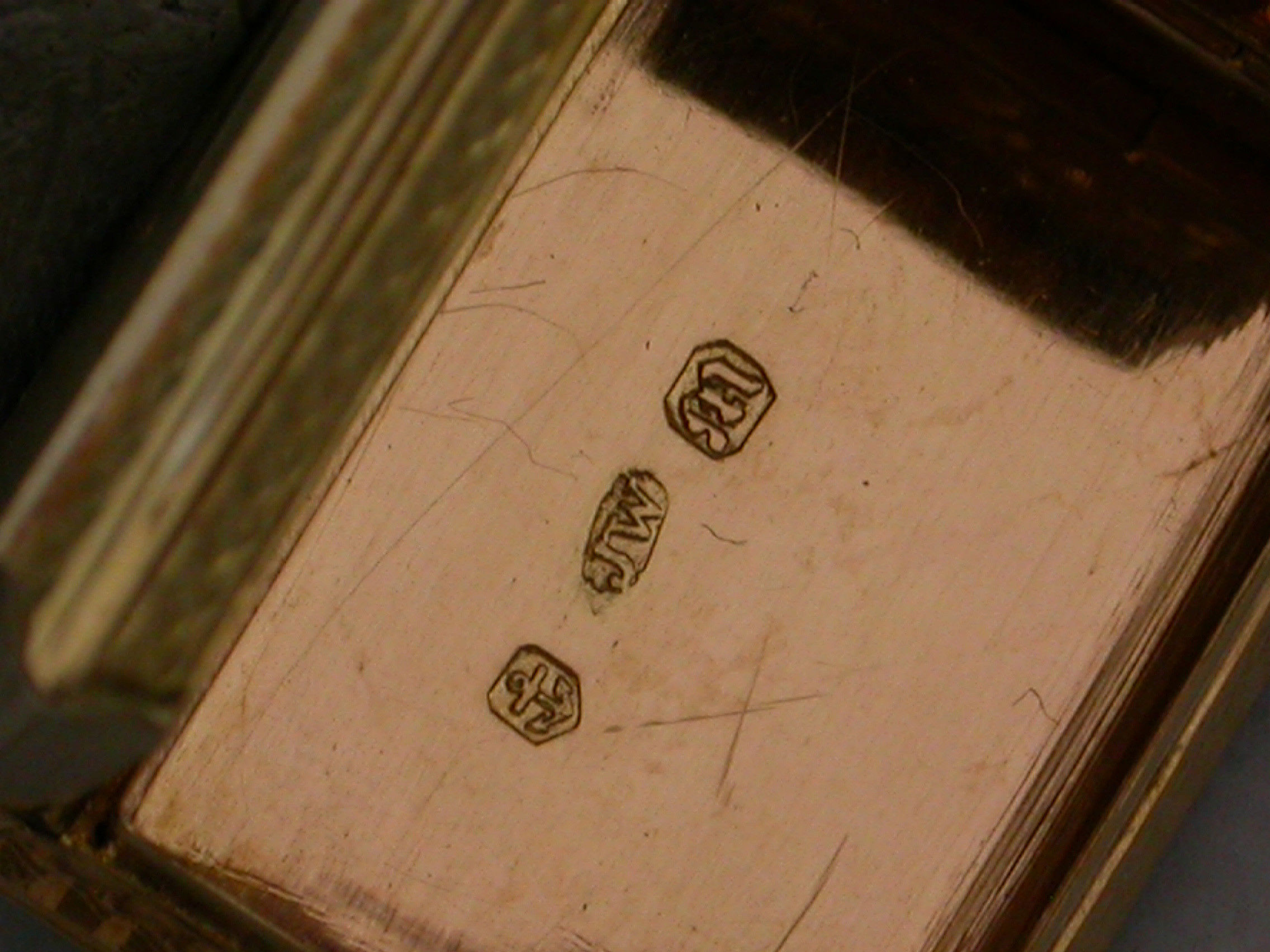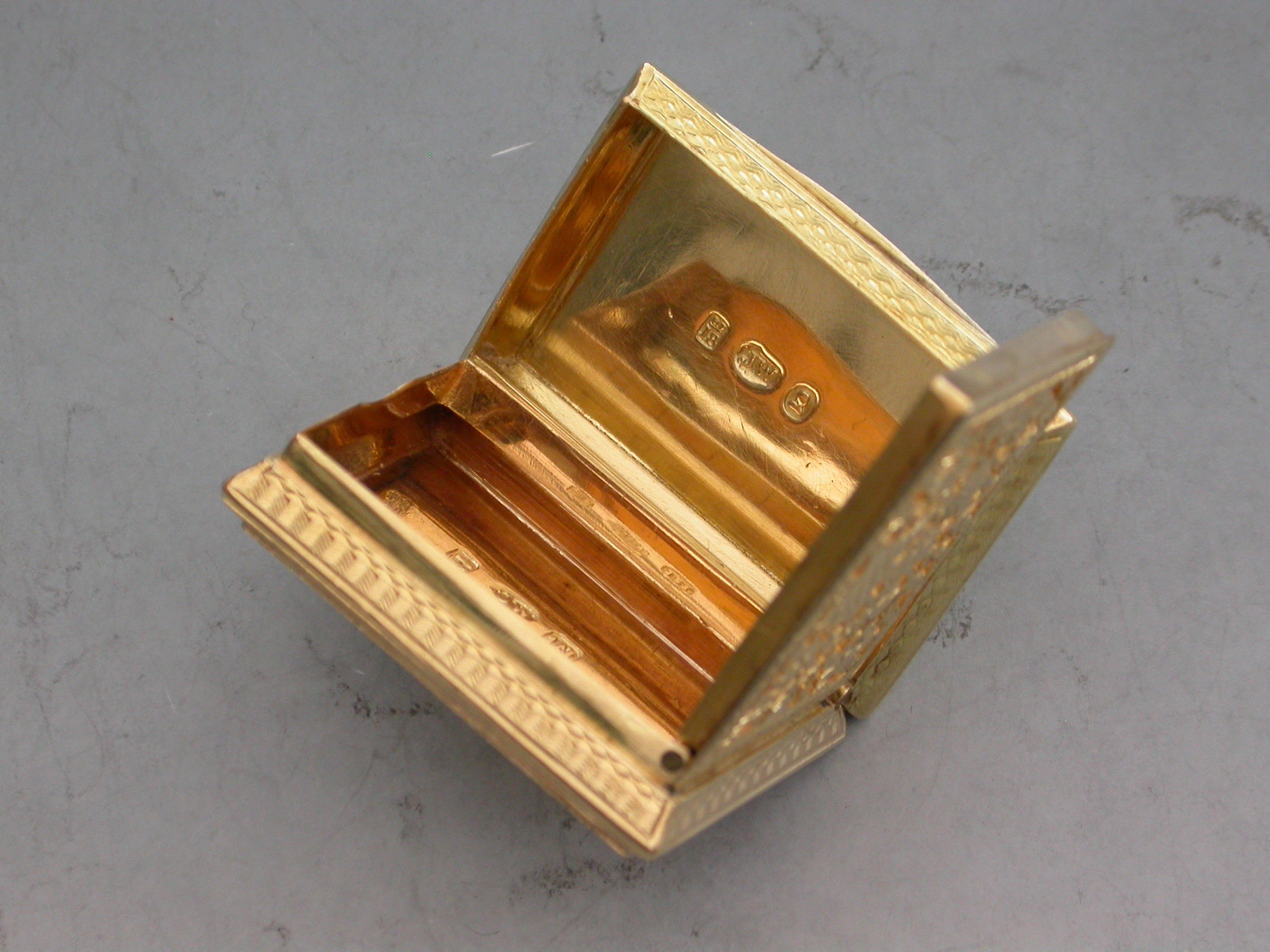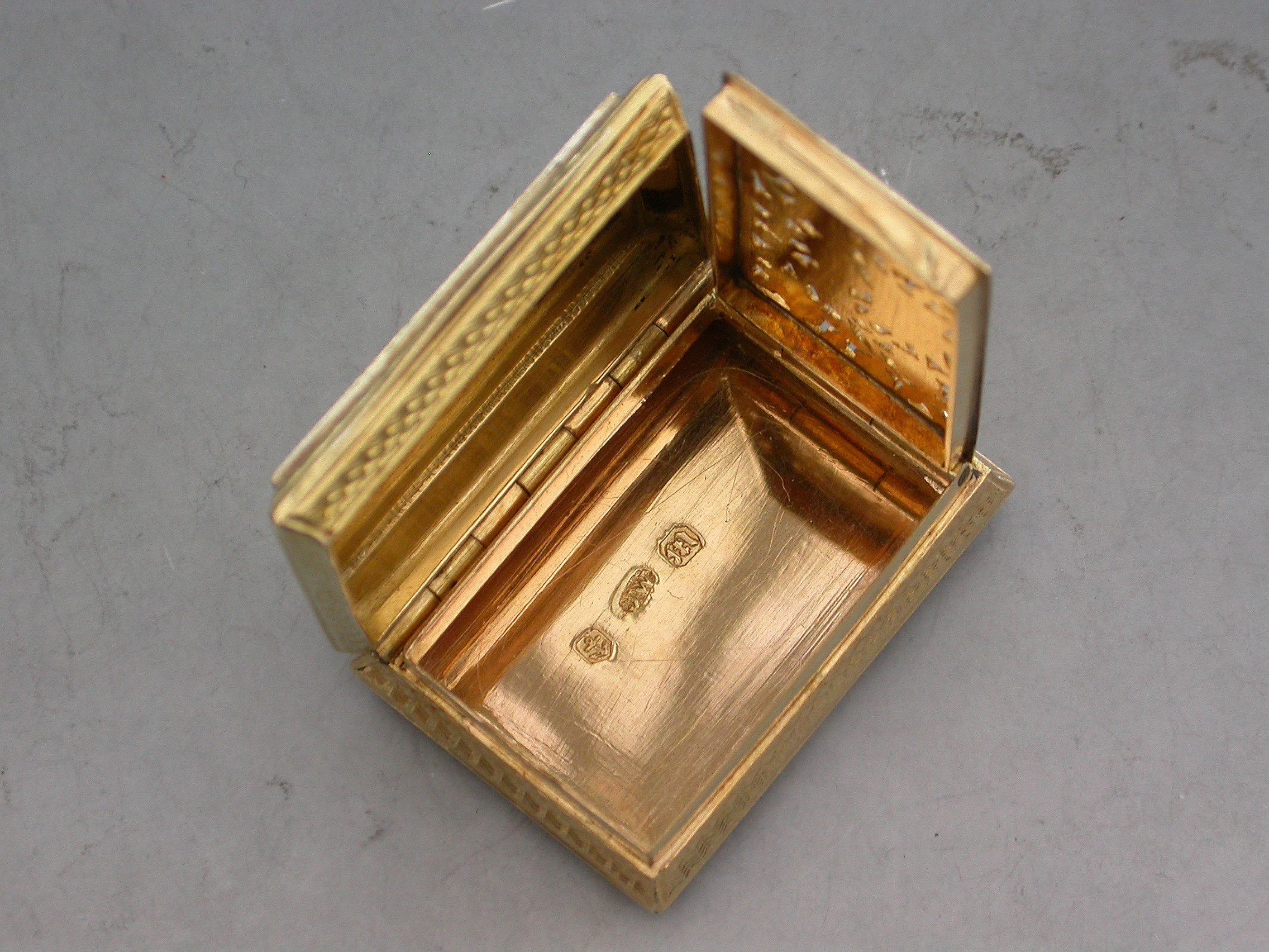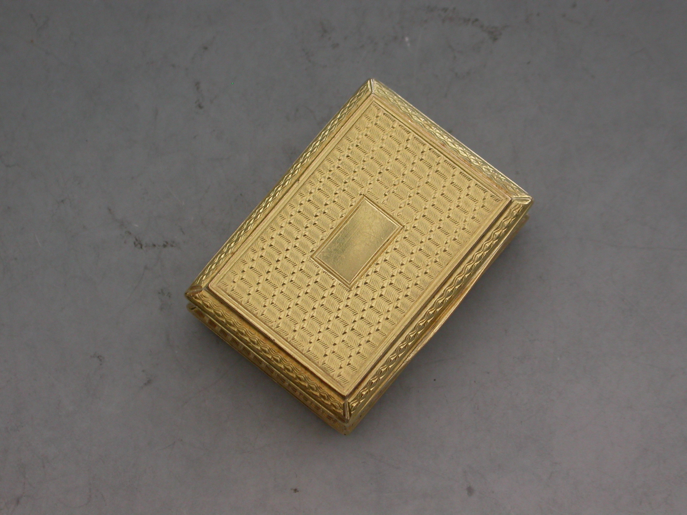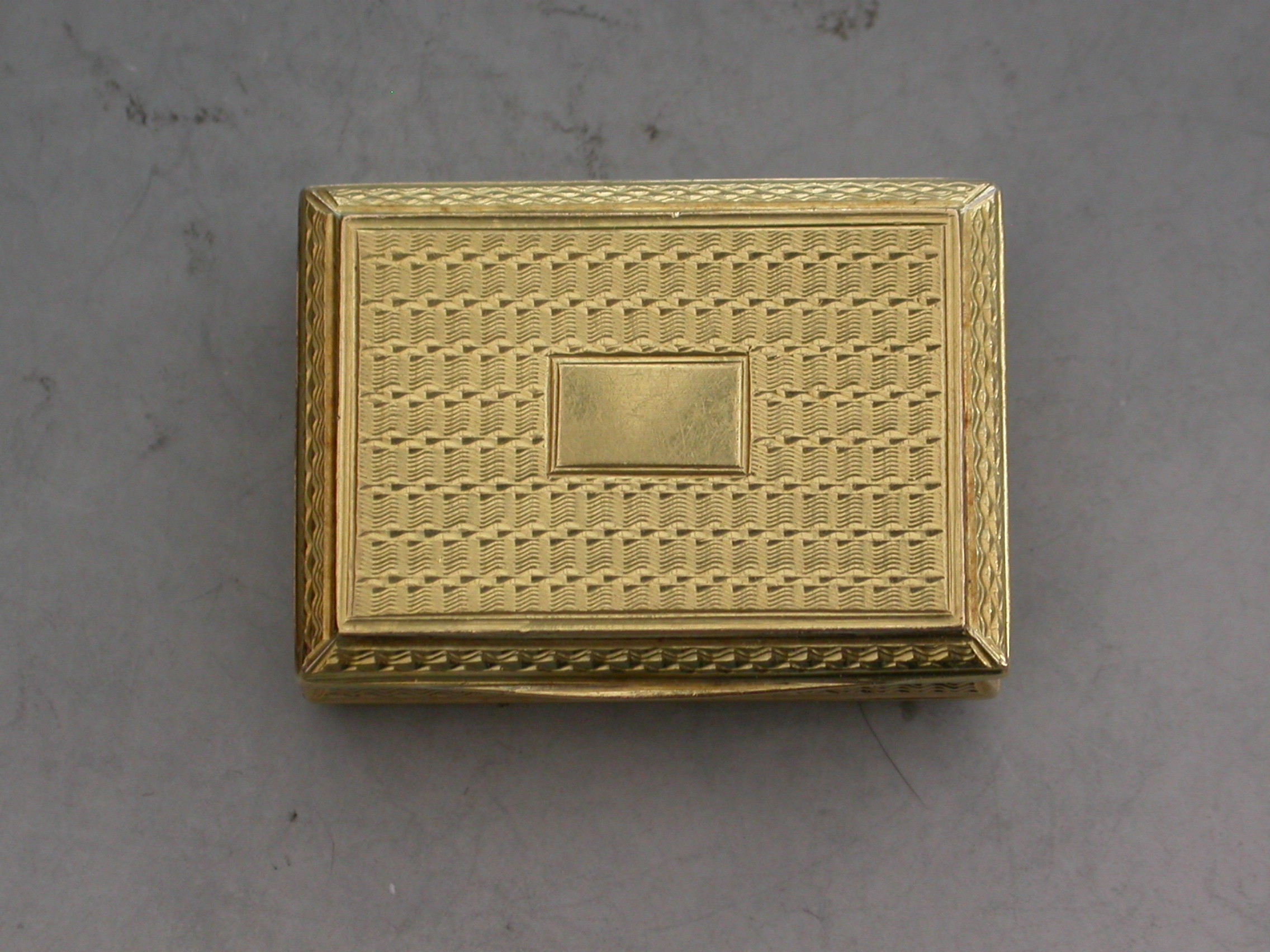 A fine quality William IV 18 carat gold Vinaigrette of compressed rectangular form with engine turned decoration top and bottom, a vacant cartouche to the lid, the interior with pierced grille depicting a basket of flowers.