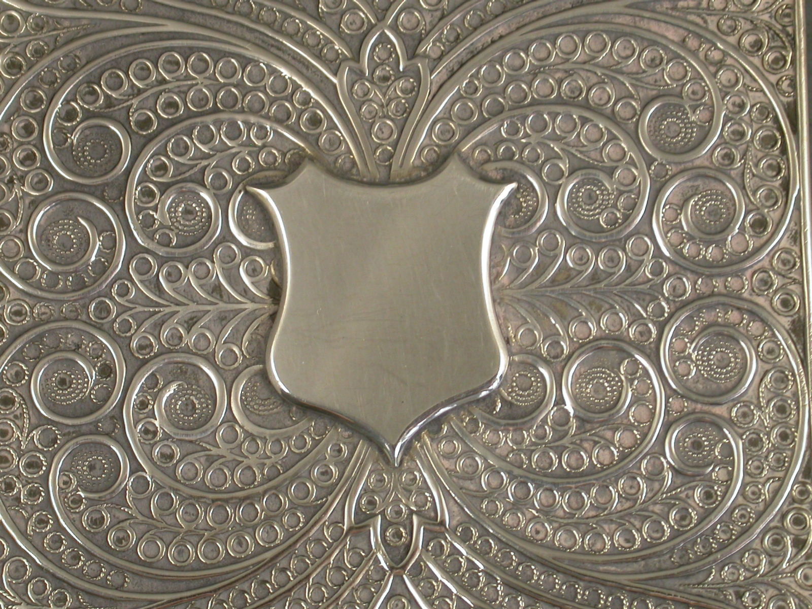 A rare William IV silver Card Case of rectangular form with embossed intricate pierced and scrolled decoration simulating fine filigree work both front and back, the sides with chased foliate scroll decoration, two applied vacant shield shaped cartouches.