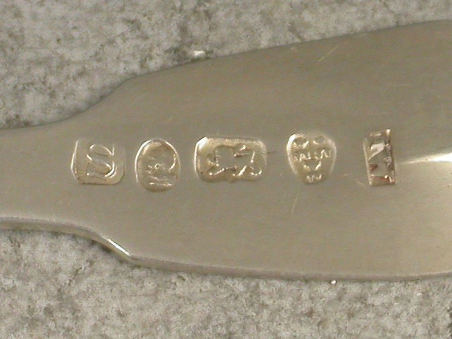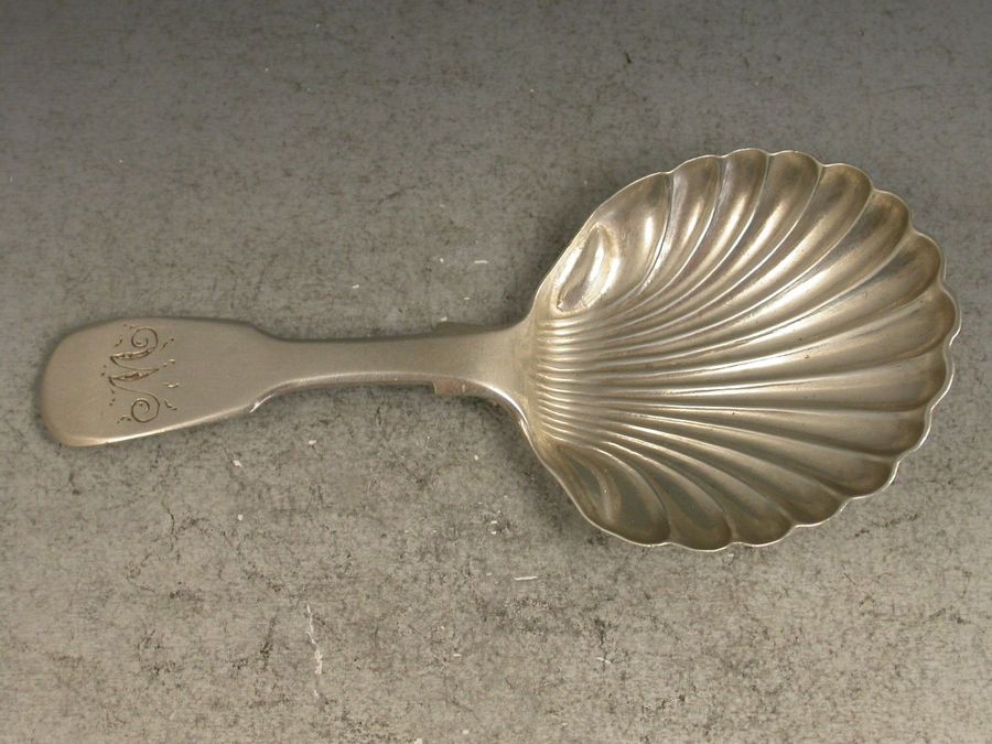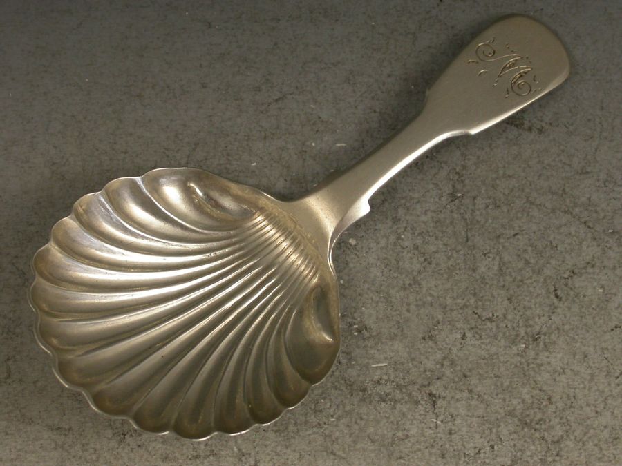 A rare Wiliiam IV Provincial silver Caddy Spoon with plain fiddle pattern handle engraved with a contemporary initial 'M', the bowl of large circular scallop shell form.