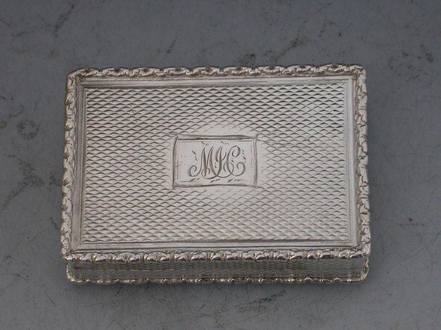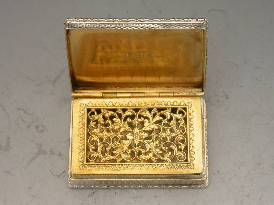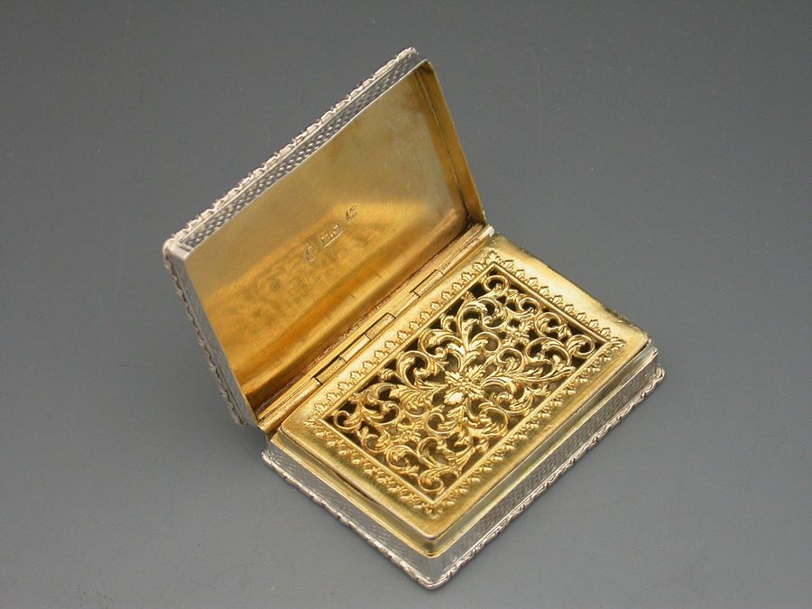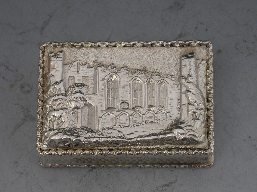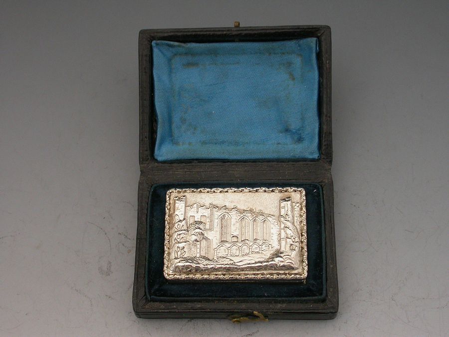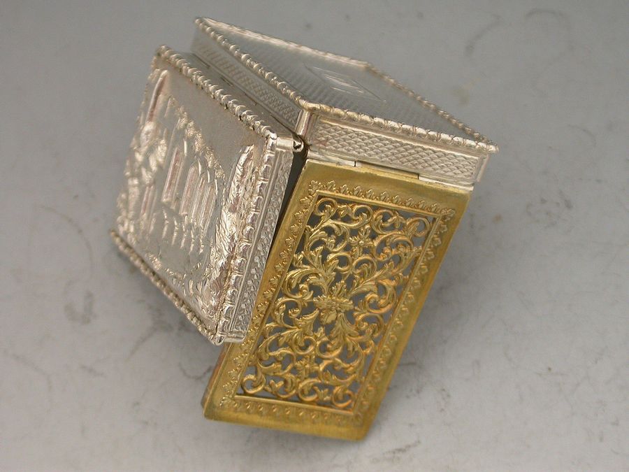 An extremely fine and rare William IV 'Castle Top' Vinaigrette of rectangular form with raised foliate borders, the base and sides with engine turned decoration, the cover depicting a view of John O'Gaunt's Great Hall at Kenilworth in high relief. The grille pierced and engraved with scrolls and flowers within a border of acanthus leaves. Complete with original silk and velvet lined leather case.