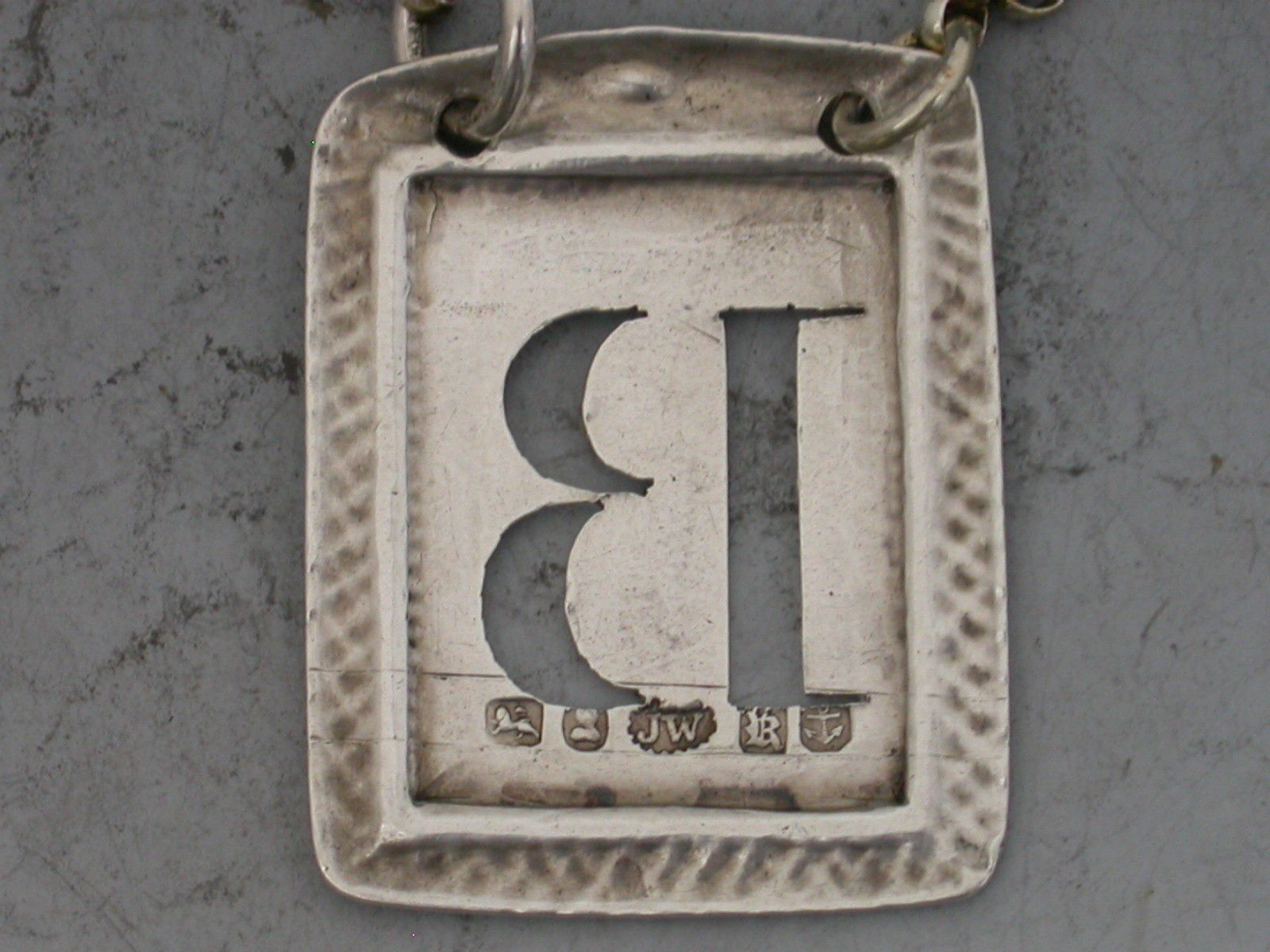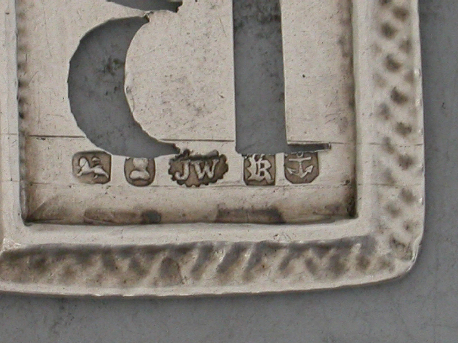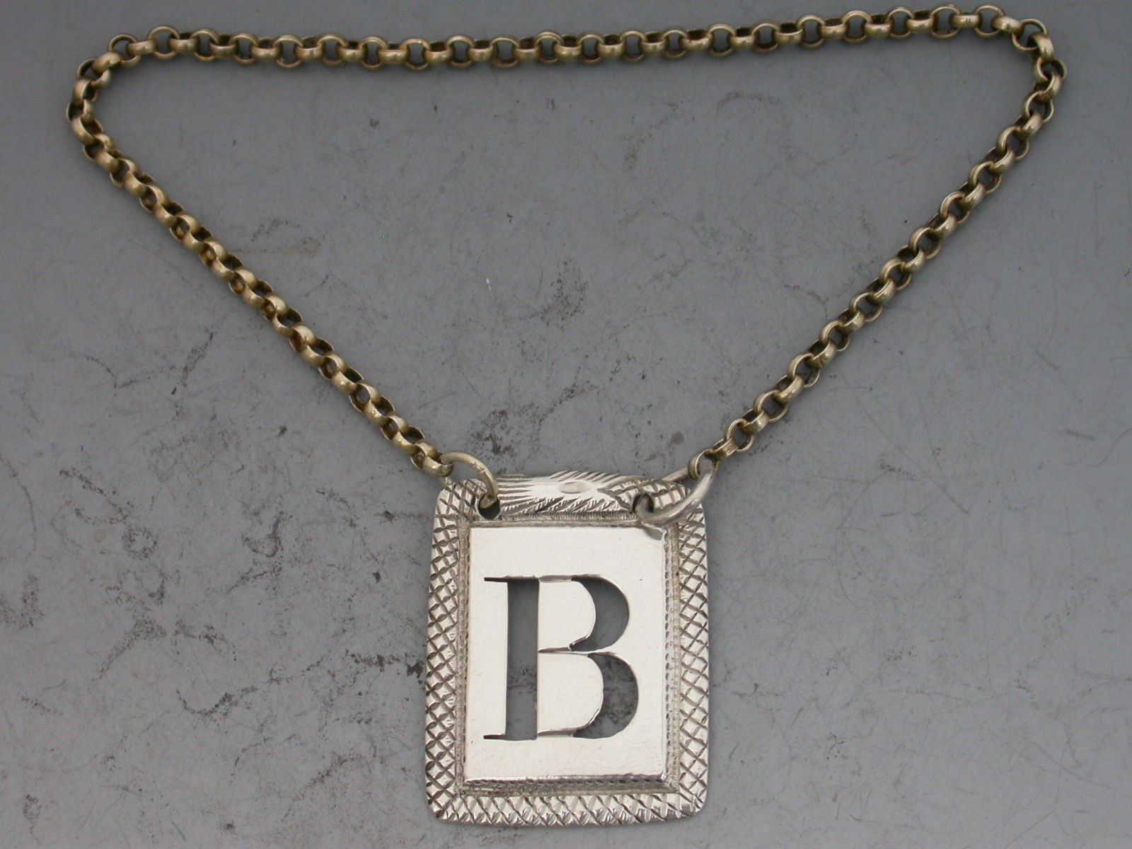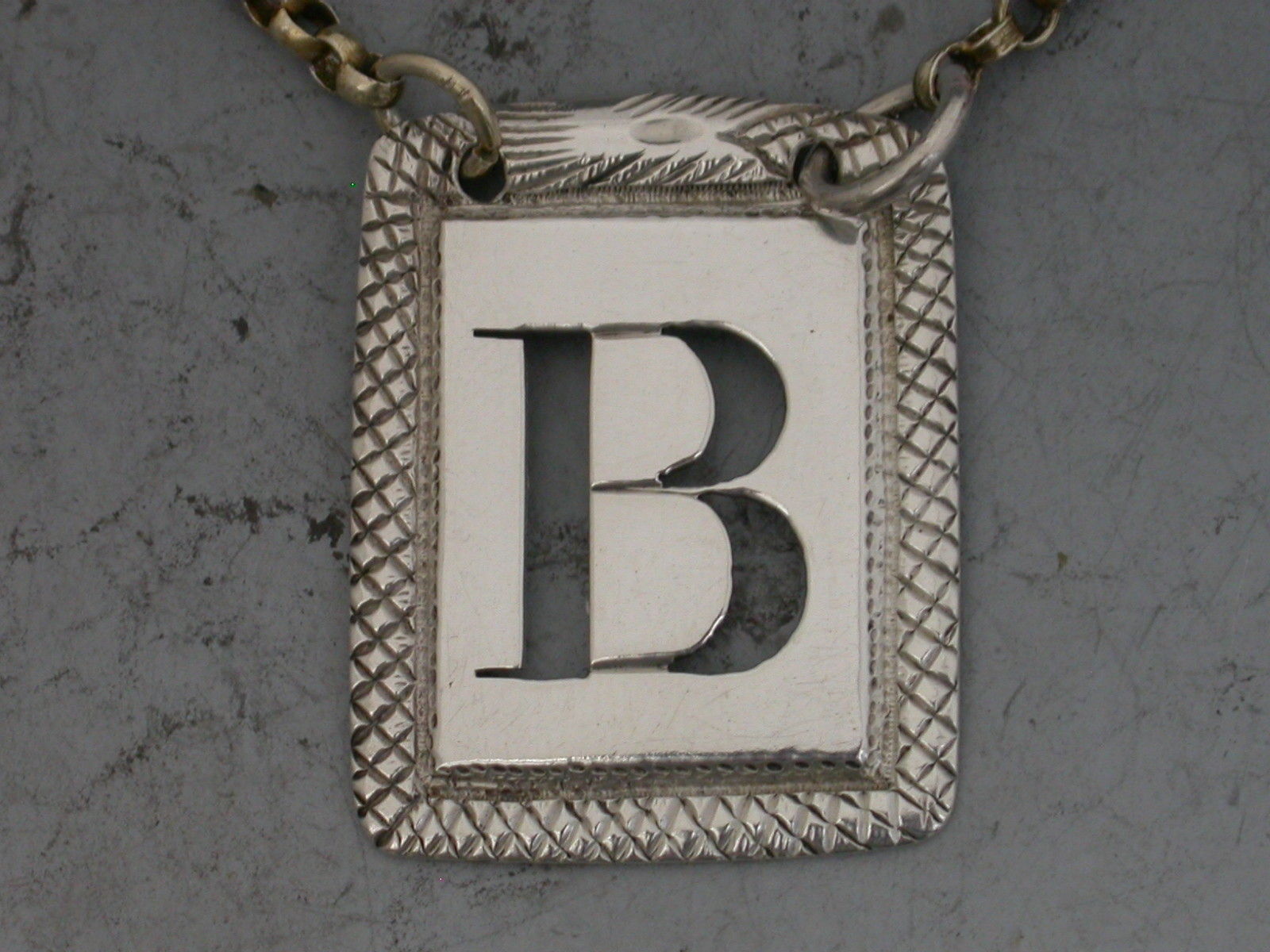 A good William IV rectangular silver Wine Label of ""postage stamp"" form pierced with an initial letter 'B', the border of Ouroboros form (a snake eating its own tail).