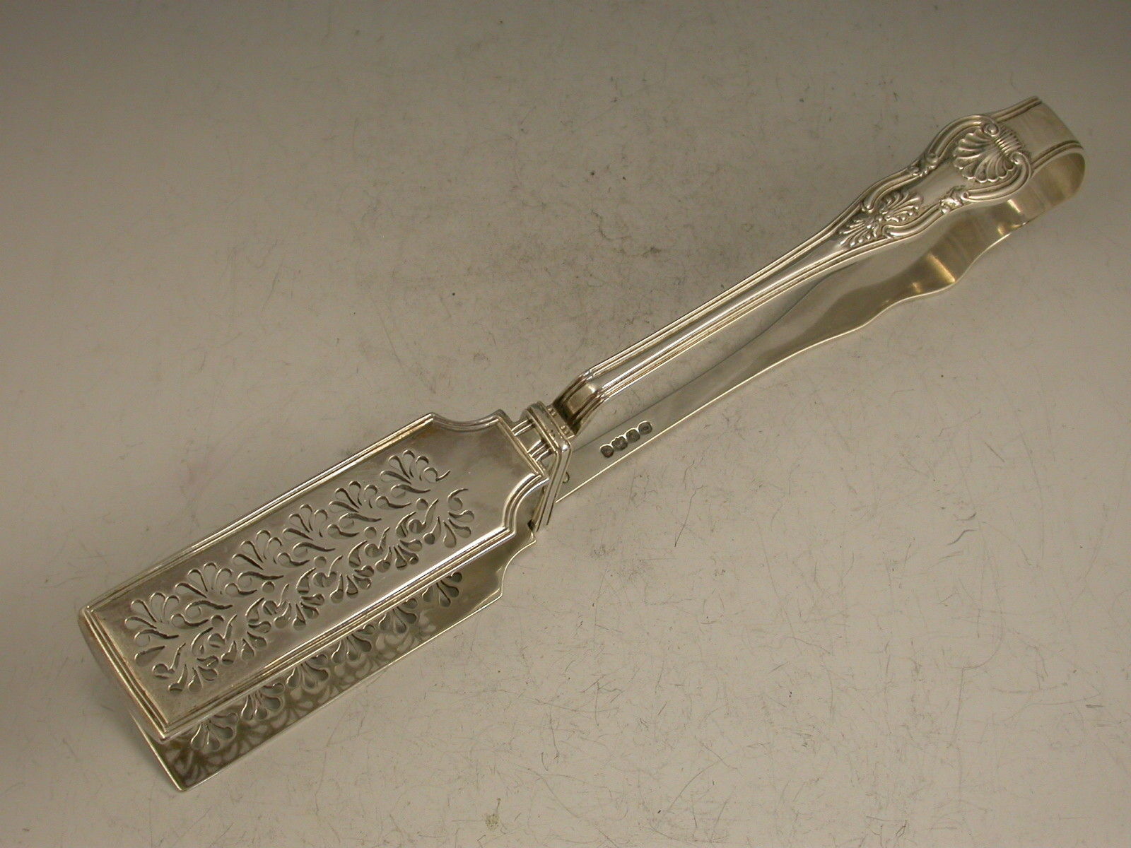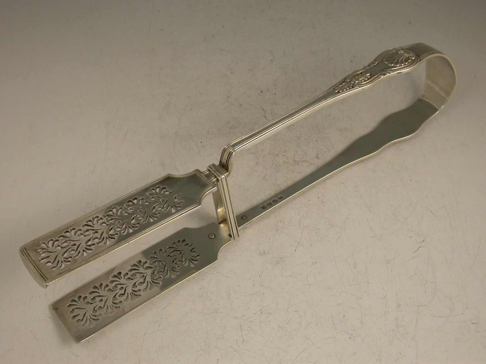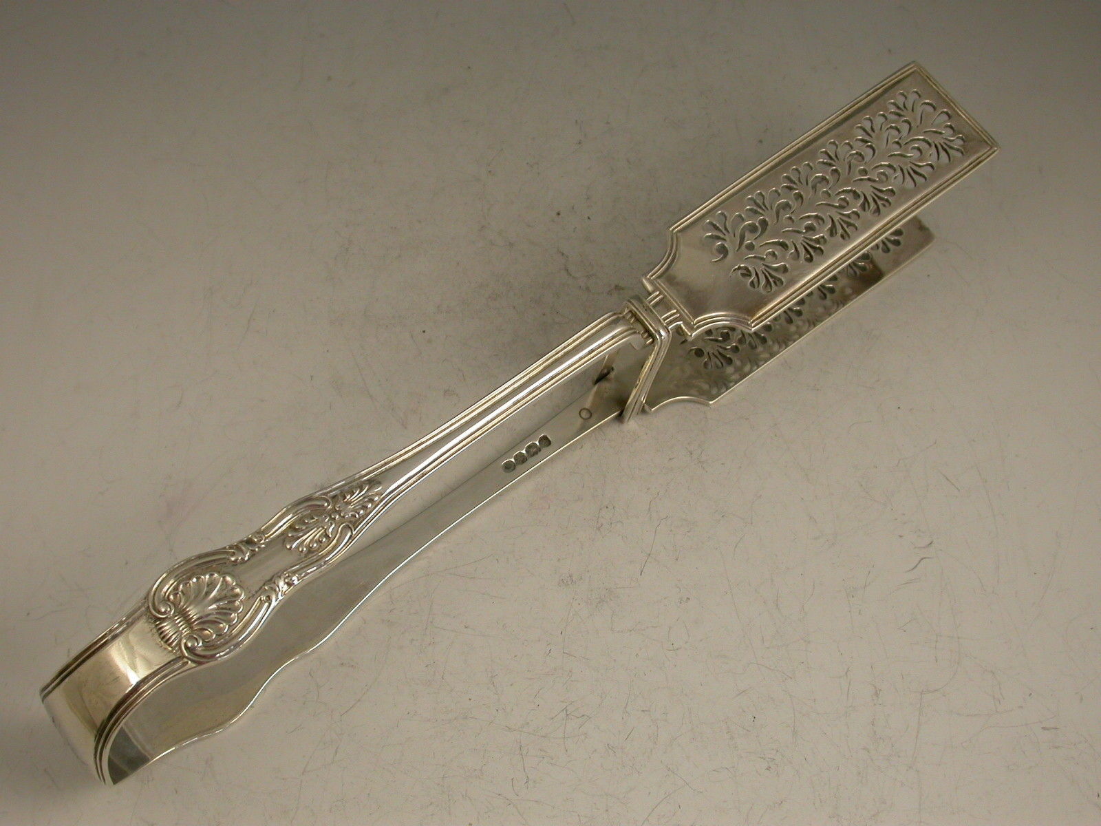 A good heavy quality pair of William IV Kings pattern silver Asparagus Tongs with pierced blades, the bow engraved with a crest of a unicorns head.