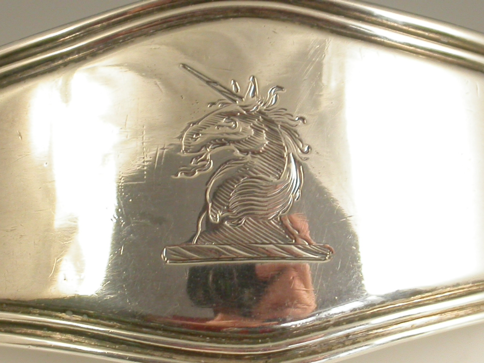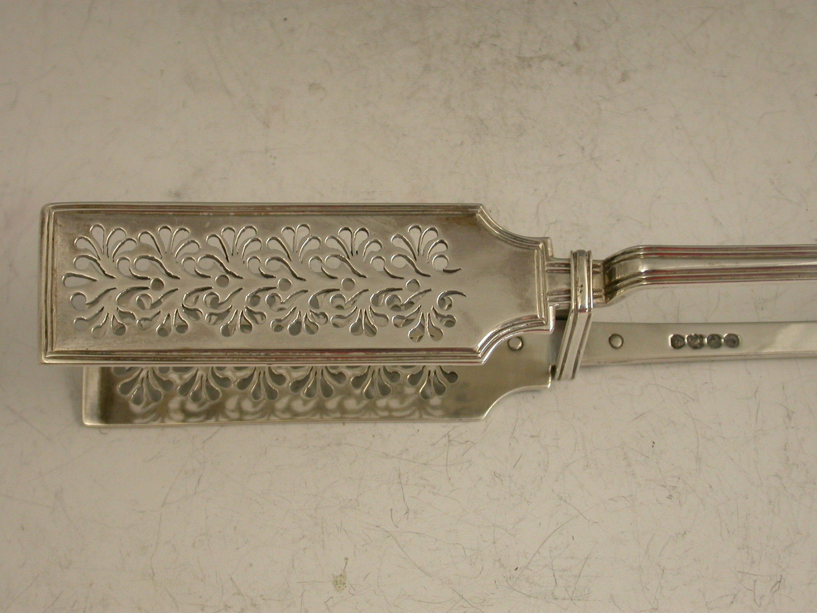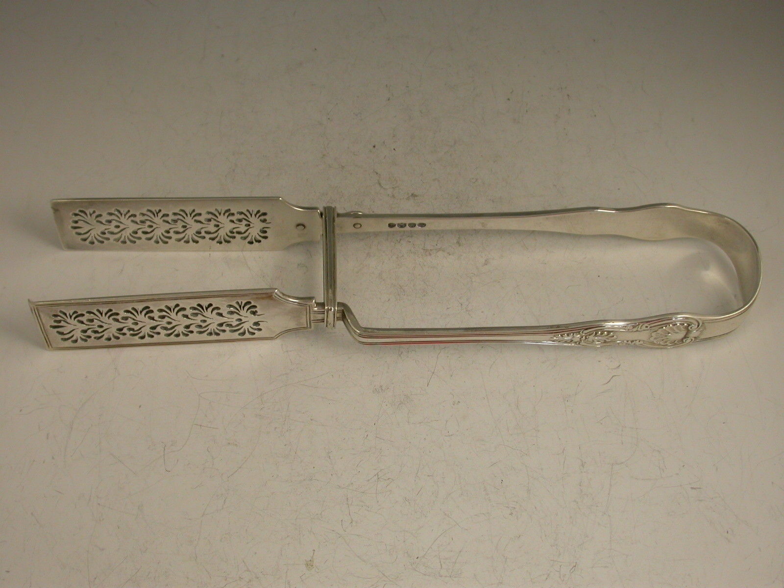 A good heavy quality pair of William IV Kings pattern silver Asparagus Tongs with pierced blades, the bow engraved with a crest of a unicorns head.