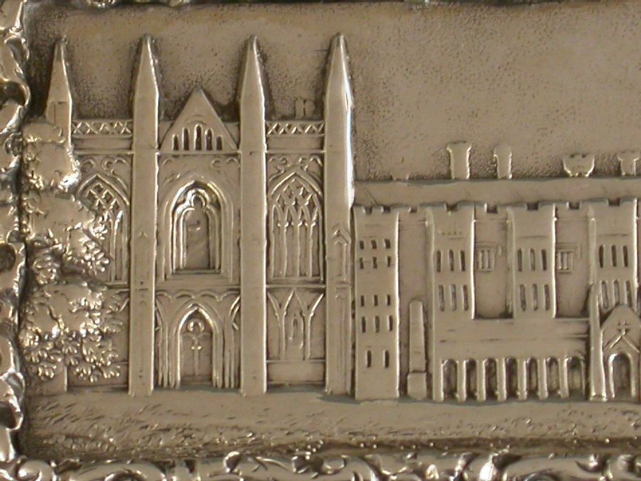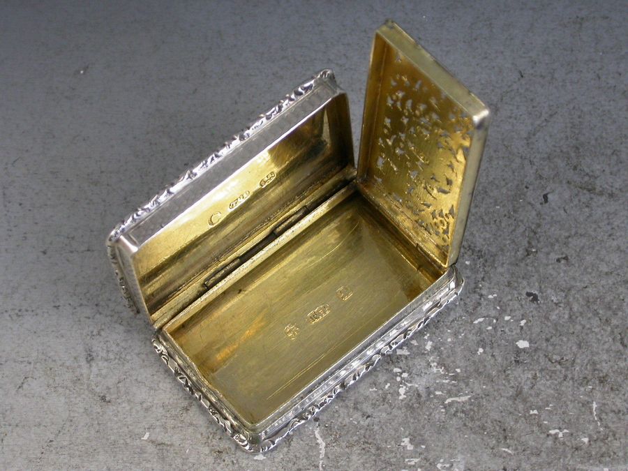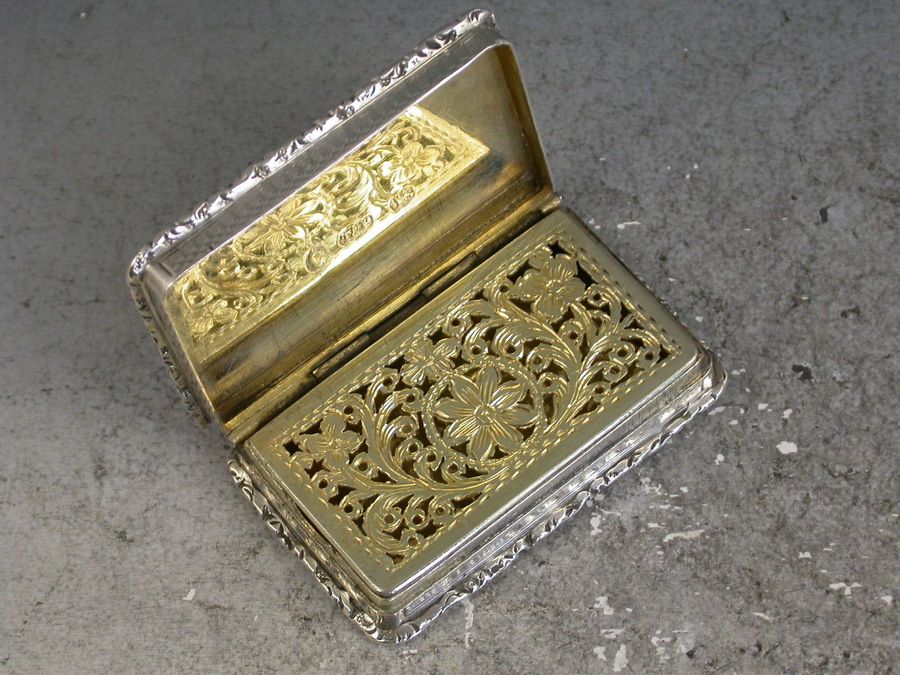 A good William IV silver Castle Top Vinaigrette of rectangular form with engine turned decoration to the base and sides, raised foliate borders and a rectangular cartouche to the base engraved with the owners name ""C. Hott, Crewe"". The lid with raised scene depicting Newstead Abbey (home of Lord Byron), the silver gilt interior with intricatley pierced foliate scroll grille.