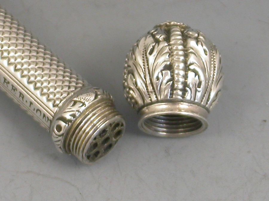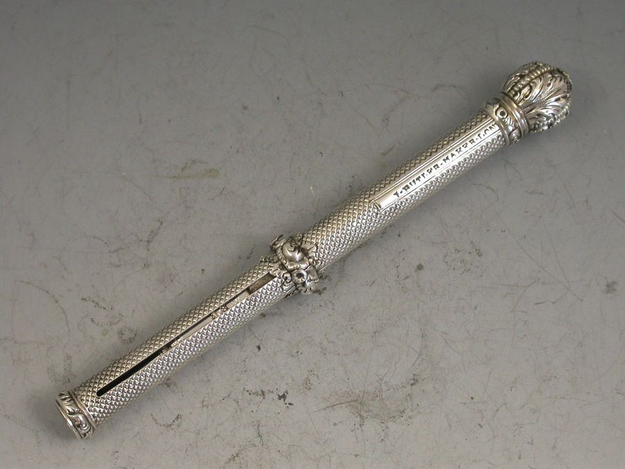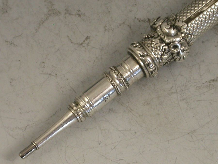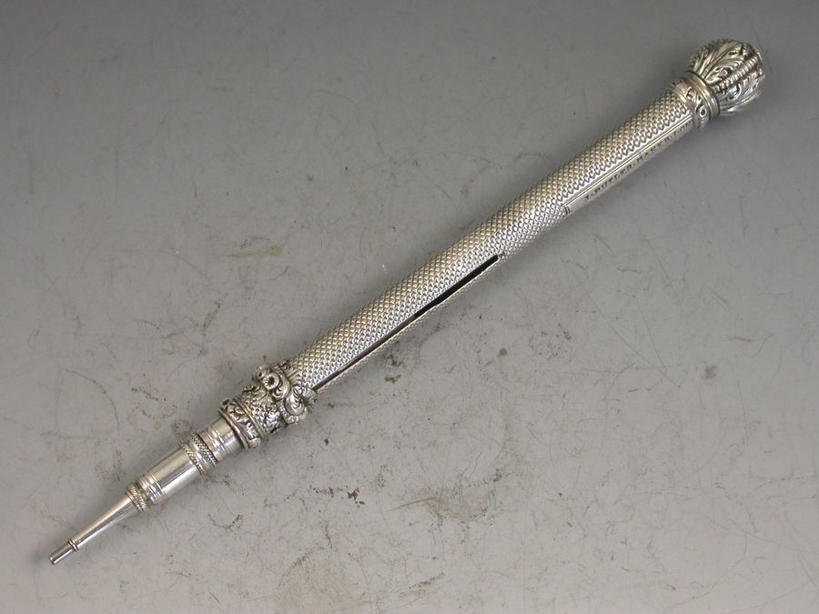 A good William IV silver sliding Propelling Pencil with engine turned tubular body, the slider ring and the spherical terminal chased with acanthus leaves.