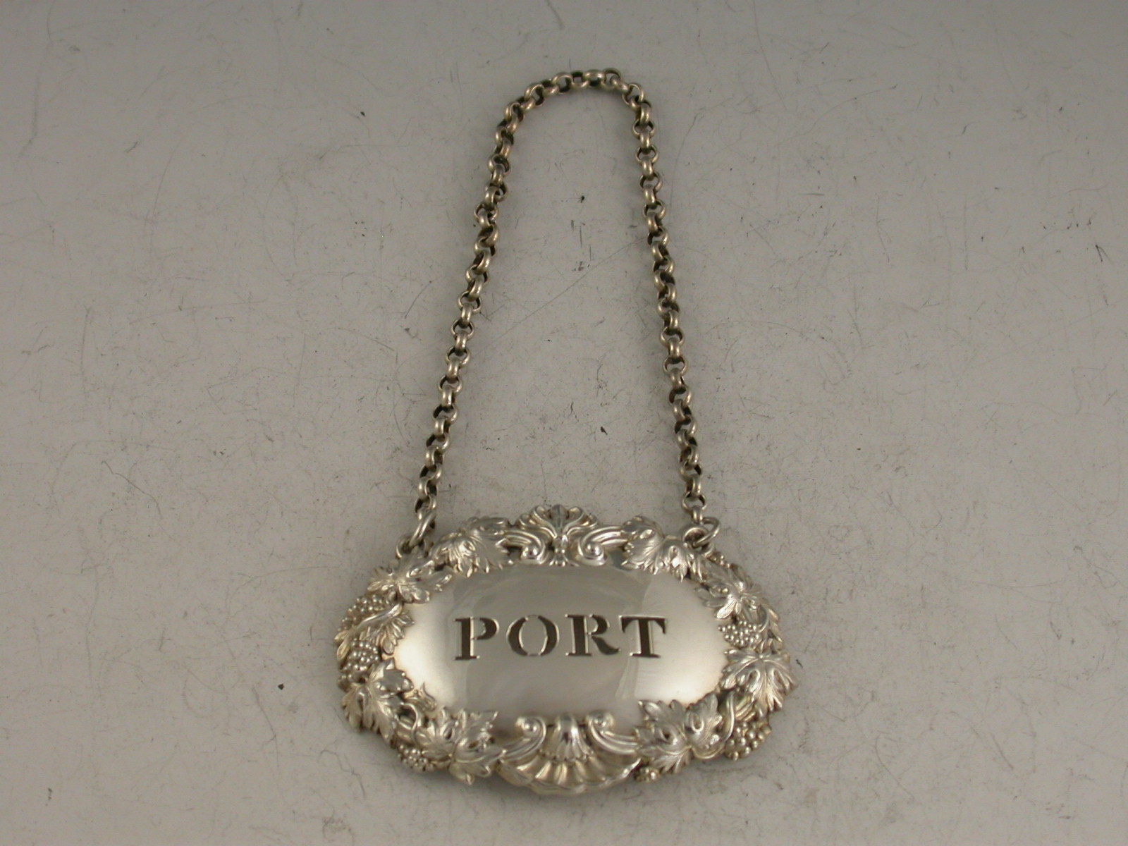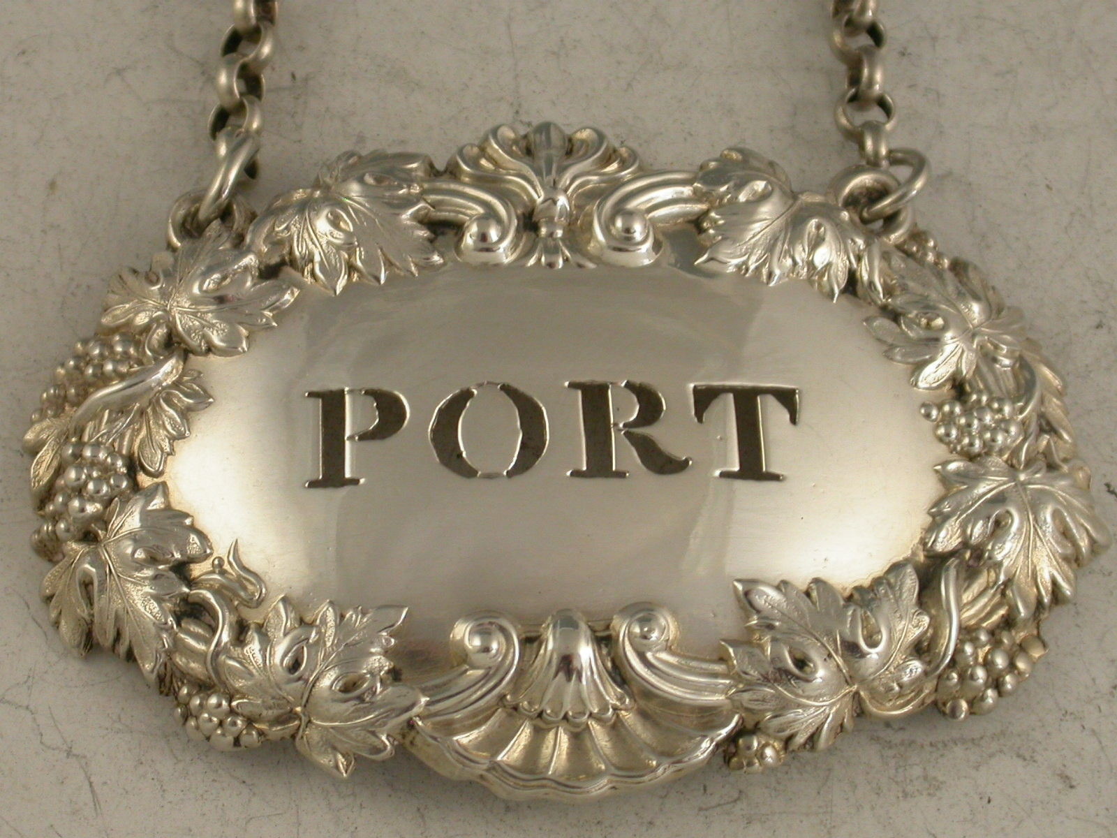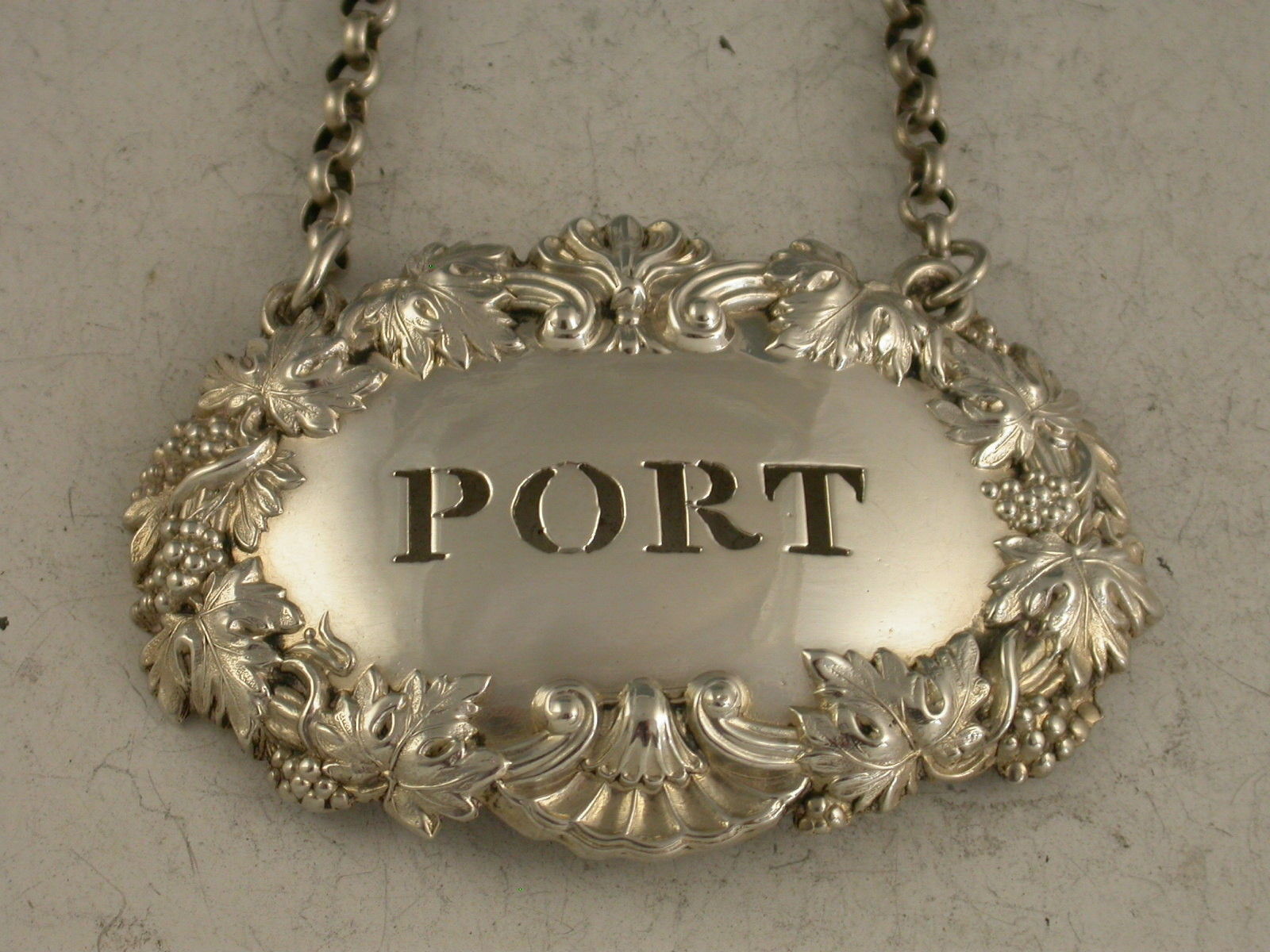 A William IV die-stamped silver Wine Label of shaped oval form with raised border of shells, scrolls, vine leaves and grapes, pierced for Port.