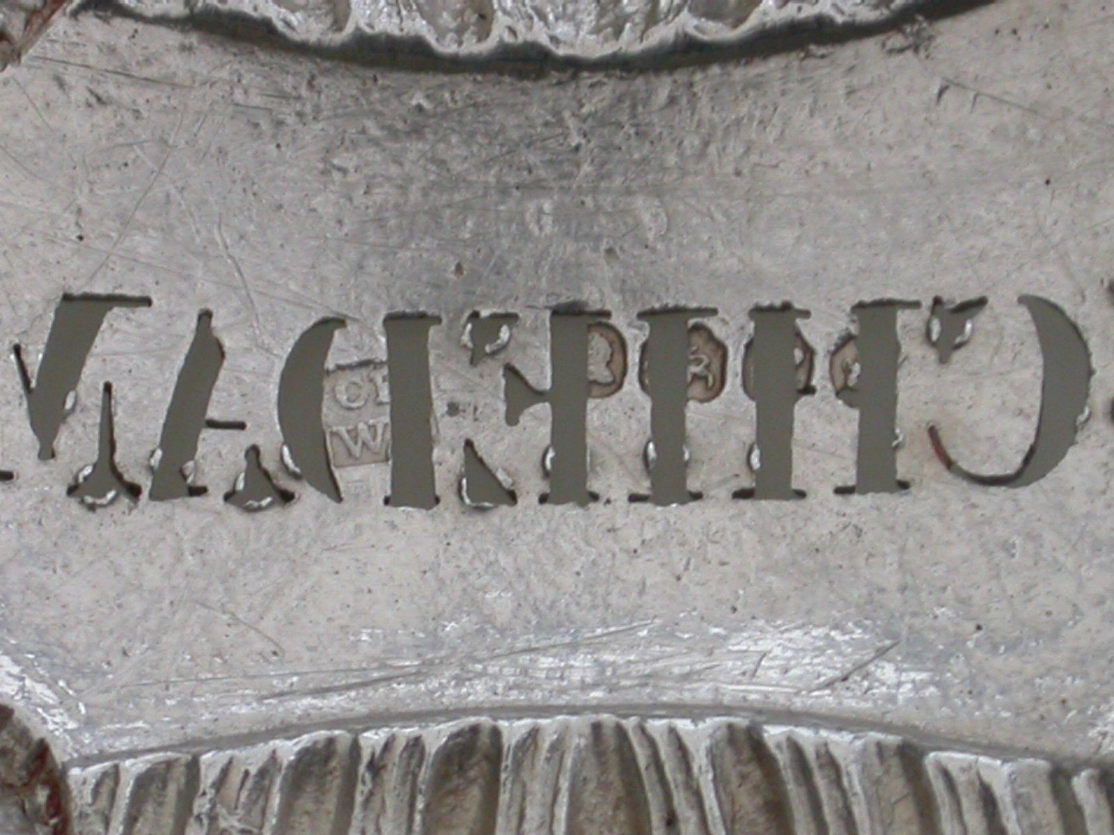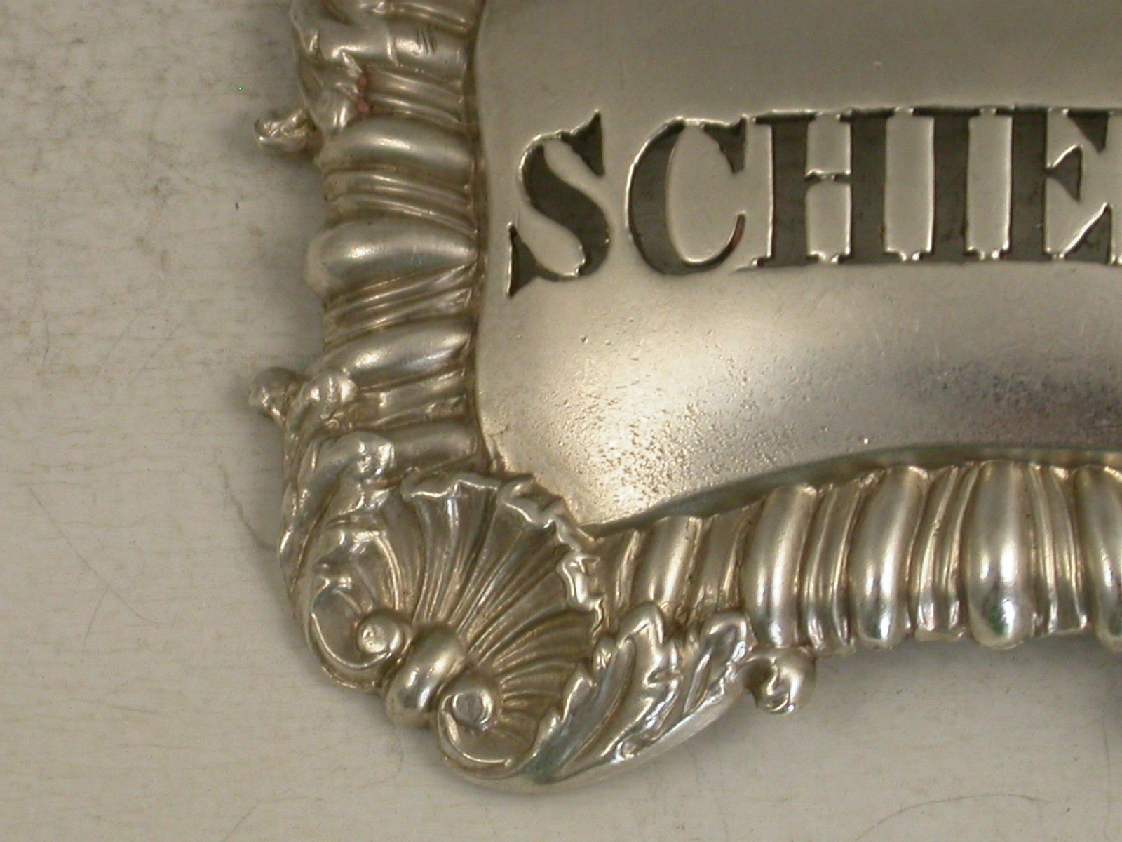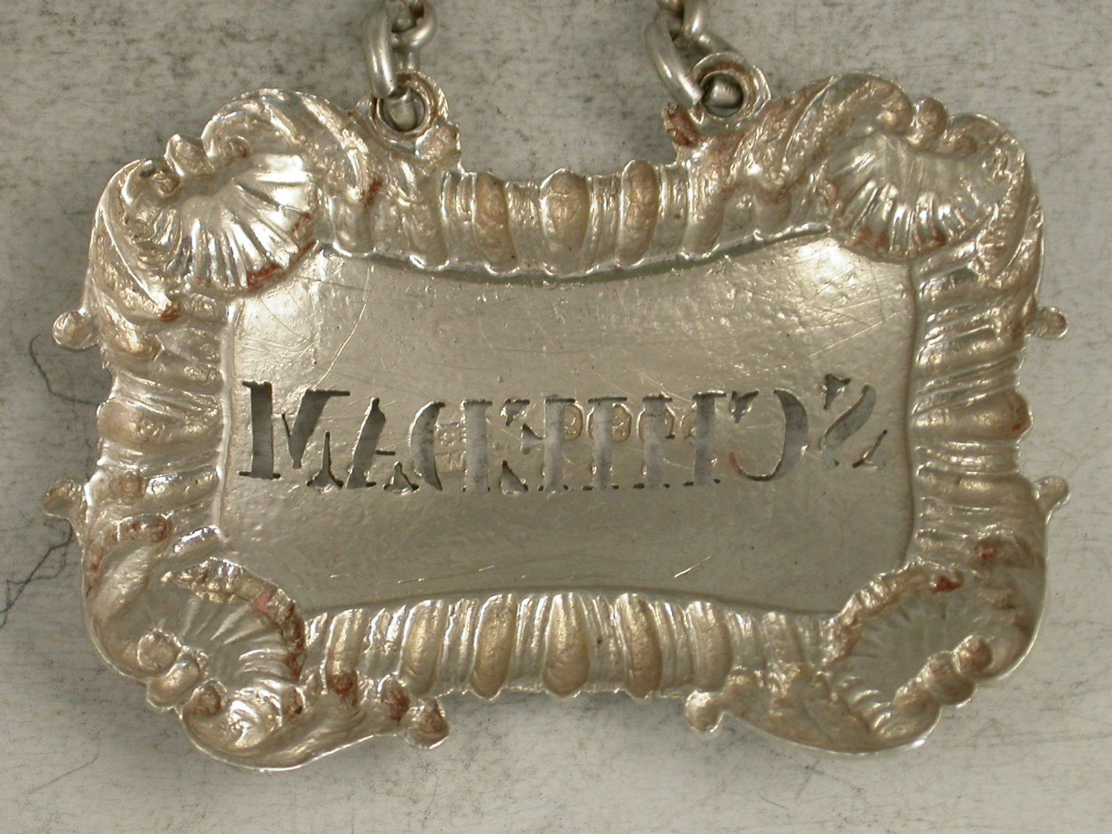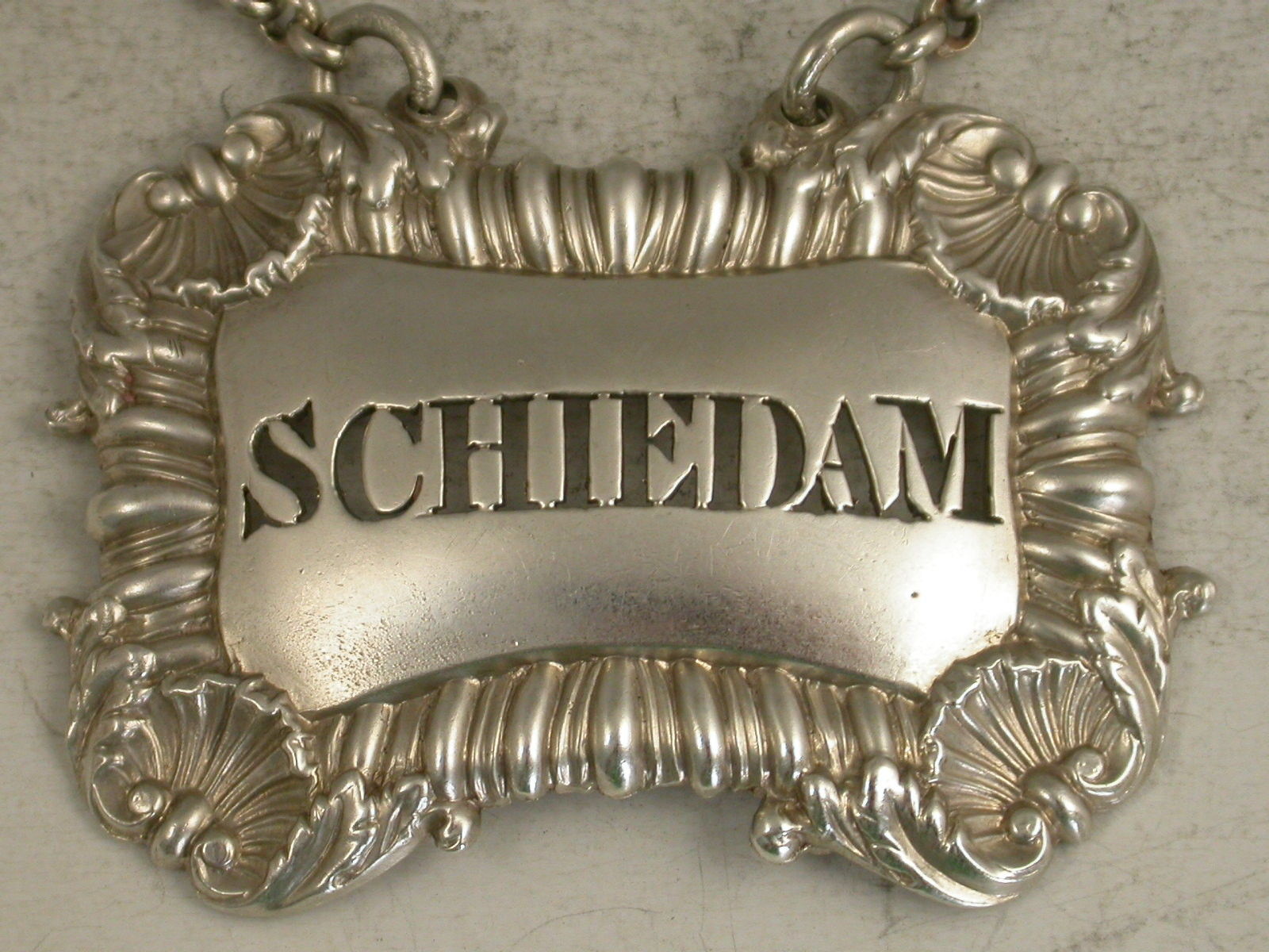 A rare William IV silver Wine Label of cushion shape with gadrooned border, a concave shell at each corner, pierced for Schiedam, (a Dutch Gin and a rare title).