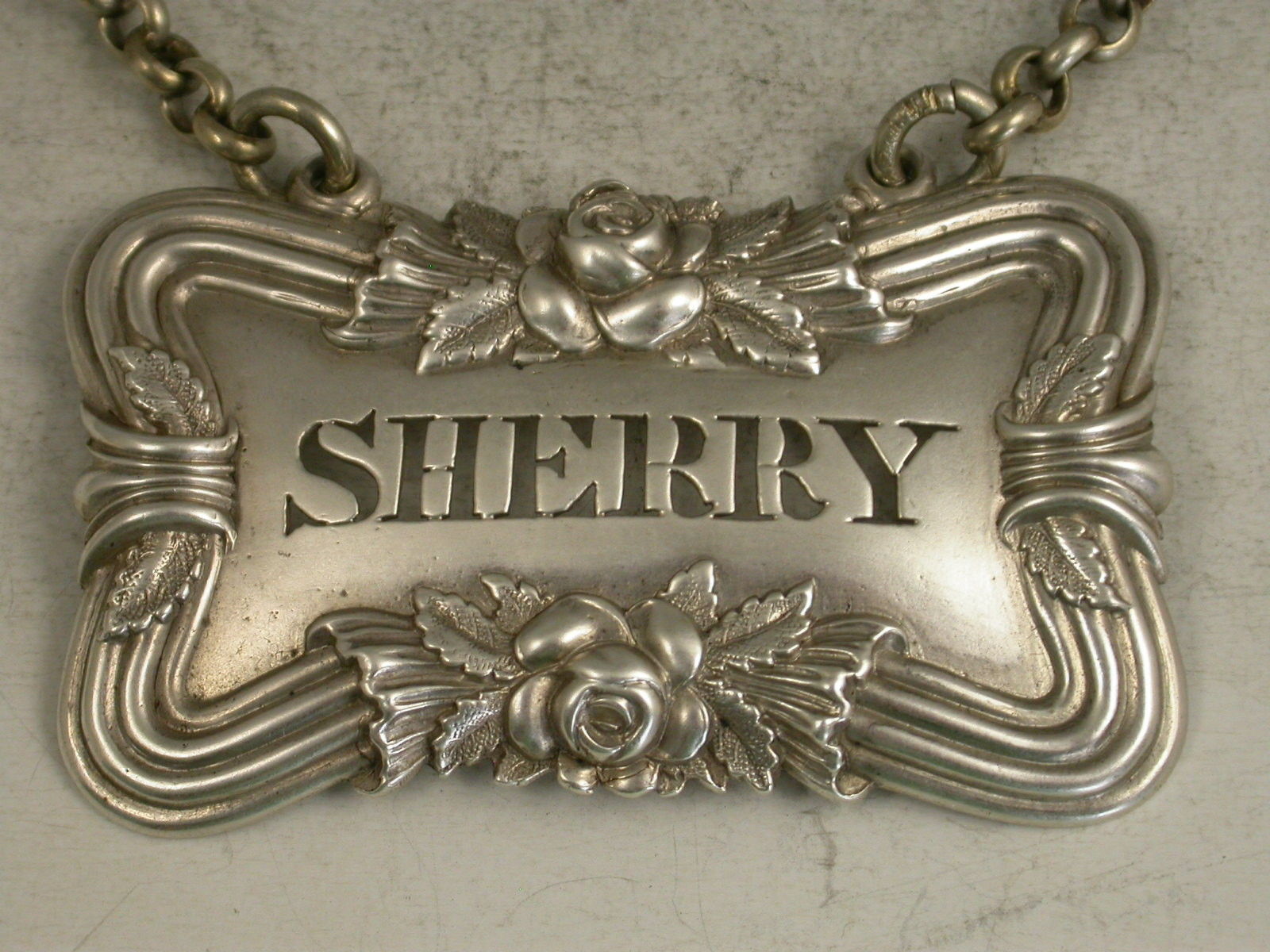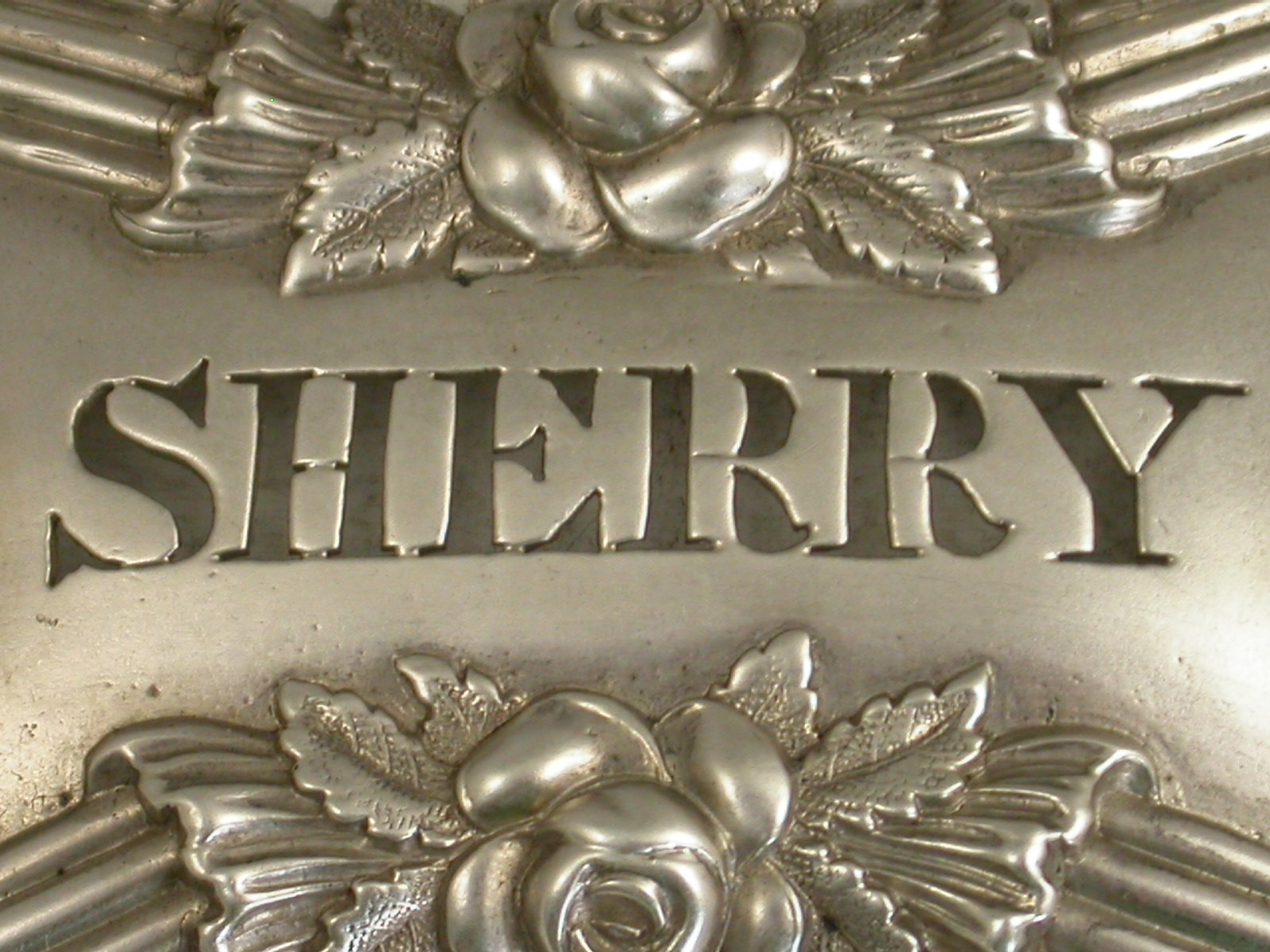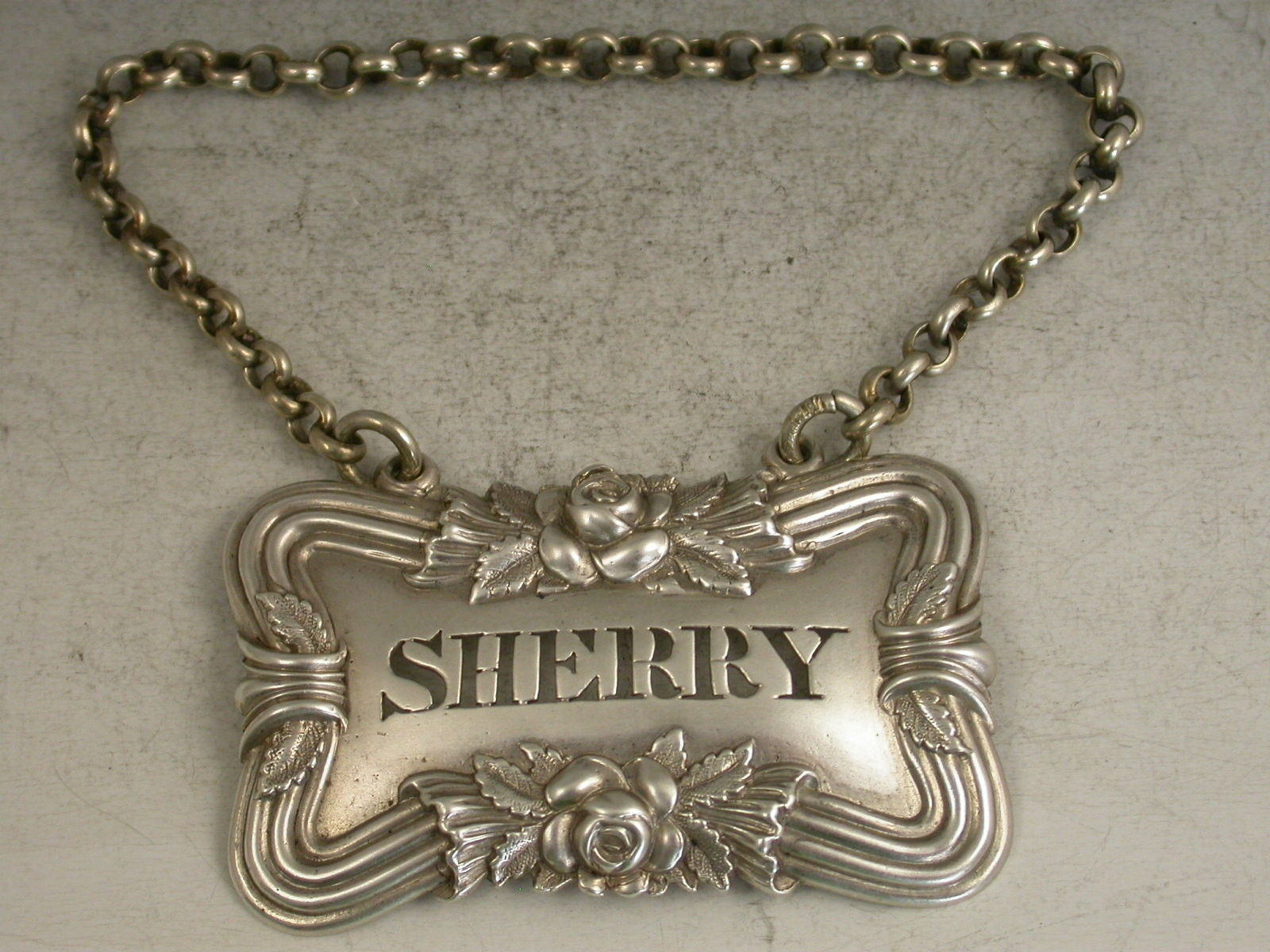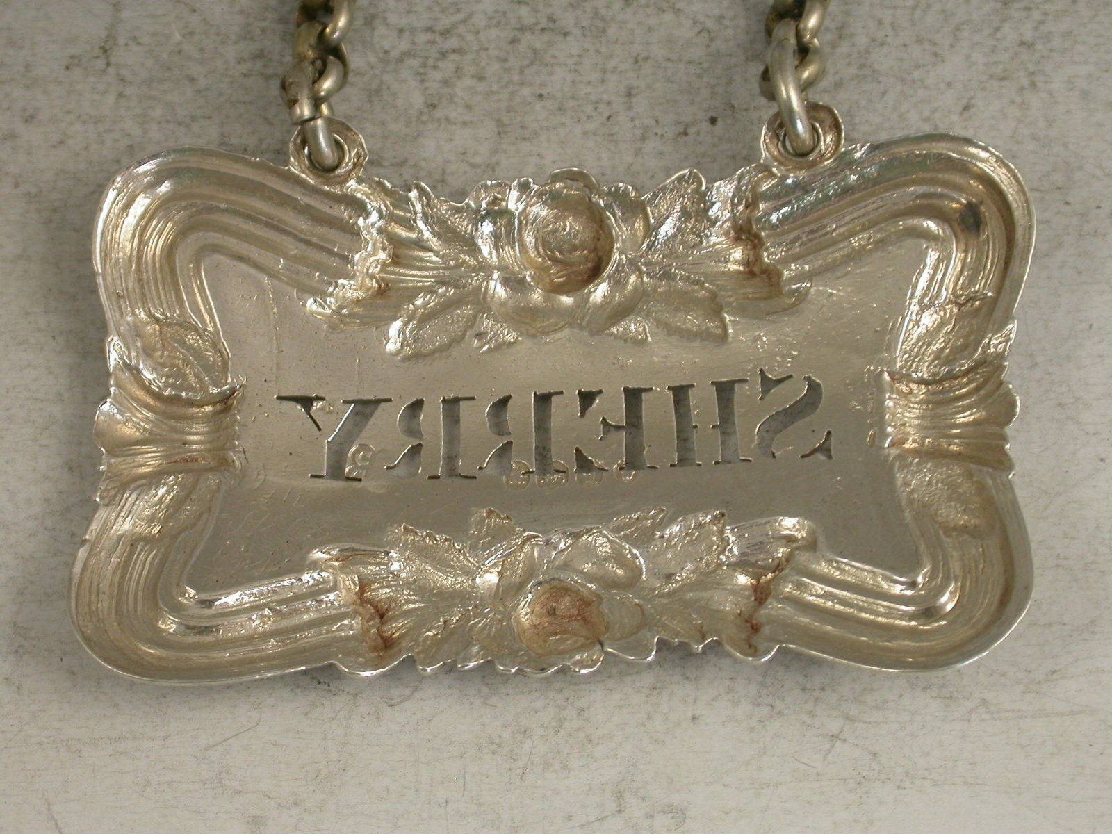 A good William IV die-stamped silver Wine Label of cushion shape with raised moulded reeded border connected with rose heads and foliage and and below the pierced title for Sherry.