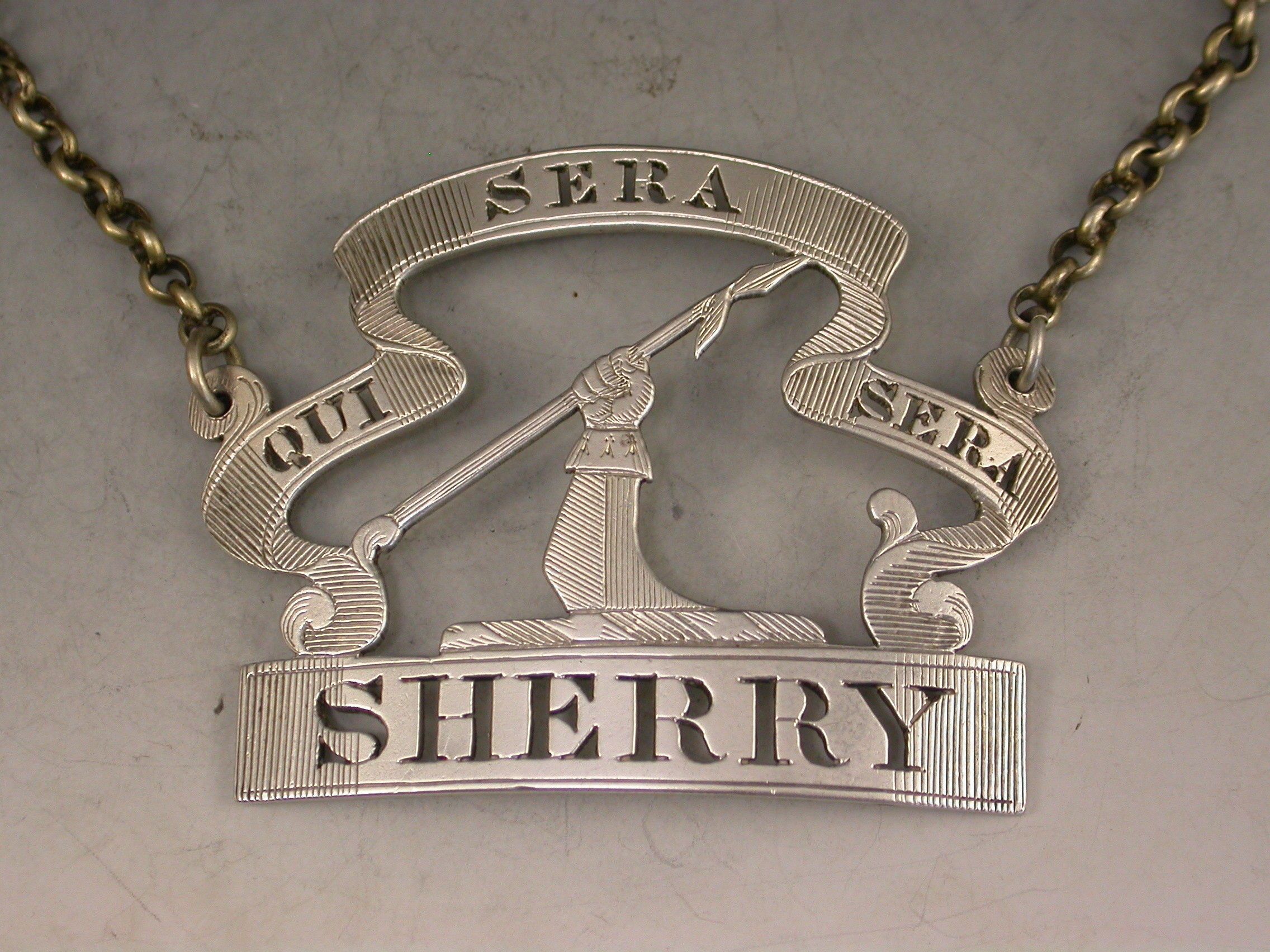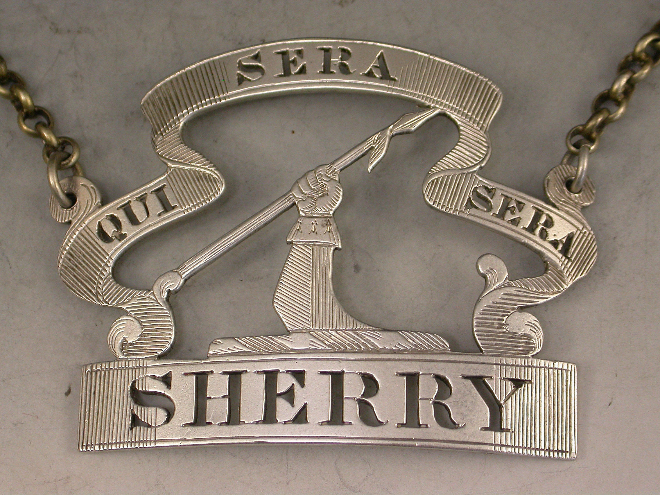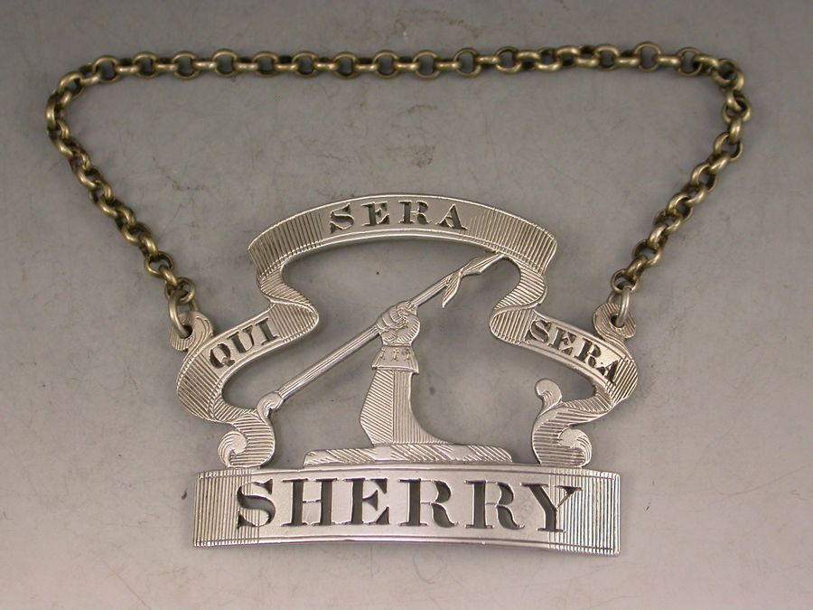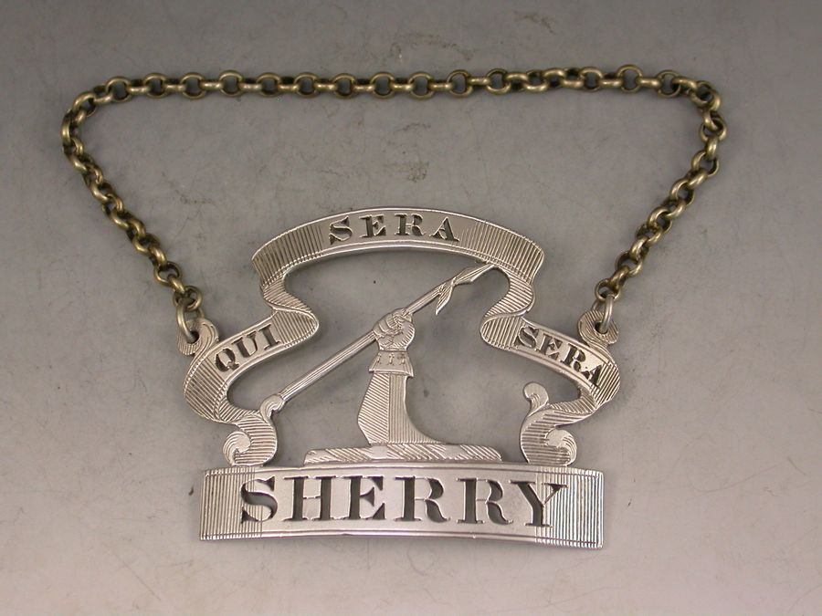A rare William IV Armorial silver Wine Label of pierced form depicting the crest of the Ffolkes family of Norfolk below a pierced banner with the motto 'Qui Sera Sera' (what will be, will be). The name plate pierced for Sherry.