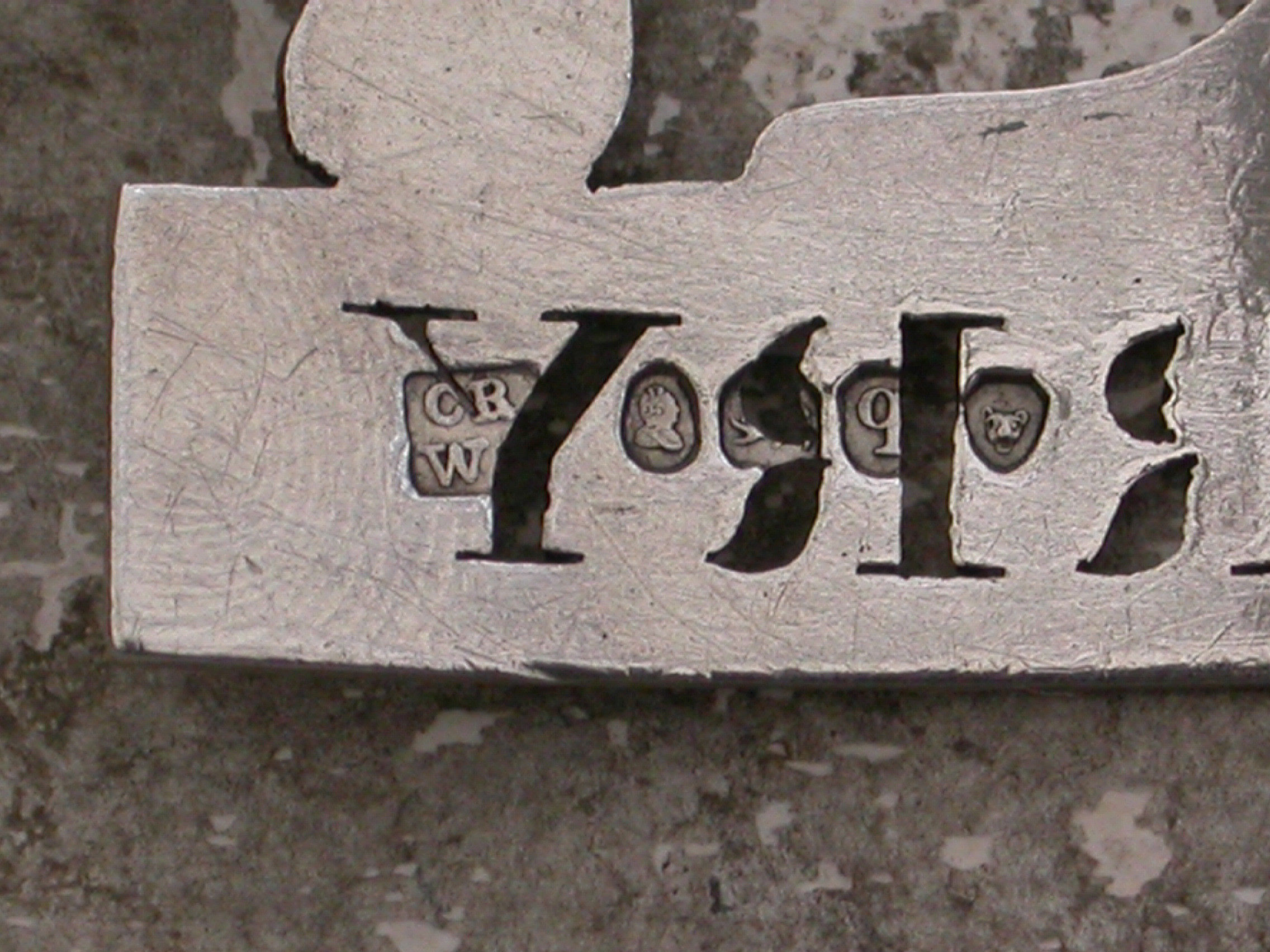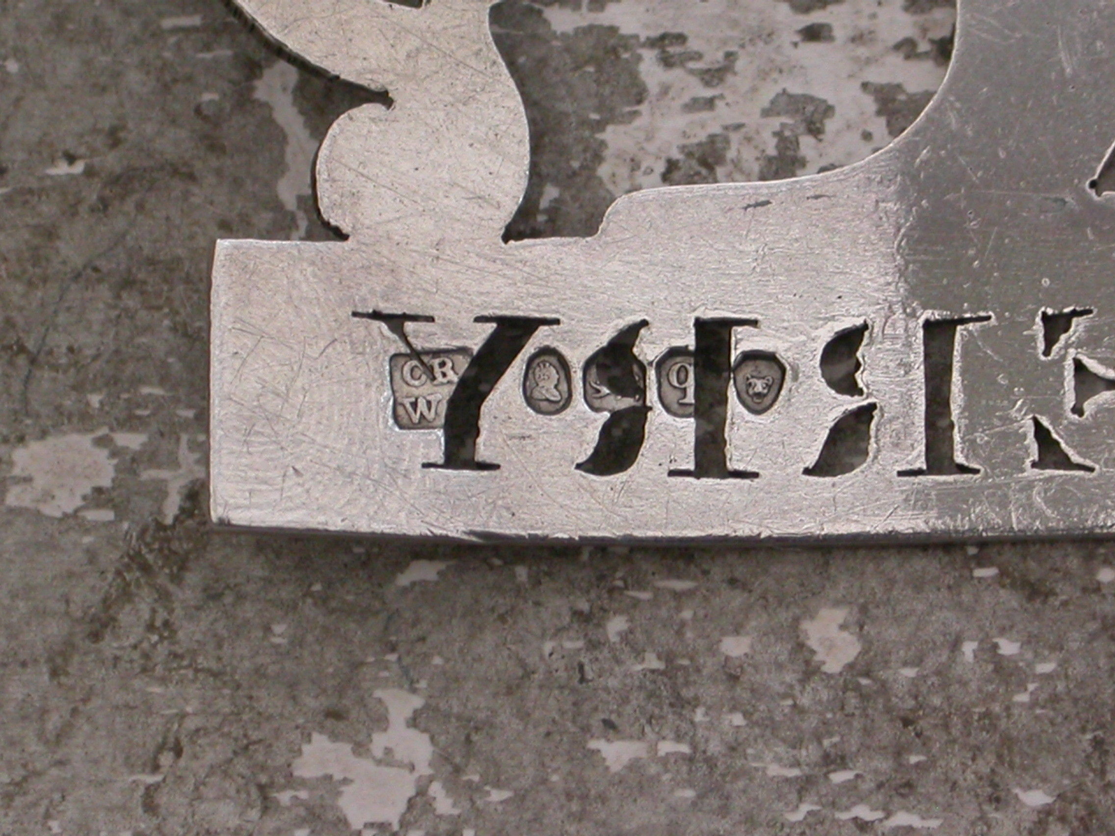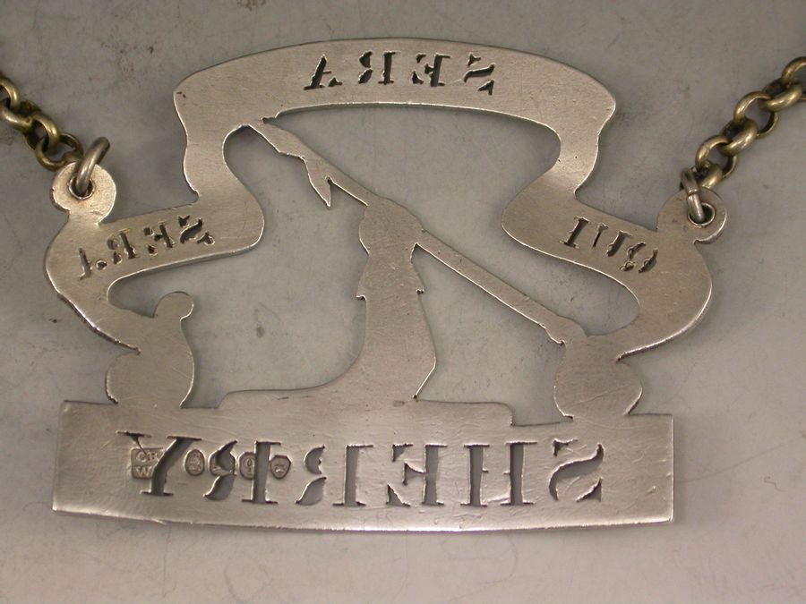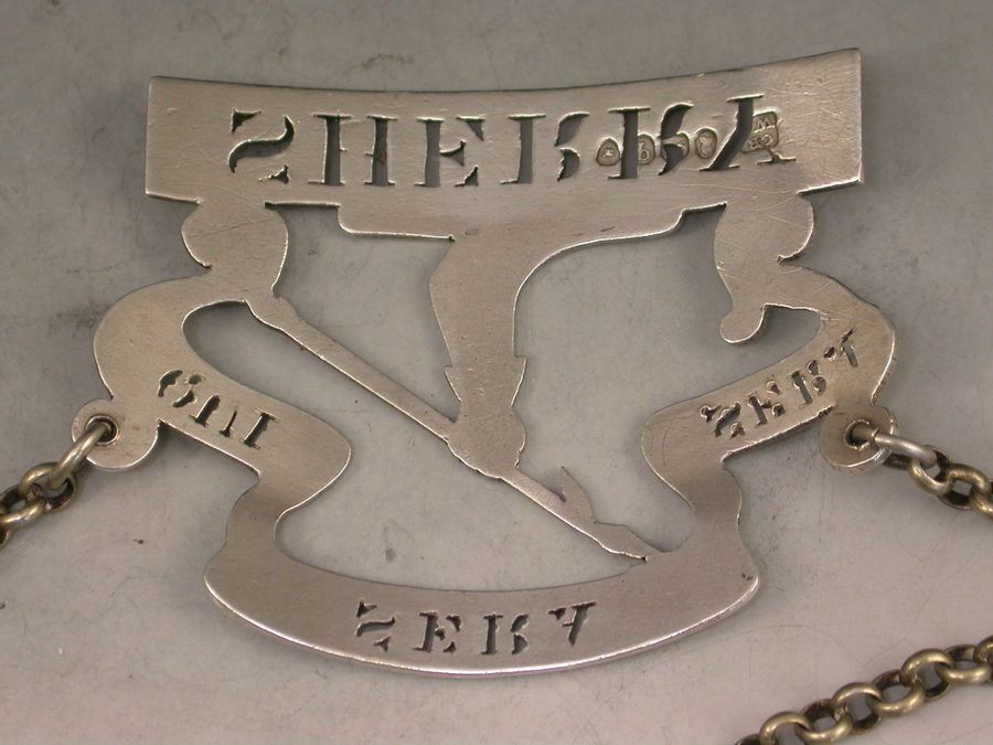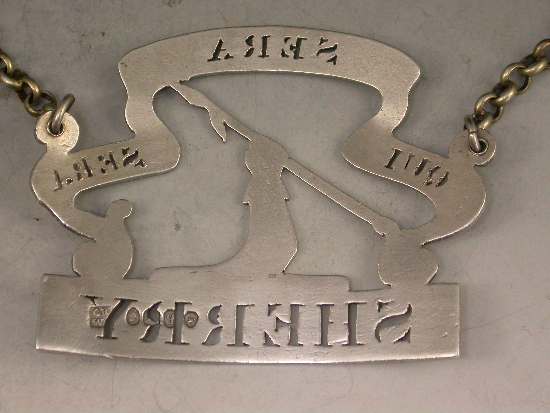 A rare William IV Armorial silver Wine Label of pierced form depicting the crest of the Ffolkes family of Norfolk below a pierced banner with the motto 'Qui Sera Sera' (what will be, will be). The name plate pierced for Sherry.