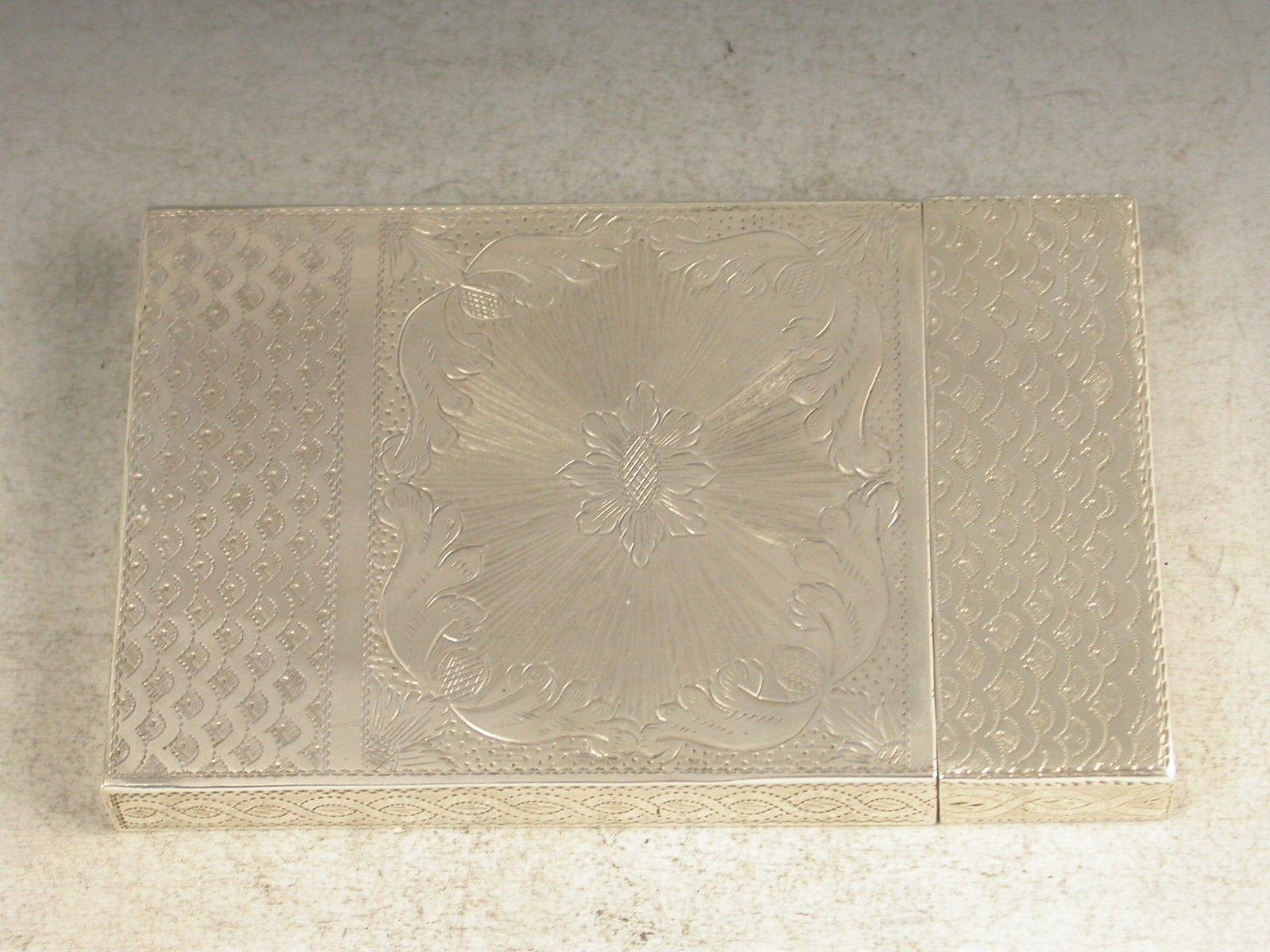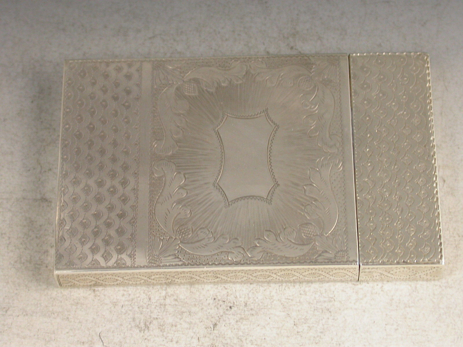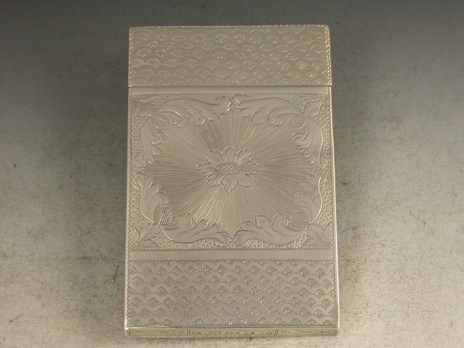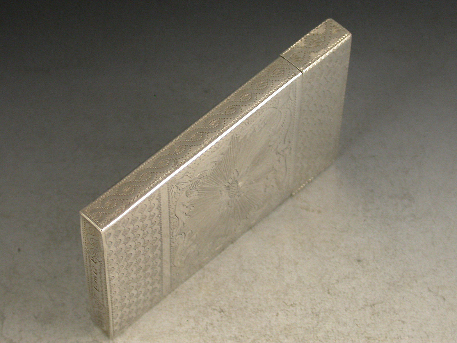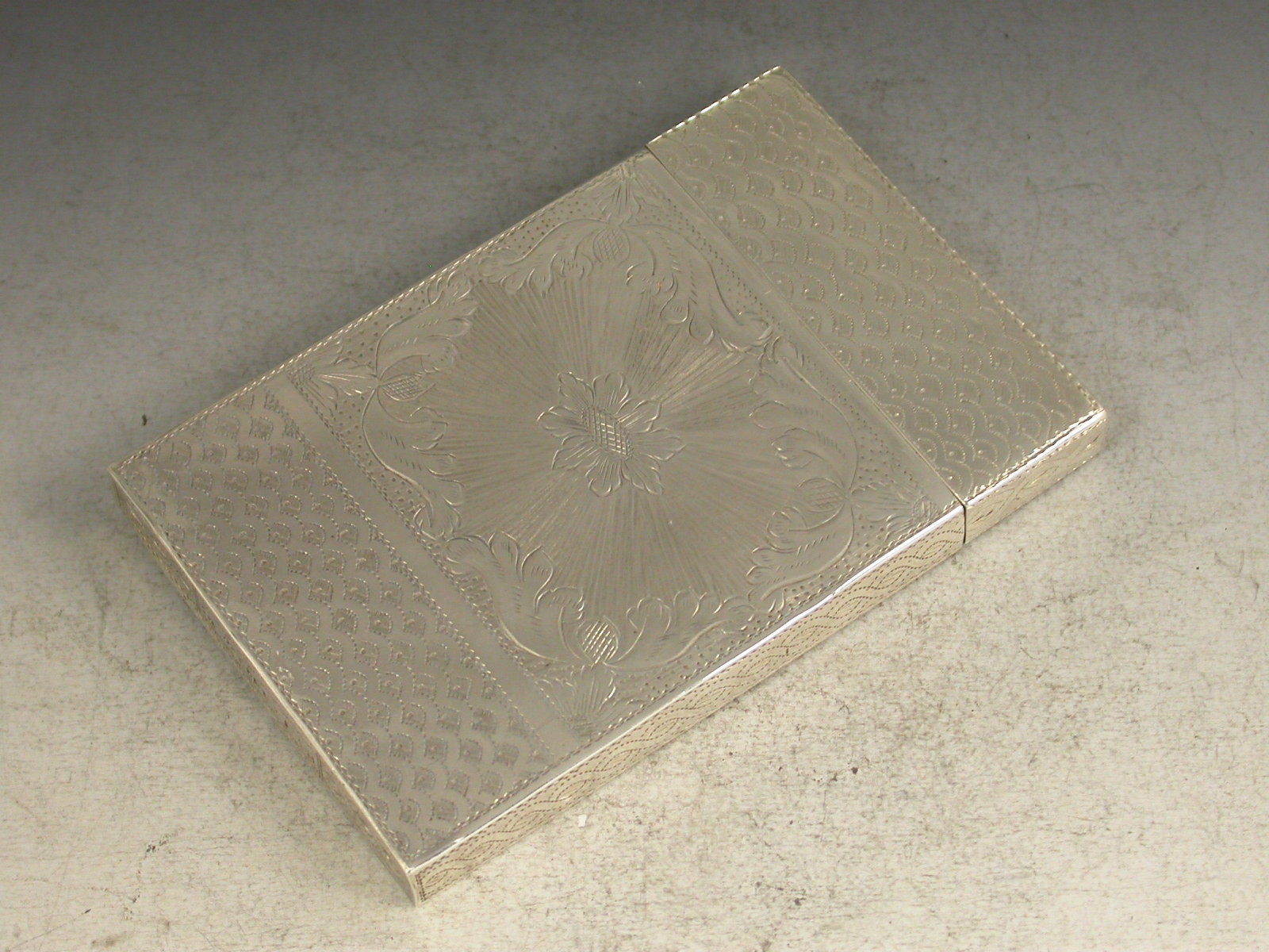 A very fine William IV silver Calling Card Case of plain rectangular form with pull-off cover, every surface with extremely fine bright-cut engraved decoration.A vacant cartouche to the front. A superb example of the engravers art.