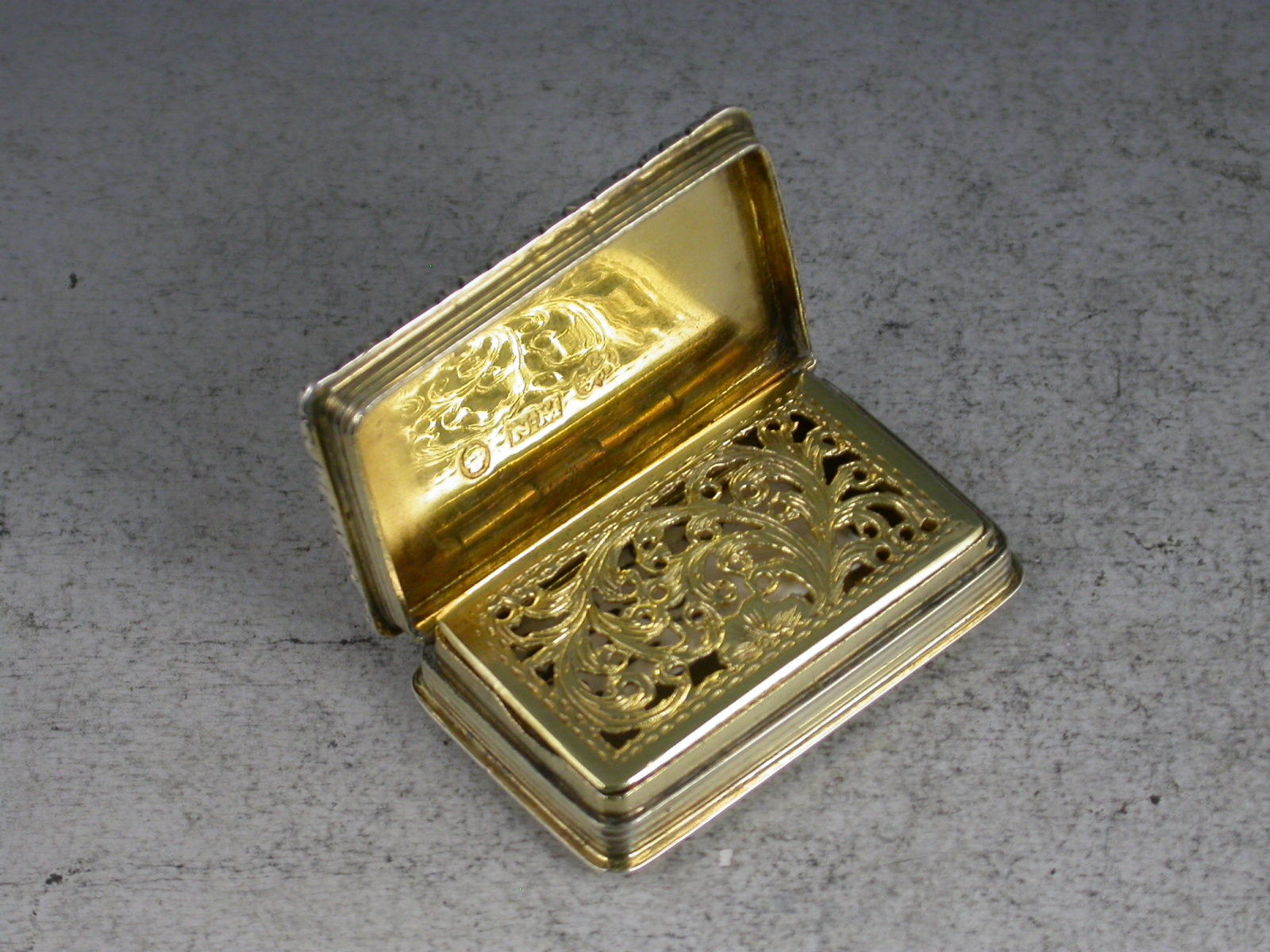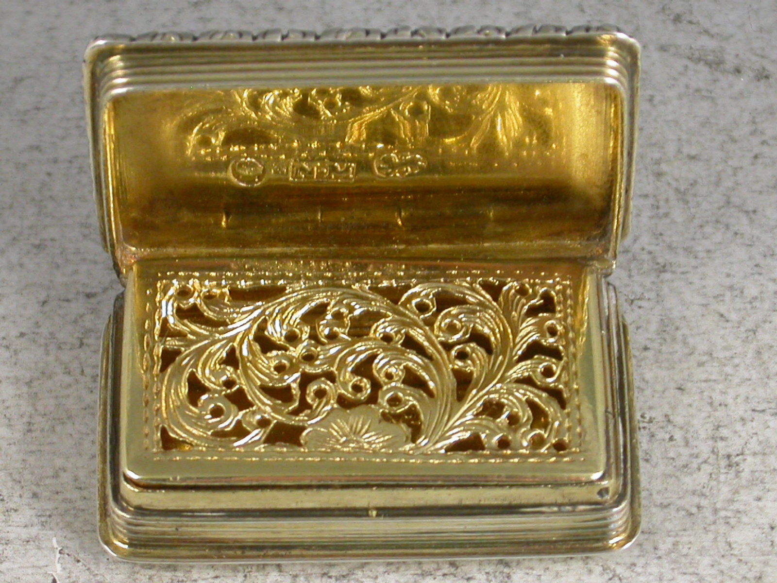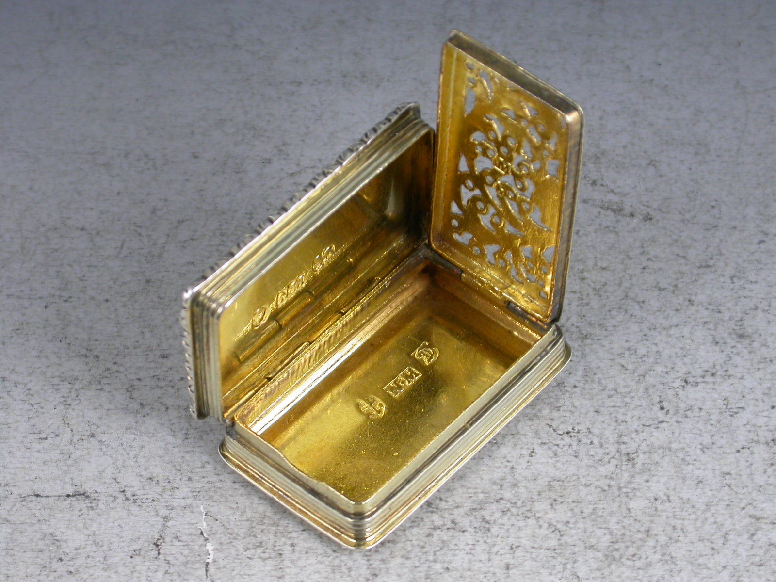 A nice quality William IV / Victorian silver gilt Vinaigrette of rectangular form with raised foliate border and reeded sides, engine turned decoration to the base and lid with a vacant rectangular cartouche, the silver gilt interior with a foliate scroll pierced grill.