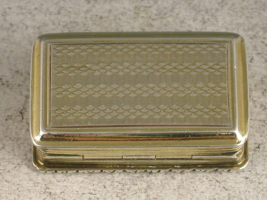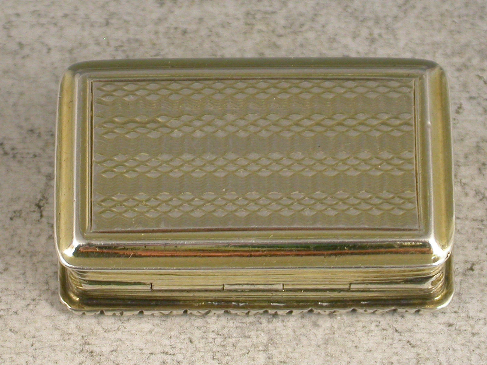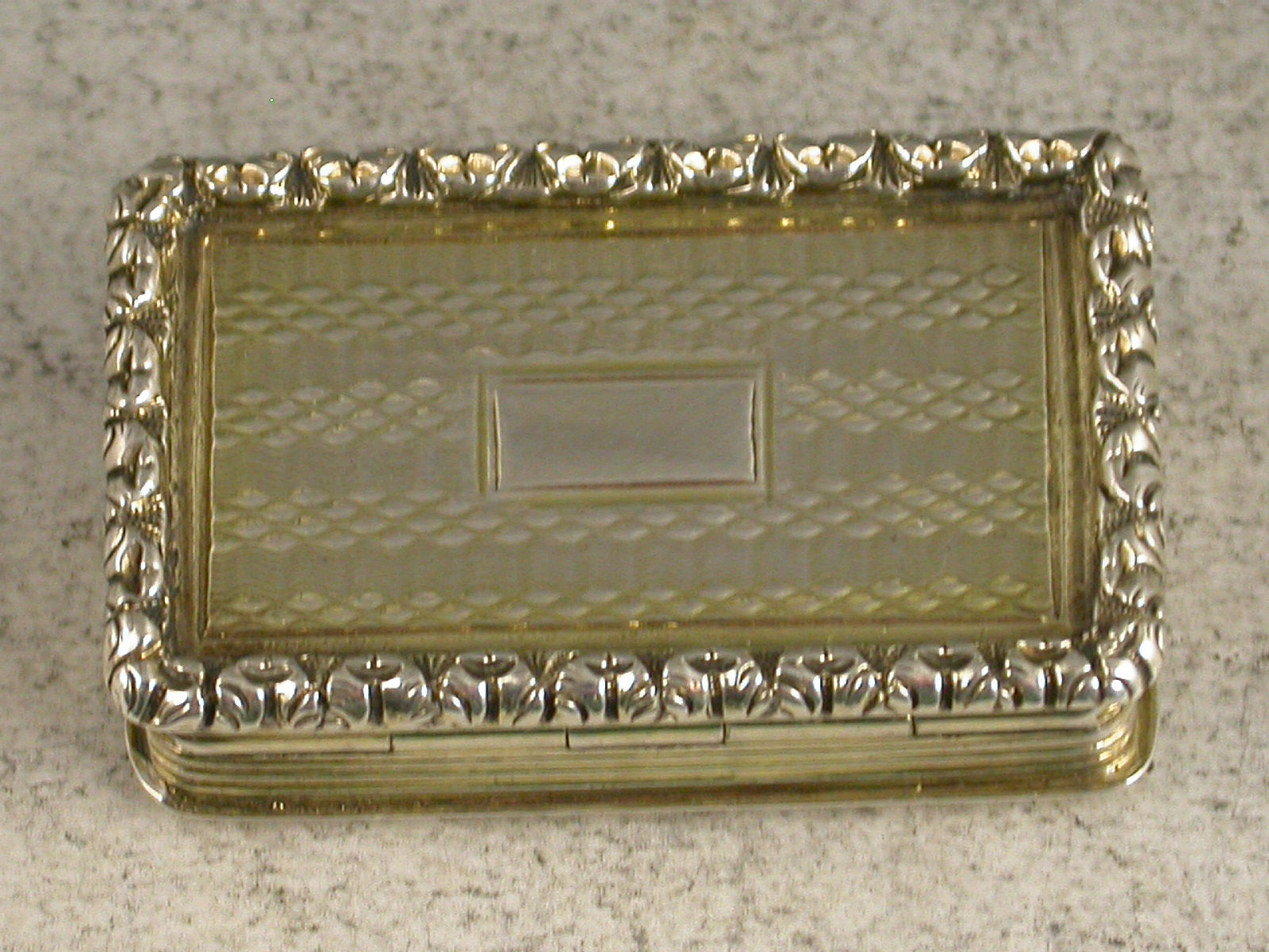 A nice quality William IV / Victorian silver gilt Vinaigrette of rectangular form with raised foliate border and reeded sides, engine turned decoration to the base and lid with a vacant rectangular cartouche, the silver gilt interior with a foliate scroll pierced grill.
