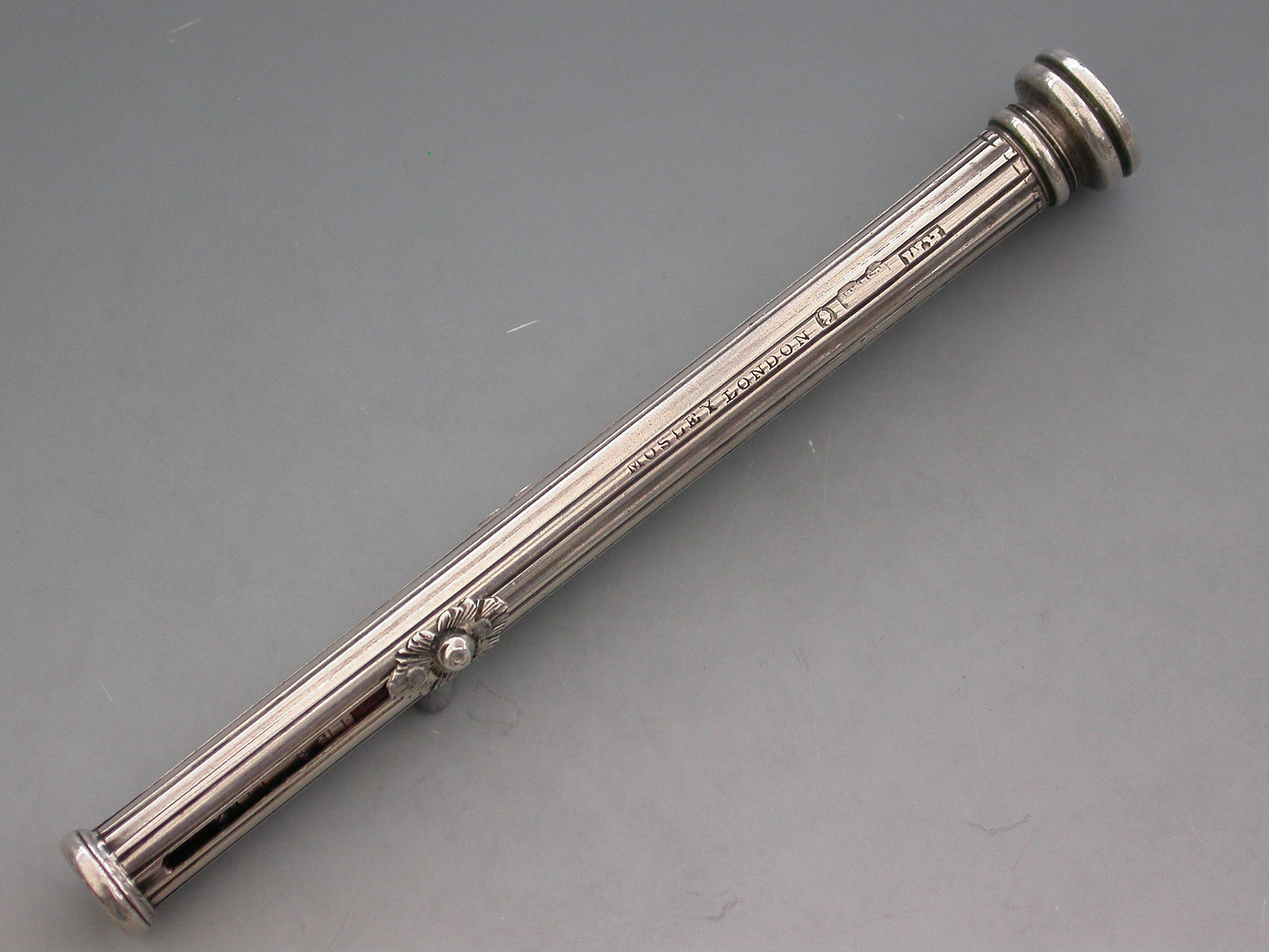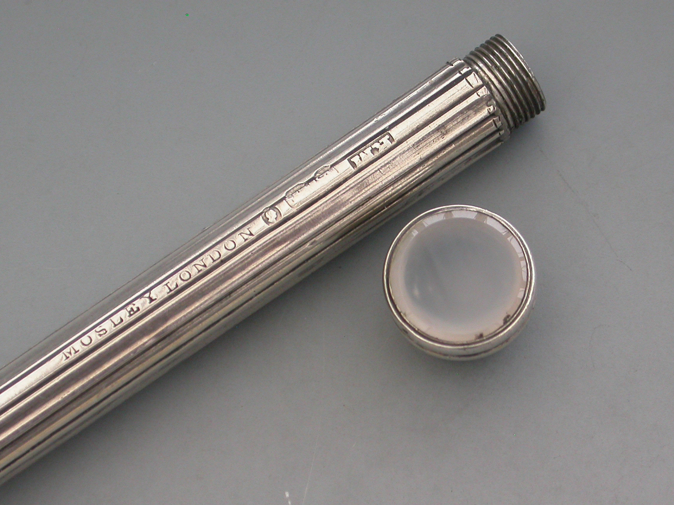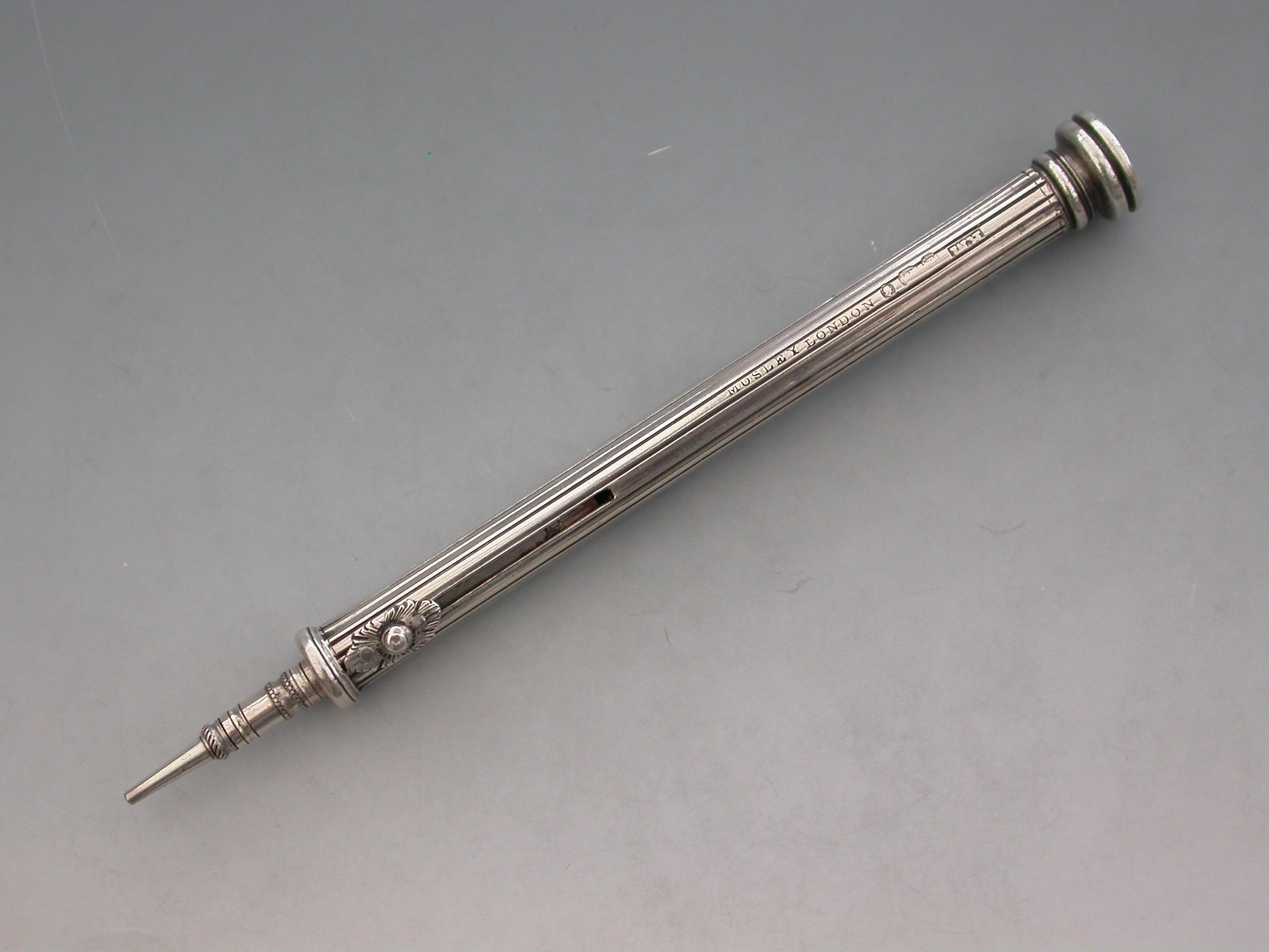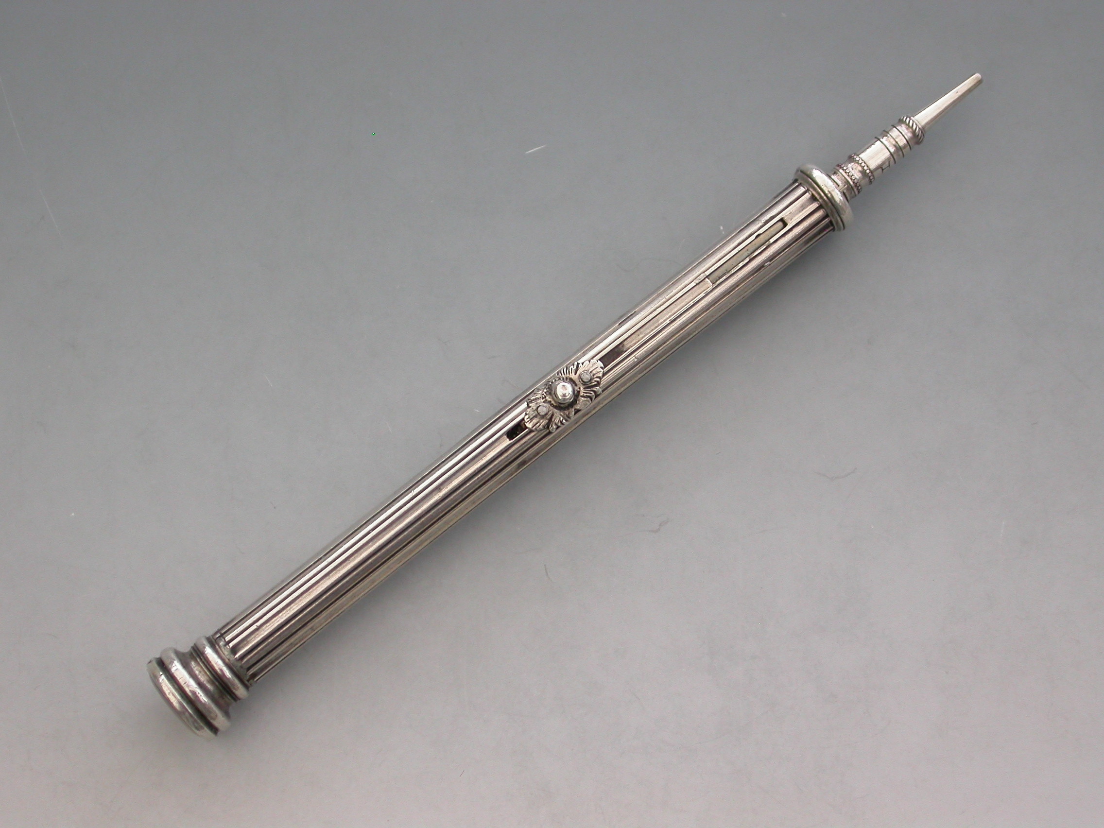 A rare William IV fully hallmarked silver combination sliding Propelling Pencil and Pen, the cylindrical body with reeded decoration and cast floral slider buttons. The seal terminal set with a Chalcedony seal stone and unscrewing to reveal a lead reservoir.