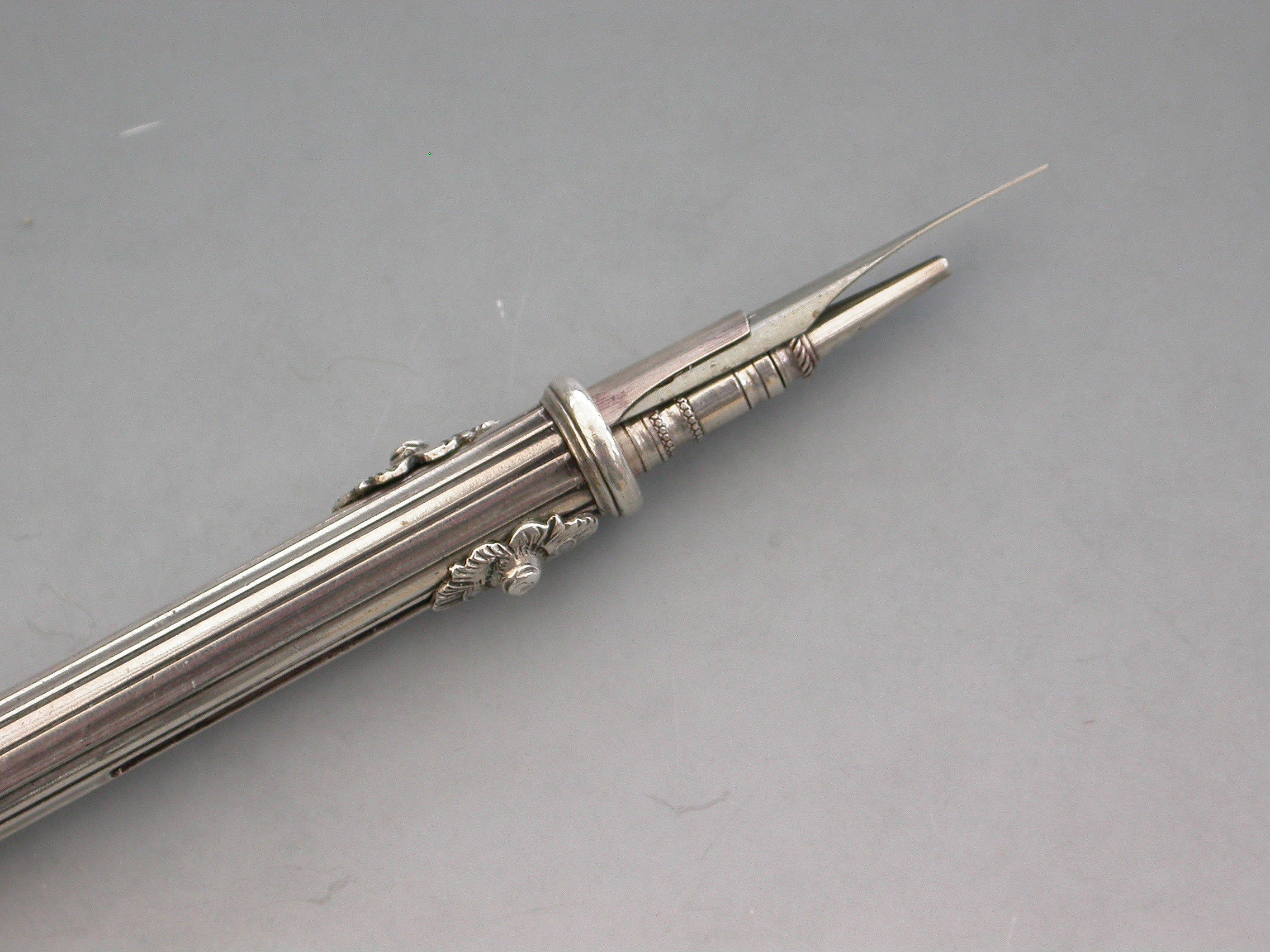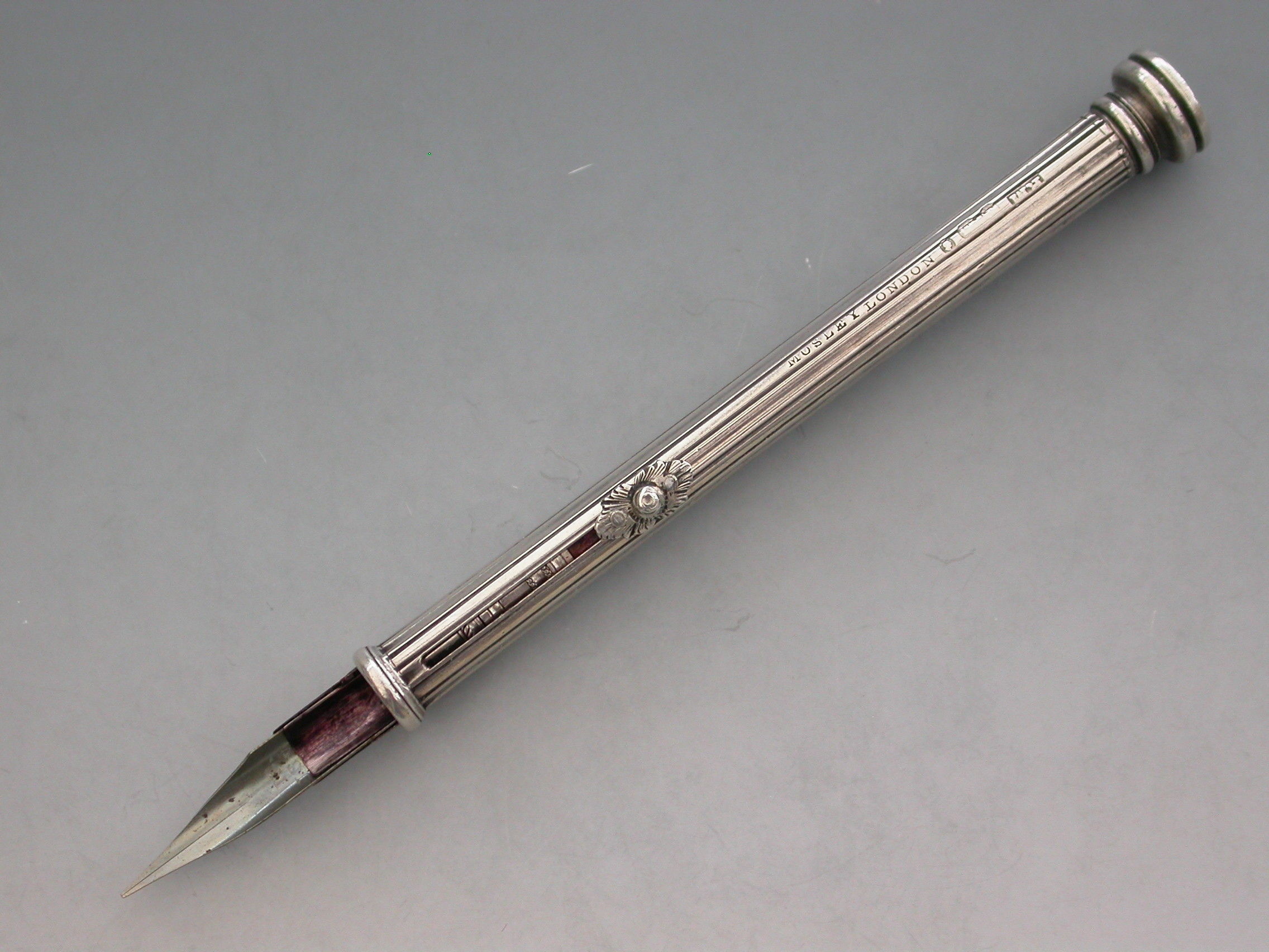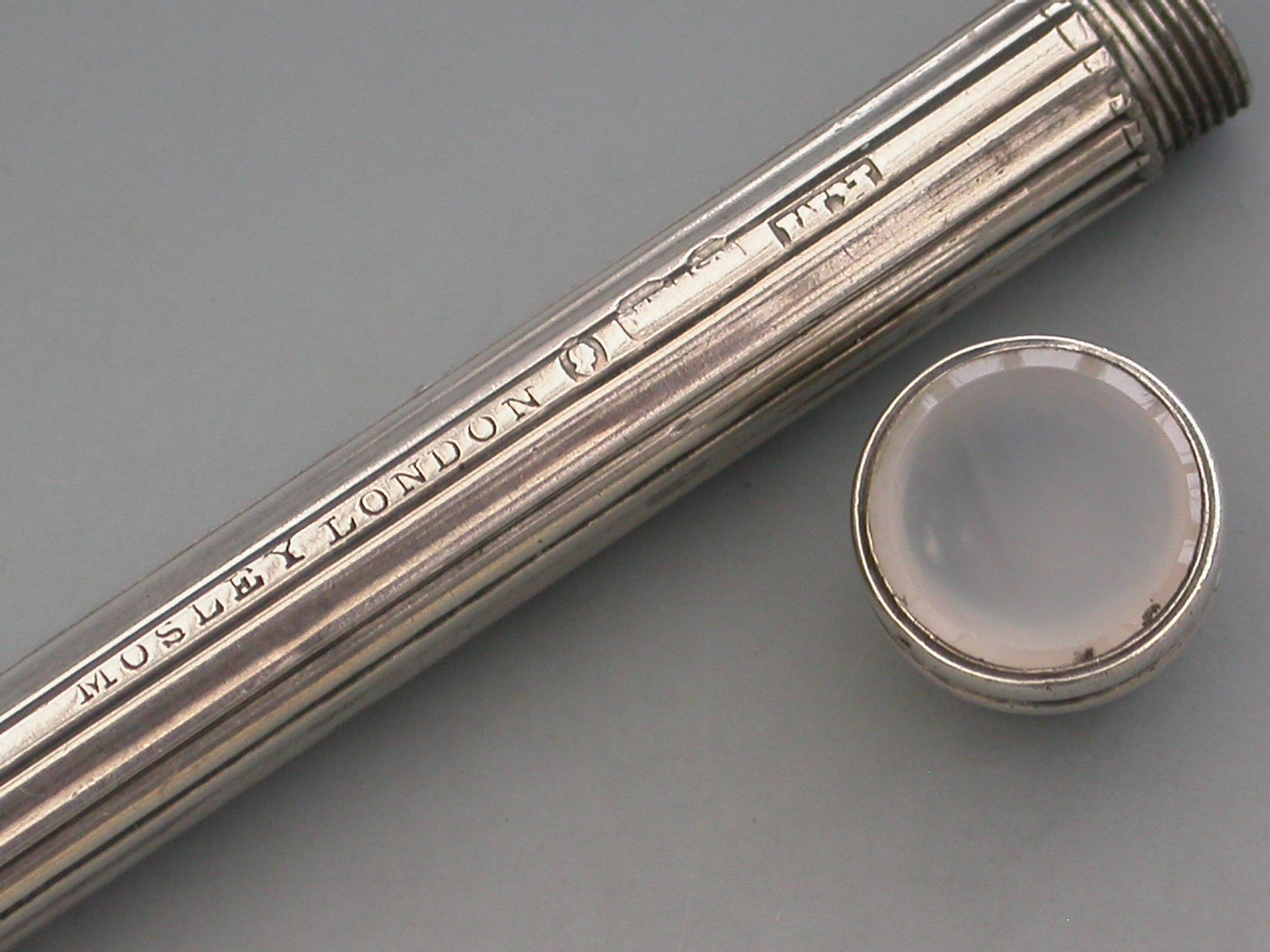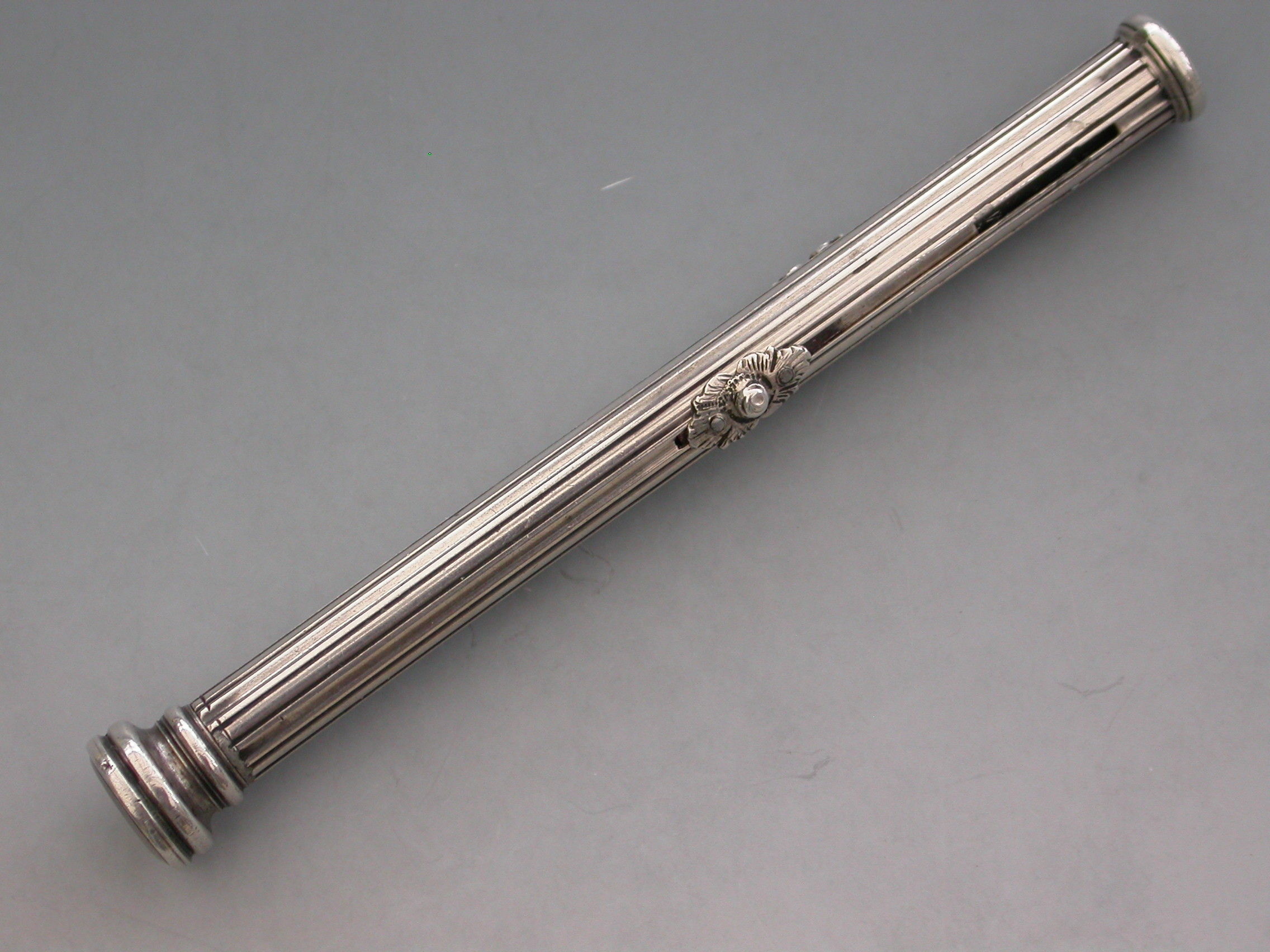 A rare William IV fully hallmarked silver combination sliding Propelling Pencil and Pen, the cylindrical body with reeded decoration and cast floral slider buttons. The seal terminal set with a Chalcedony seal stone and unscrewing to reveal a lead reservoir.