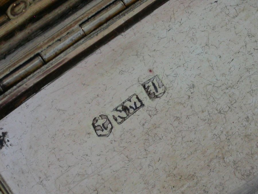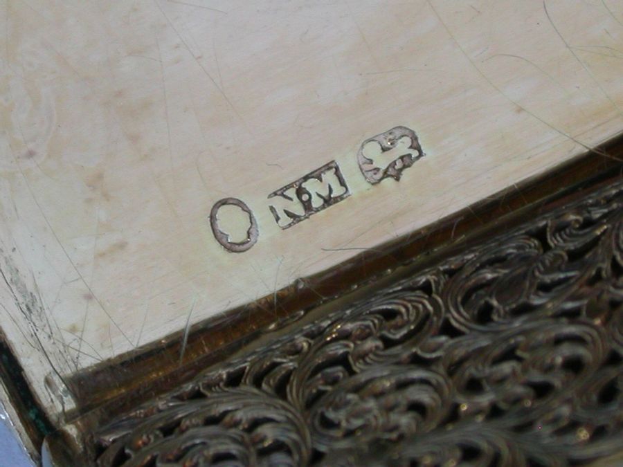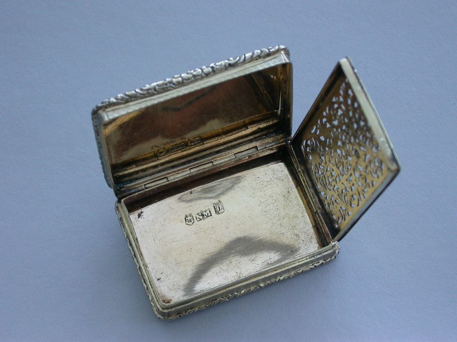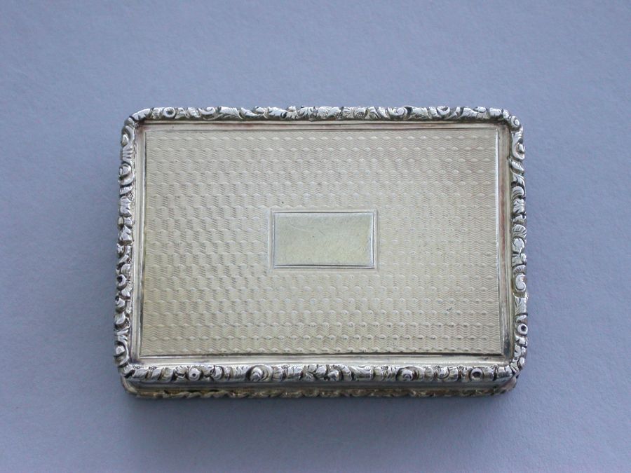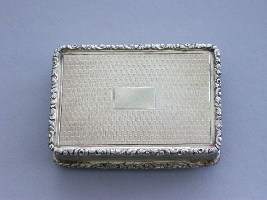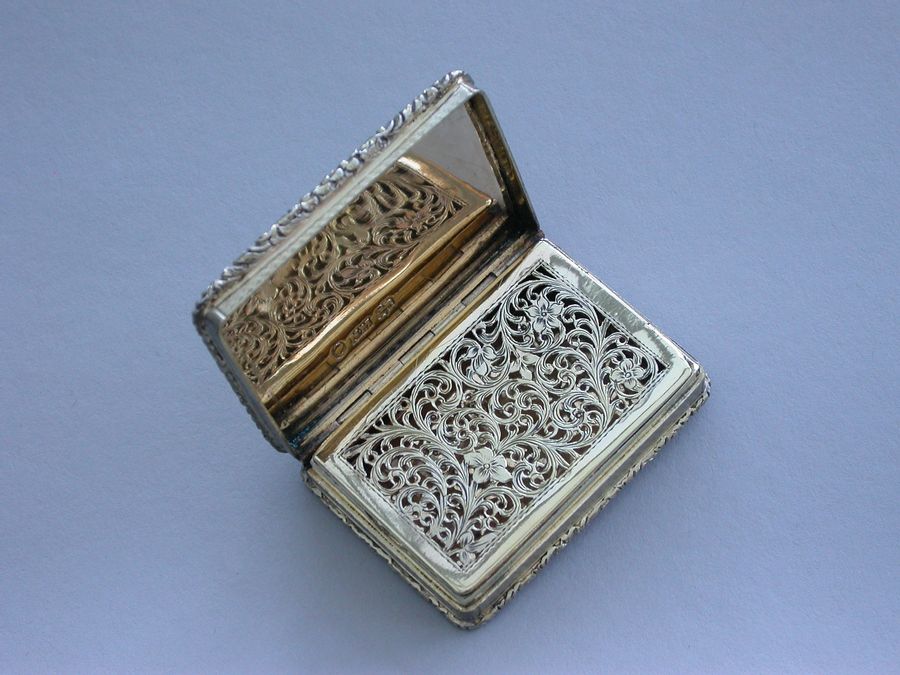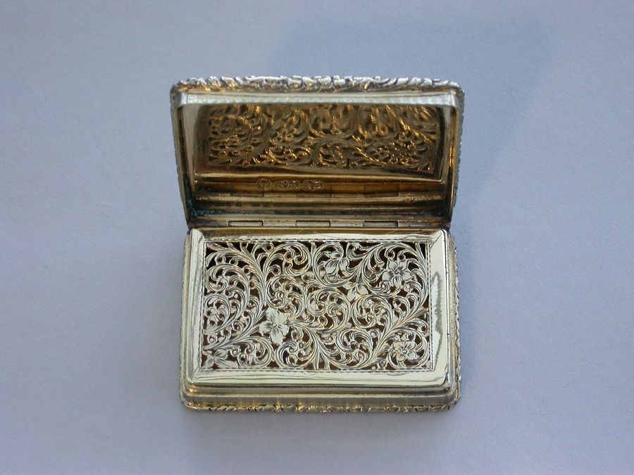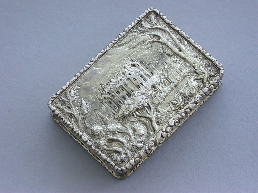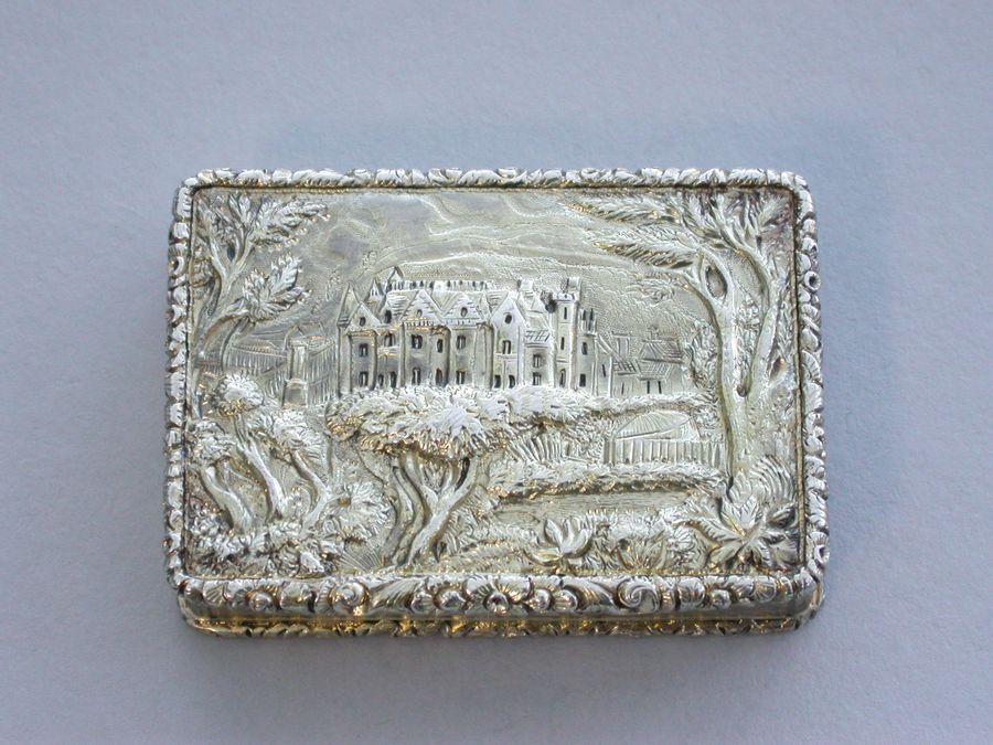 An extremely fine quality large and heavy silver gilt Vinaigrette of rectangular form with engine turned base and sides, a vacant cartouche to the base and raised foliate borders, the lid chased and engraved with a high relief view of Abbotsford House (the home of Sir Walter Scott), from across the river Tweed, the garden framed by trees and flowers with a small building in the right foreground. The silver gilt grille pierced with scrolling leaf fronds and five flower heads.