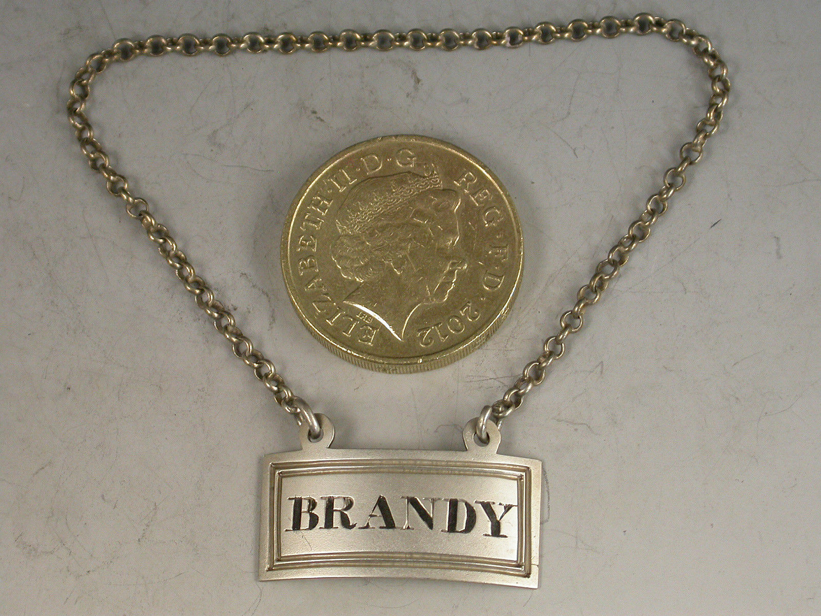 A small William IV Scottish silver ""Boudoir Label"" of rectangular form with raised eyelets and double reeded border, incised and niello filled for Brandy.