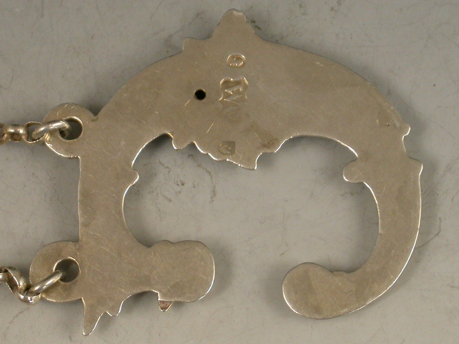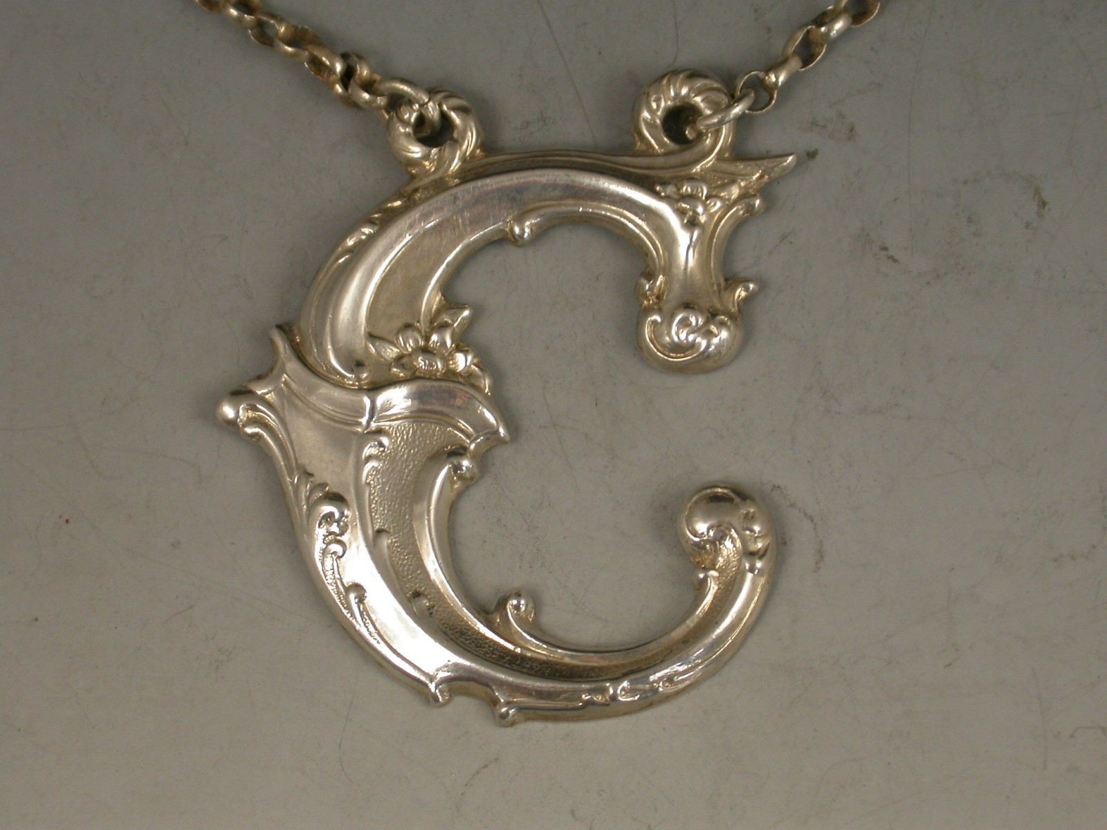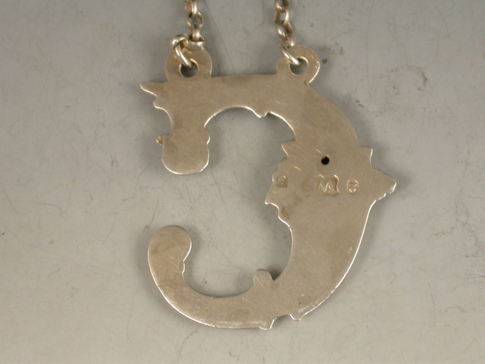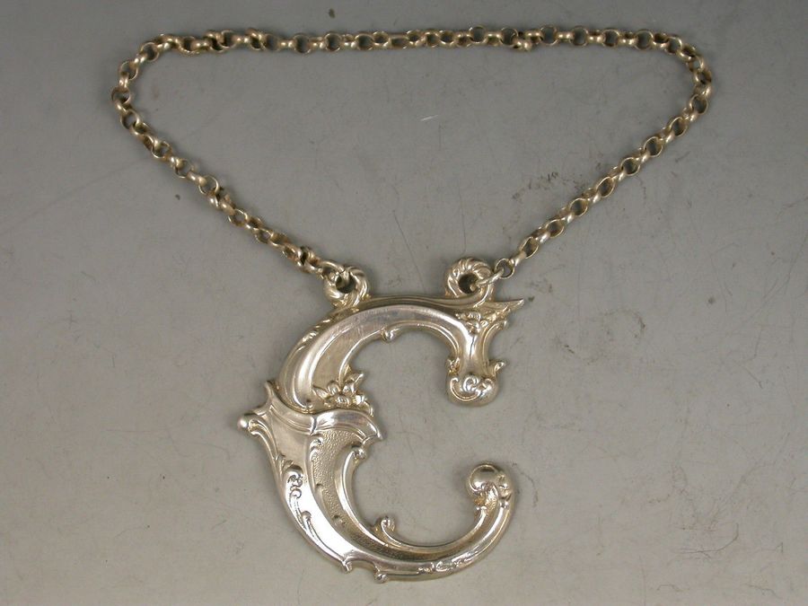 A good quality William IV Scottish silver Wine Label made in the form of a capital letter 'C', decorated with scrolls and flower heads on a matt background.