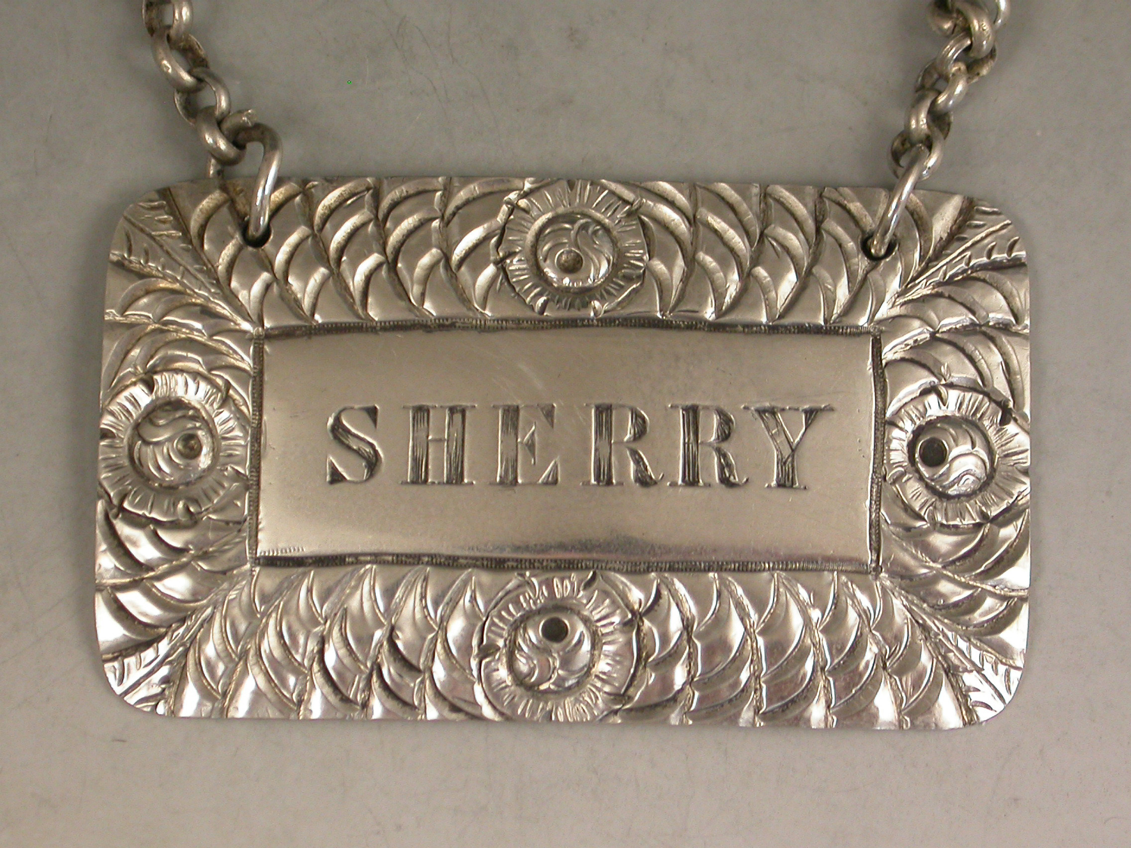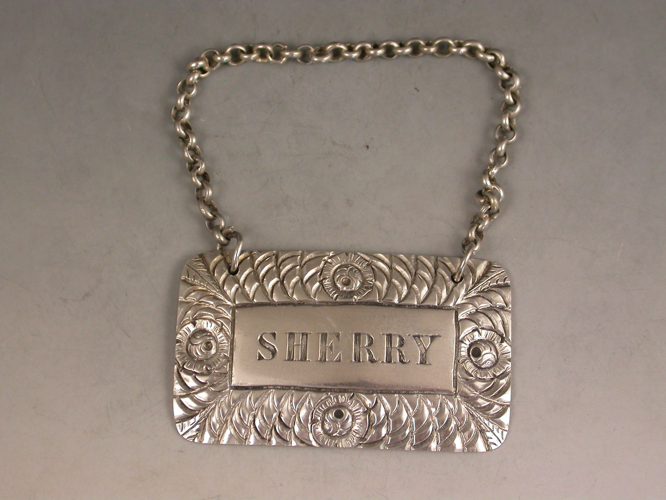 An unusual William IV cast Scottish silver Wine Label of rounded rectangular form, the border chased with flower head and feather decoration, incised for Sherry.