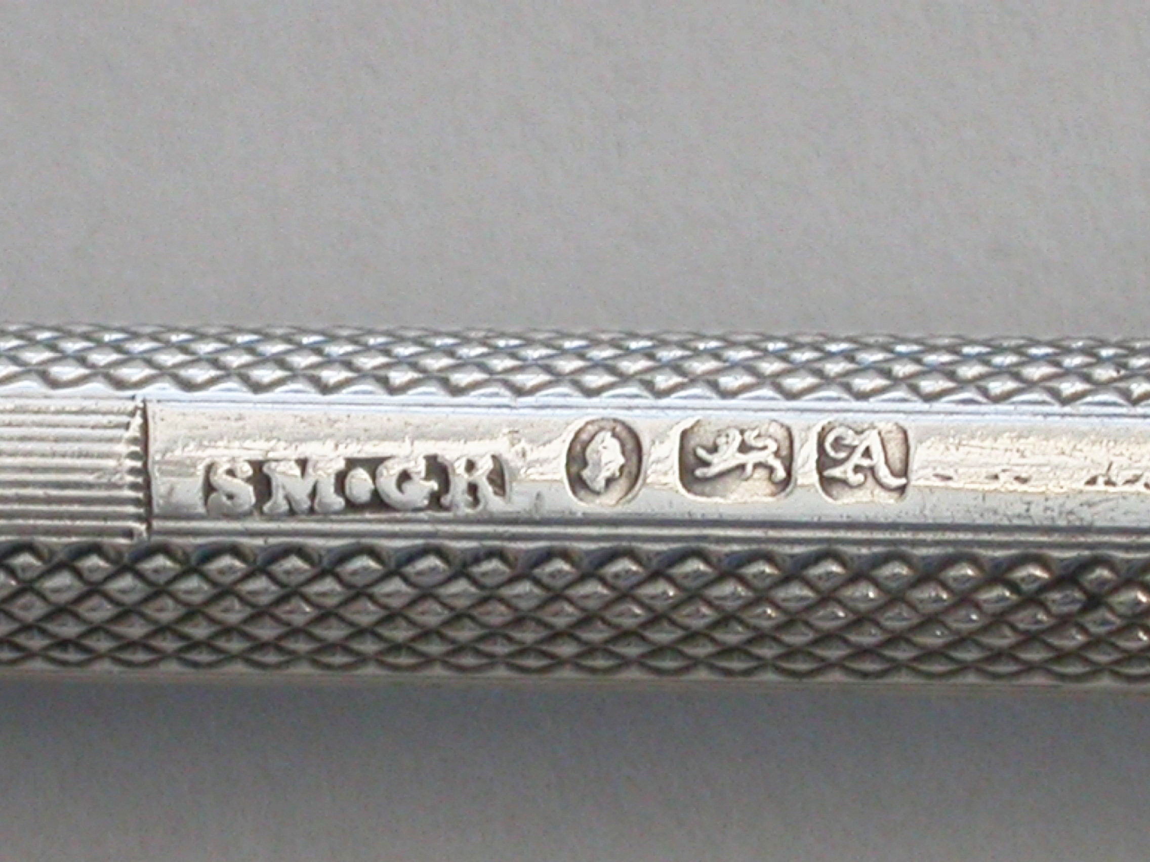 The combination of the 'SMGR' hallmark and the Riddle (on his own) Patent mark is unusual and interesting. The partnership was dissolved in December 1836 and Riddle only started using his Patent mark in 1837. Presumably at the split of the partnership Riddle took a stock of pencil shafts that had already been sent to assay and then added his own stamp before selling the piece.
