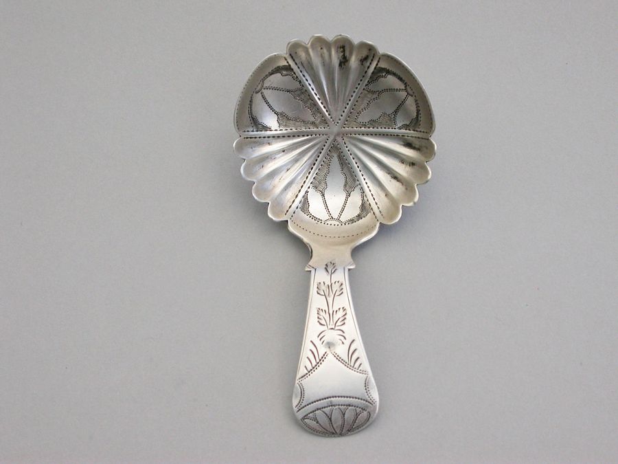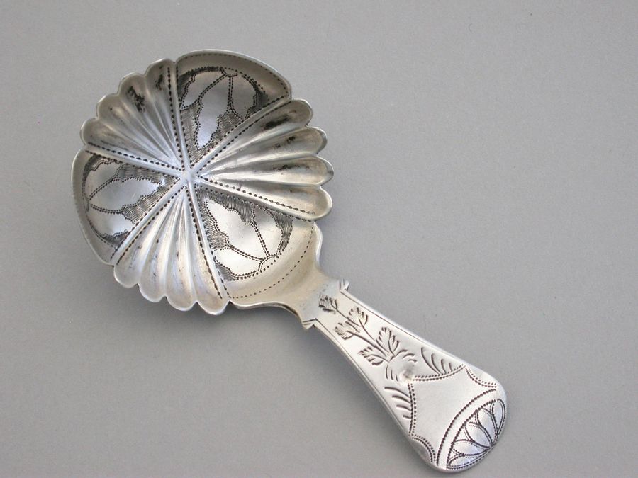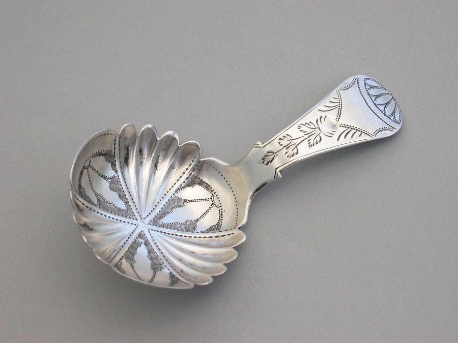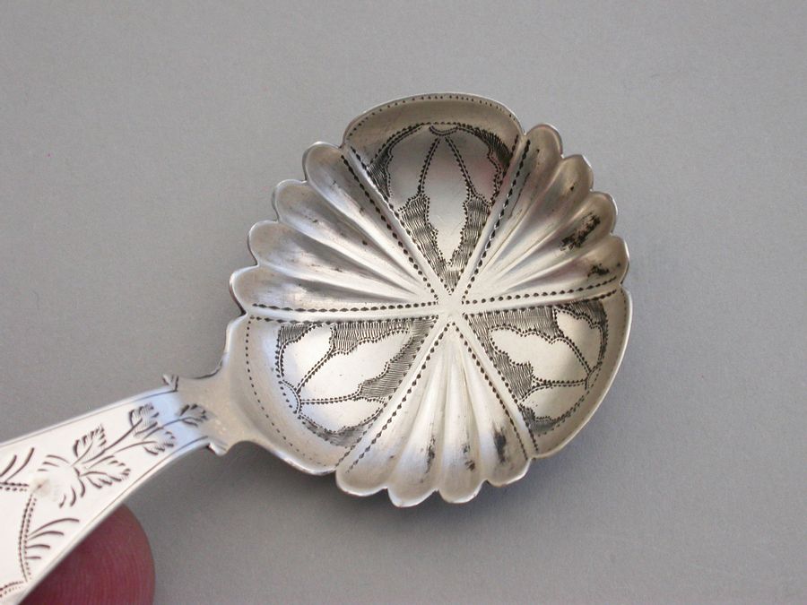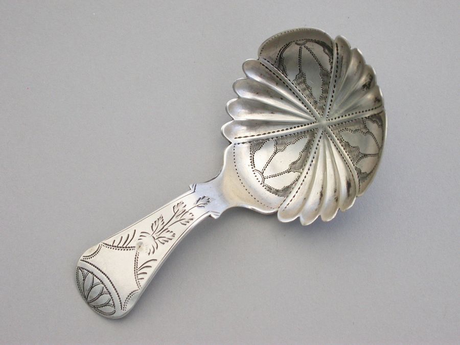 A good William IV silver Caddy Spoon with semi-fluted bowl, partly bright-cut and prick-dot engraved with leaves, the Old English handle with shoulders and similarly engraved.