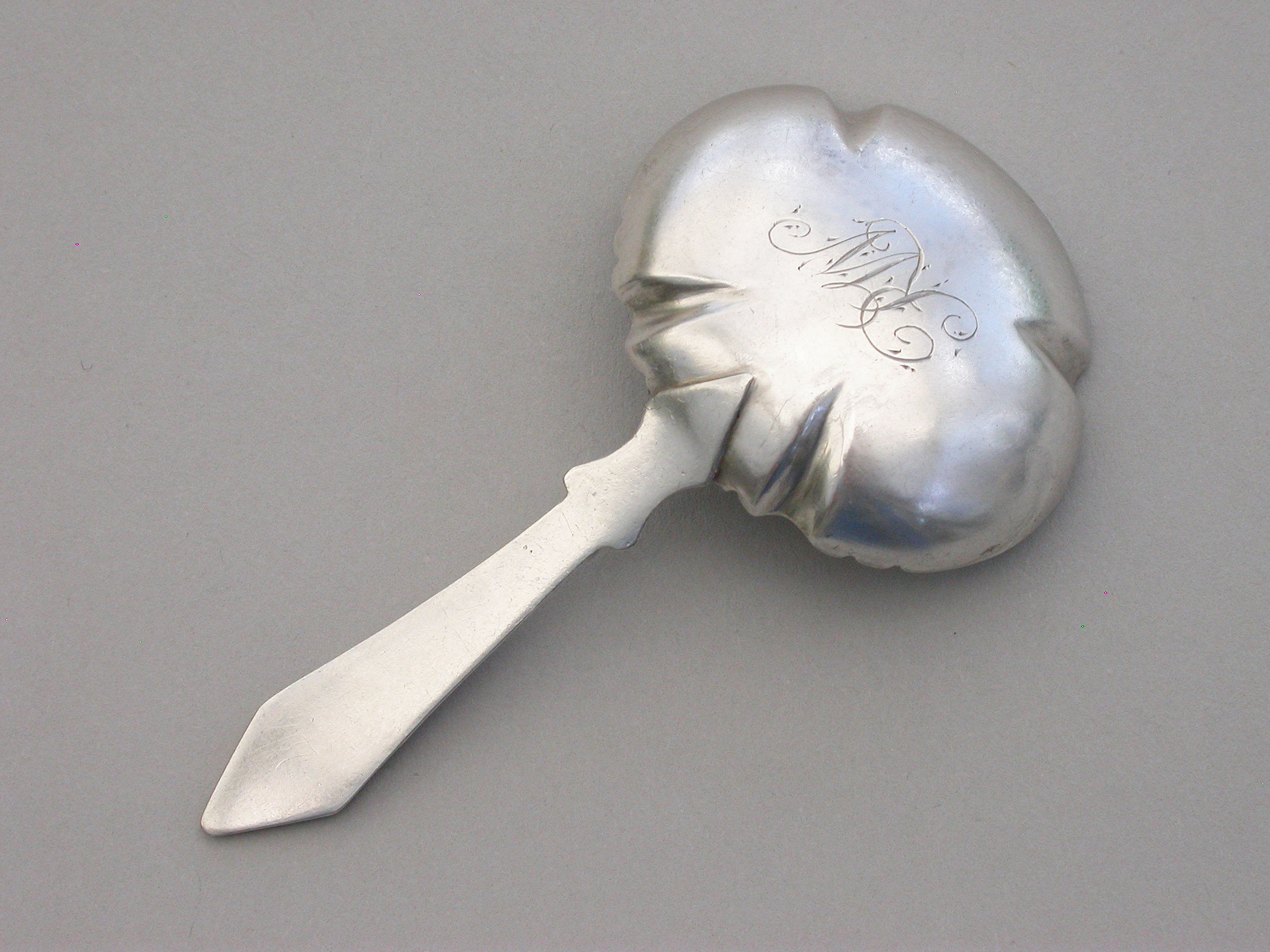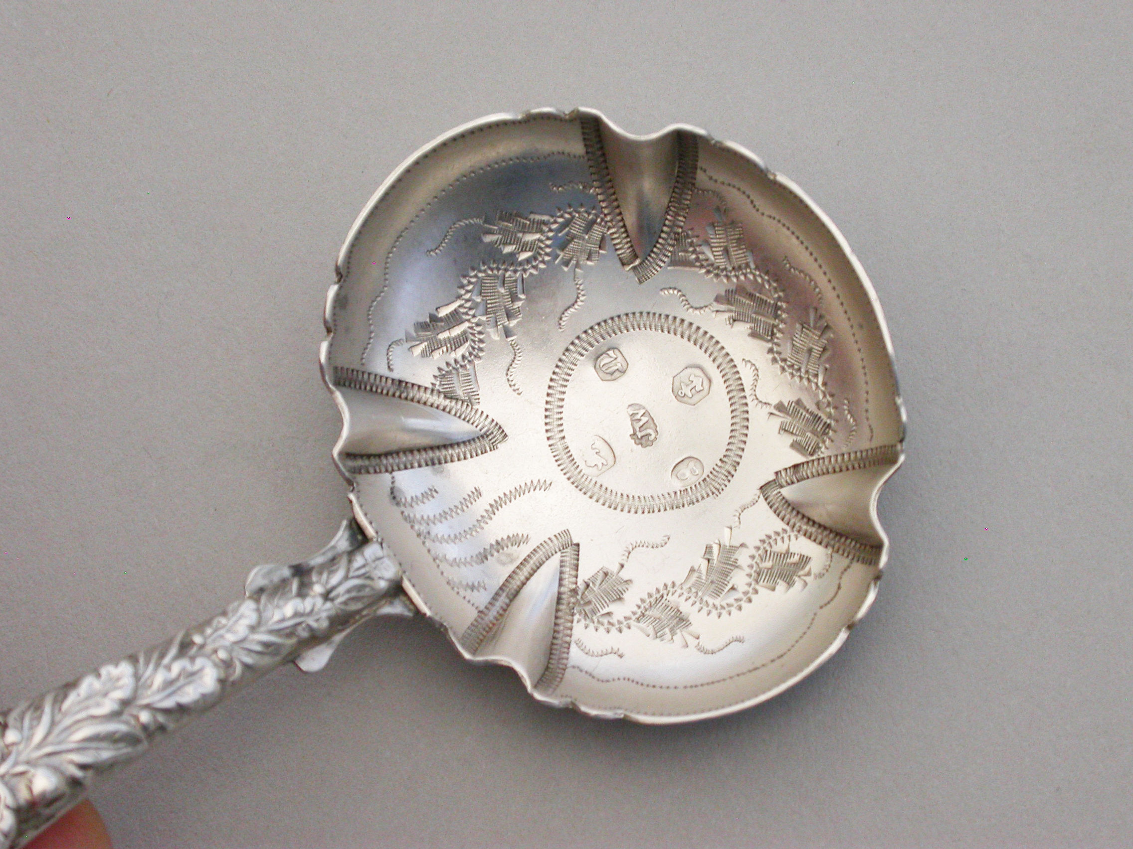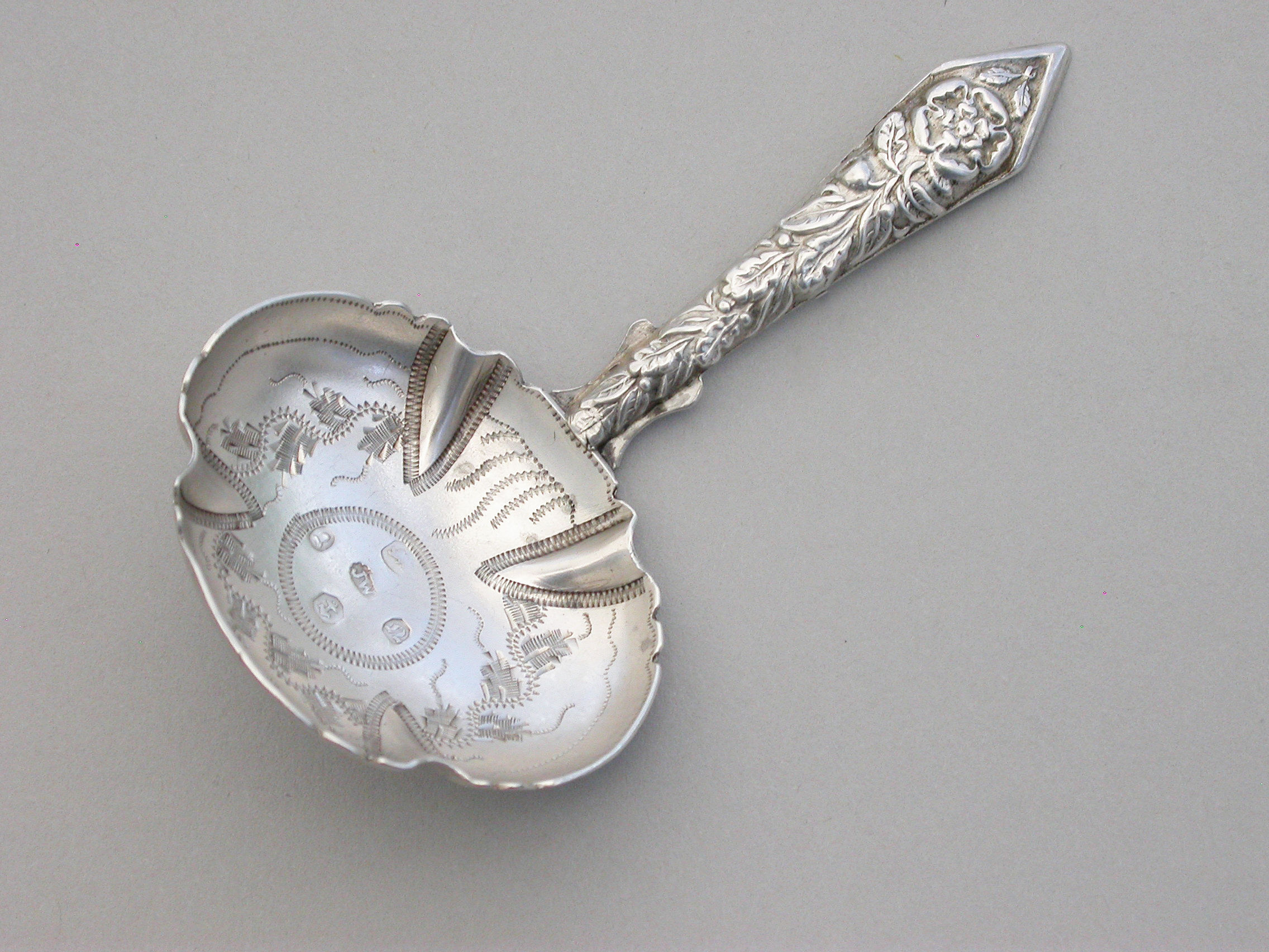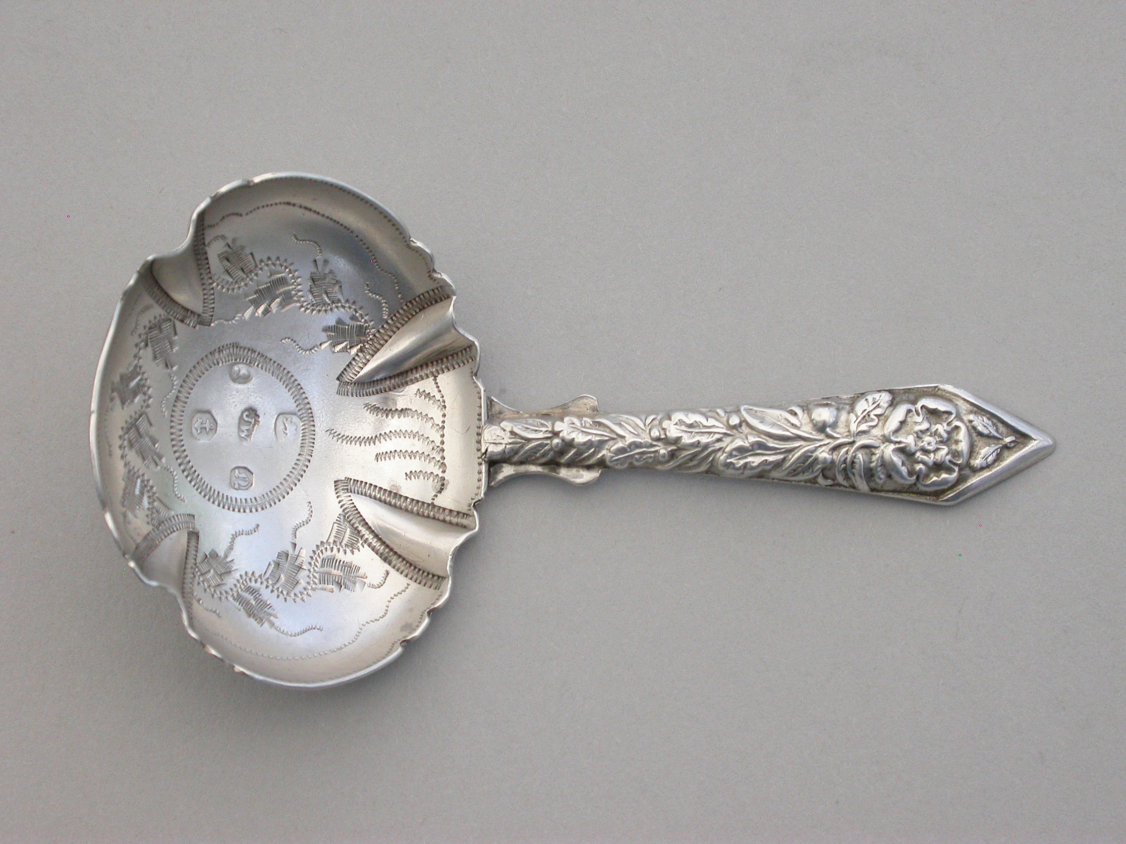 A rare and unusual William IV silver Caddy Spoon with shaped pleated bowl decorated with pricked designs and stylised foliate motifs. The unusual pointed handle embossed with a rose and oak leaves.