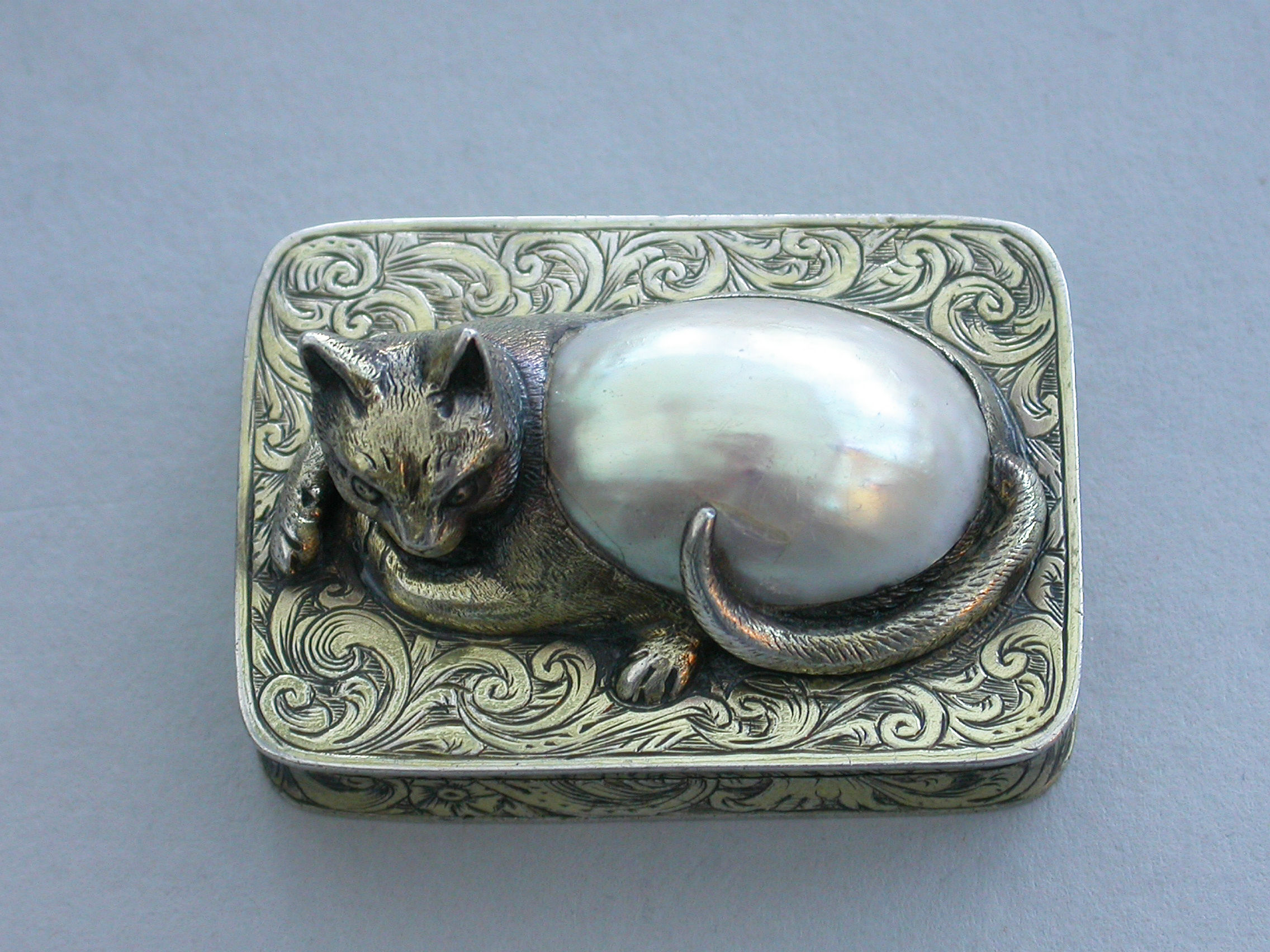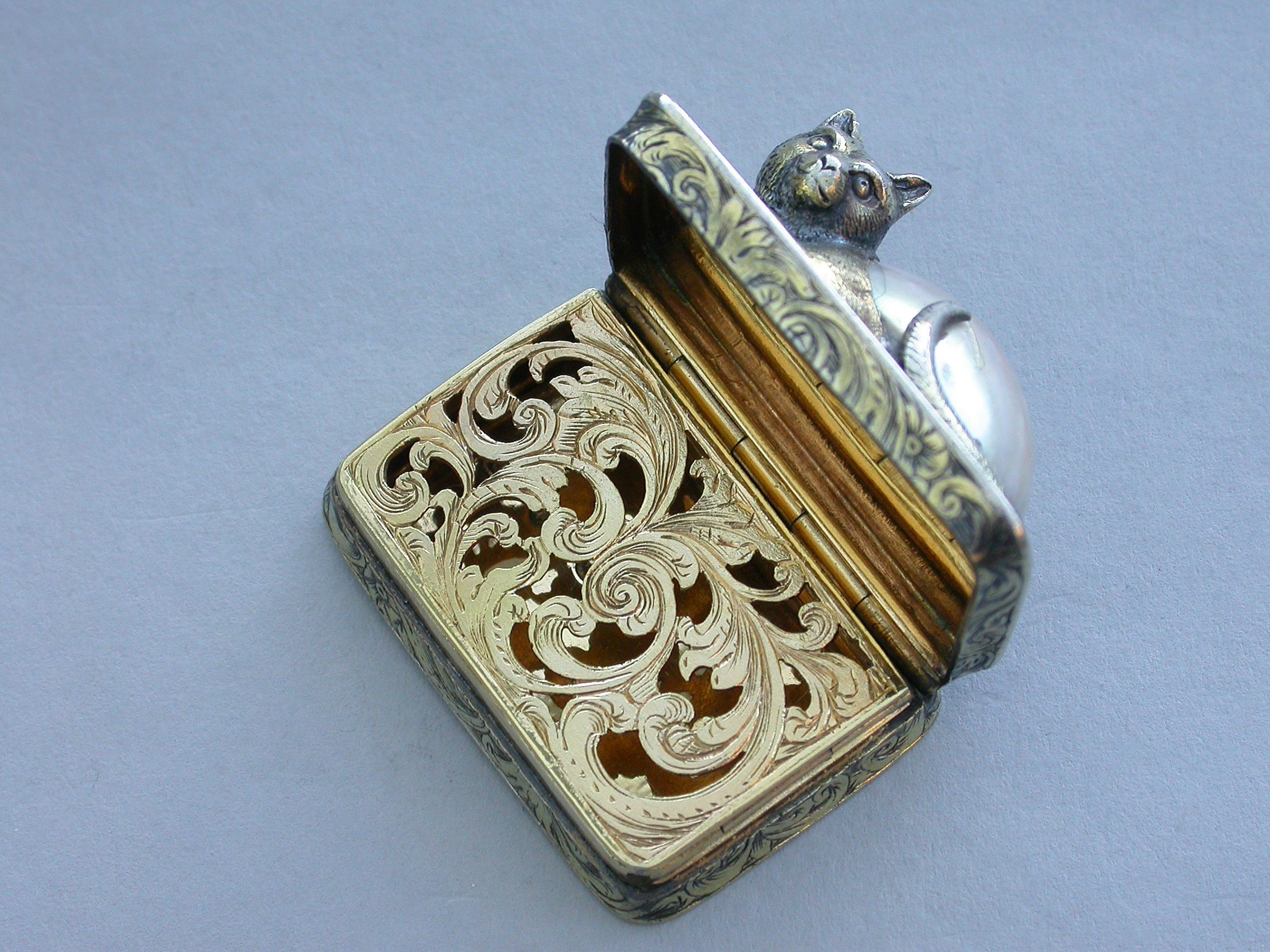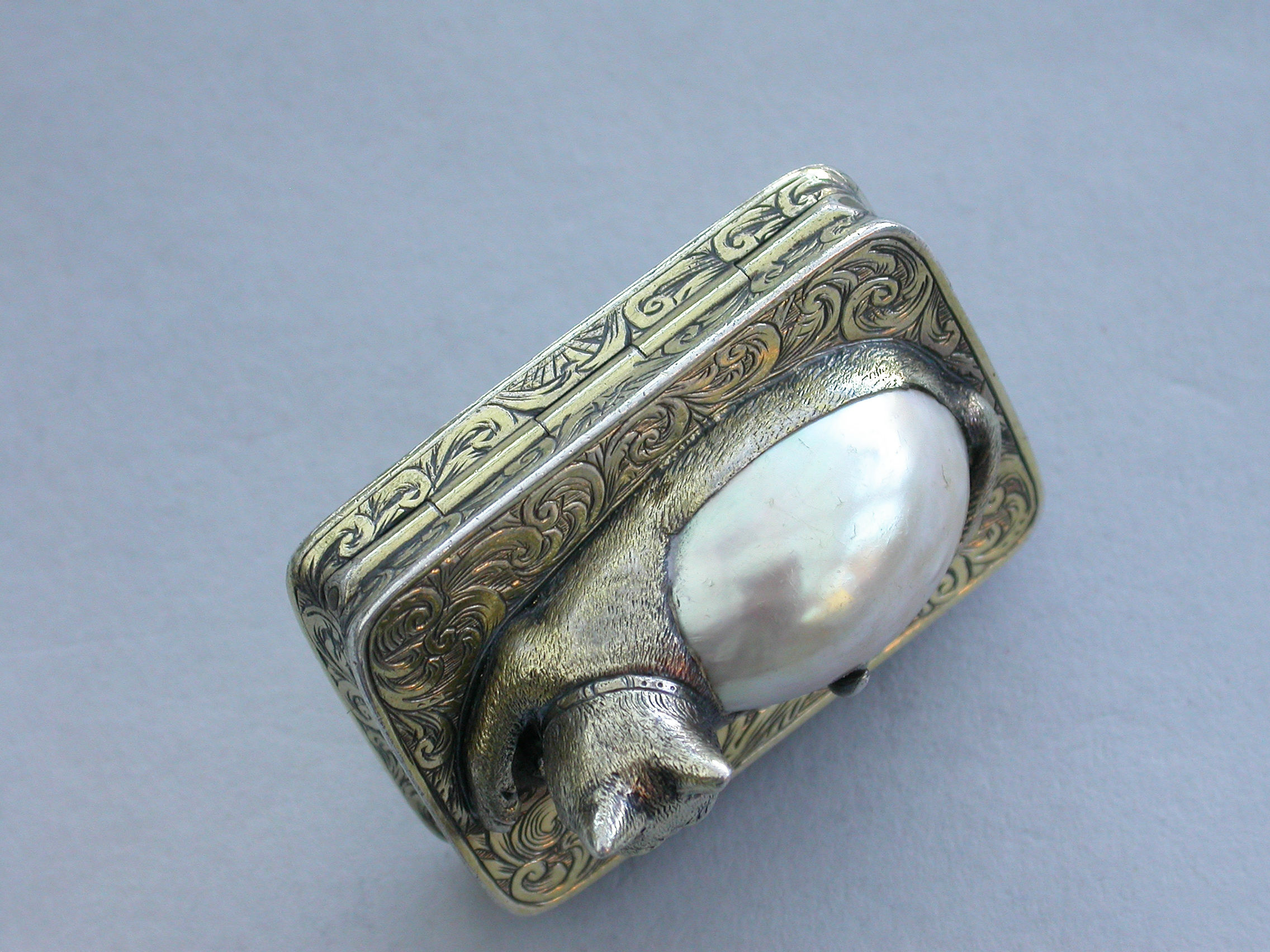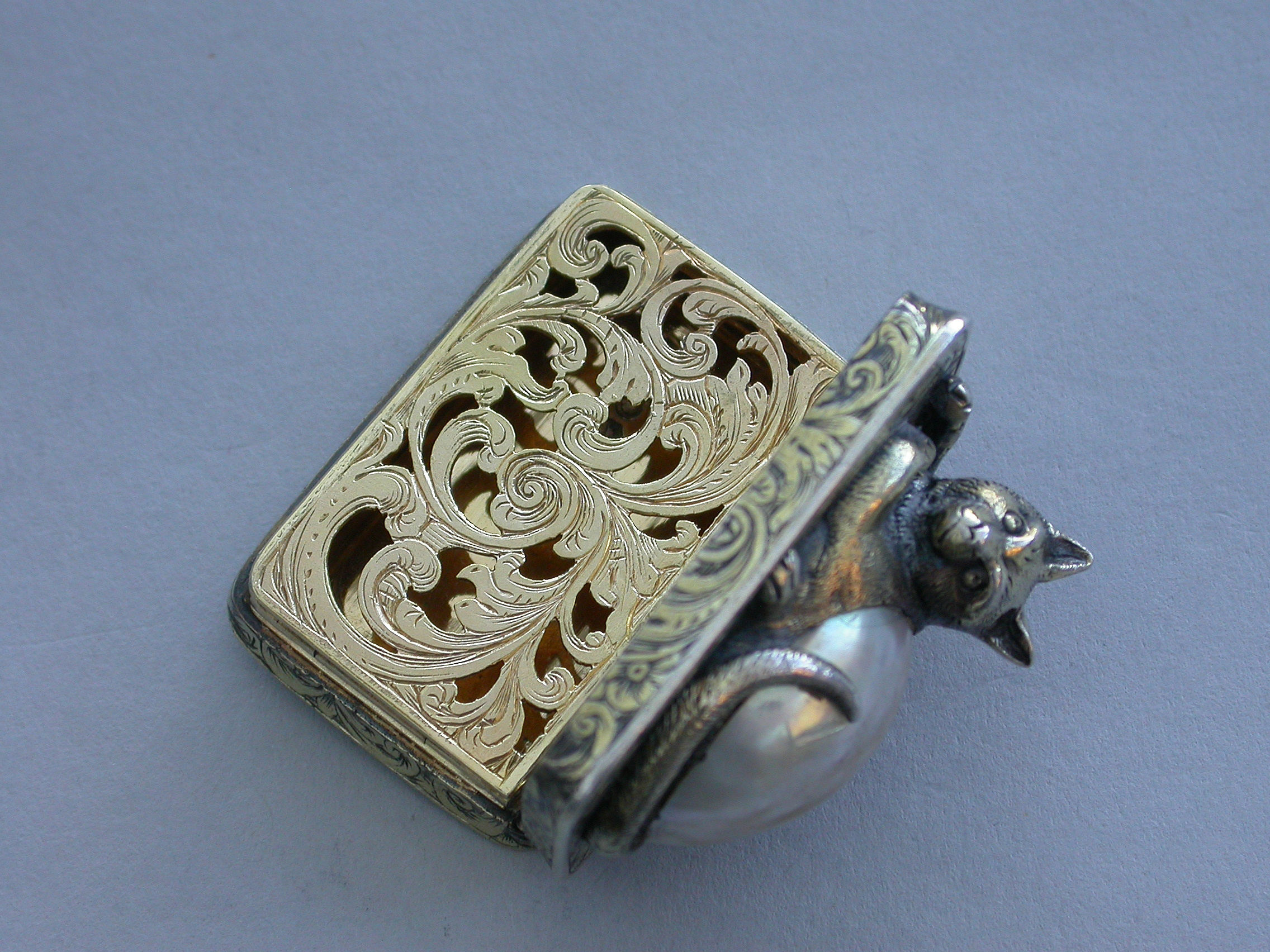 An extremely rare and fine quality William IV rectangular silver gilt Vinaigrette, hand engraved with scrolling foliate motifs, the base with leaves and flower heads in the centre, the sides slightly incurving, the lid set with a blister pearl mounted as a Cat. The silver gilt grille pierced with scrolling leaves.