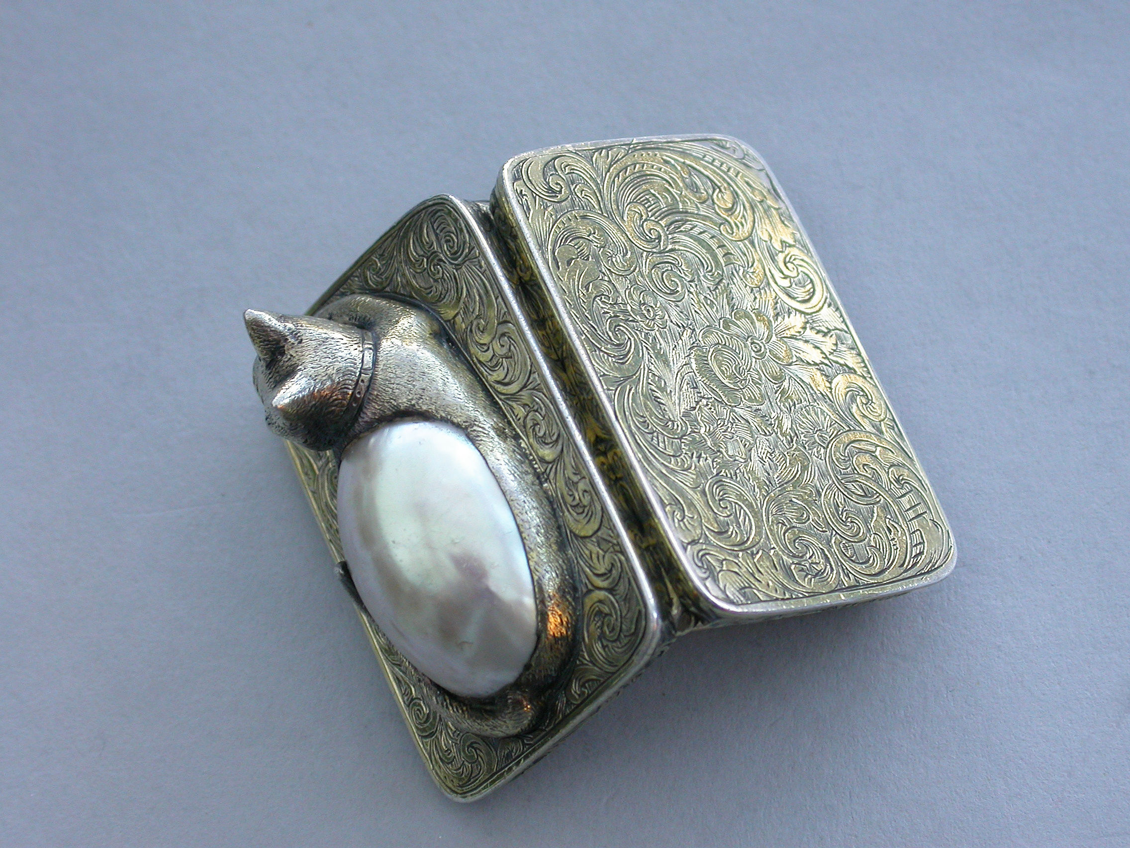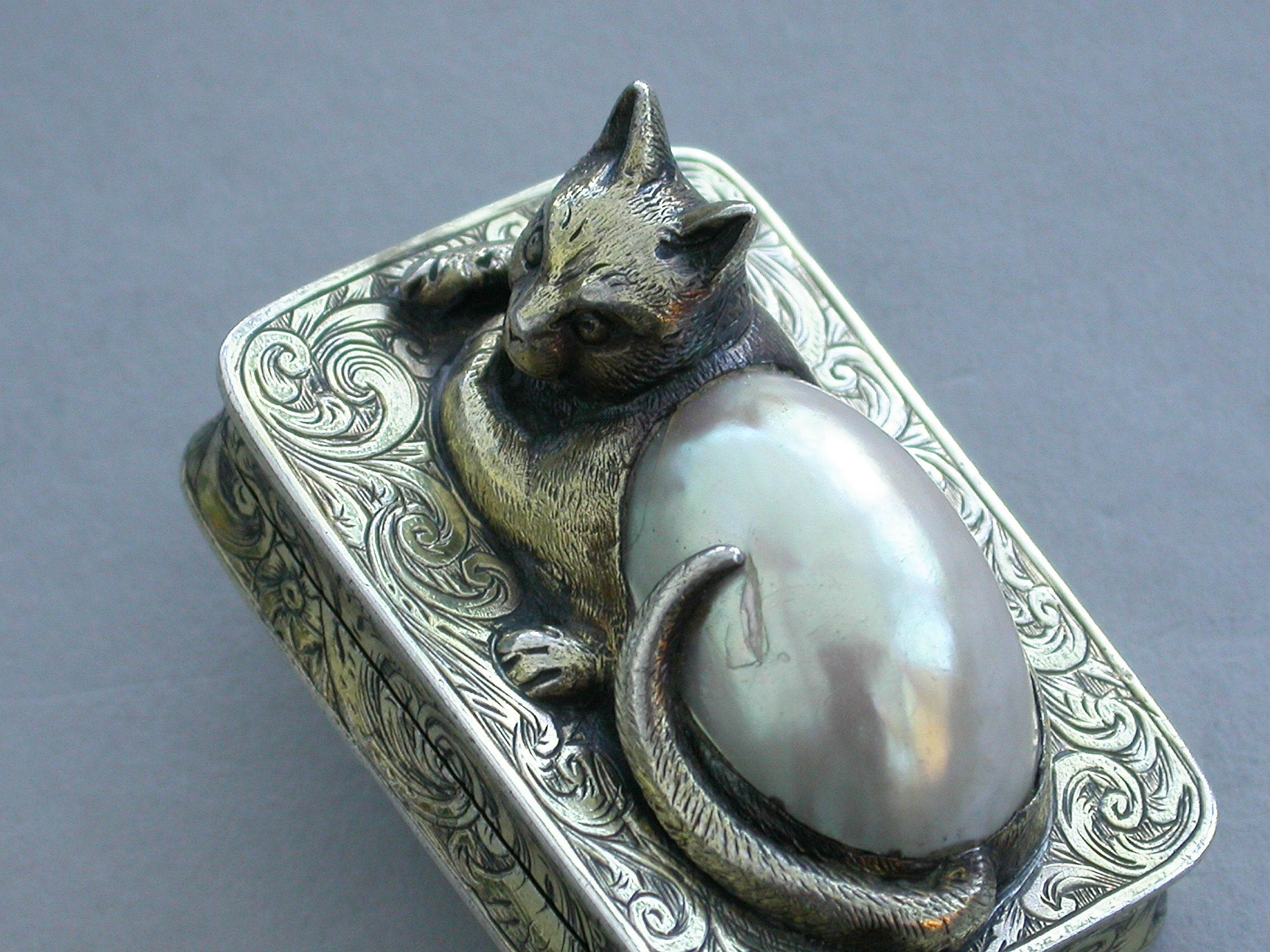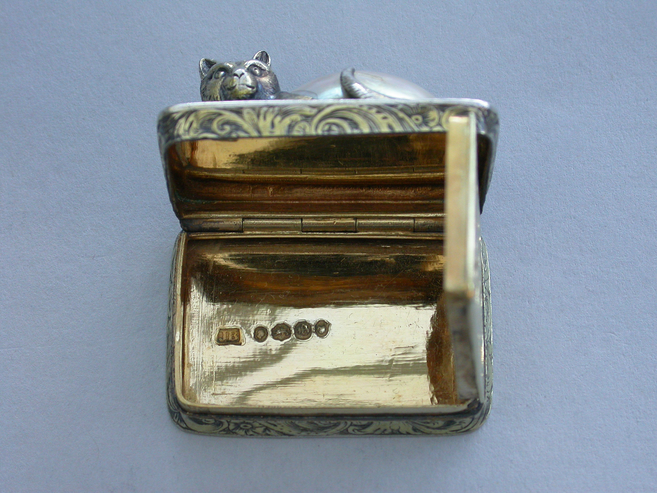 An extremely rare and fine quality William IV rectangular silver gilt Vinaigrette, hand engraved with scrolling foliate motifs, the base with leaves and flower heads in the centre, the sides slightly incurving, the lid set with a blister pearl mounted as a Cat. The silver gilt grille pierced with scrolling leaves.