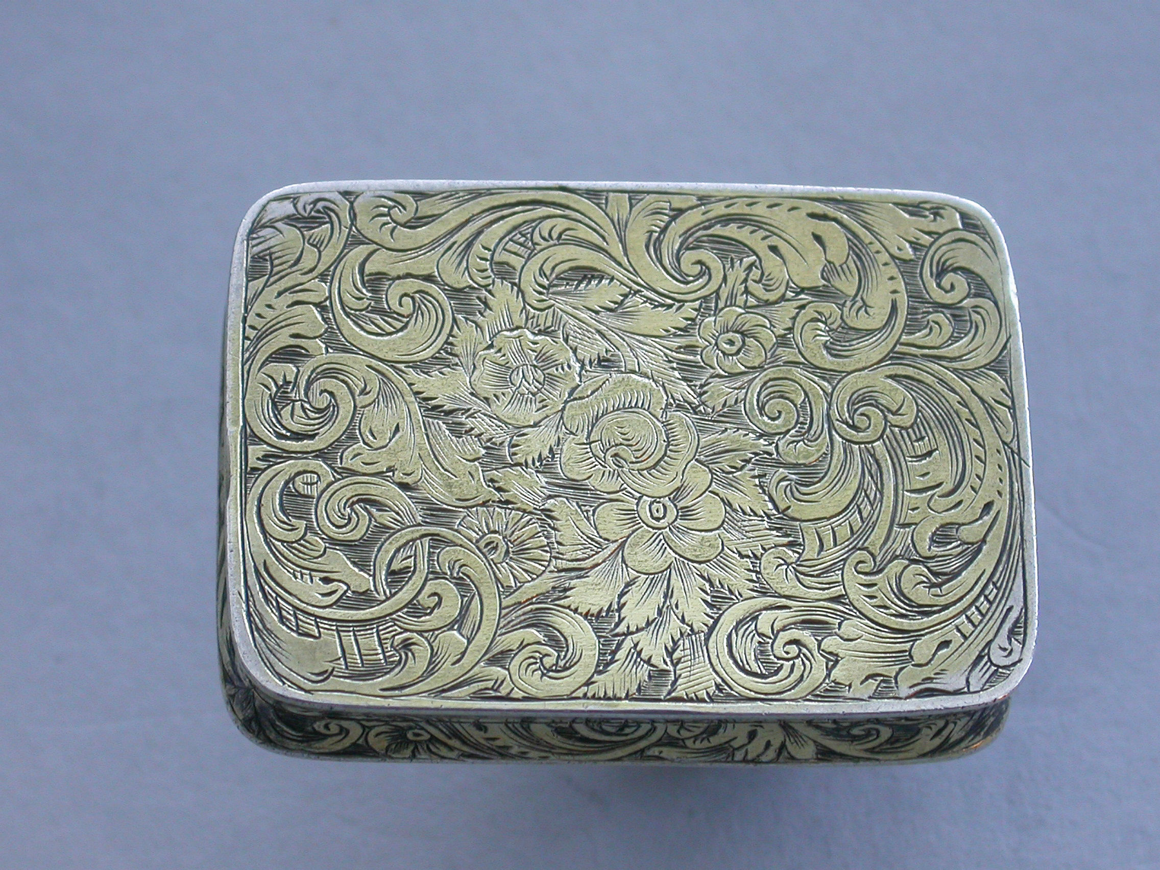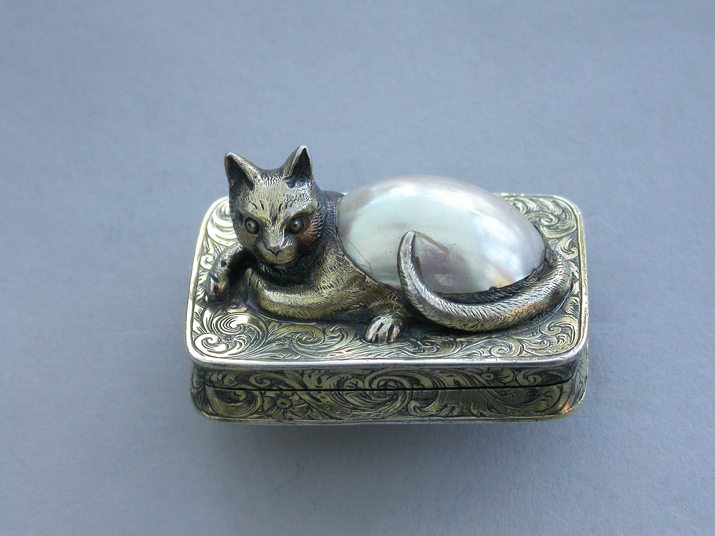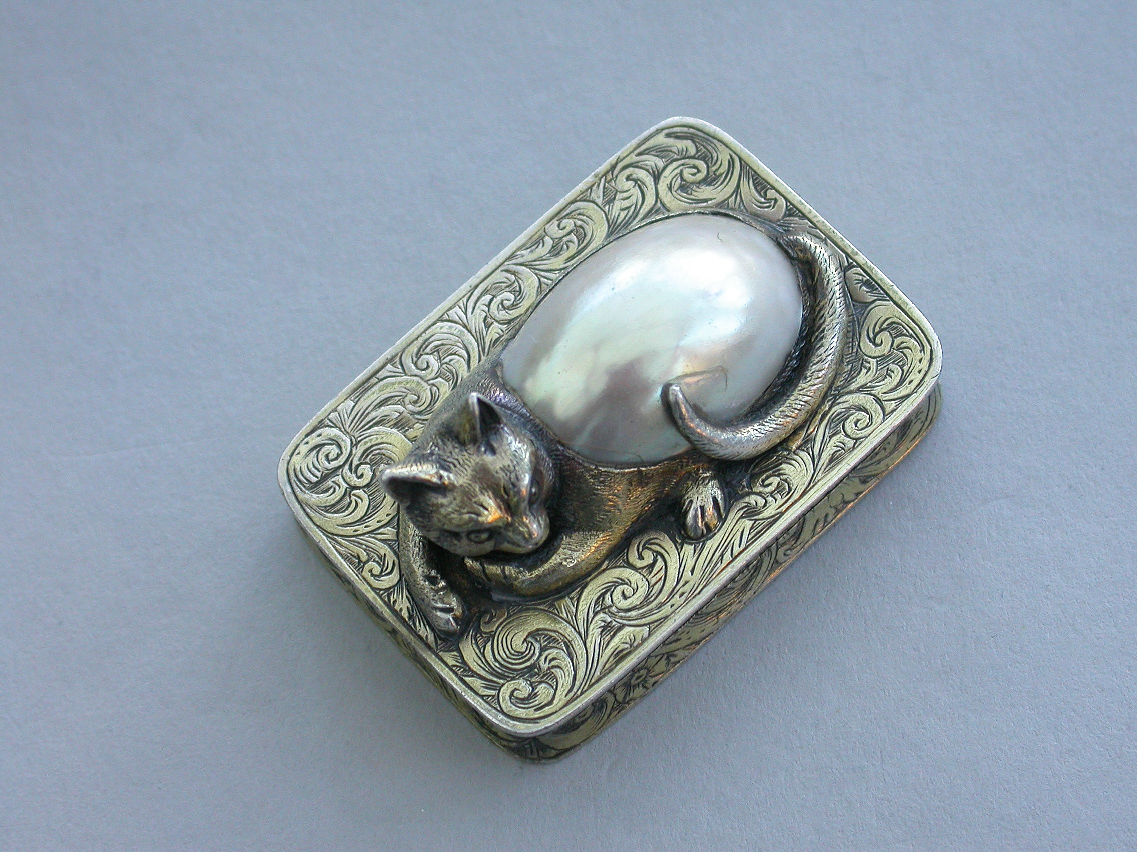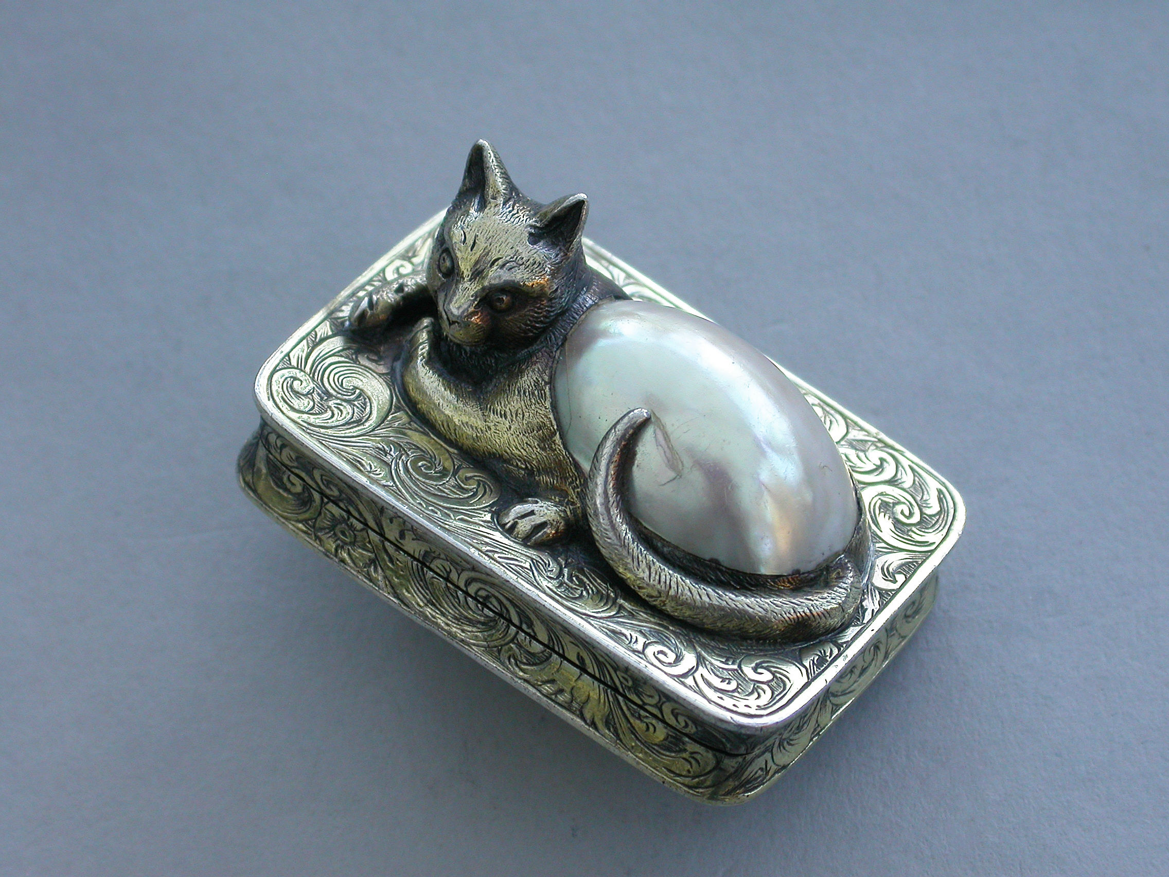 An extremely rare and fine quality William IV rectangular silver gilt Vinaigrette, hand engraved with scrolling foliate motifs, the base with leaves and flower heads in the centre, the sides slightly incurving, the lid set with a blister pearl mounted as a Cat. The silver gilt grille pierced with scrolling leaves.