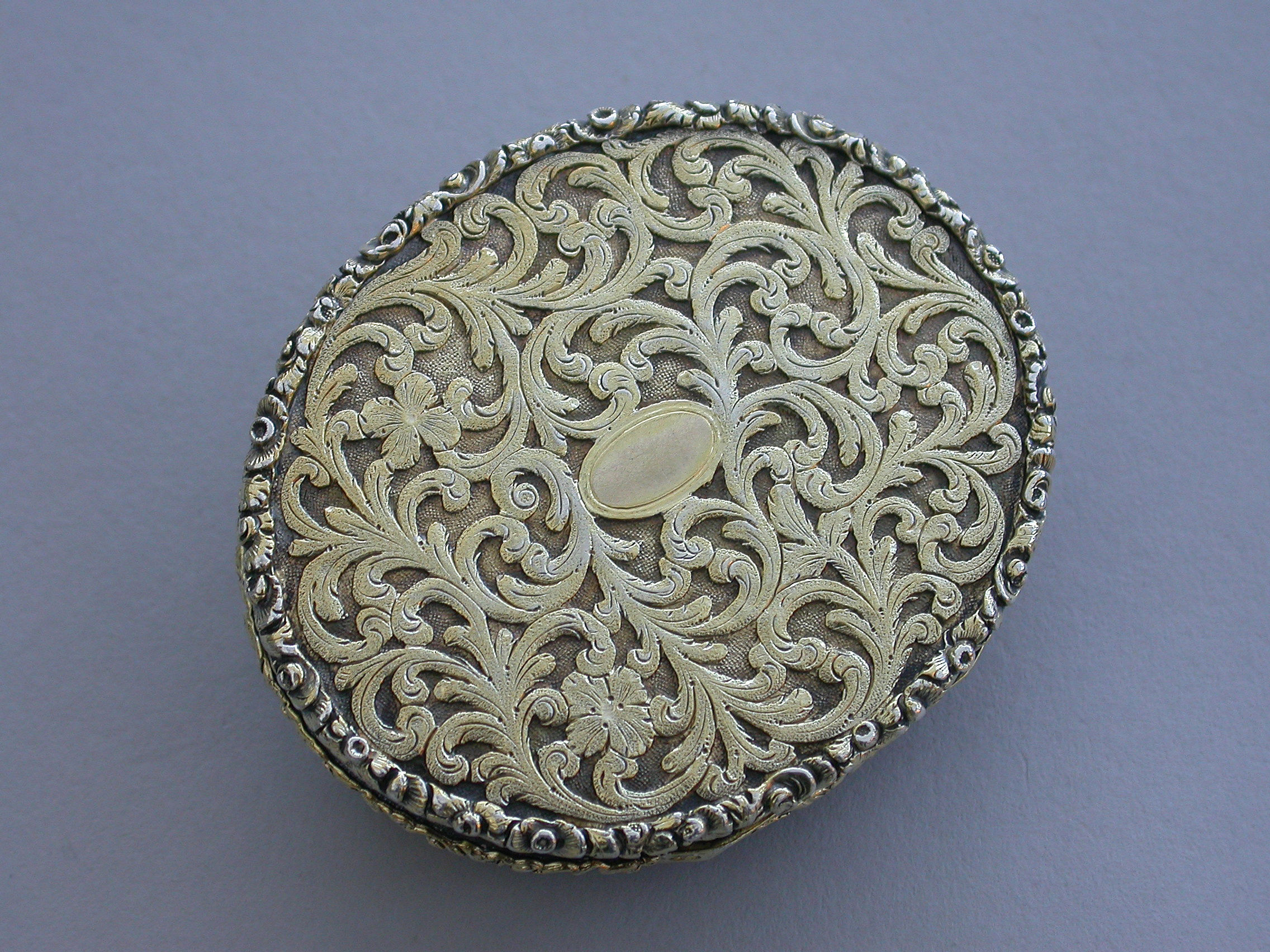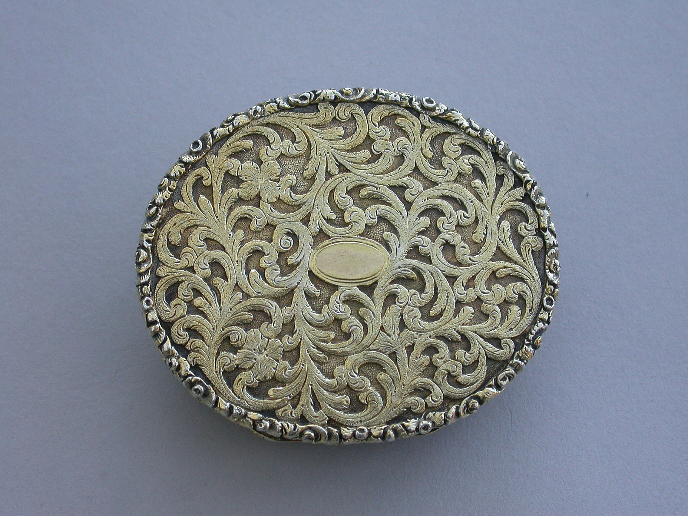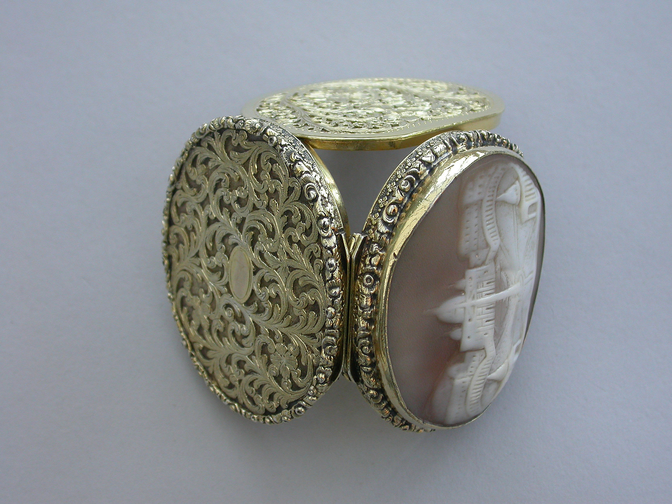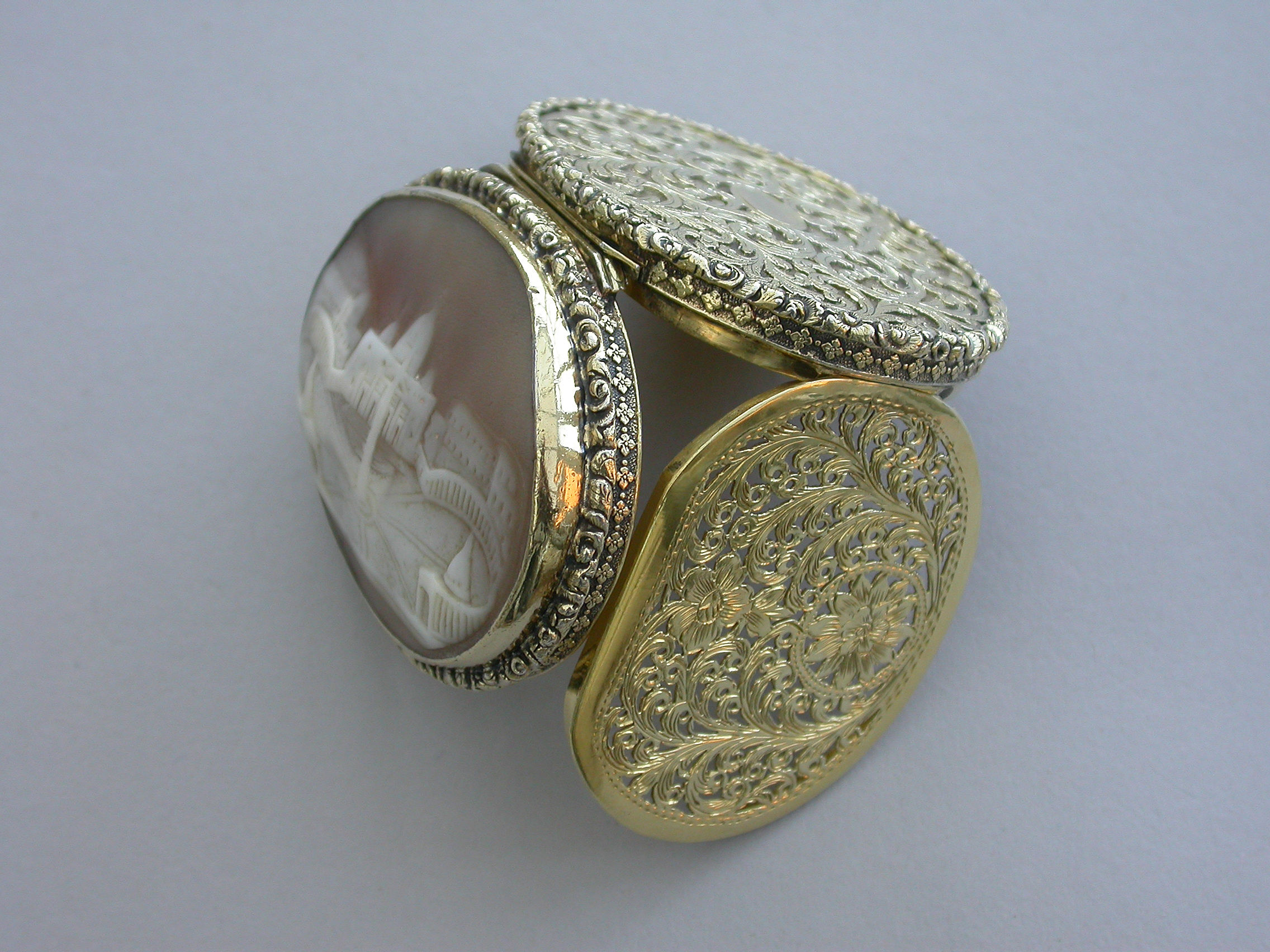A fine large William IV silver gilt Vinaigrette, the cover mounted with a cameo carved with a view of St Peter's Square, Rome, the base heavily engraved with scrolling leaves and two small flower heads with a small central vacant oval cartouche. Foliate borders to cover and base with flower head decorations between the five lugged lugged stand-away hinge. Silver gilt grill of two scrolling fronds rising from either side of a bordered flower head at centre base to a central flower head at the top within a decorative border.