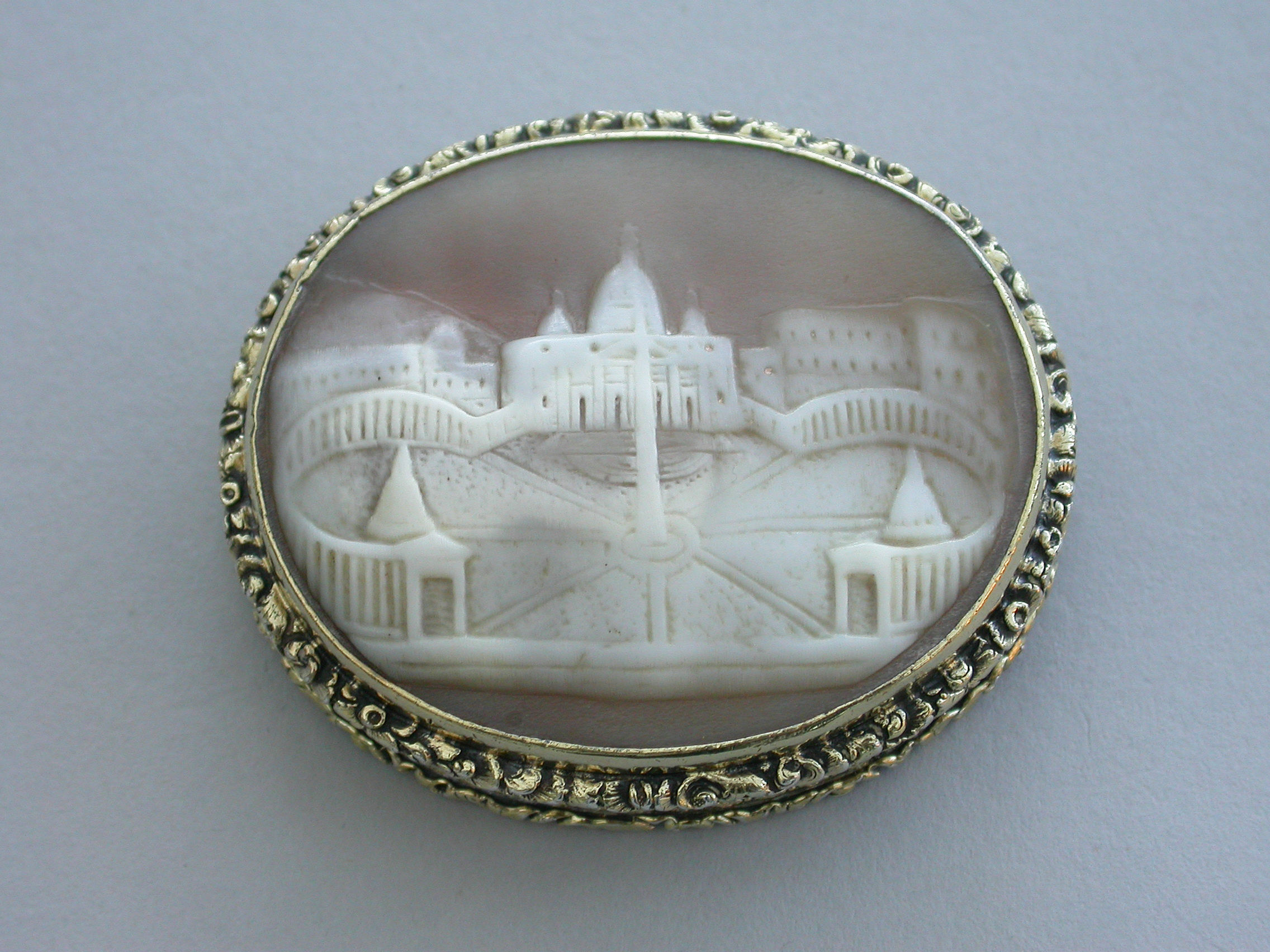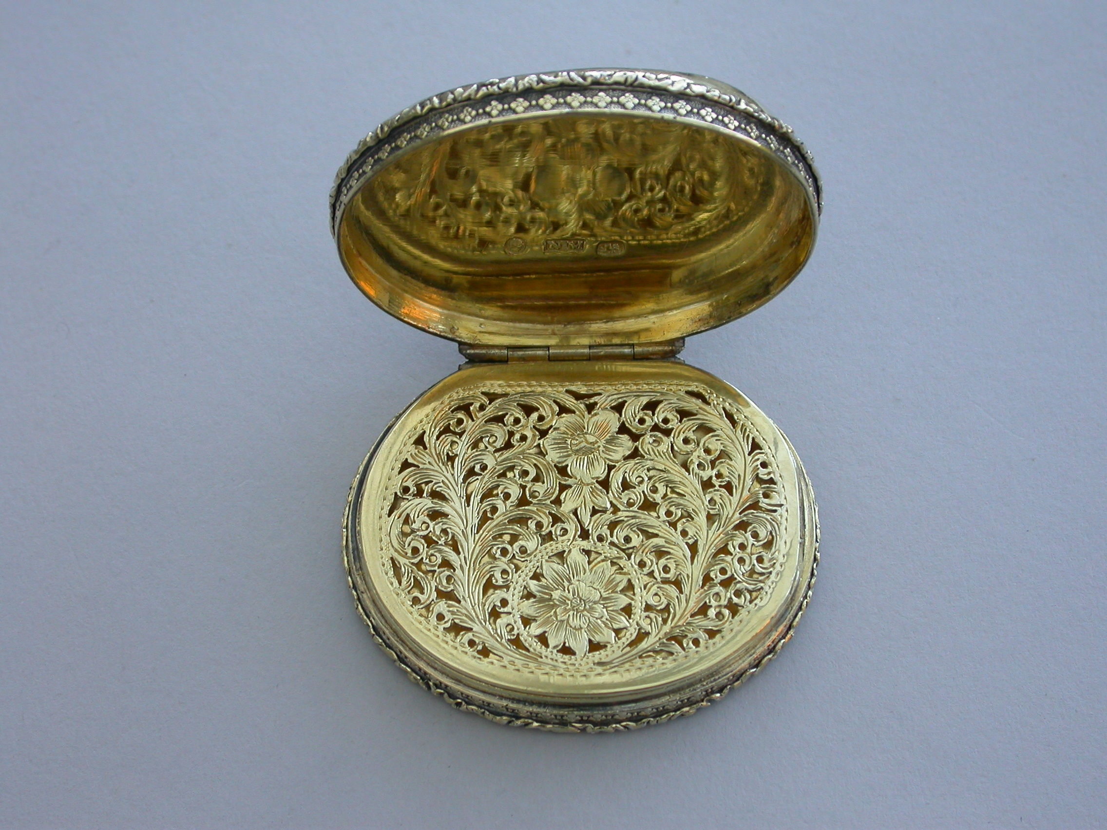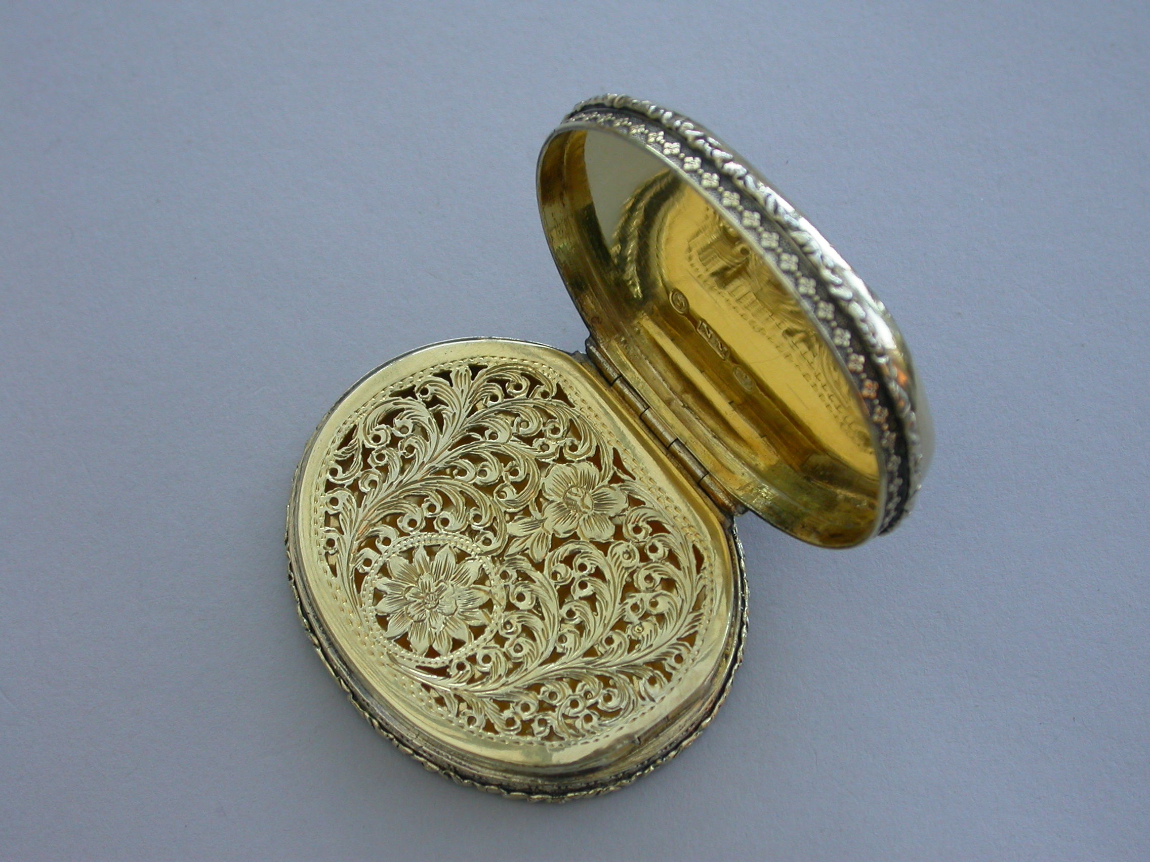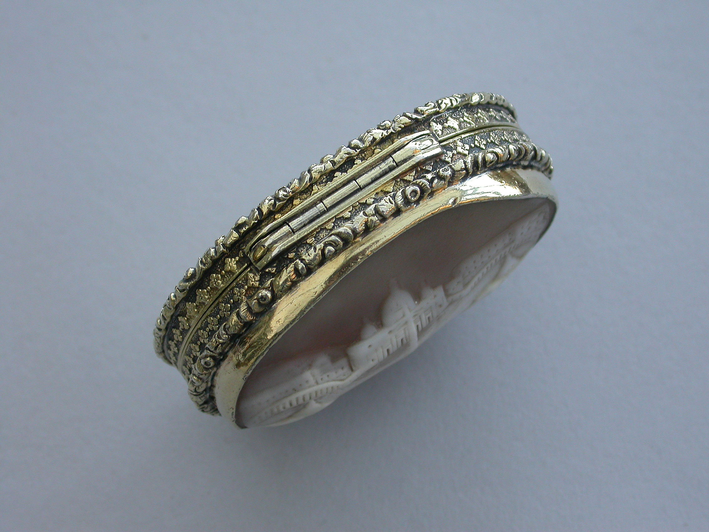 A fine large William IV silver gilt Vinaigrette, the cover mounted with a cameo carved with a view of St Peter's Square, Rome, the base heavily engraved with scrolling leaves and two small flower heads with a small central vacant oval cartouche. Foliate borders to cover and base with flower head decorations between the five lugged lugged stand-away hinge. Silver gilt grill of two scrolling fronds rising from either side of a bordered flower head at centre base to a central flower head at the top within a decorative border.