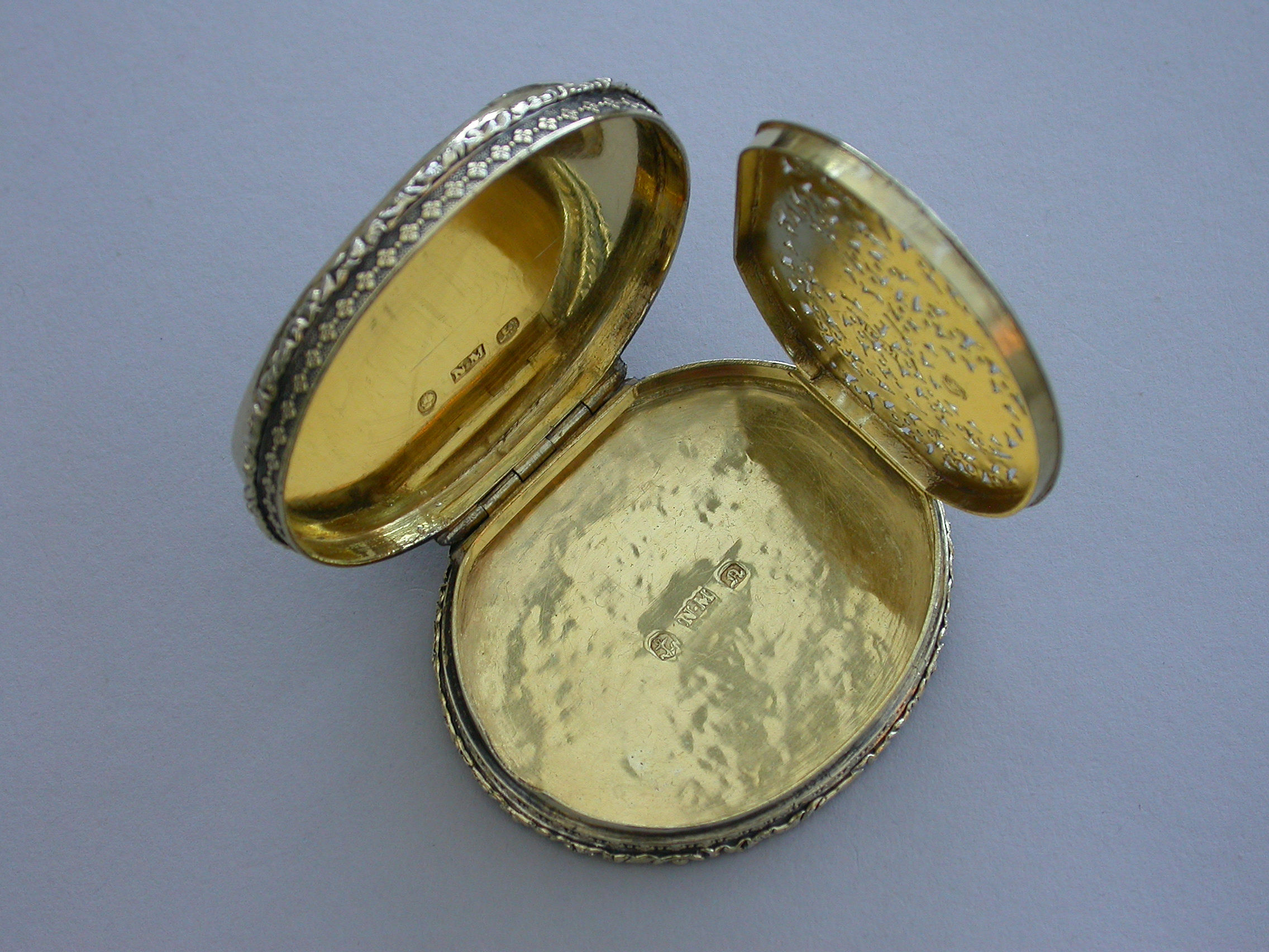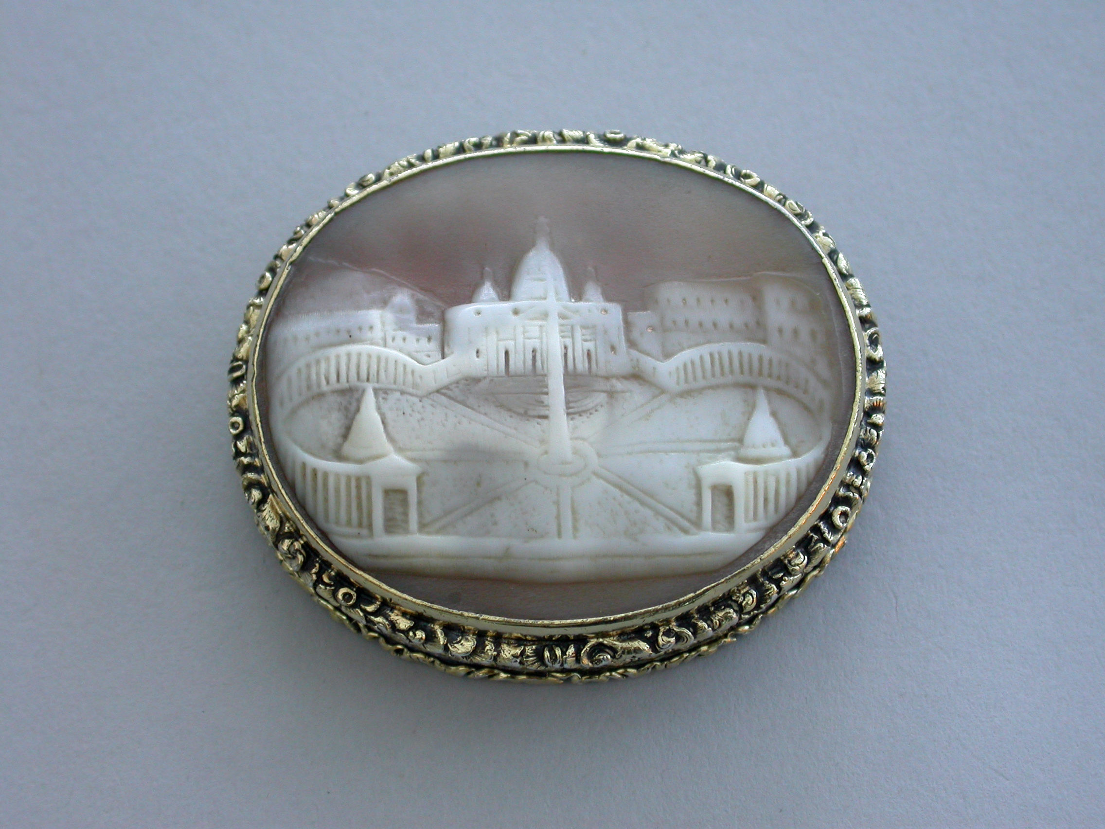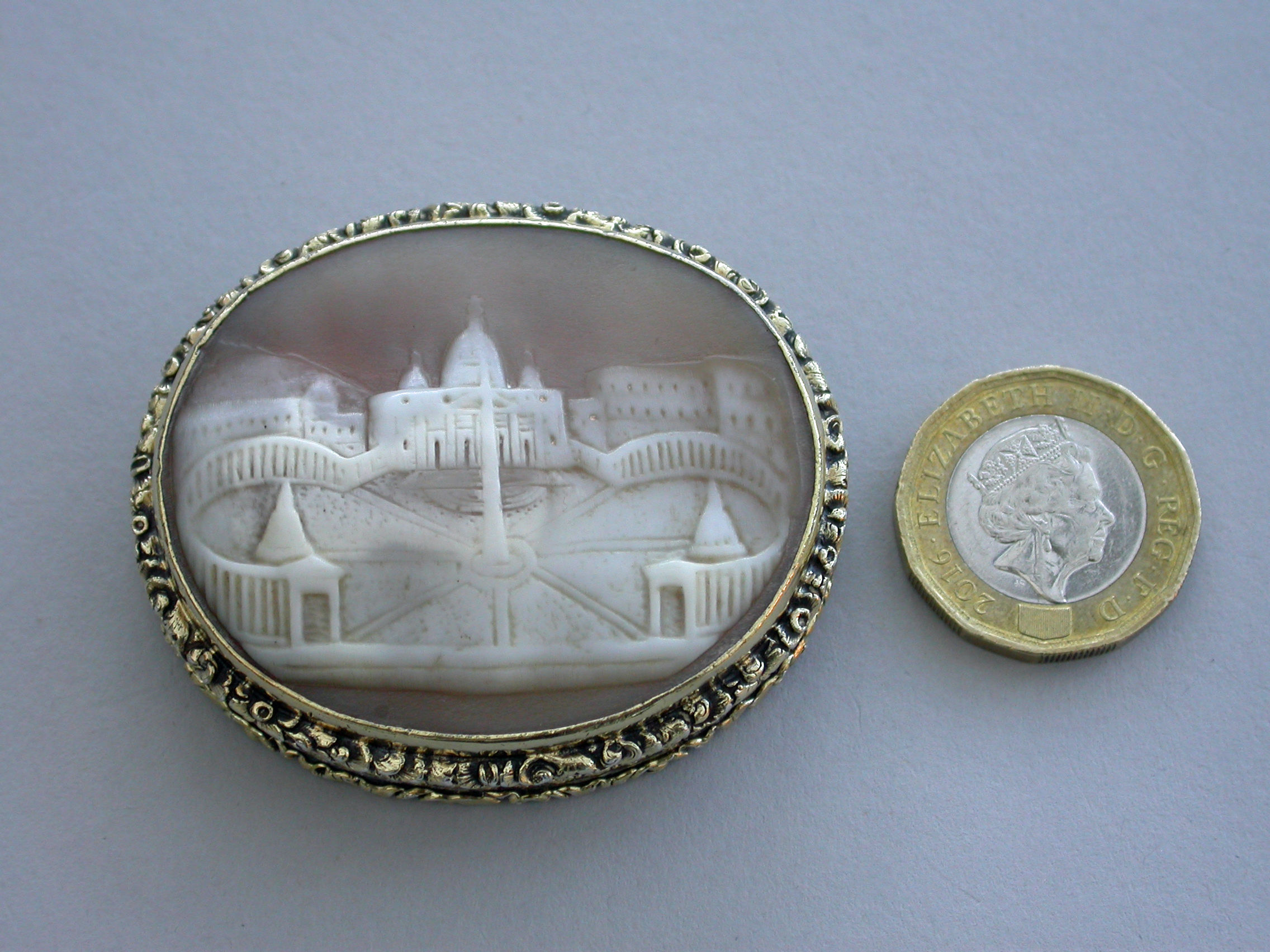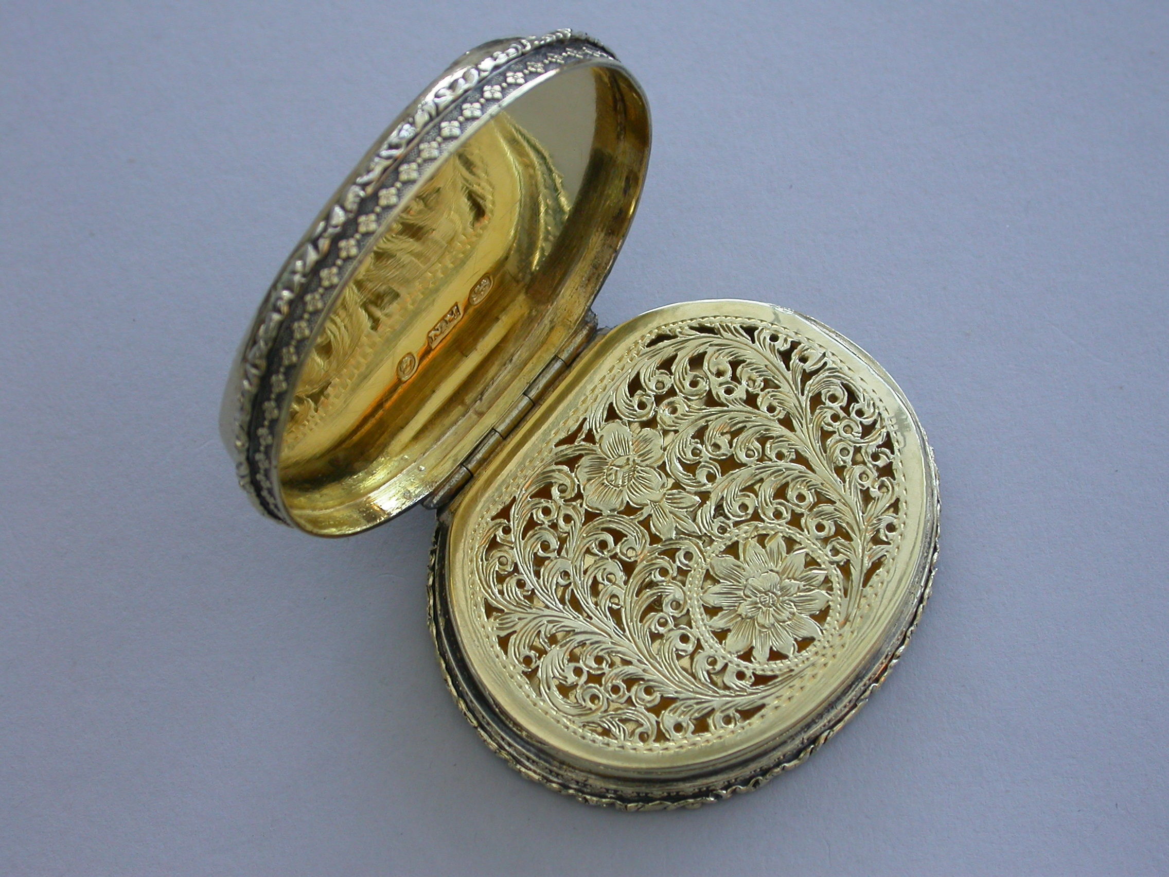 A fine large William IV silver gilt Vinaigrette, the cover mounted with a cameo carved with a view of St Peter's Square, Rome, the base heavily engraved with scrolling leaves and two small flower heads with a small central vacant oval cartouche. Foliate borders to cover and base with flower head decorations between the five lugged lugged stand-away hinge. Silver gilt grill of two scrolling fronds rising from either side of a bordered flower head at centre base to a central flower head at the top within a decorative border.
