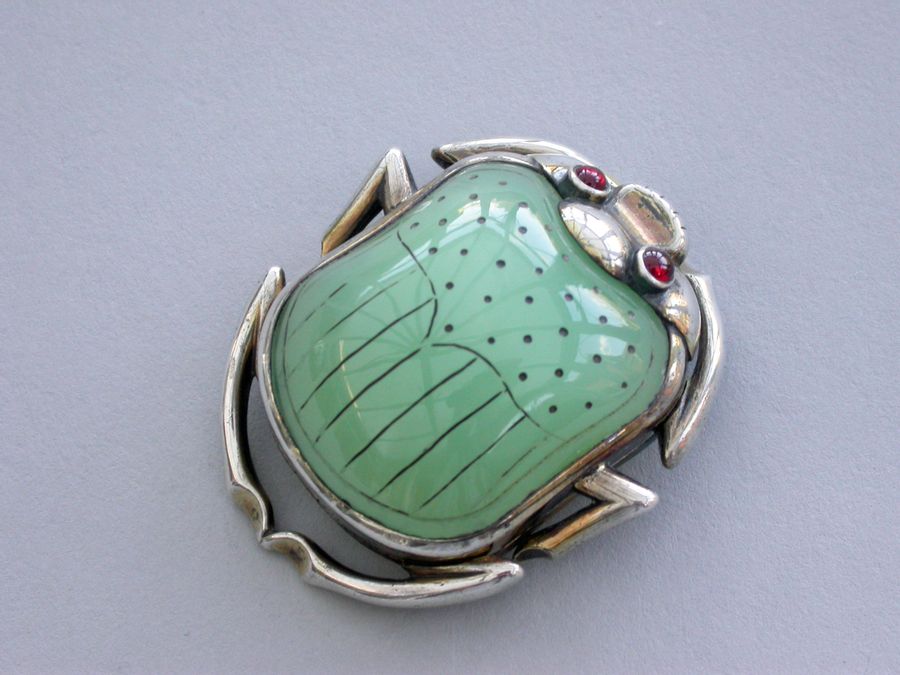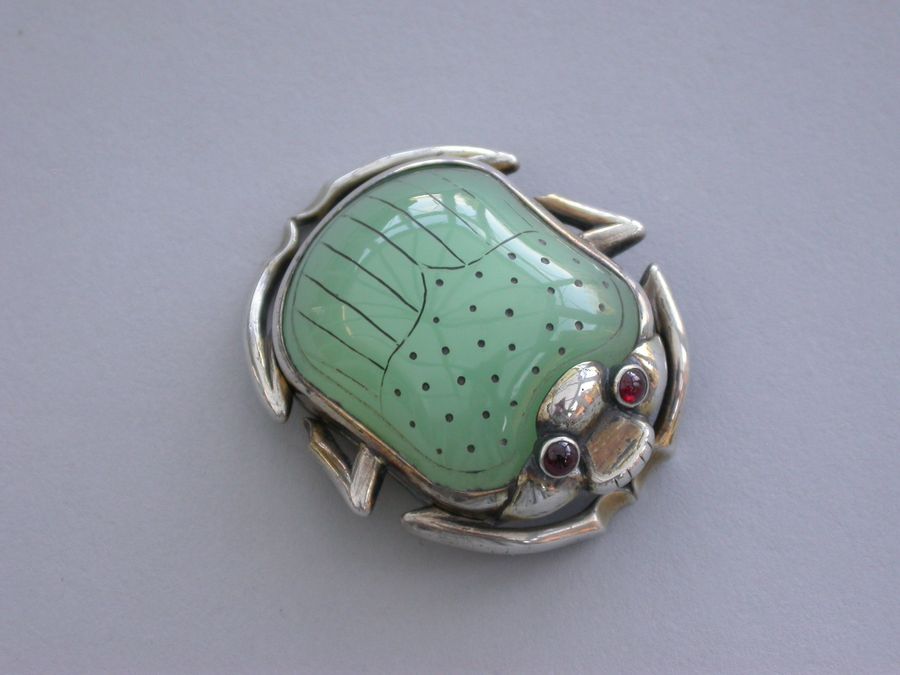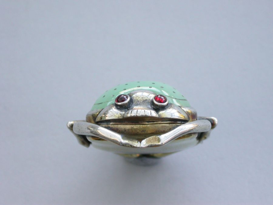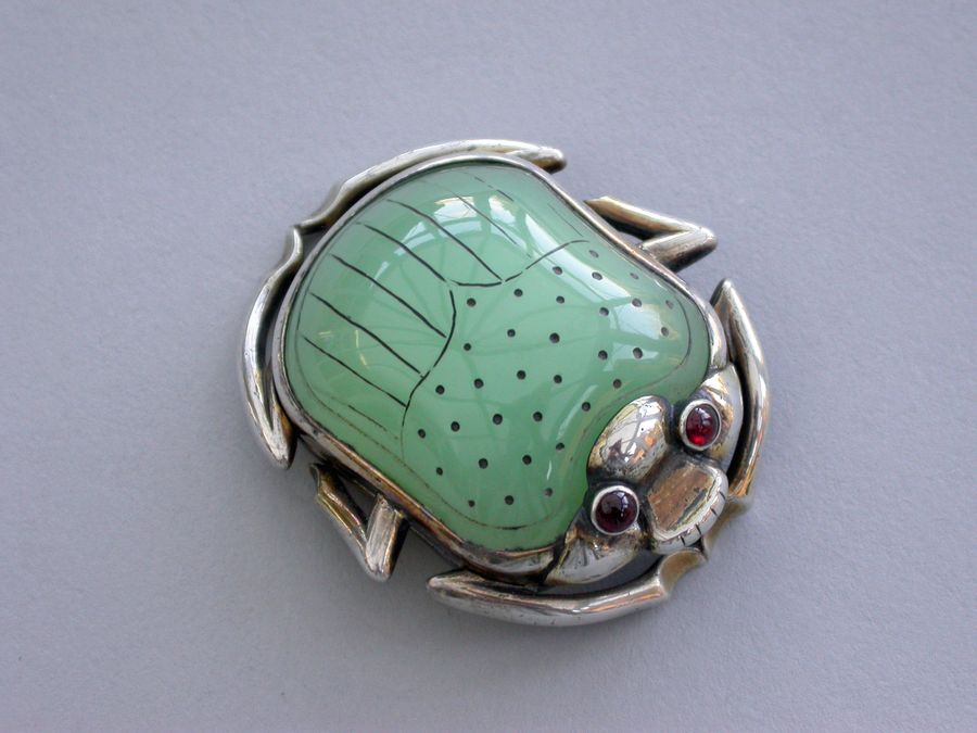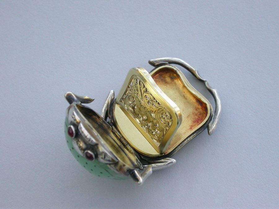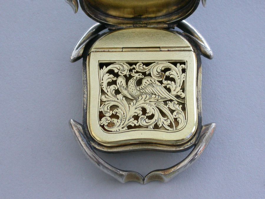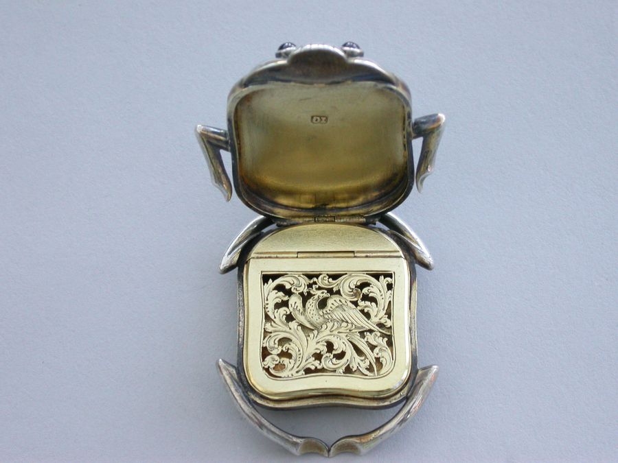 An extremely fine quality William IV silver gilt Vinaigrette formed as a Scarab Beetle, the lid inset with a polished and decorated Chrysoprase, red cabochon eyes, mandibular detail and separated legs to the side, the base contoured and with front and back legs attached. The silver gilt grille shaped as the body with pierced decoration of an exotic bird amongst foliage.