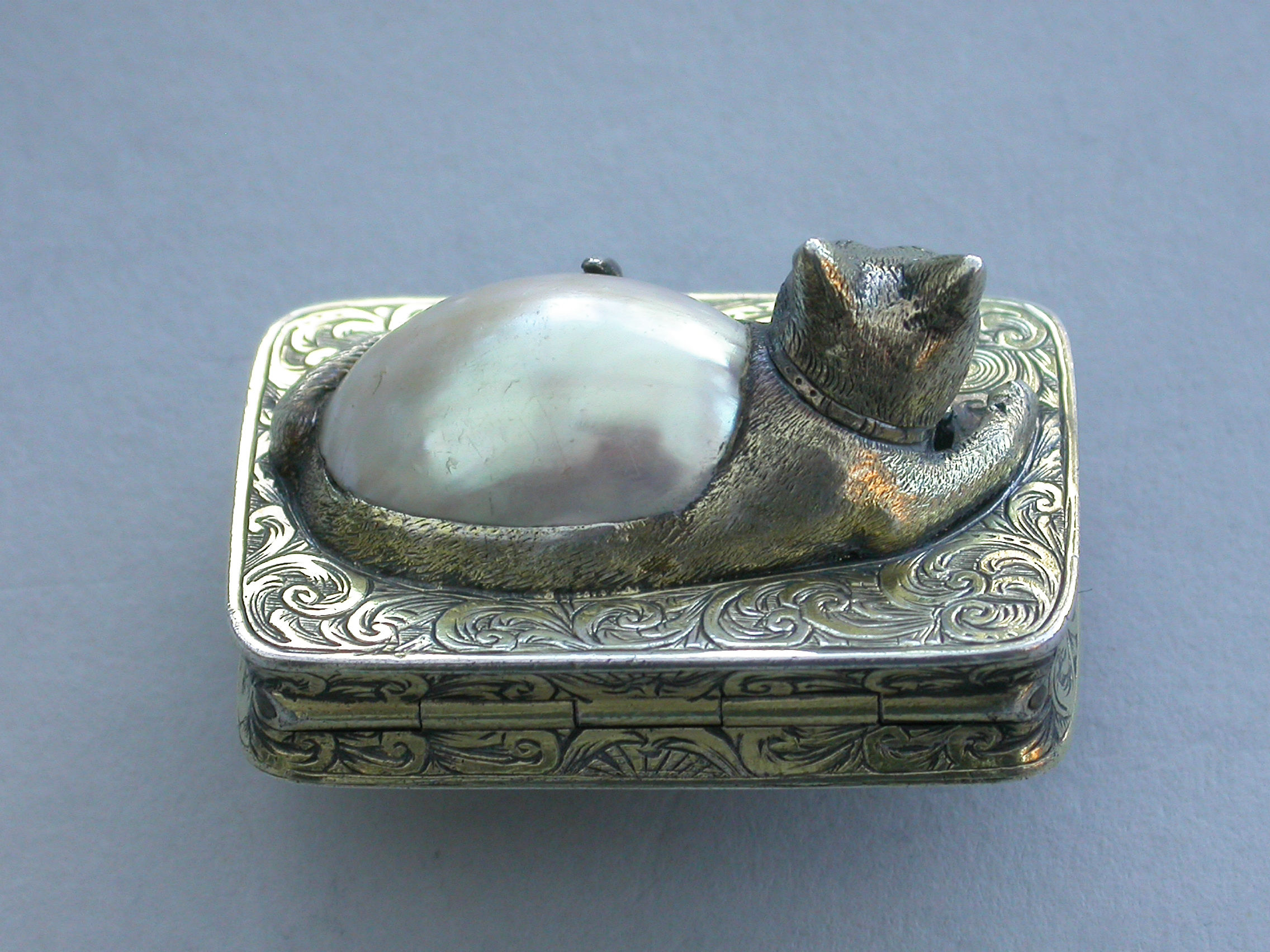 An extremely rare and fine quality William IV rectangular silver gilt Vinaigrette, hand engraved with scrolling foliate motifs, the base with leaves and flower heads in the centre, the sides slightly incurving, the lid set with a blister pearl mounted as a Cat. The silver gilt grille pierced with scrolling leaves.
