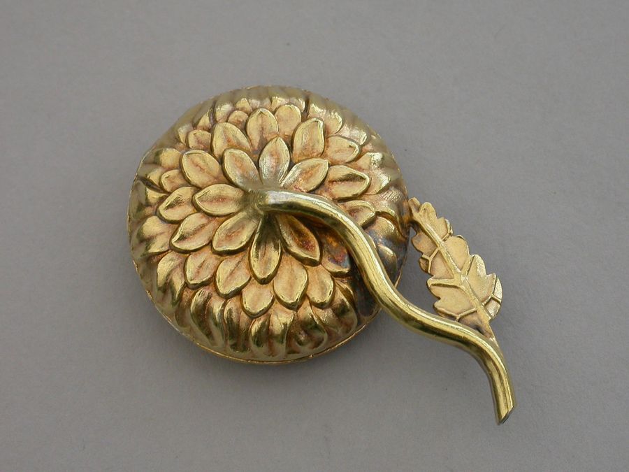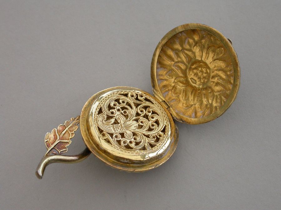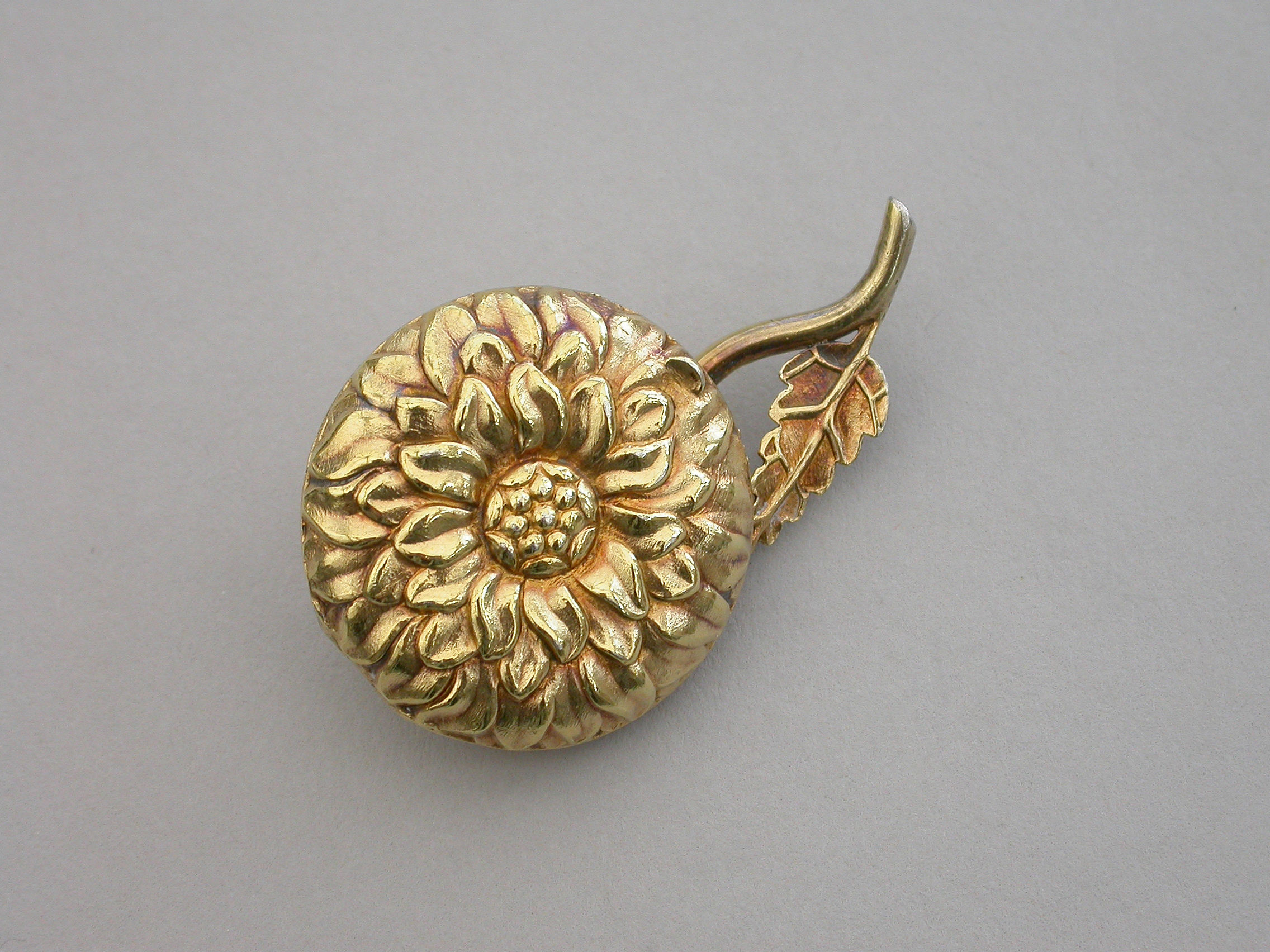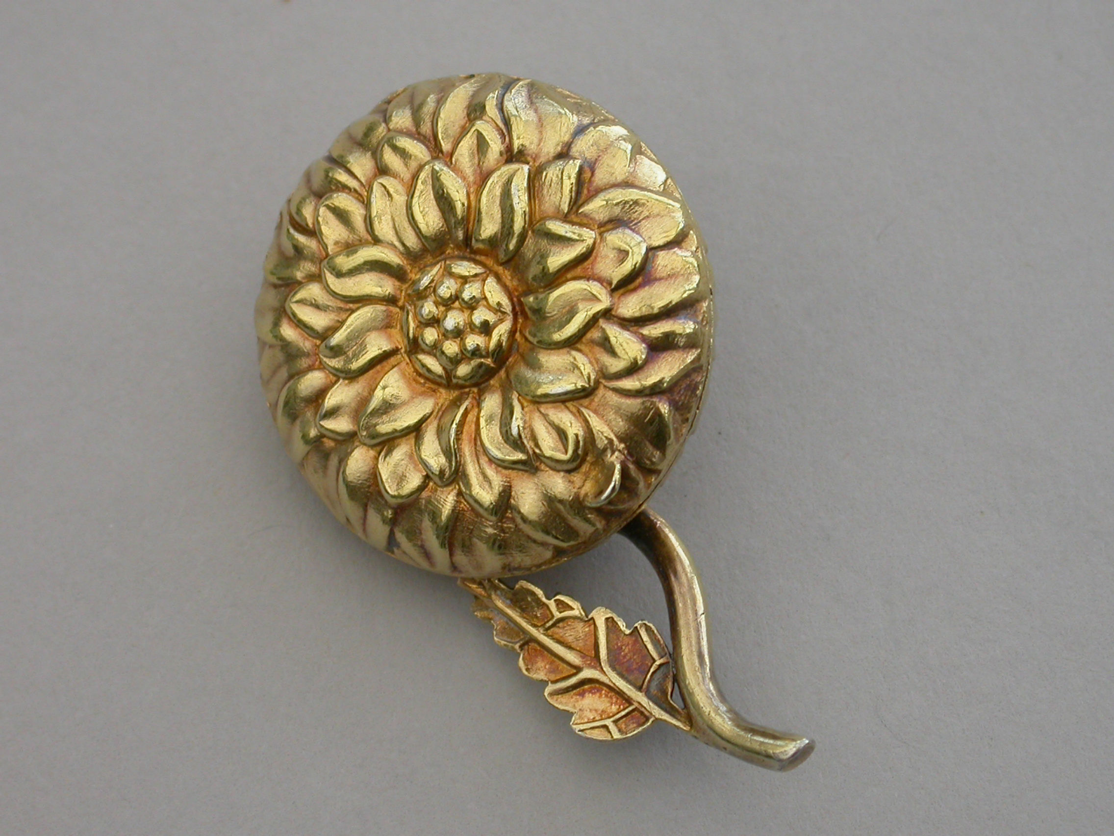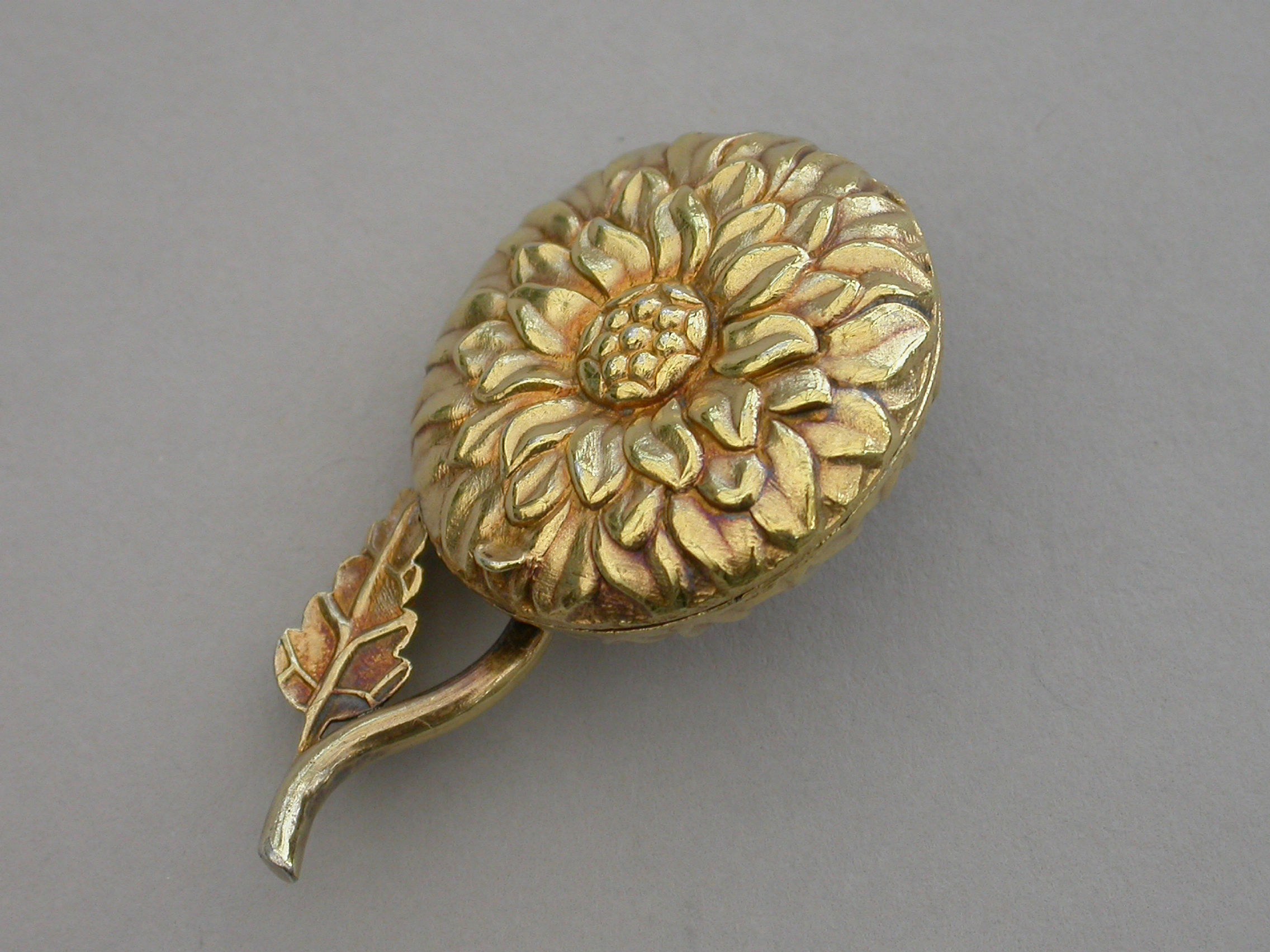 An extremely rare William IV novelty silver gilt Vinaigrette formed as a Chrysanthemum, the circular body repousse decorated with finely chased petals, the short wire stem with single cast leaf. The interior silver gilt grille pierced with a cornucopia overflowing with scrolling leaves.