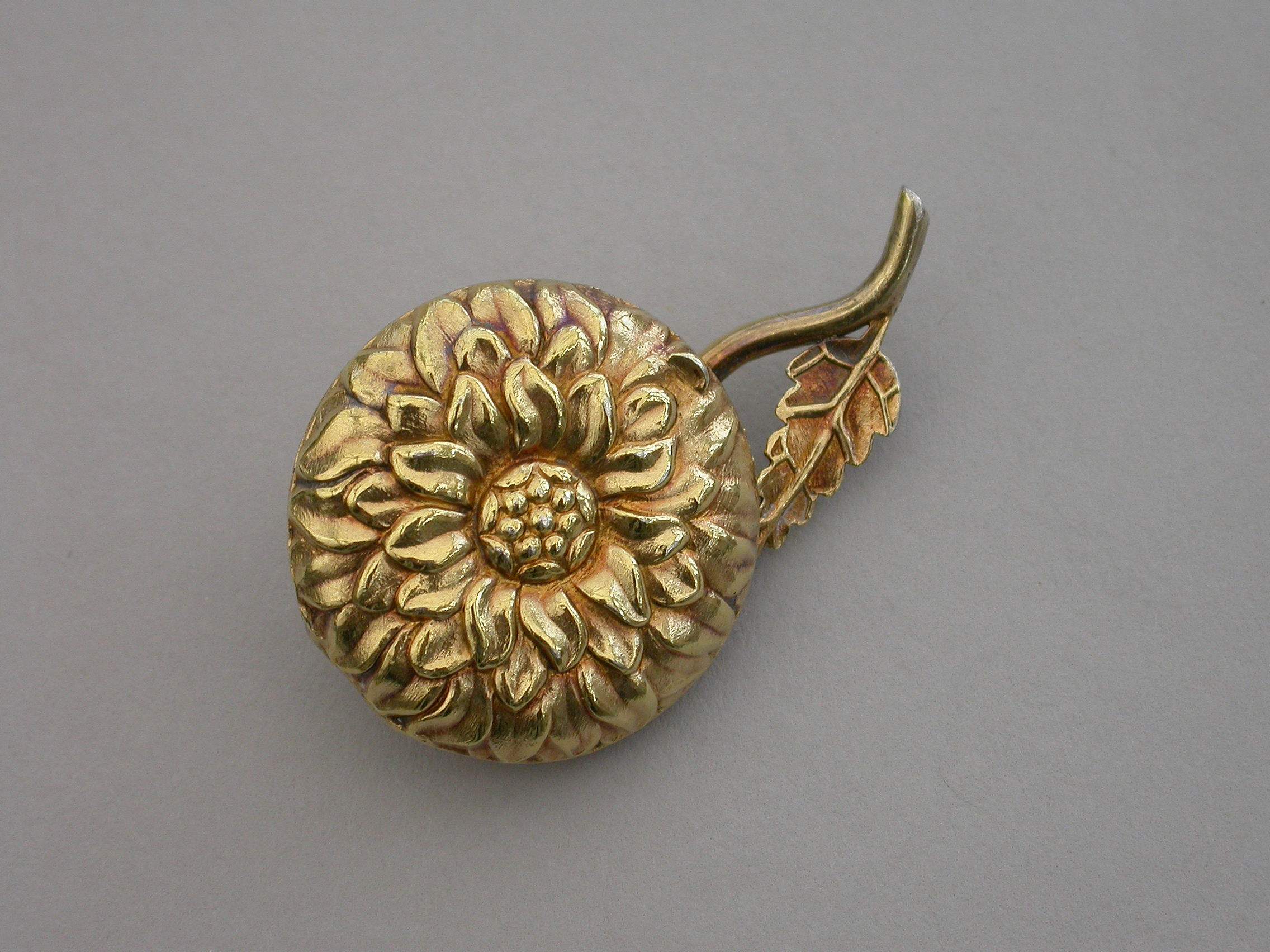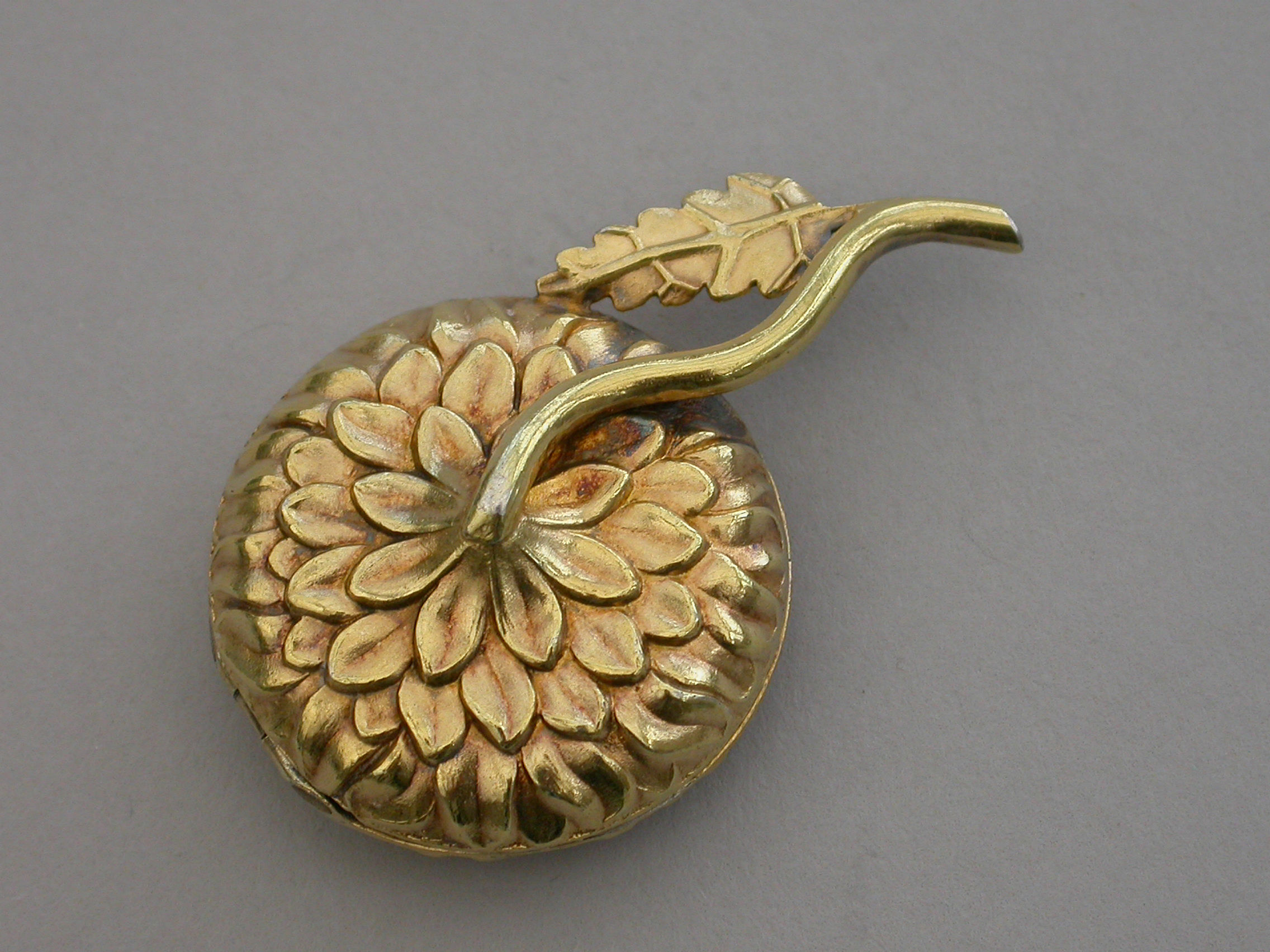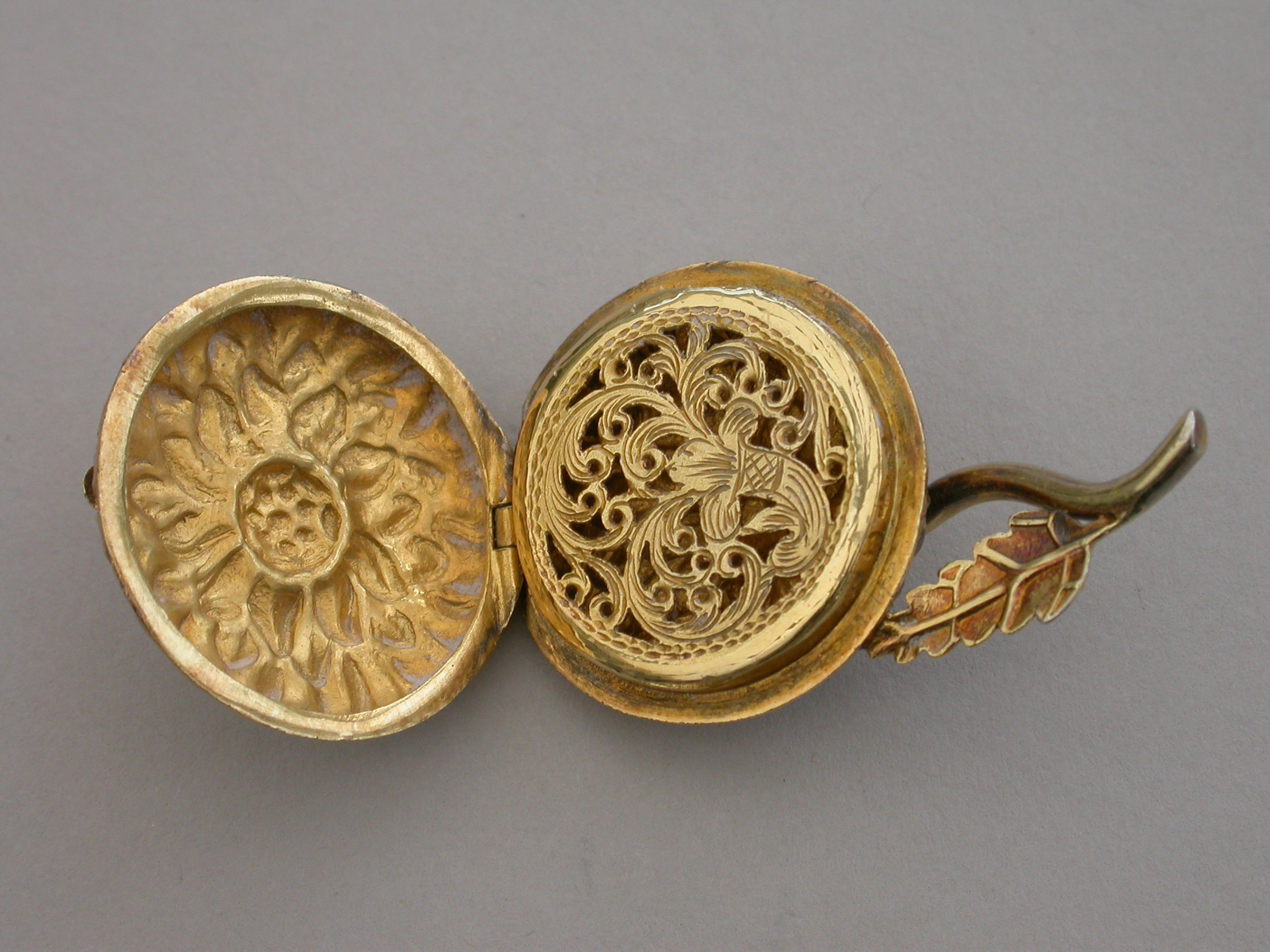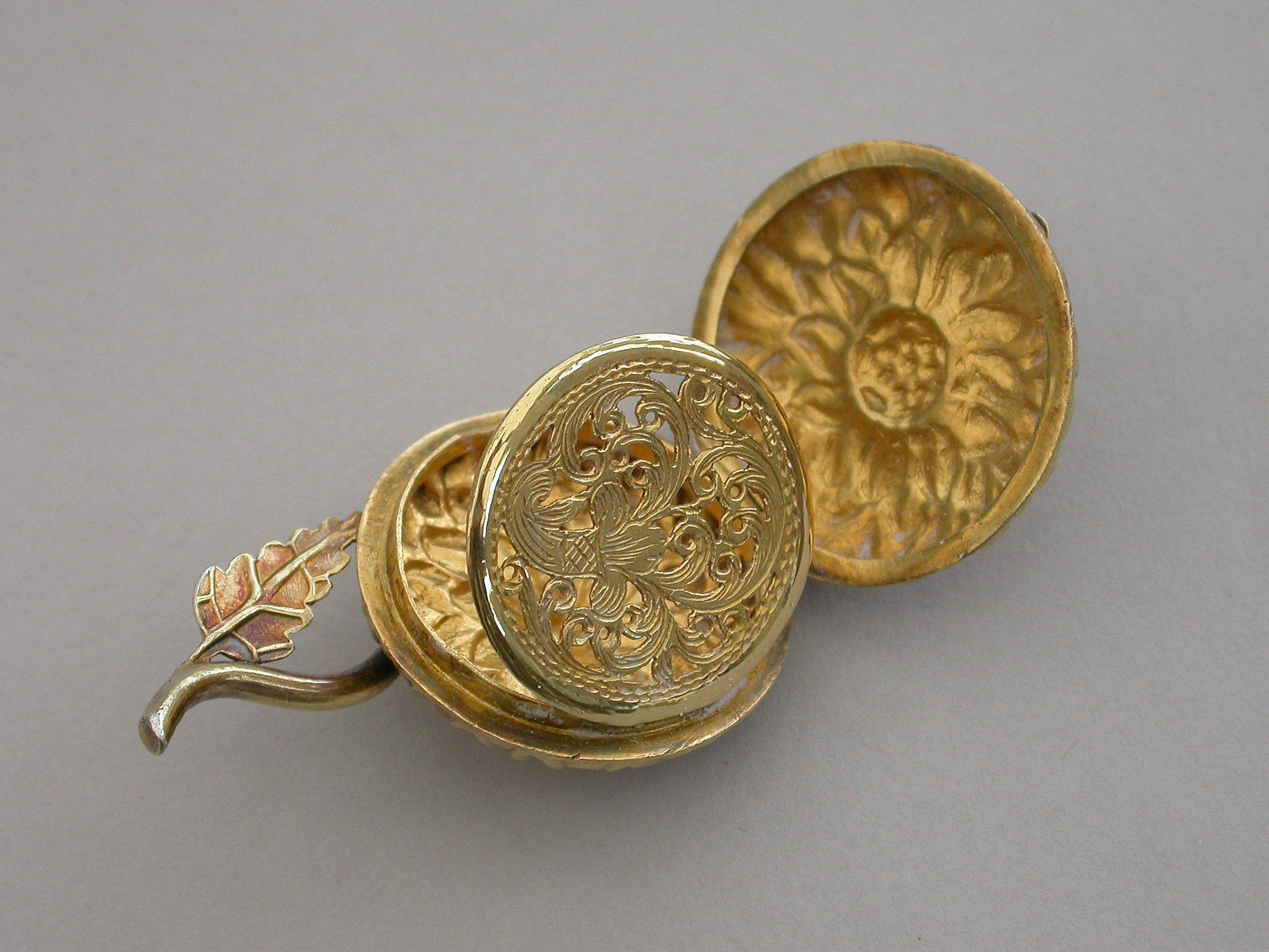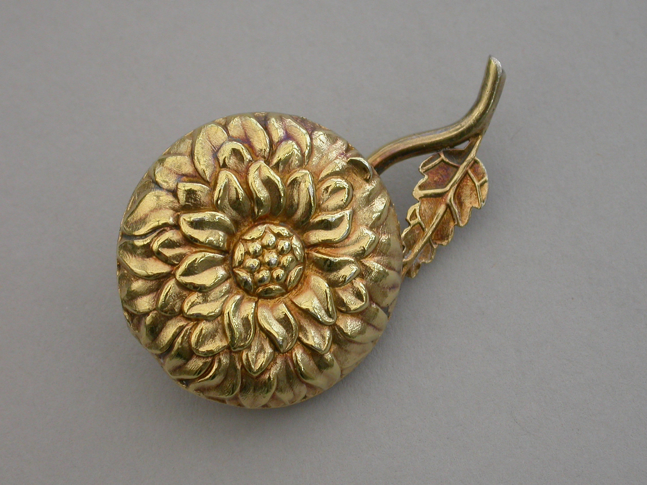 An extremely rare William IV novelty silver gilt Vinaigrette formed as a Chrysanthemum, the circular body repousse decorated with finely chased petals, the short wire stem with single cast leaf. The interior silver gilt grille pierced with a cornucopia overflowing with scrolling leaves.