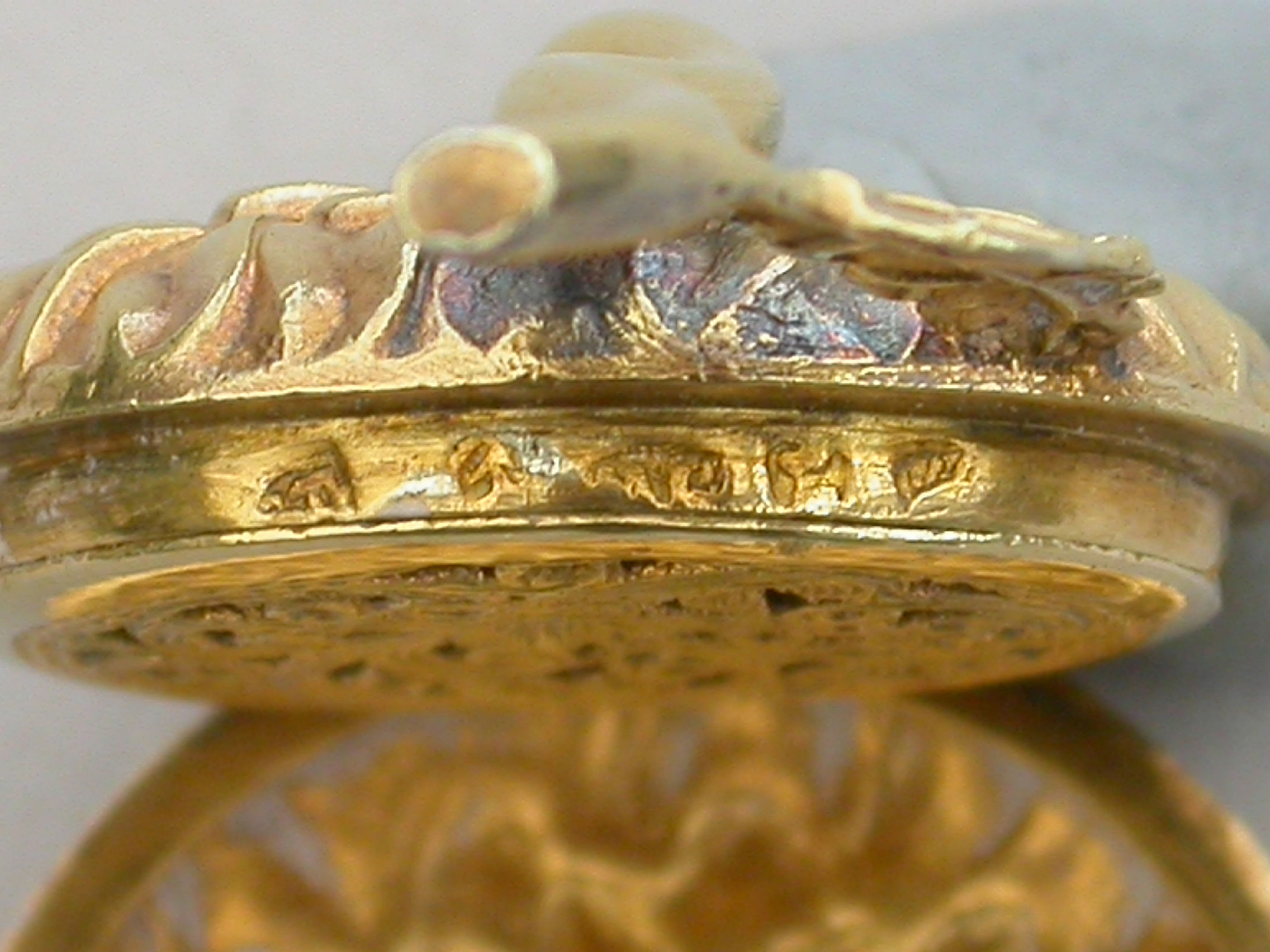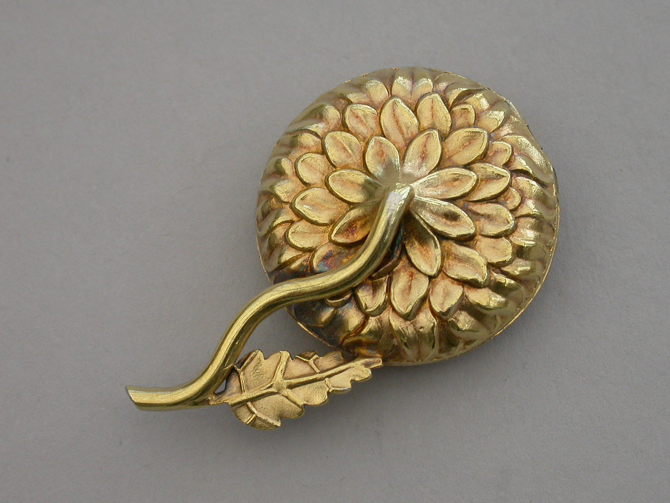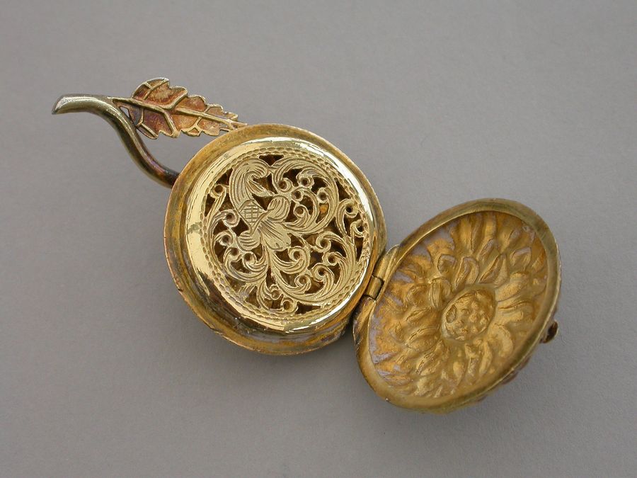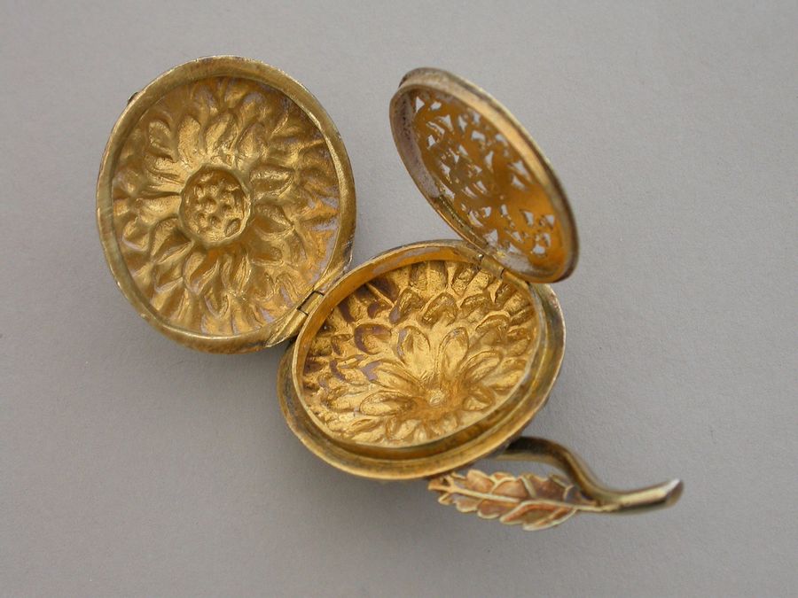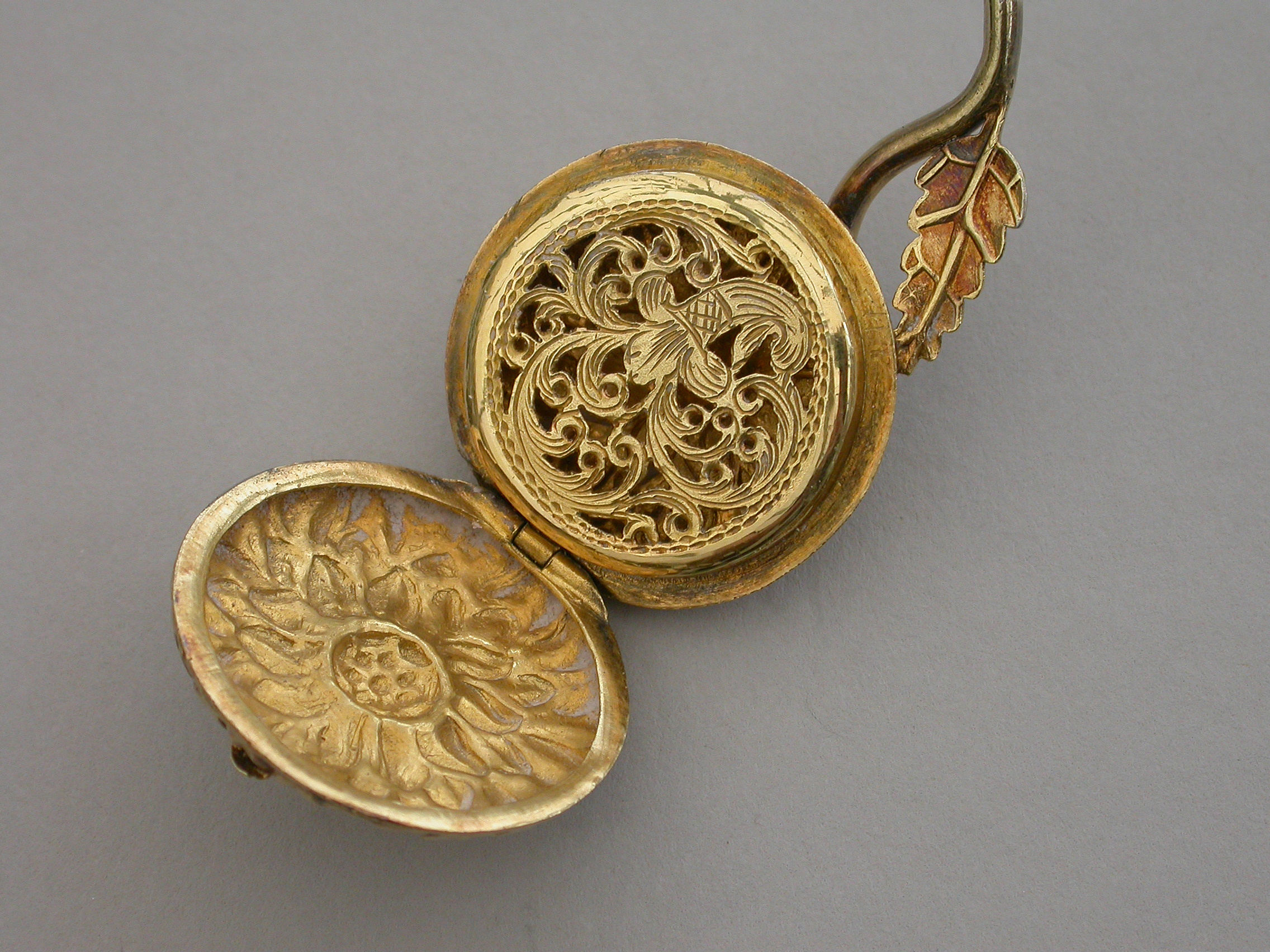 An extremely rare William IV novelty silver gilt Vinaigrette formed as a Chrysanthemum, the circular body repousse decorated with finely chased petals, the short wire stem with single cast leaf. The interior silver gilt grille pierced with a cornucopia overflowing with scrolling leaves.