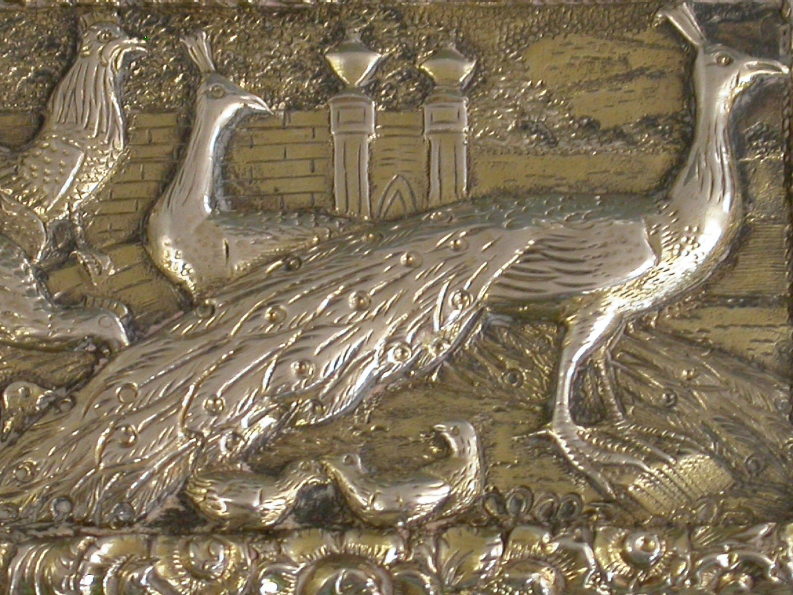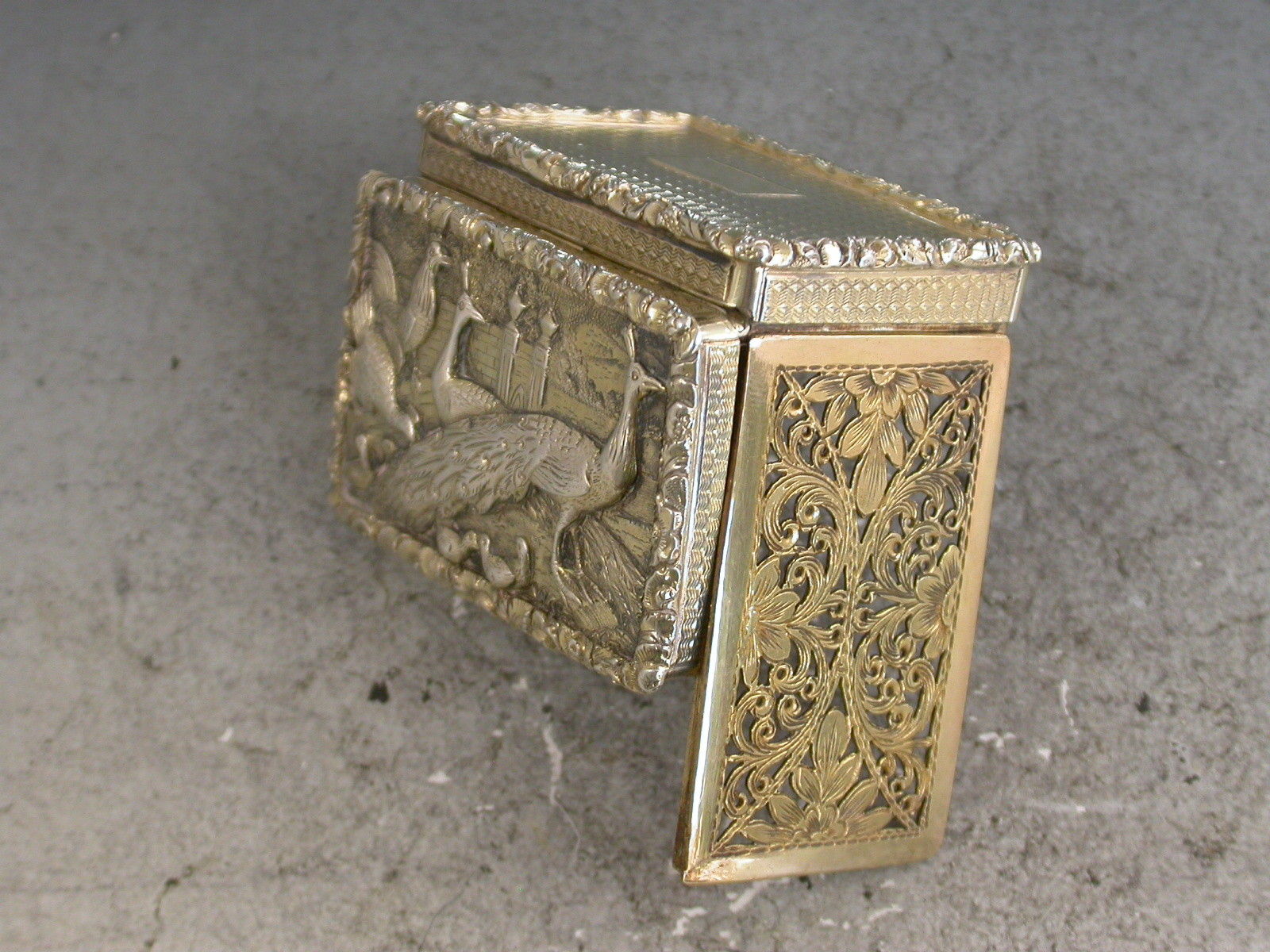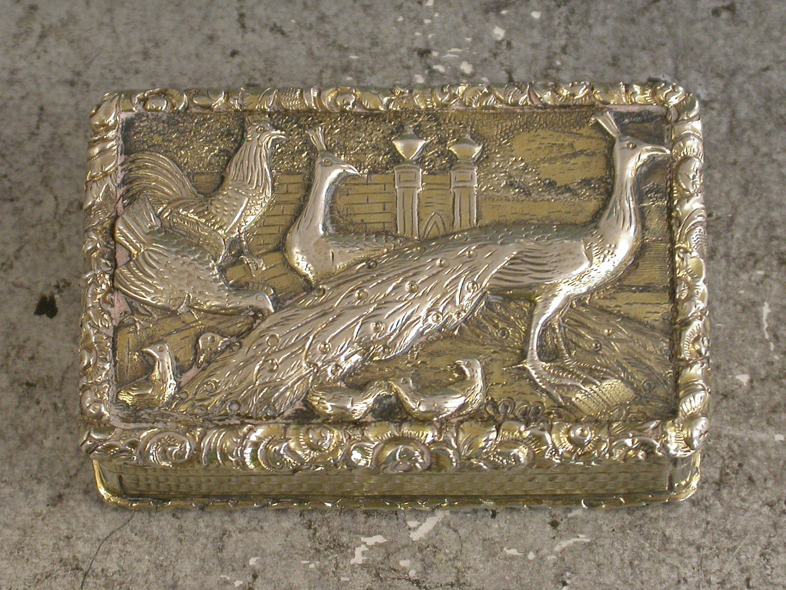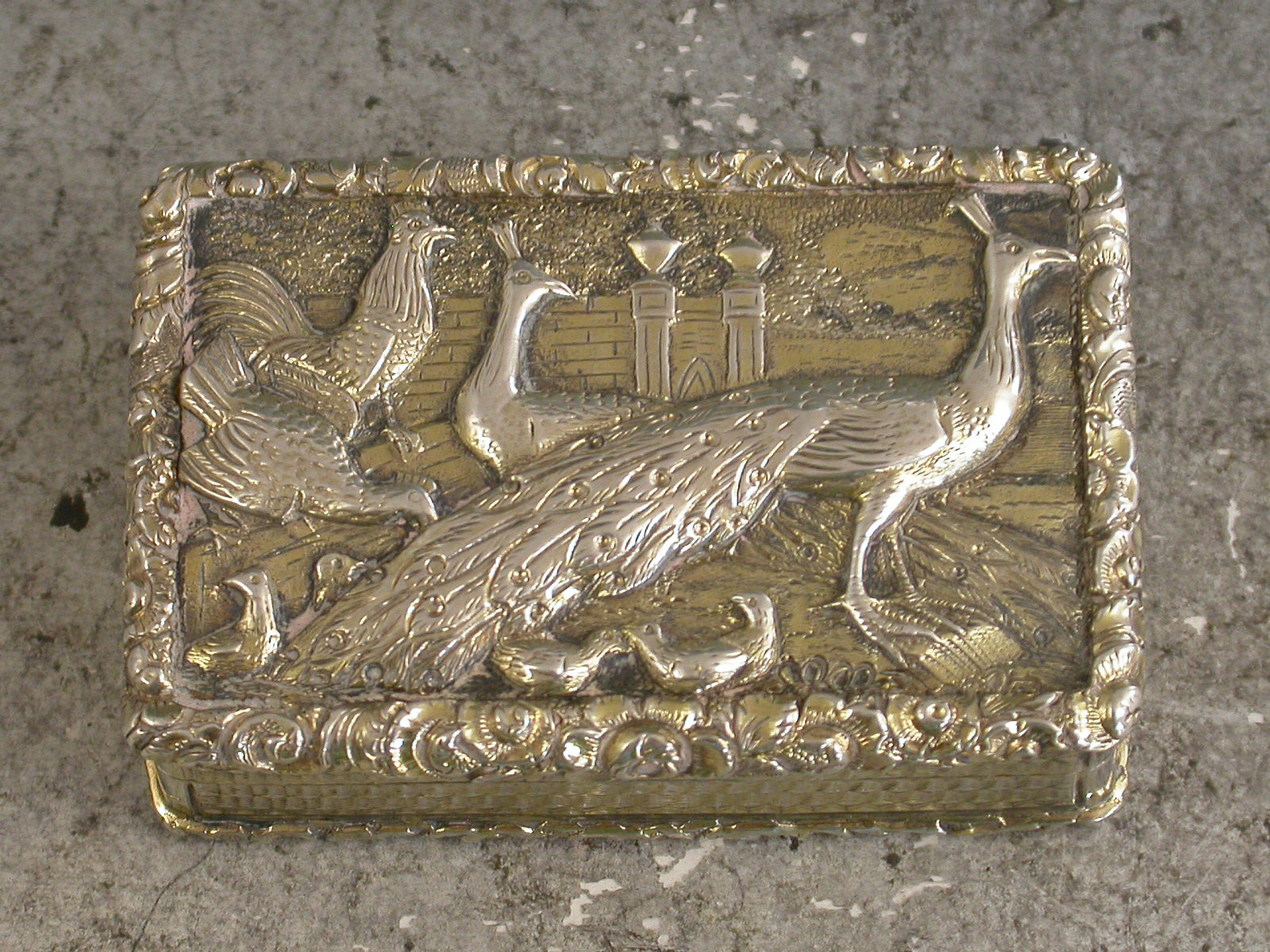 A very fine quality large and heavy silver gilt Vinaigrette of rectangular form with engine turned decoration to the base and sides, raised shell and foliate borders, the lid set with a raised panel depicting peacocks, chickens and their chicks in a parkland scene. The silver gilt interior with intricately pierced foliate scroll grille.