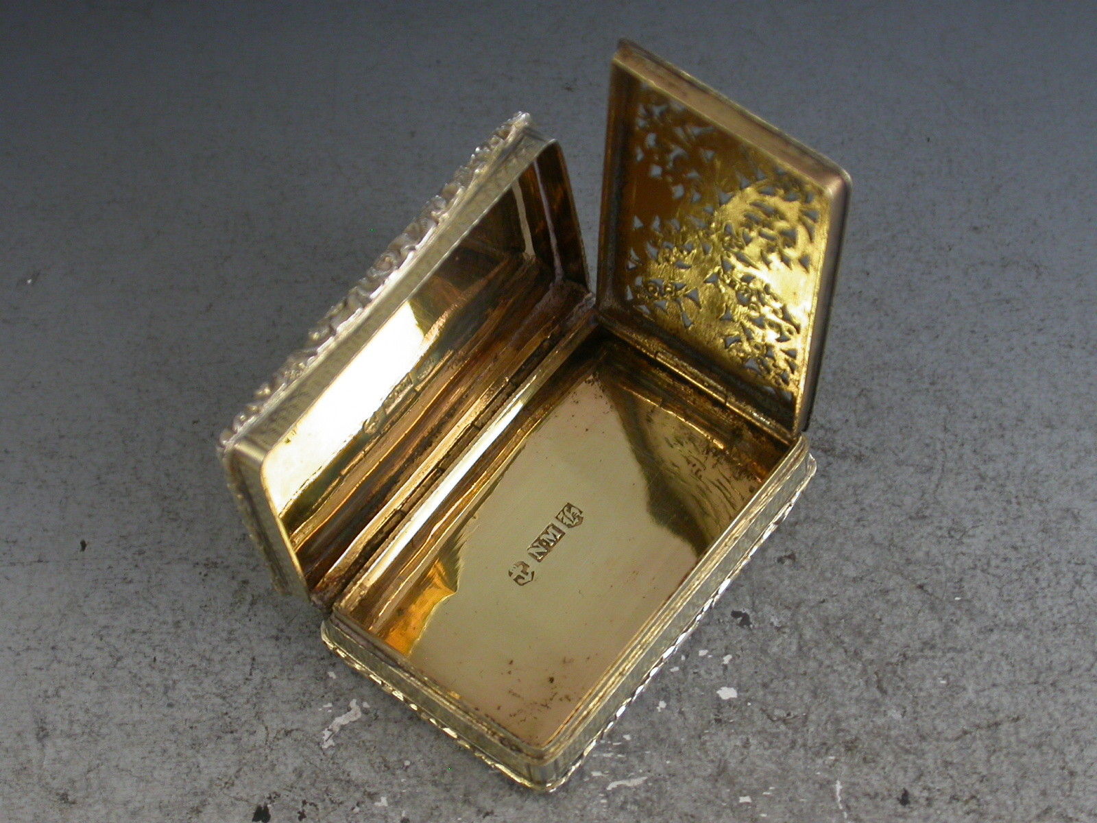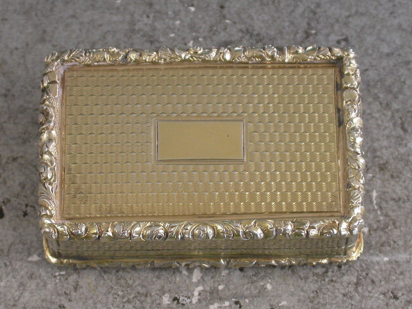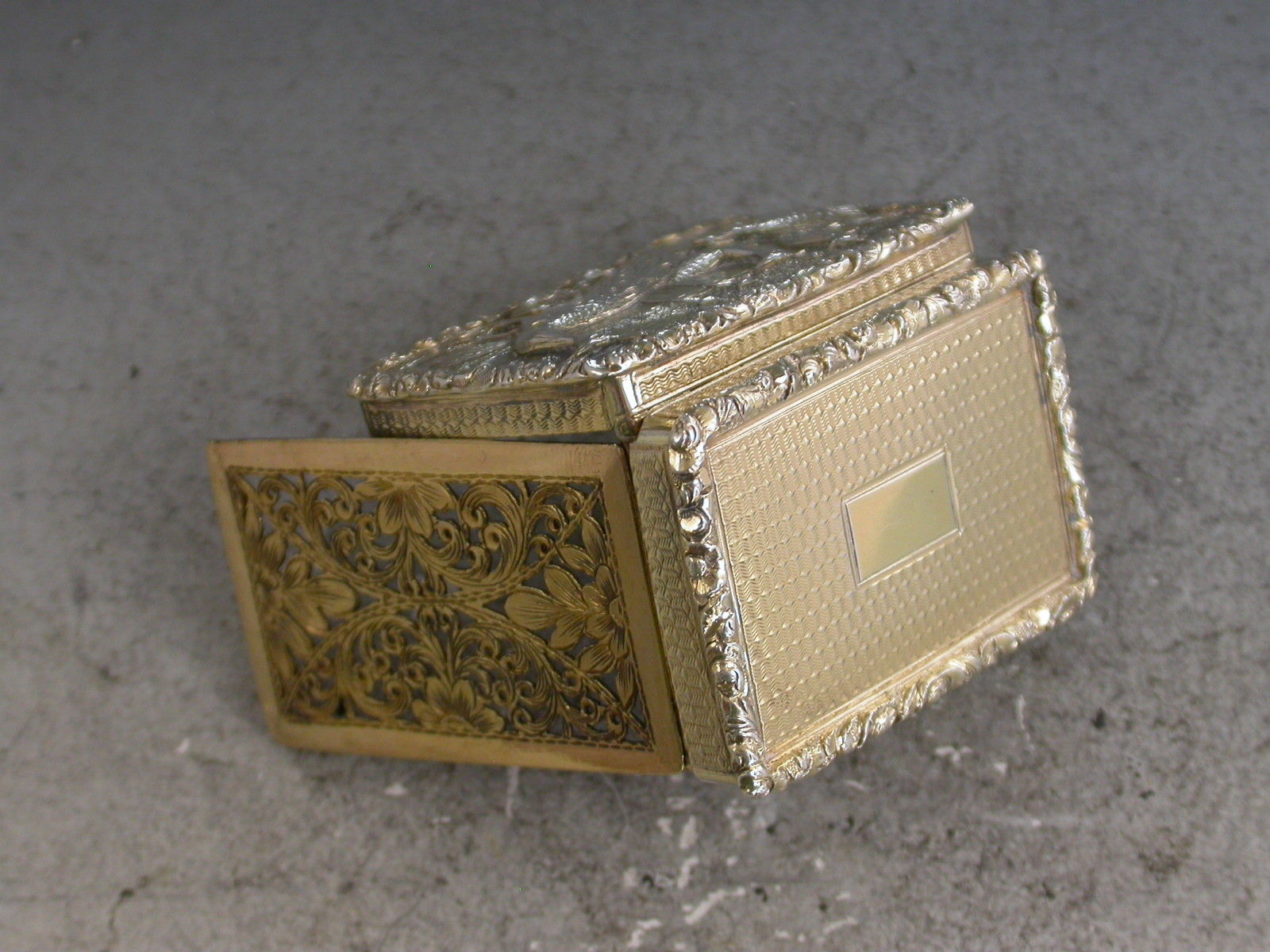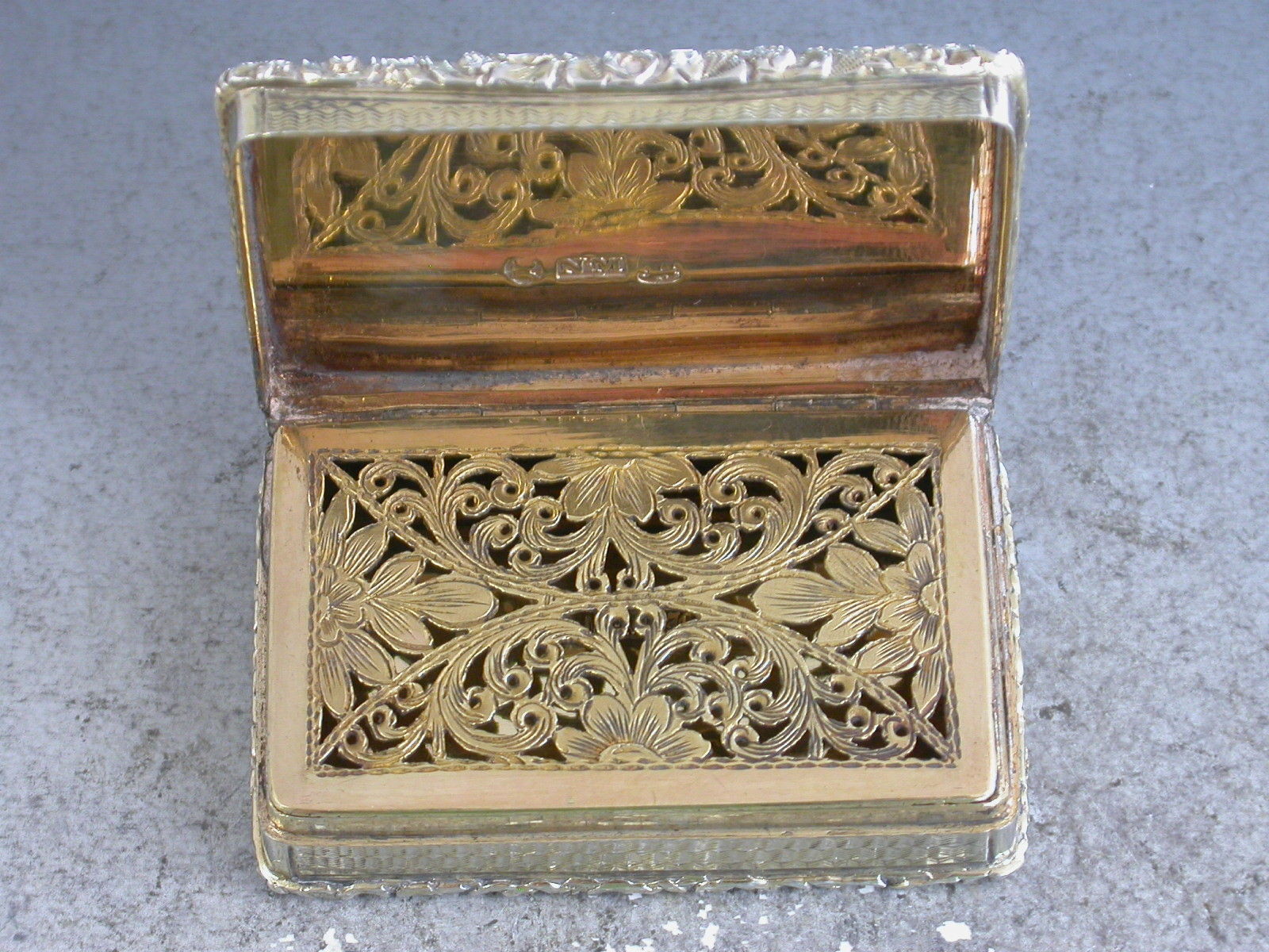 A very fine quality large and heavy silver gilt Vinaigrette of rectangular form with engine turned decoration to the base and sides, raised shell and foliate borders, the lid set with a raised panel depicting peacocks, chickens and their chicks in a parkland scene. The silver gilt interior with intricately pierced foliate scroll grille.