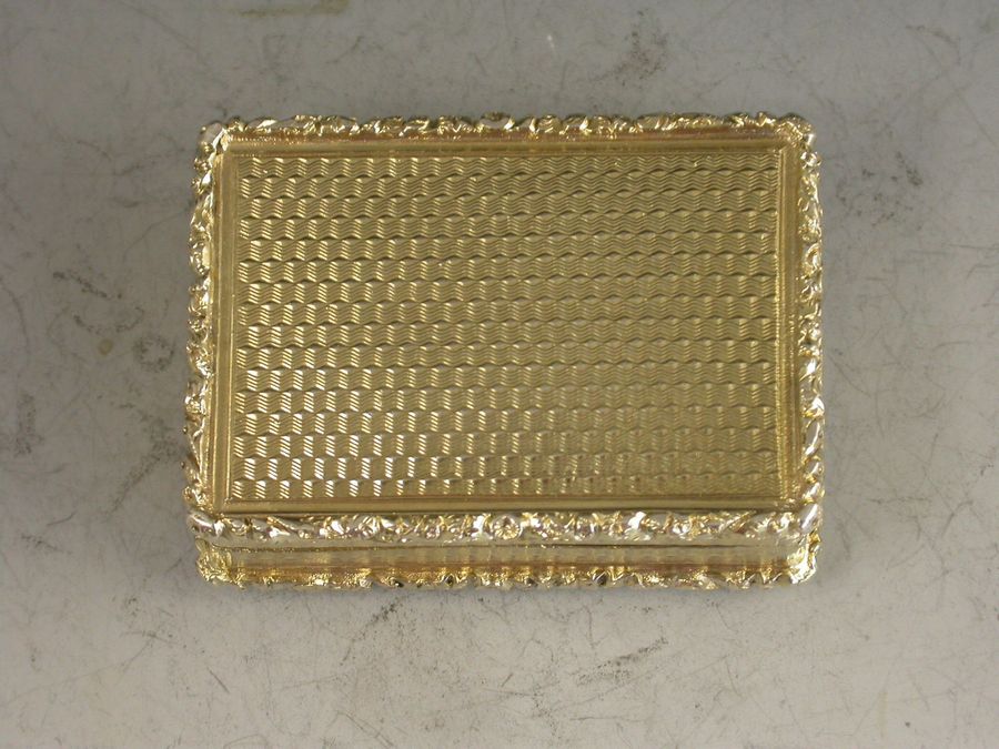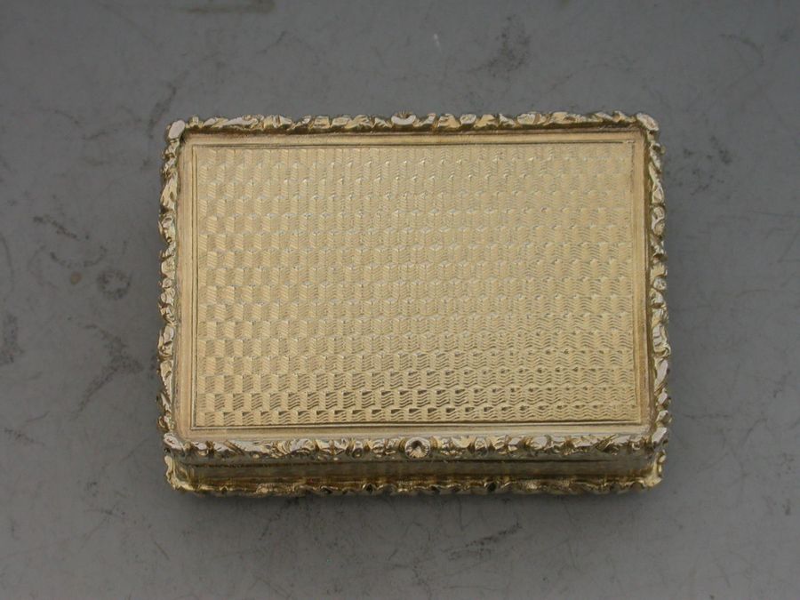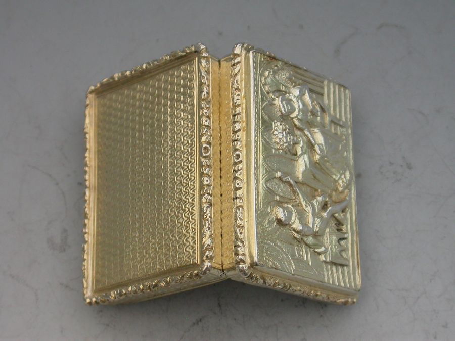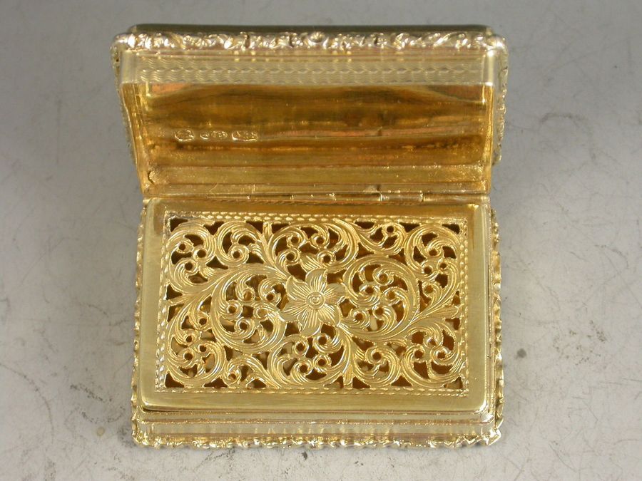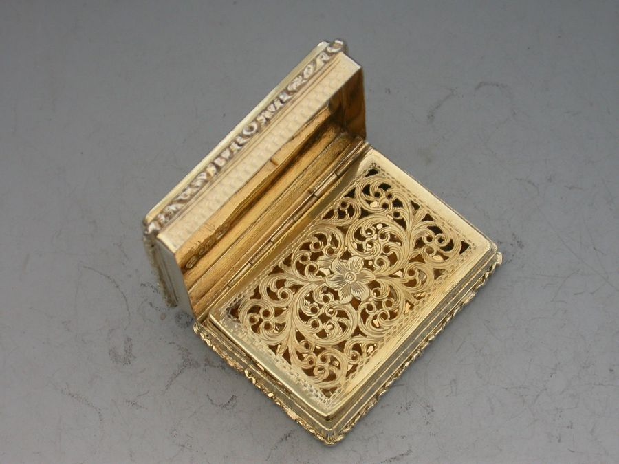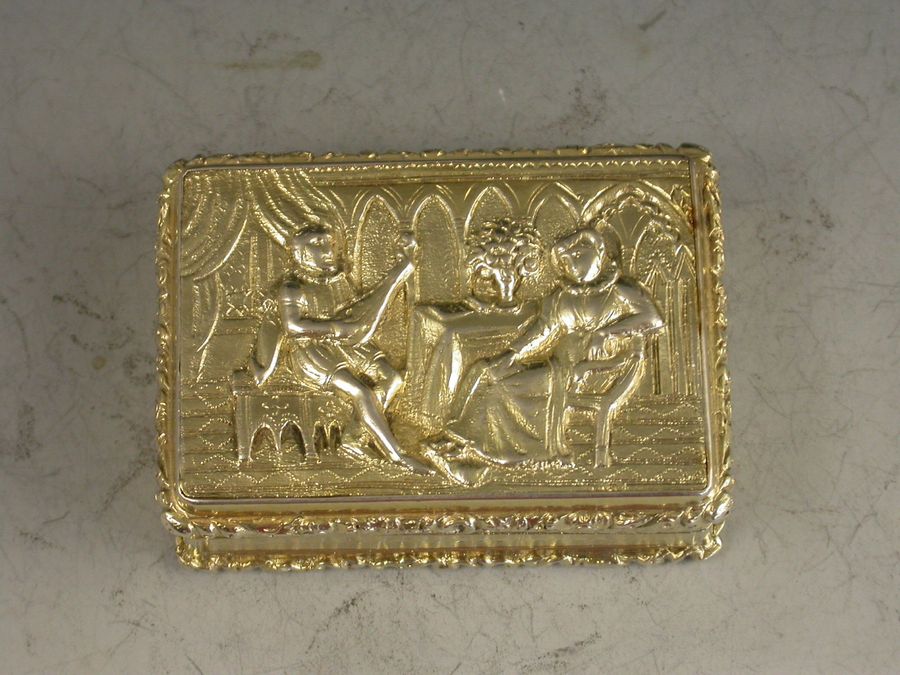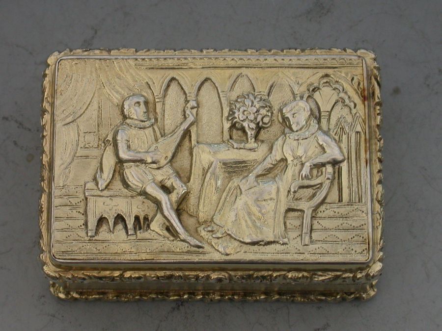 A very fine quality and rare William IV silver gilt Vinaigrette, of rectangular form with raised foliate borders, the base and sides with engine turned decoration, the lid with inset panel depicting ""Chatelar playing the lute to Mary Queen of Scots"" in high relief. The interior with intricately pieced foliate scroll grille.