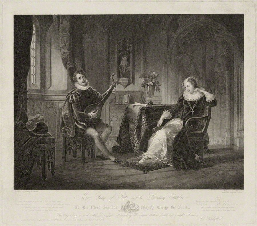 The illustrated print that it is likely that the inspiration for the scene on the Vinaigrette is taken from, is housed in the National Portrait Gallery. It depicts Pierre de Bocosel de Chatelard or Chastelard playing the lute to Mary, Queen of Scots. It is a line engraving dated 1830 by Andrew Duncan, after a painting by Henri Jean-Baptiste Victoire Fradelle.