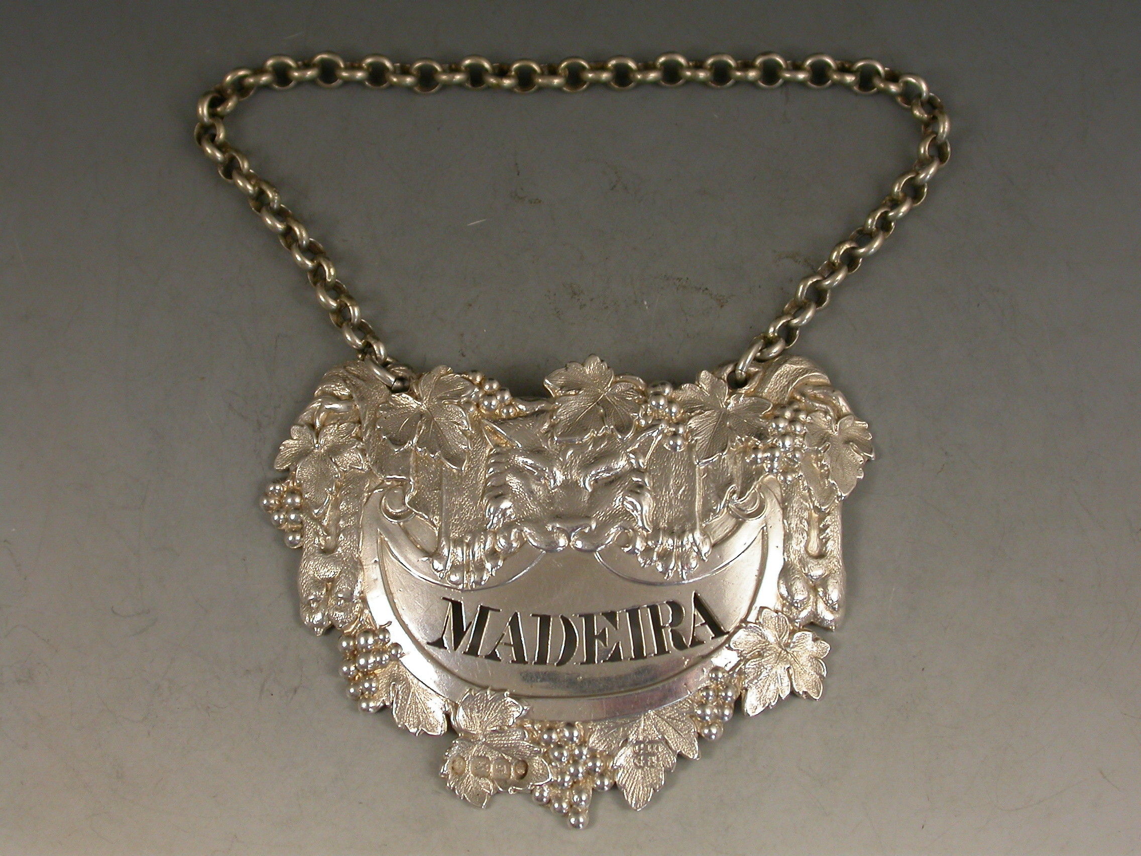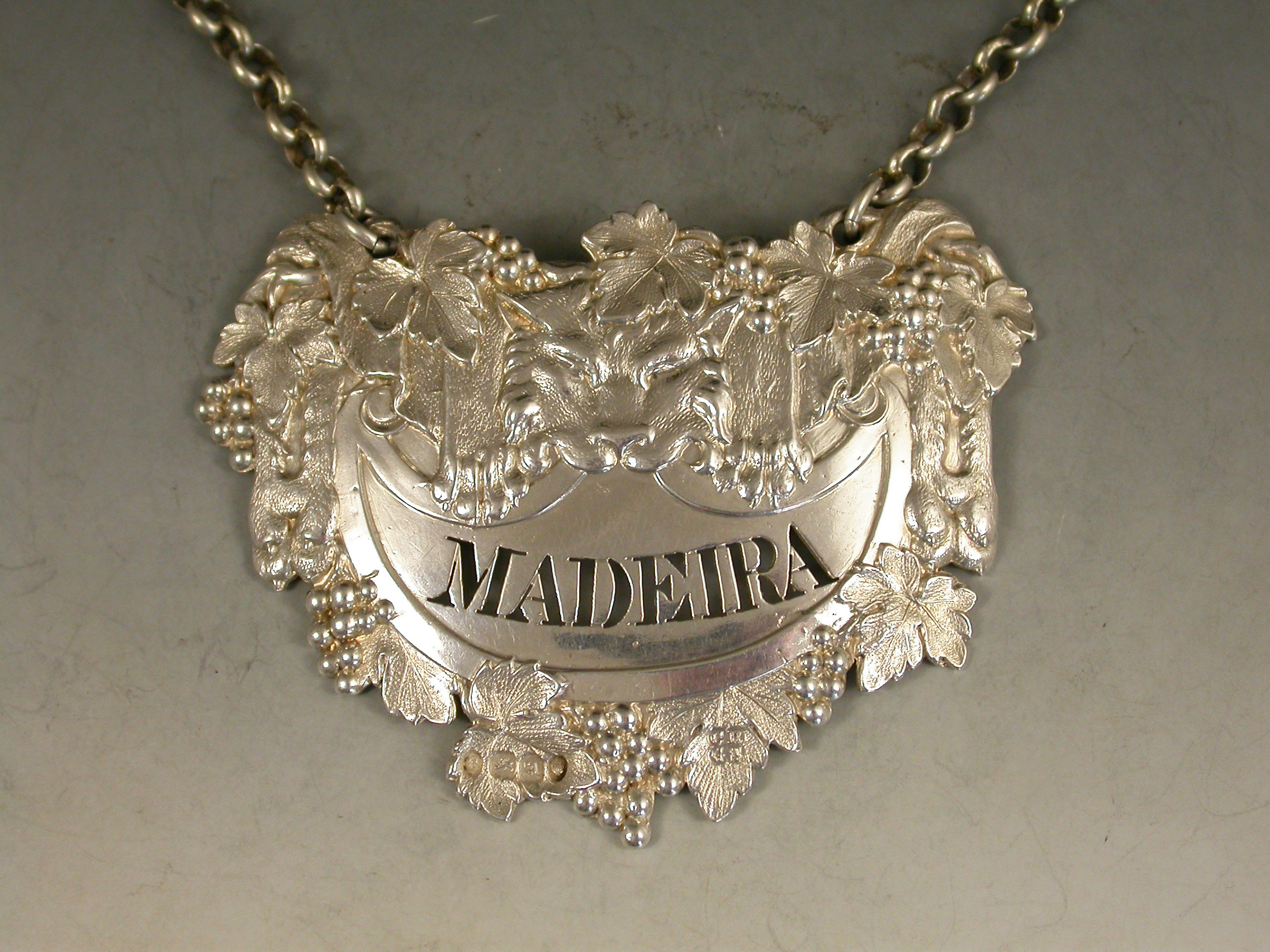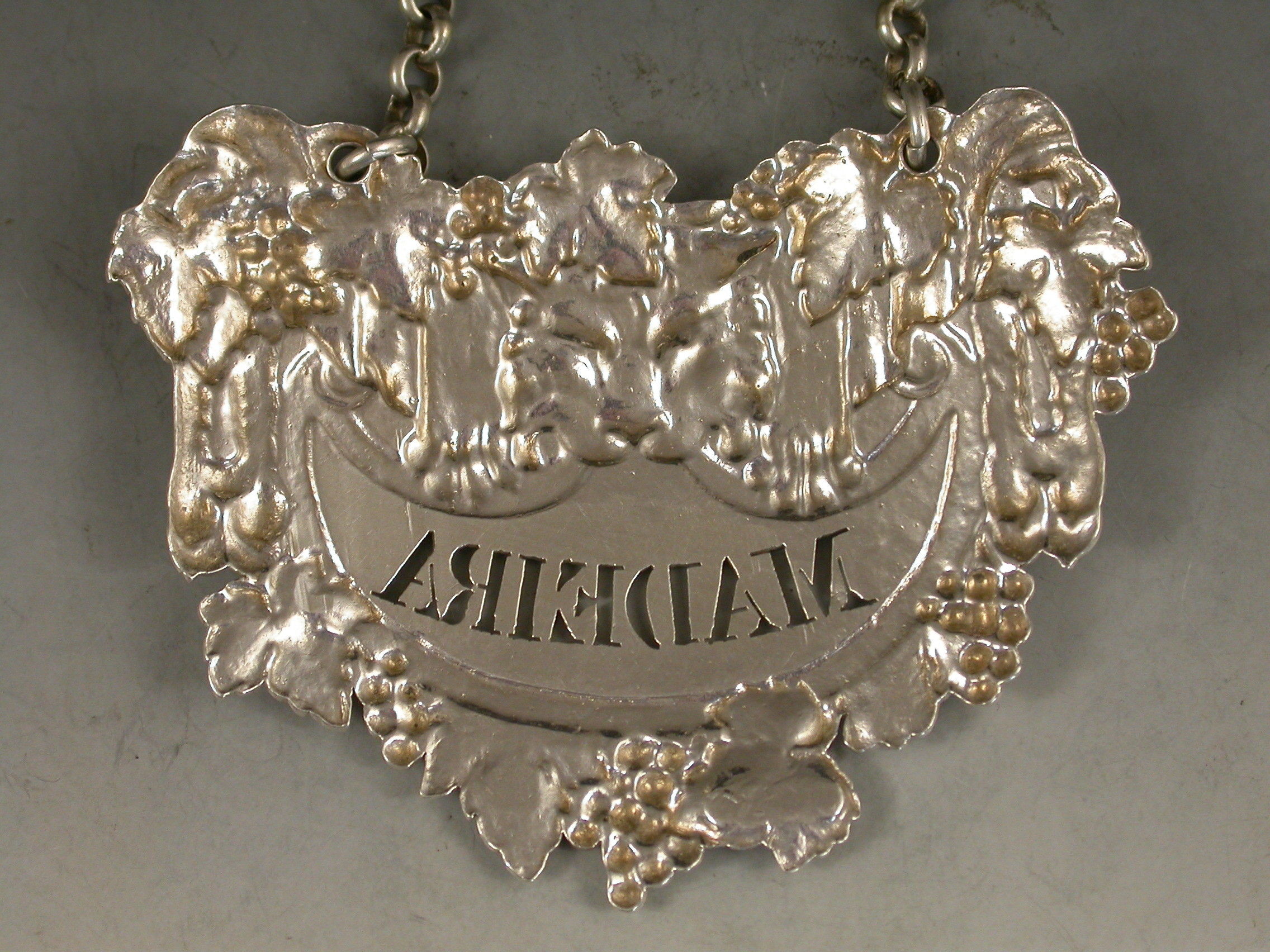 A rare William IV silver Wine Label, the design known as the ""Leopards Pelt"", of cartouche form with vine leaf and grape surround, a leopards skin with head and paws draped over the peaked crescent shape name plate pierced for Madeira.