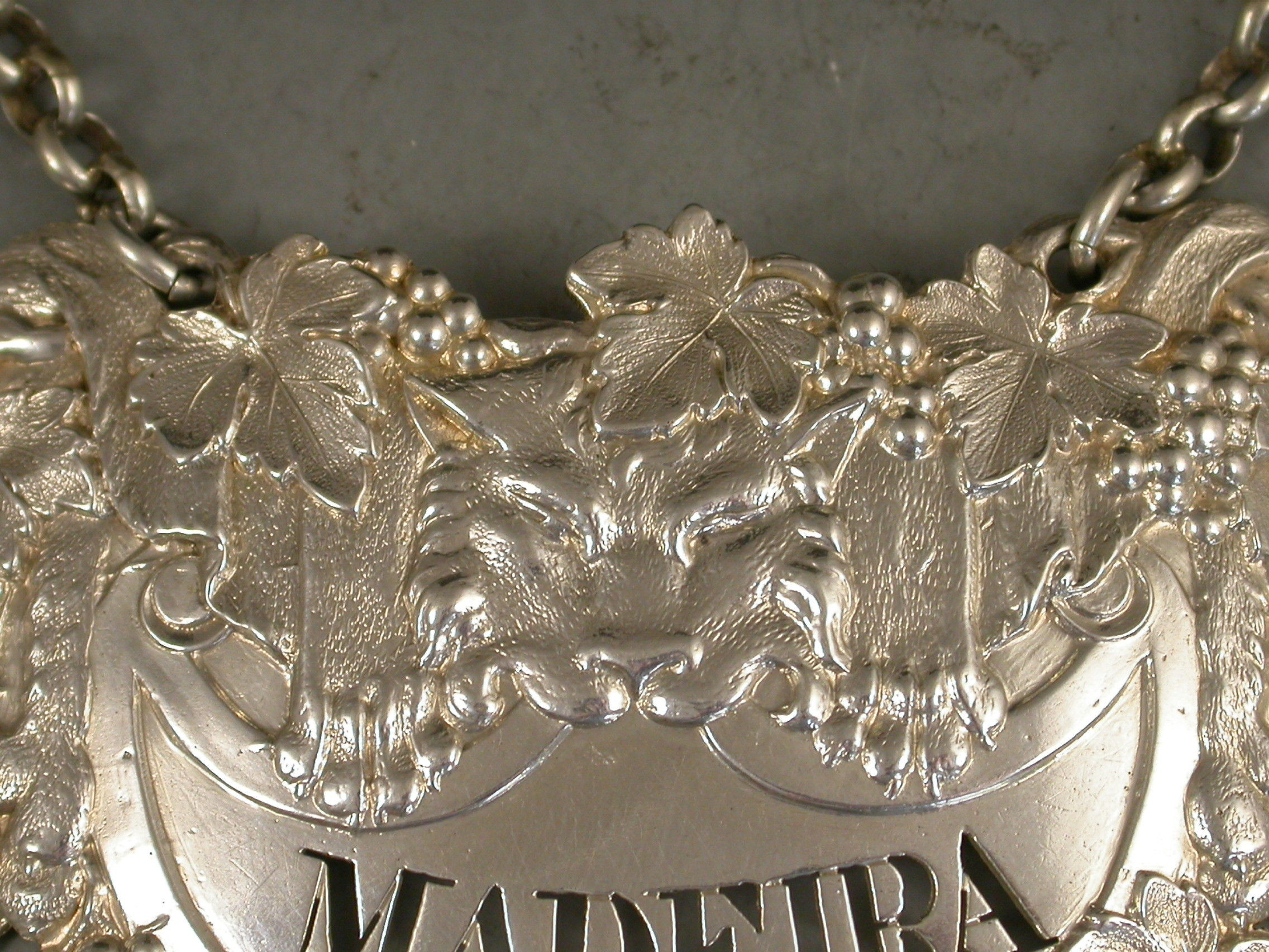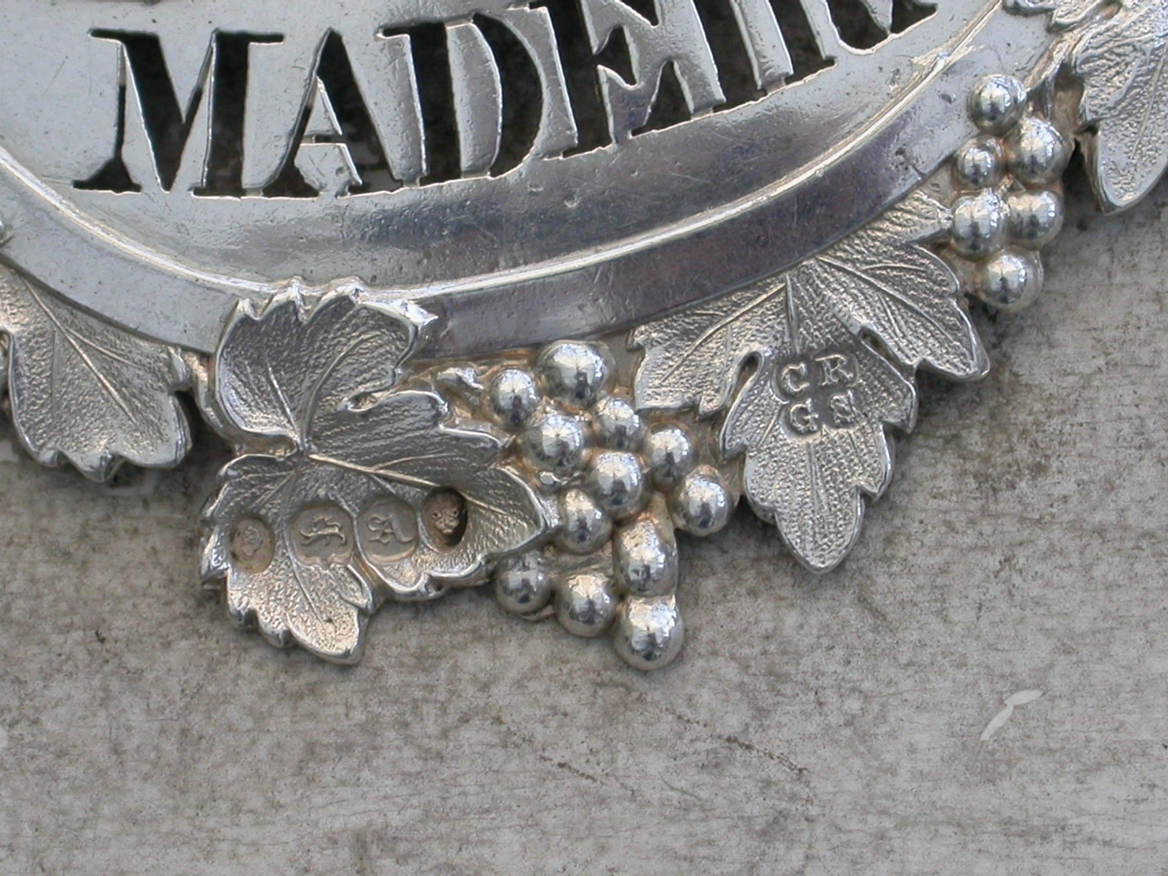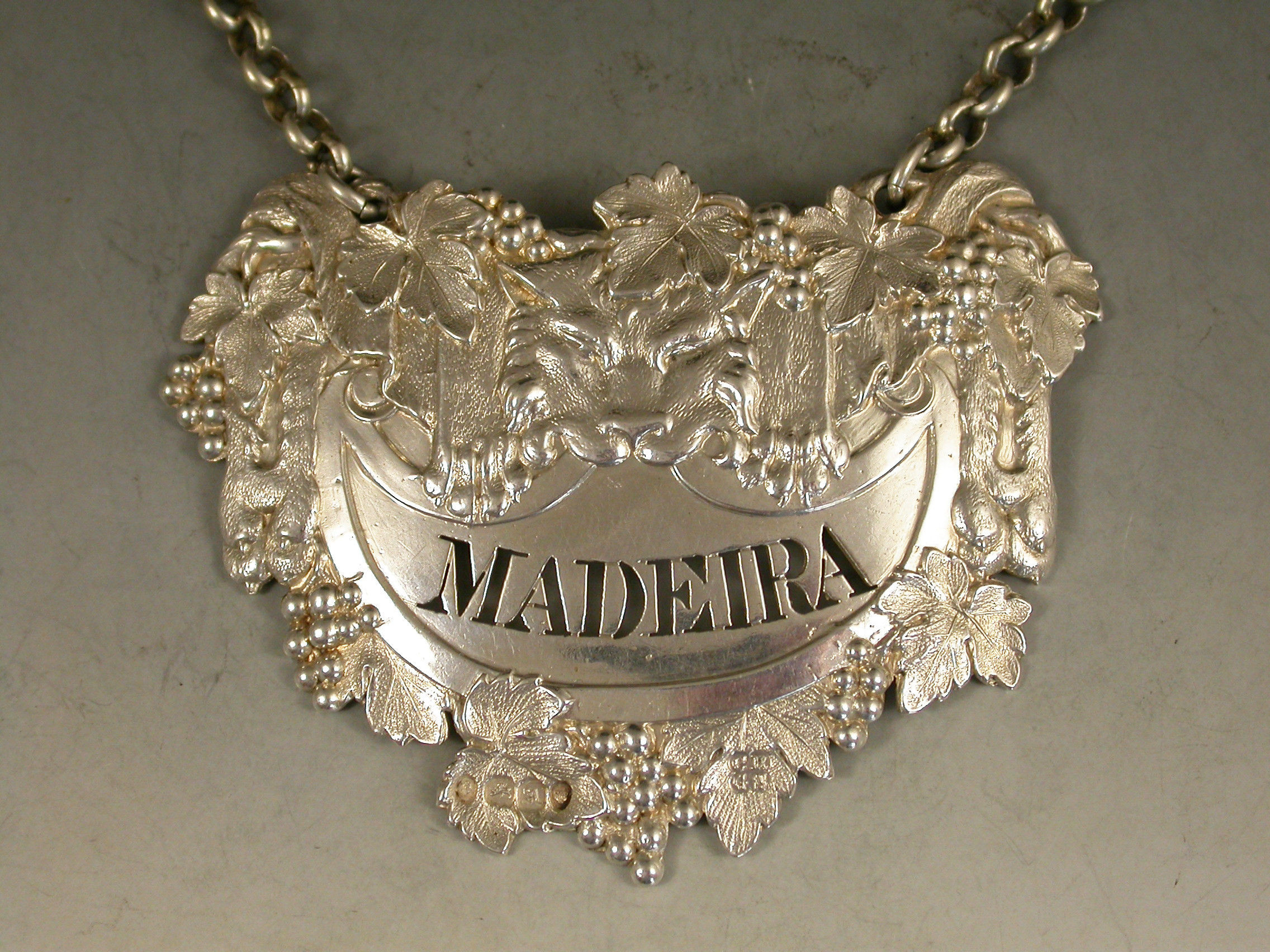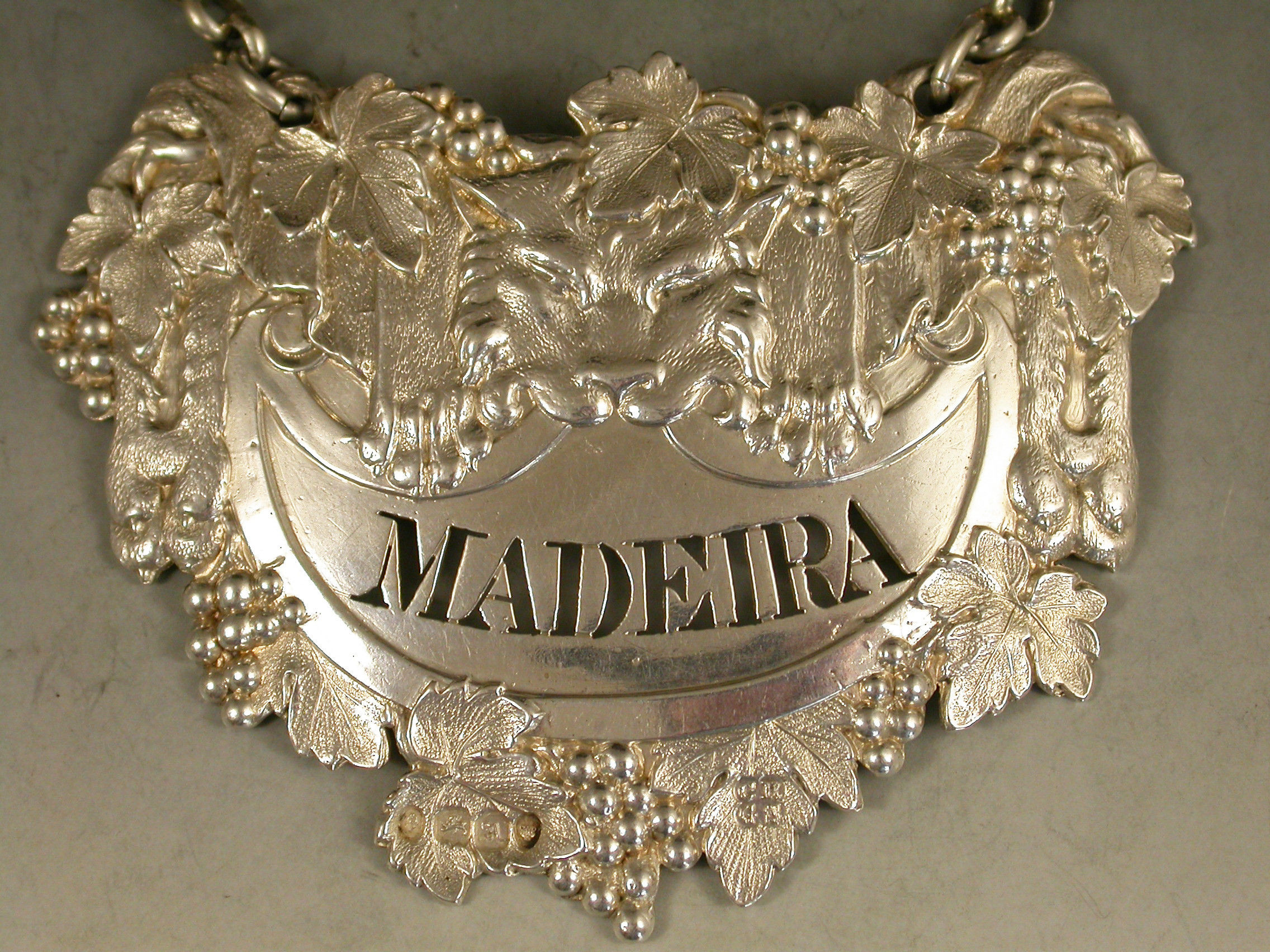 A rare William IV silver Wine Label, the design known as the ""Leopards Pelt"", of cartouche form with vine leaf and grape surround, a leopards skin with head and paws draped over the peaked crescent shape name plate pierced for Madeira.