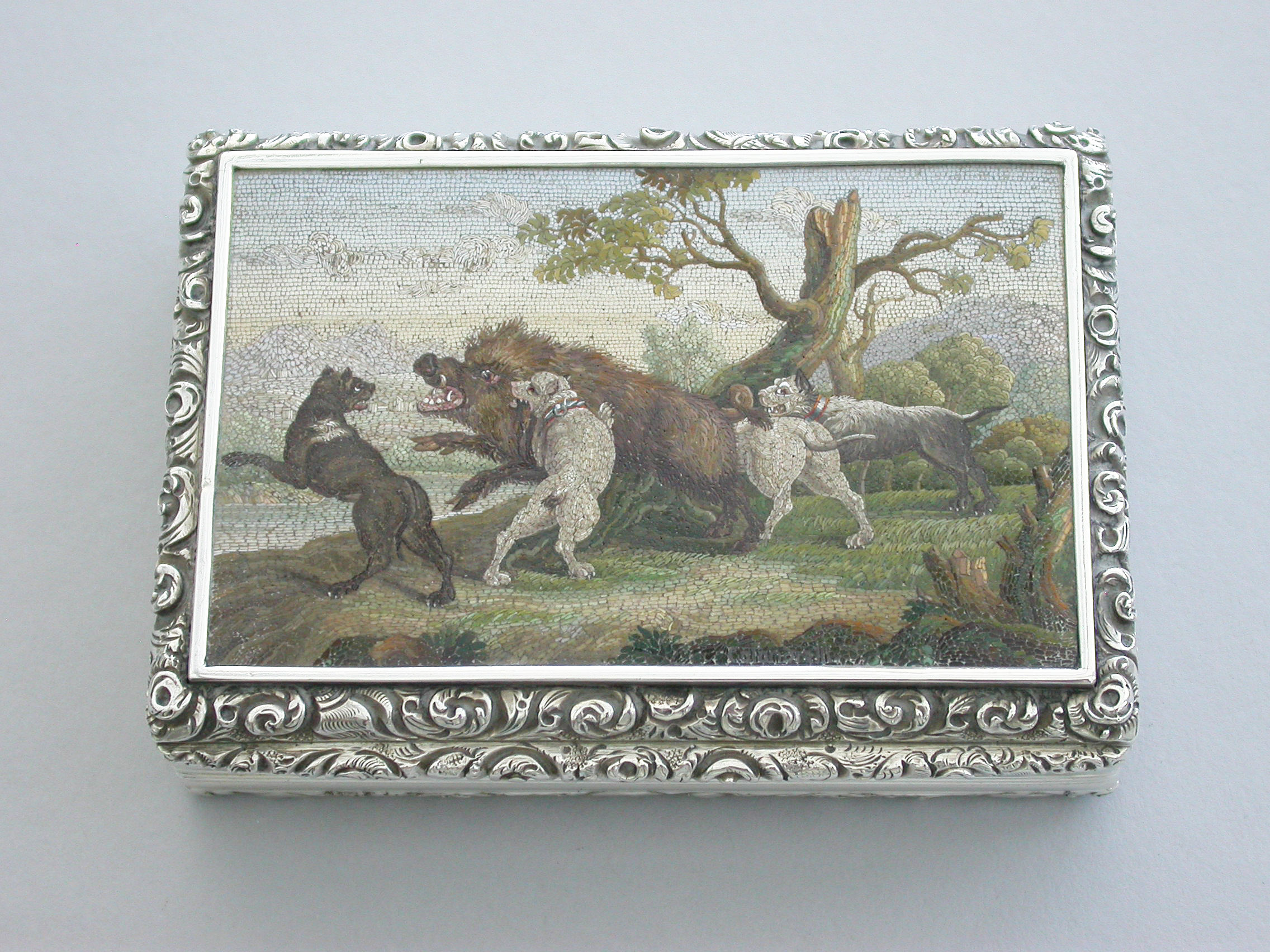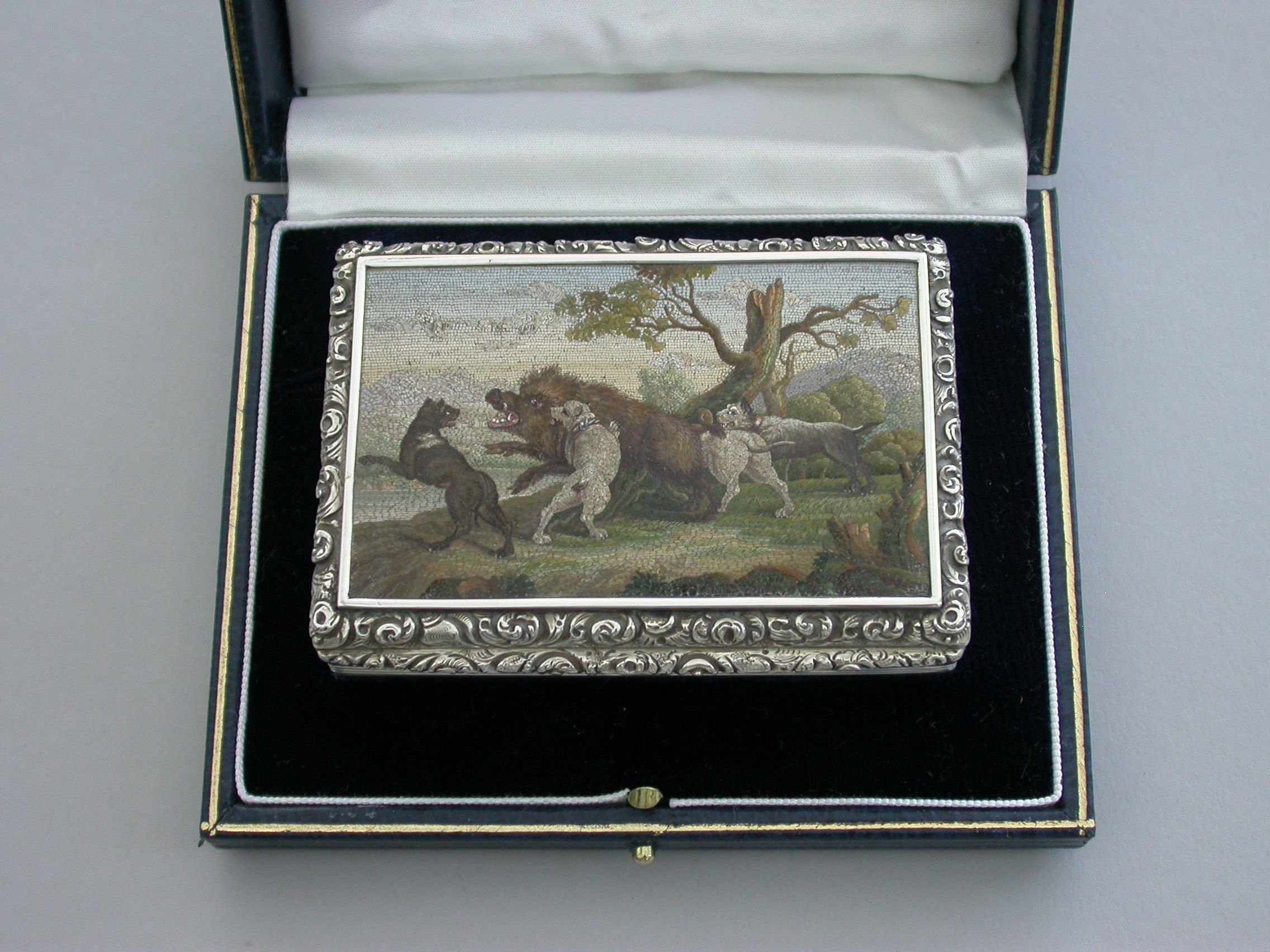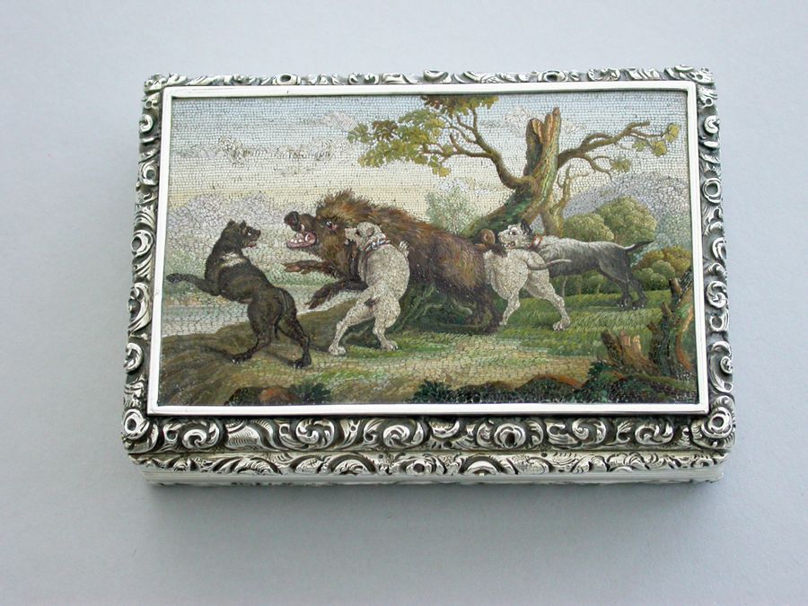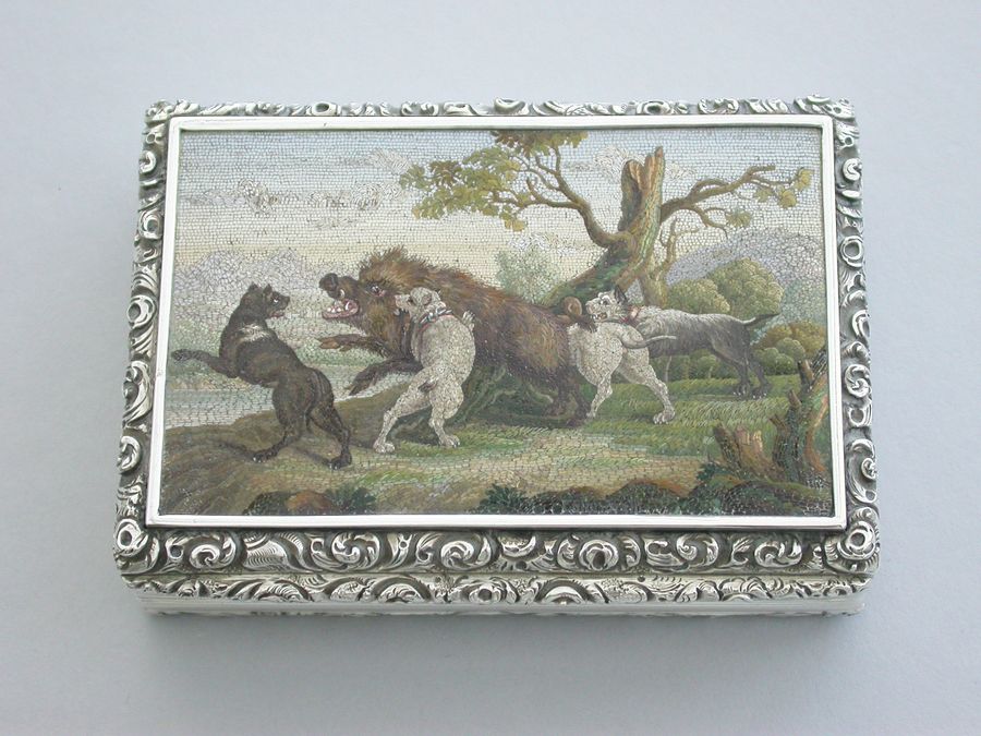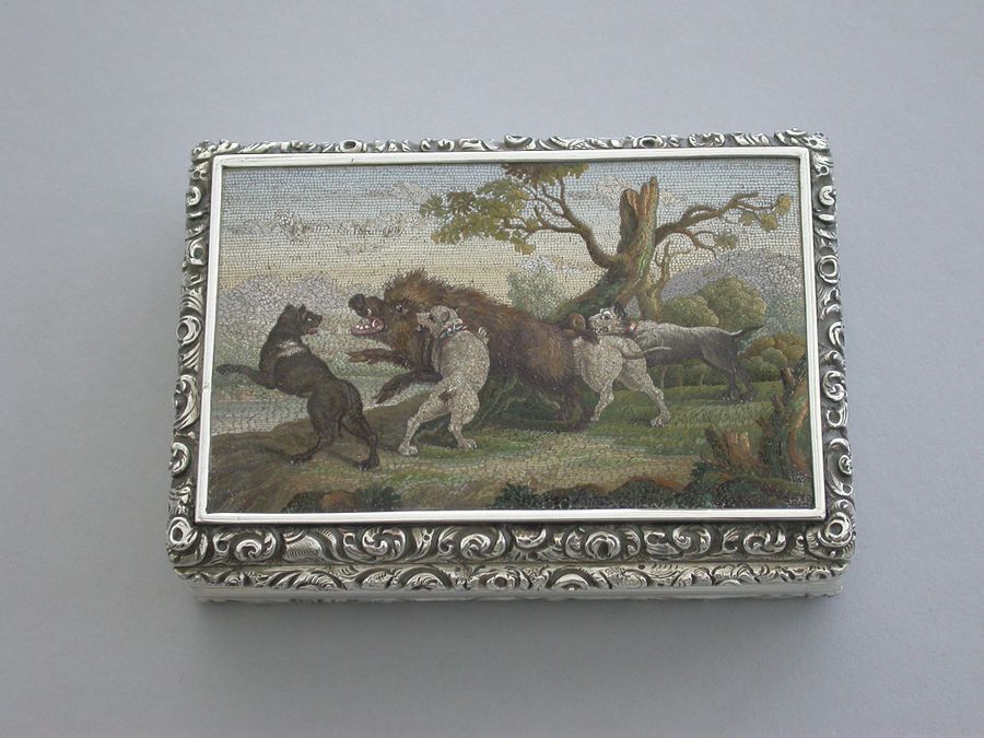 William IV Silver Snuff Box Set With Signed Micromosaic Boar Hunt Panel