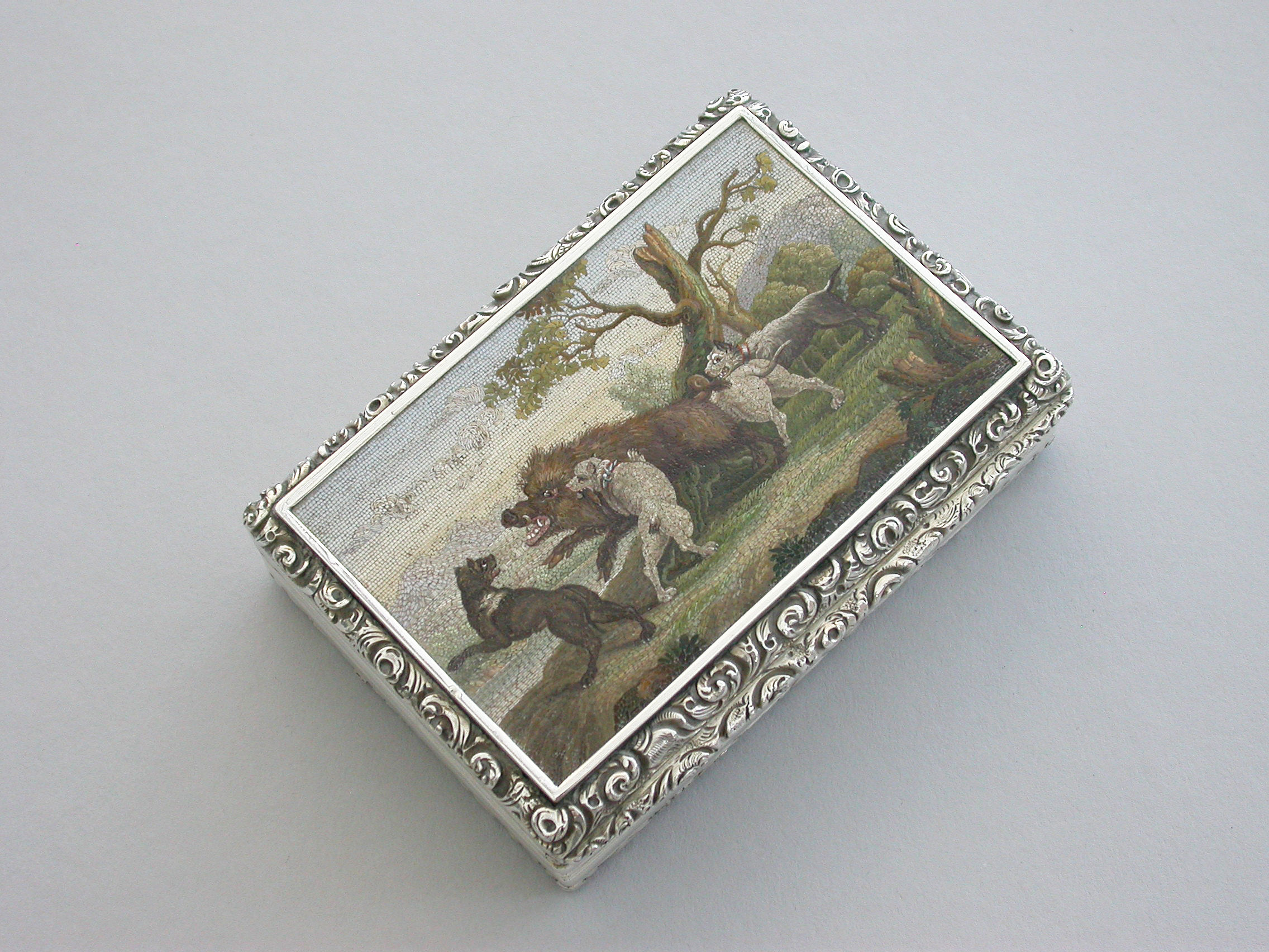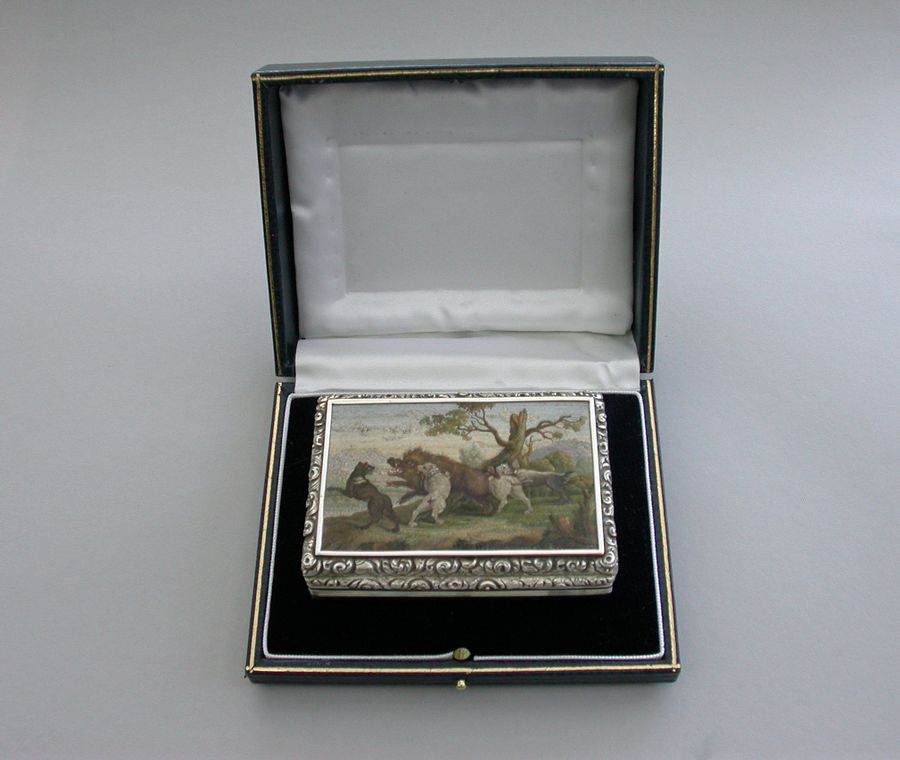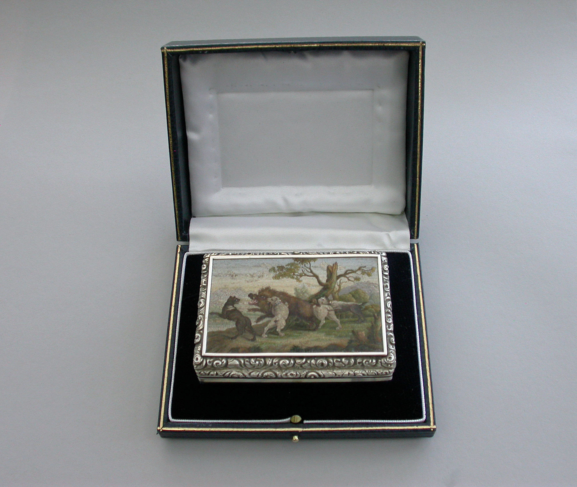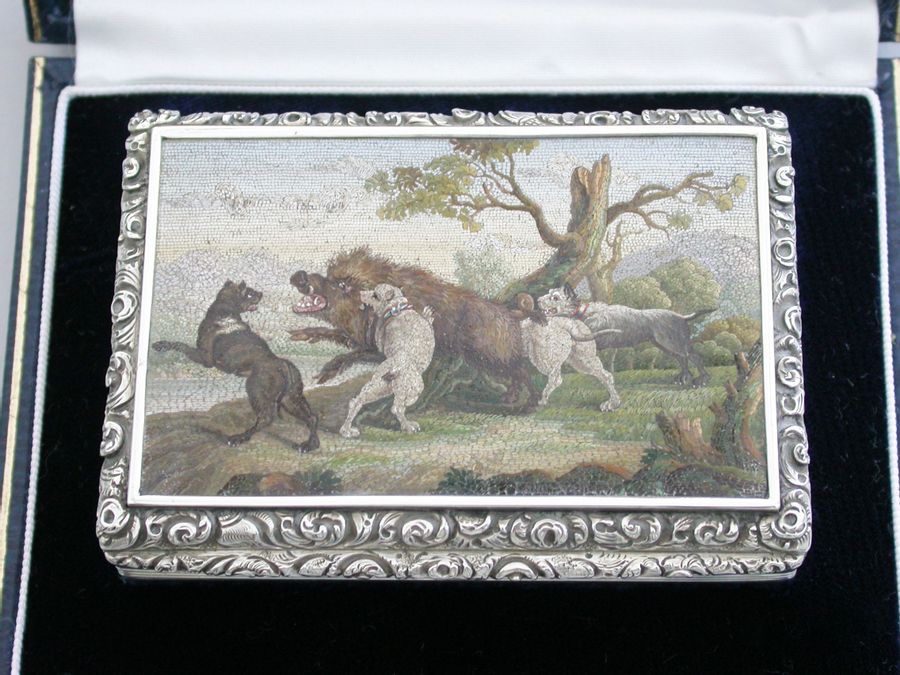 William IV Silver Snuff Box Set With Signed Micromosaic Boar Hunt Panel