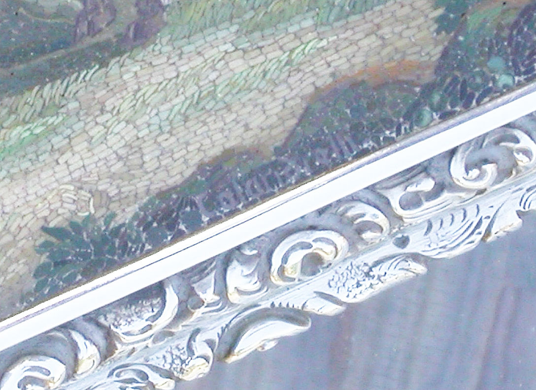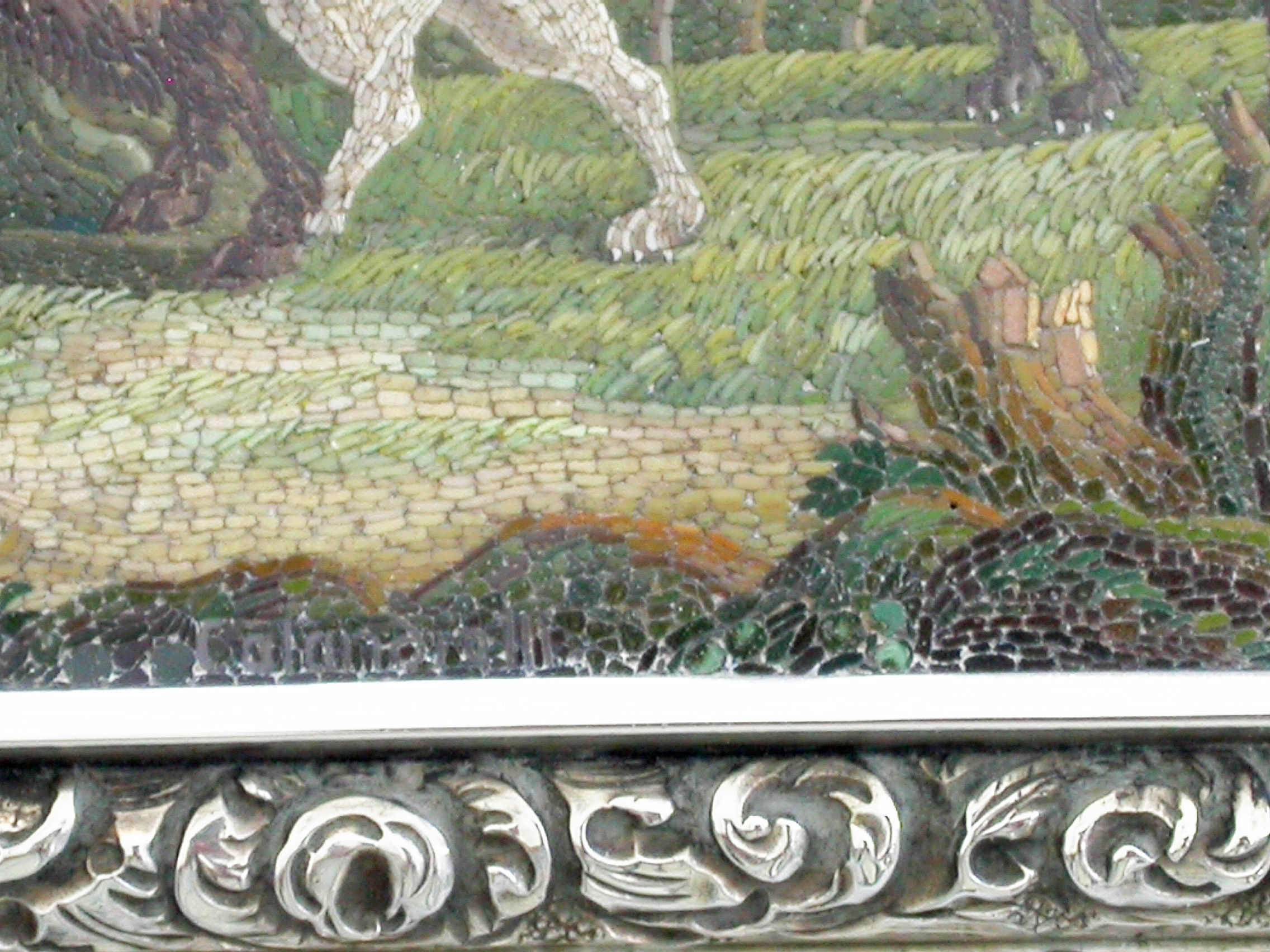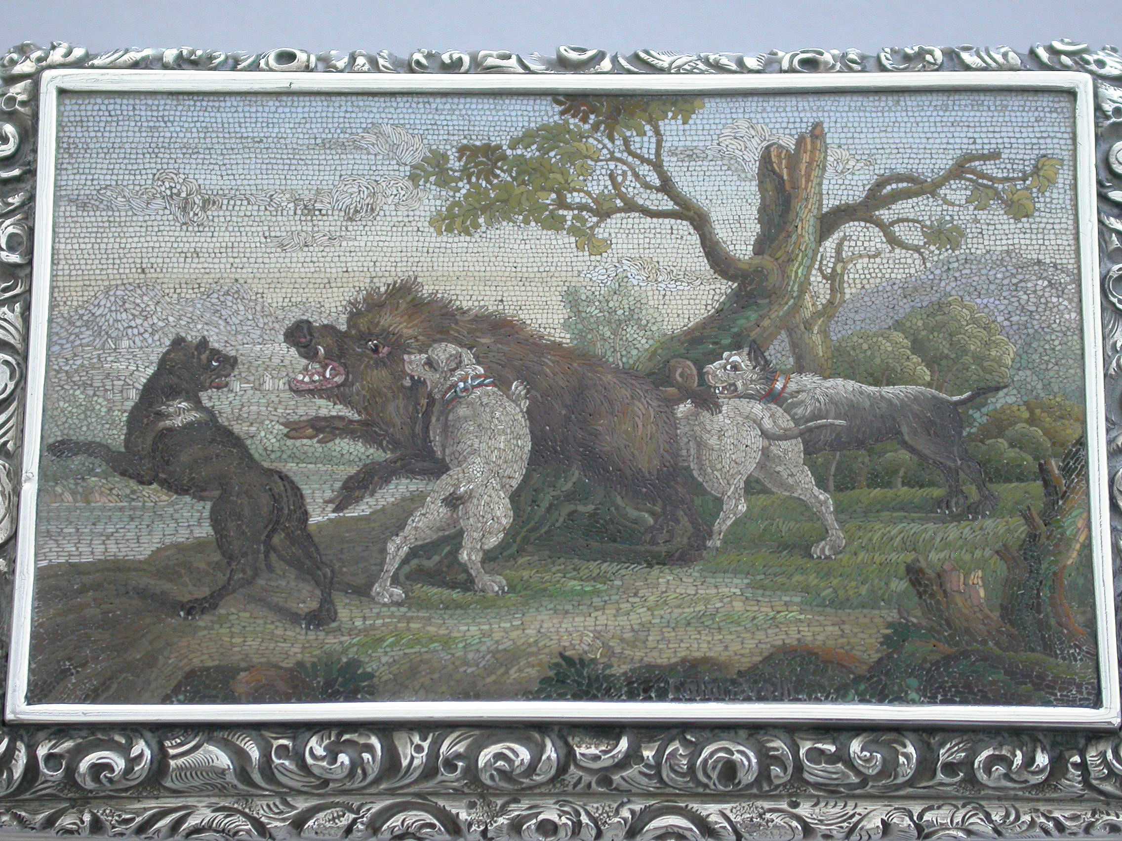 The rectangular mosaic to the cover based on a painting by Johann Wenzel Peter and depicting four dogs hunting a wild boar in the open, a broken tree trunk behind right, a river to the left and mountains beyond. Signed by the mosaicist Tomaso Calandrelli, Rome c1825.