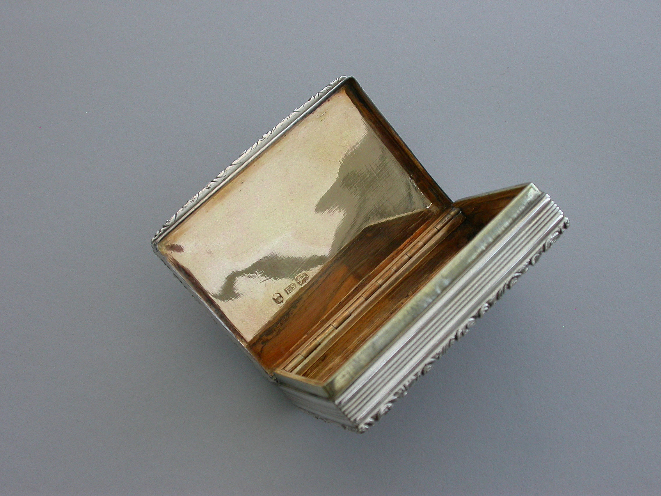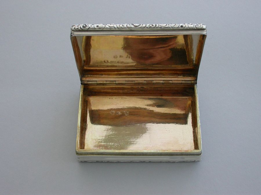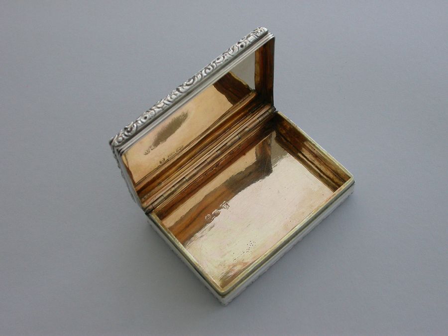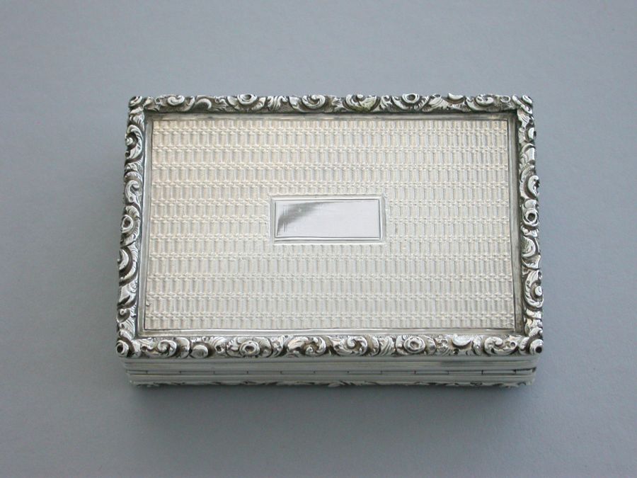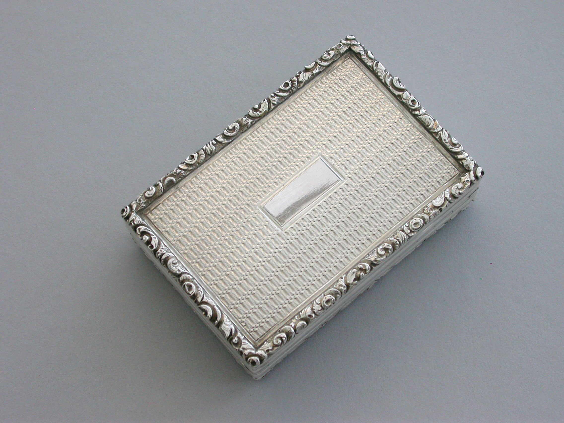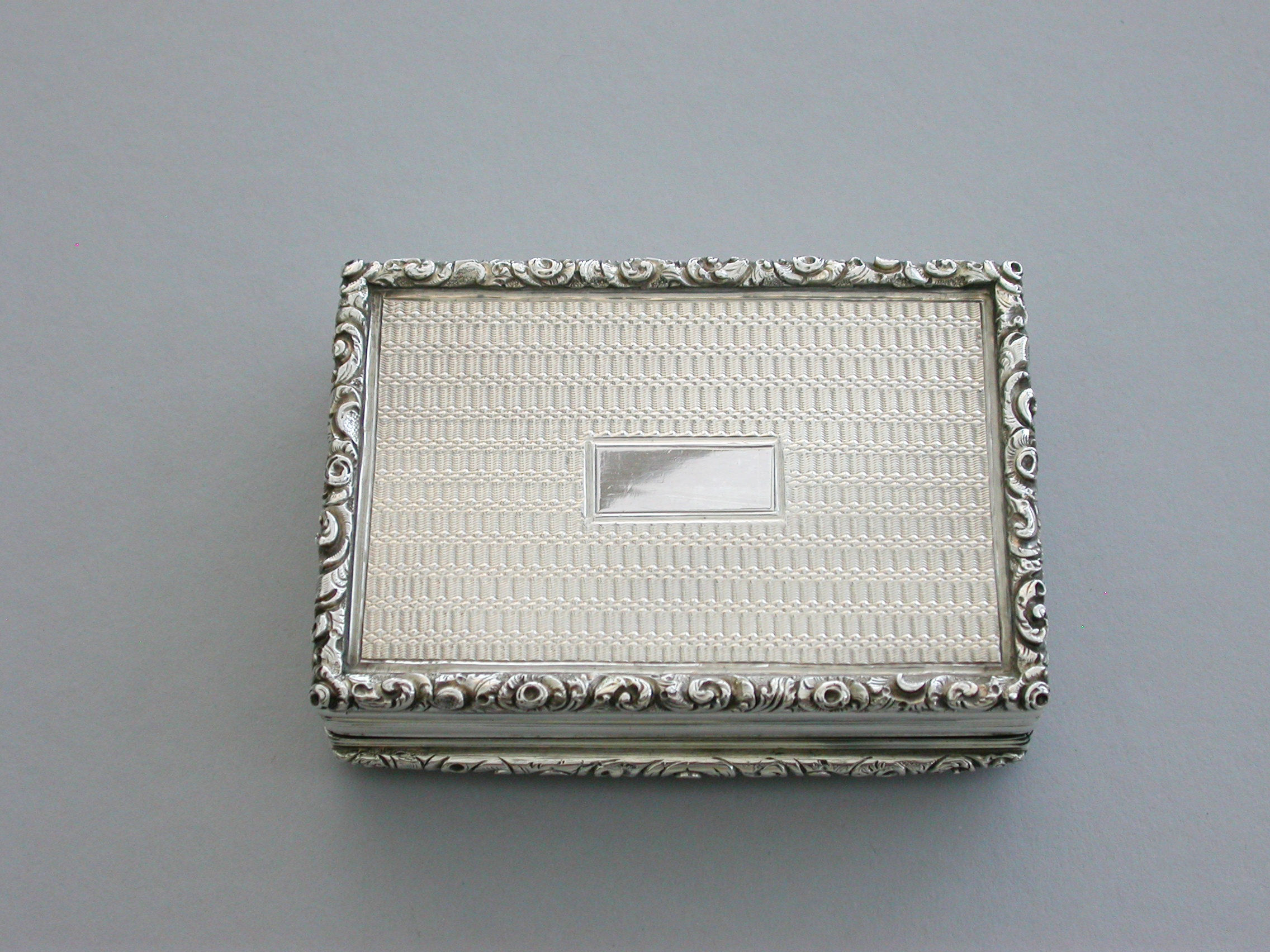 A very fine and rare William IV silver Snuff Box of rectangular form with with raised chased foliate scroll borders and engine turned base, the lid set with a signed Italian micromosic panel depicting a Boar Hunt.