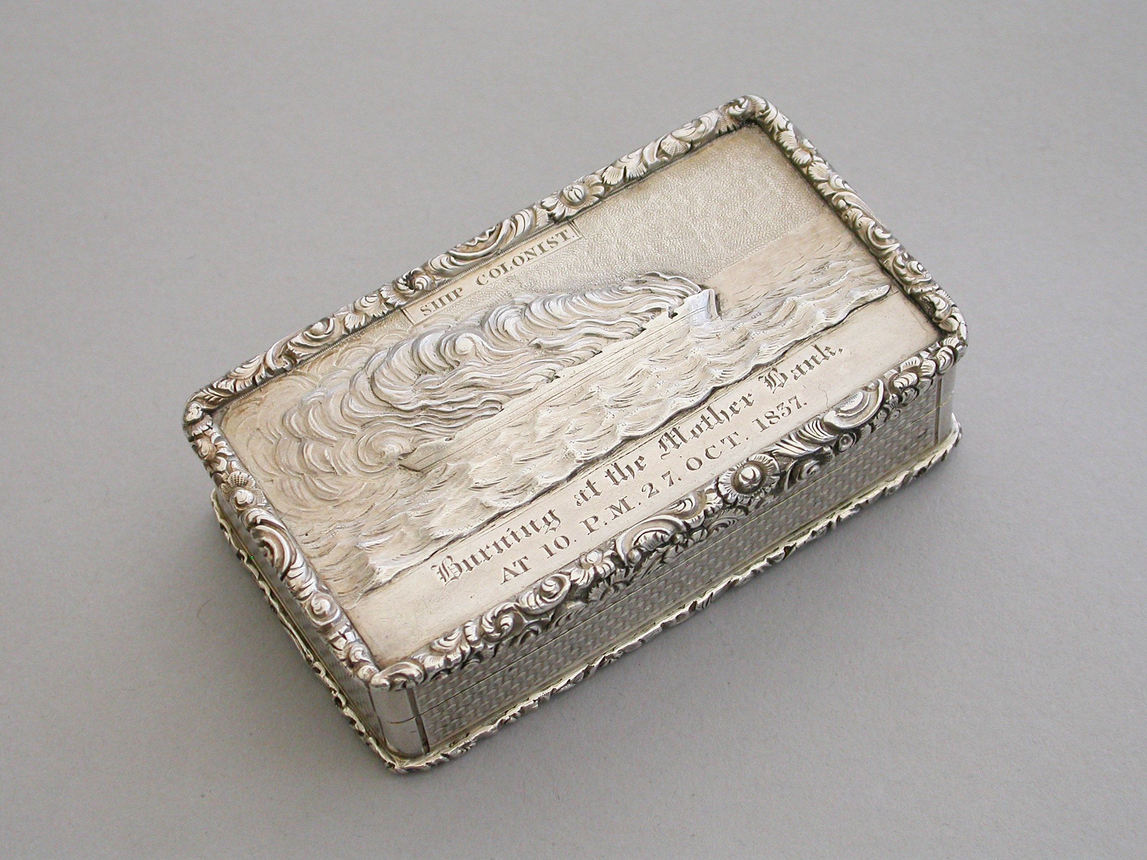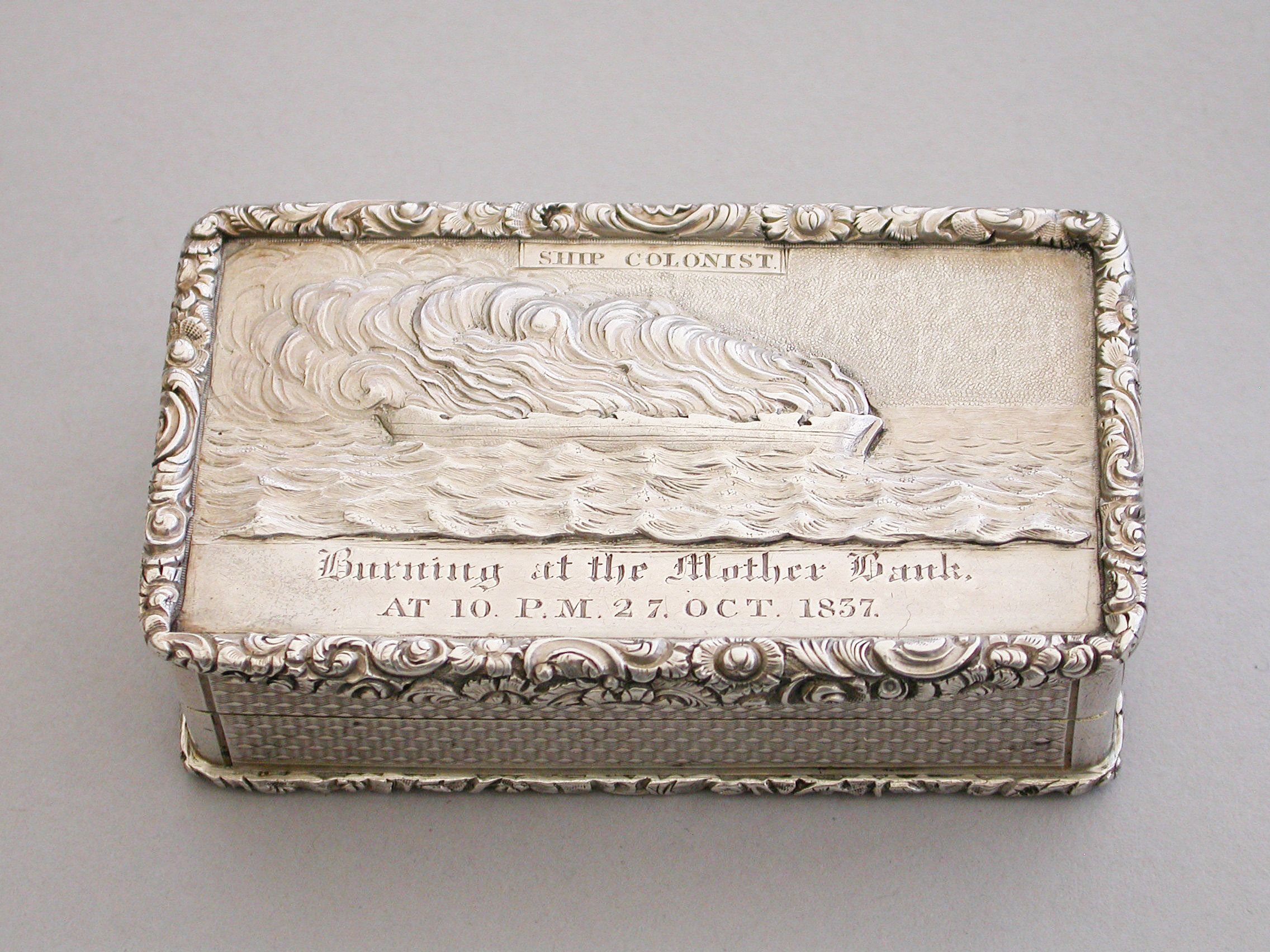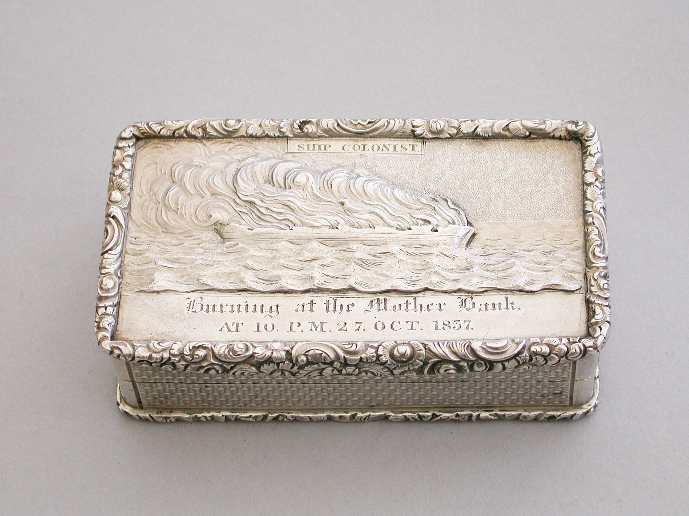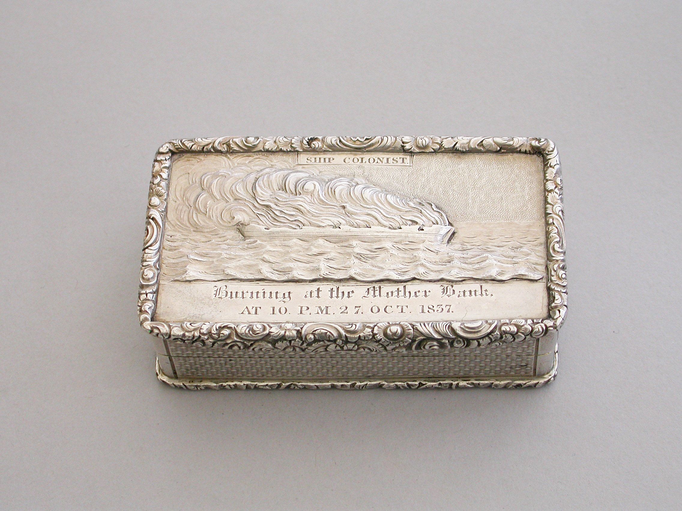 A rare and unusual William IV silver Snuff Box of rectangular form with engine turned decoration to the base and sides, raised foliate scroll chased borders and a raised scene to the lid depicting the ship COLONIST, burning at the Mother Bank at 10pm 27 Oct 1837. The hinged lid opening to a gilded interior with presentation inscription dedicated to Henry Justice Williams Esq ;-