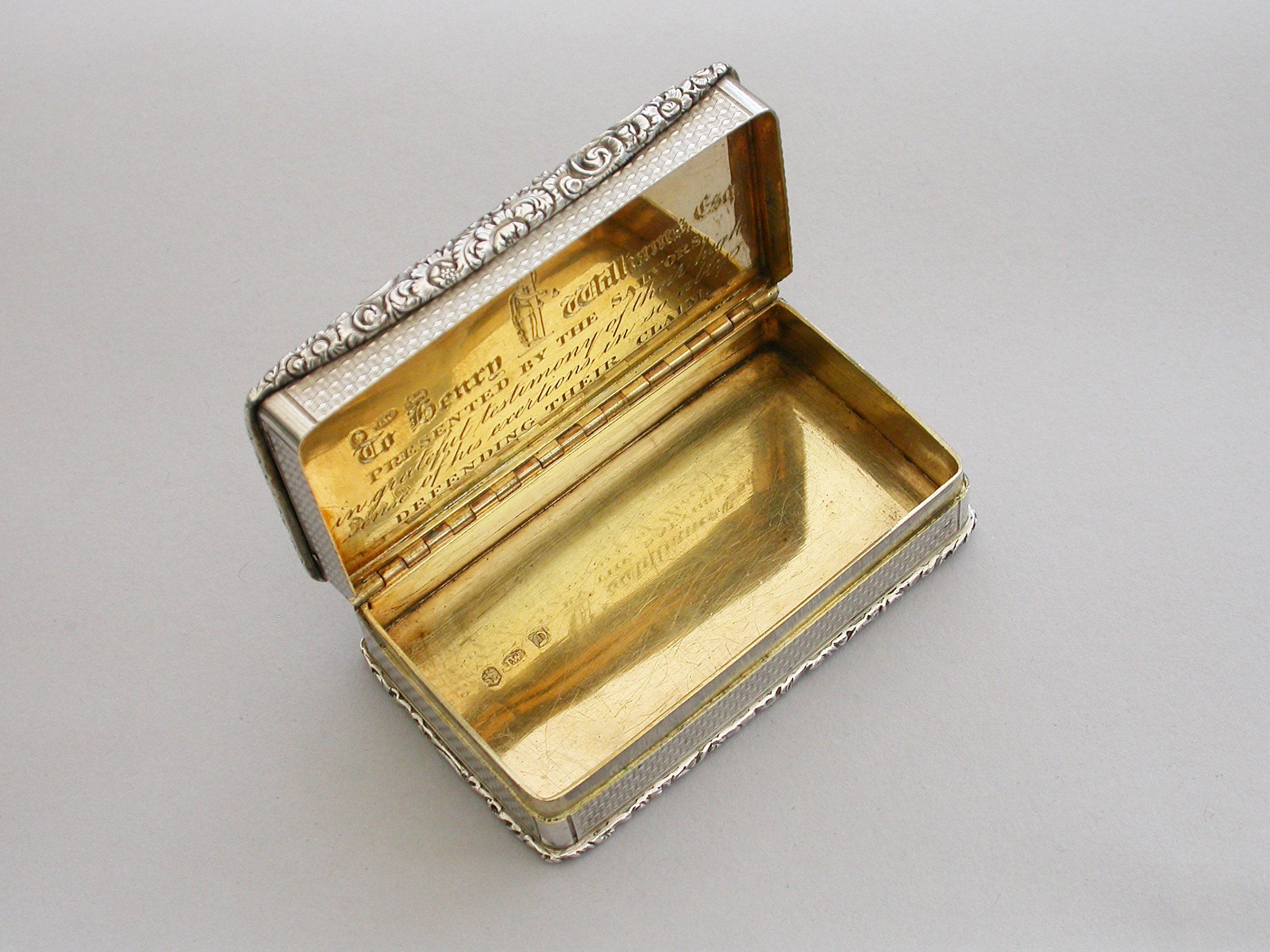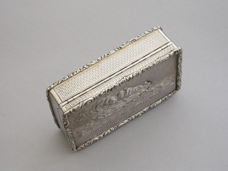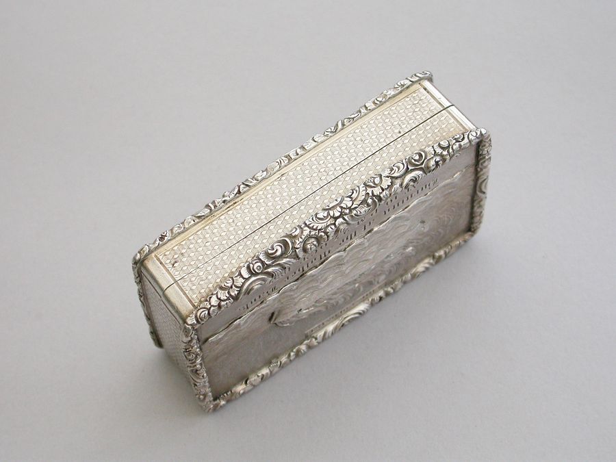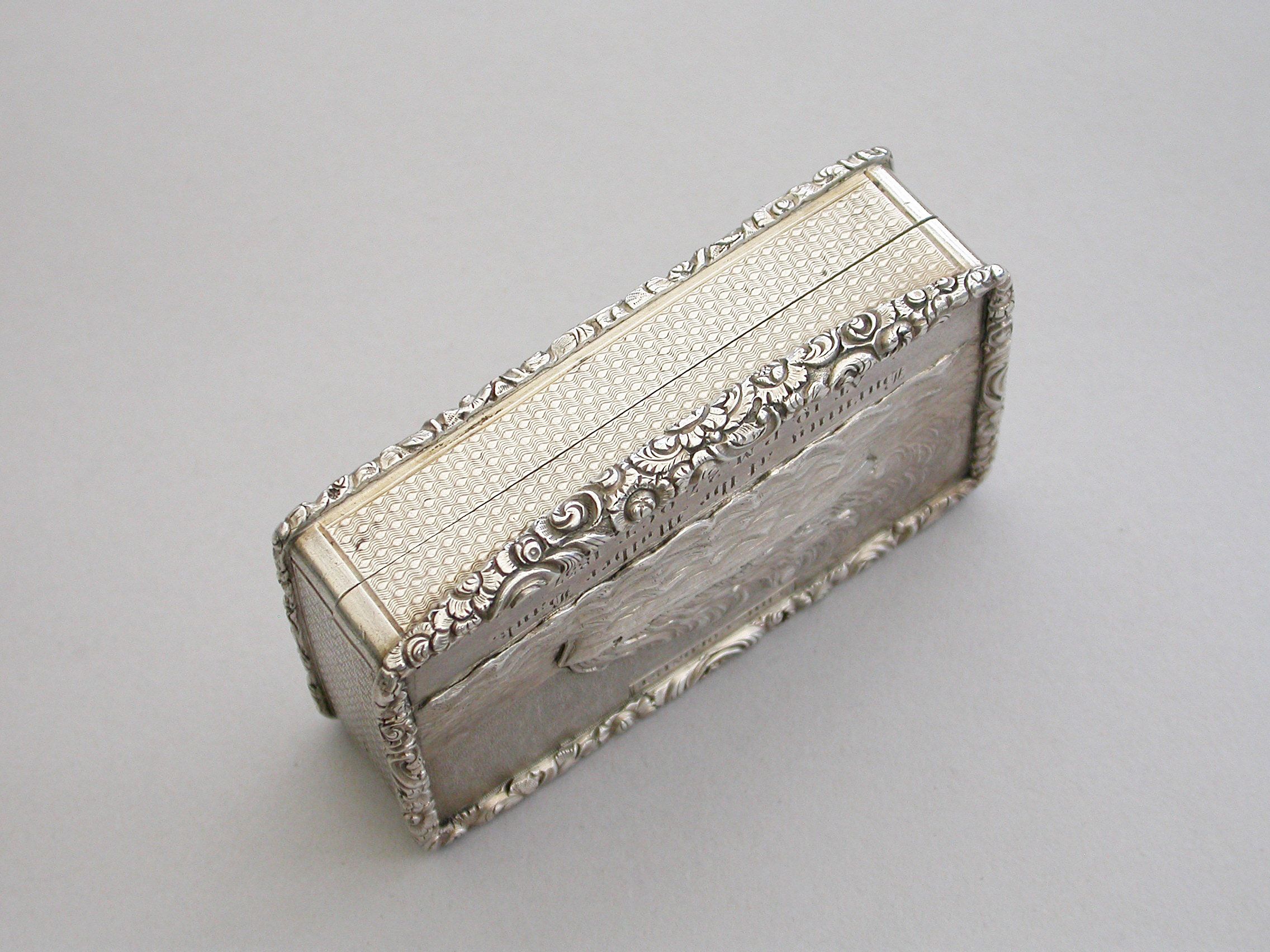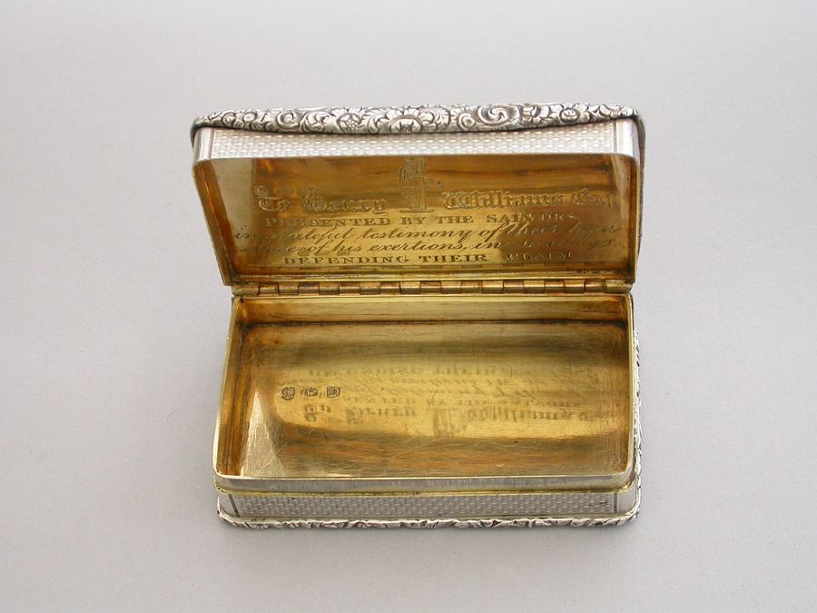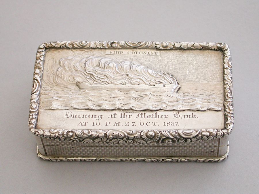 A rare and unusual William IV silver Snuff Box of rectangular form with engine turned decoration to the base and sides, raised foliate scroll chased borders and a raised scene to the lid depicting the ship COLONIST, burning at the Mother Bank at 10pm 27 Oct 1837. The hinged lid opening to a gilded interior with presentation inscription dedicated to Henry Justice Williams Esq ;-